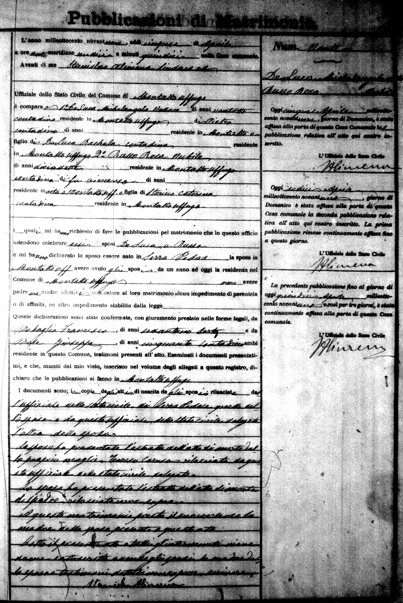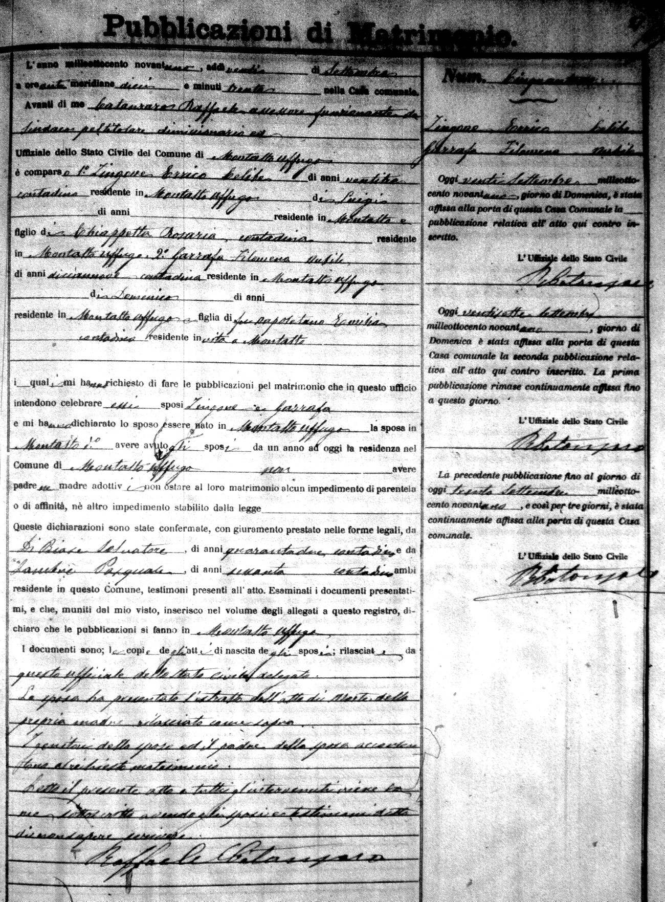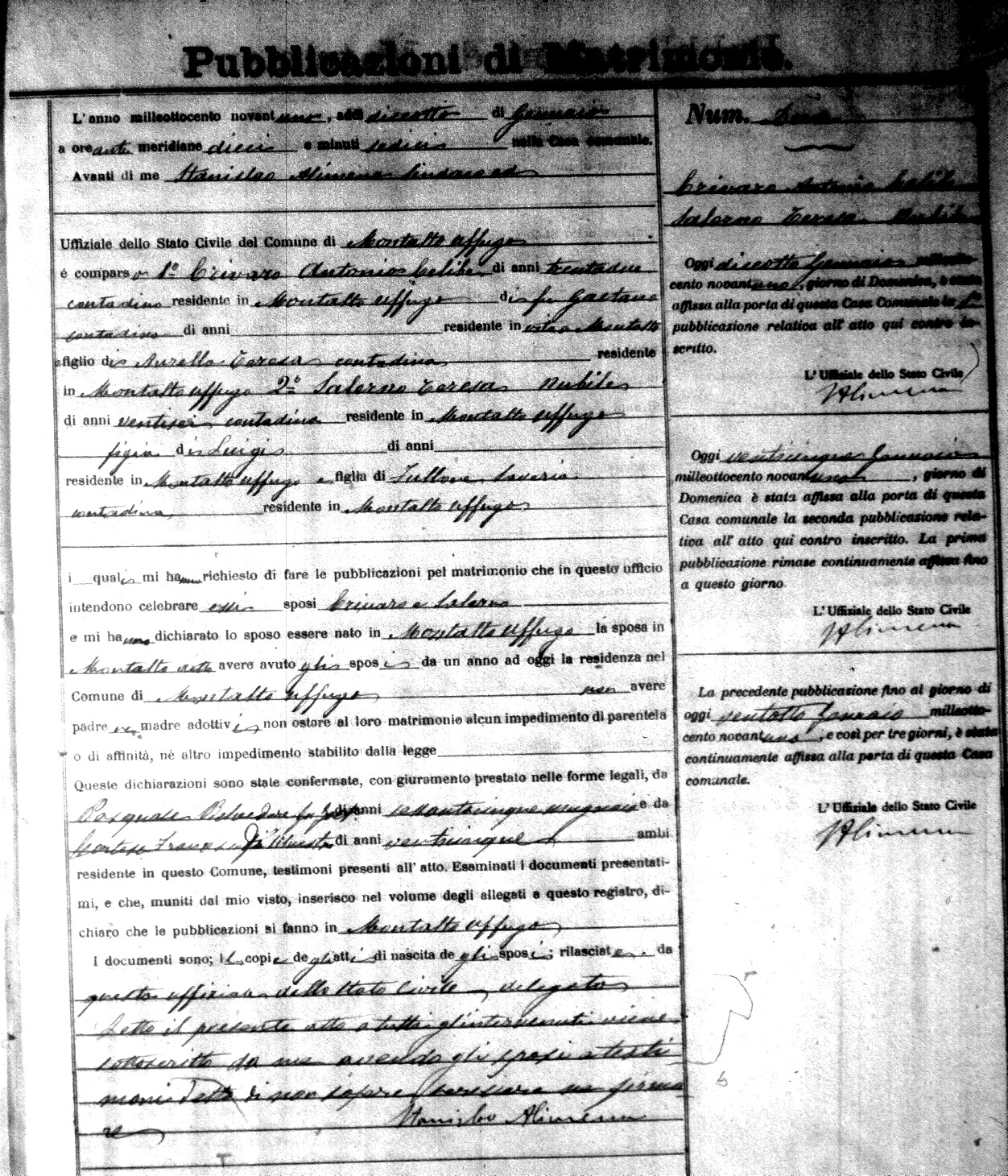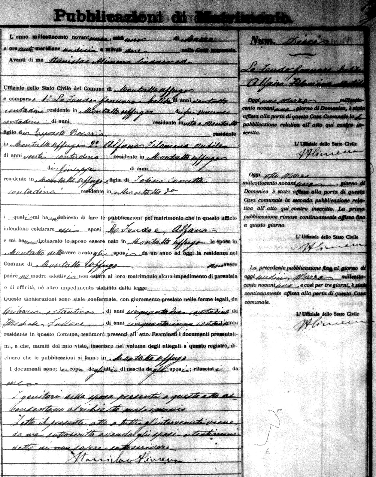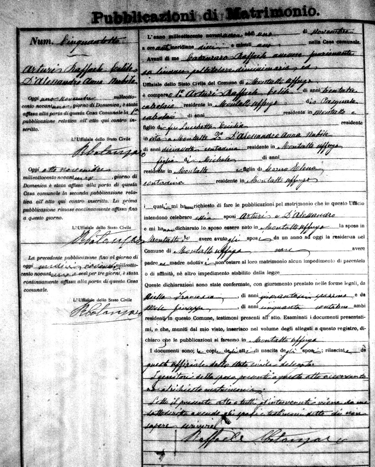 Here are the extractions for the marriage banns in 1891 for Montalto Uffugo. Each extraction has a link to a copy of the original document on the groom's surname. Please note: (fu) indicates the the person was deceased at the time of the marriage bann. For a translation of the basic Pubblicazioni document, look here.