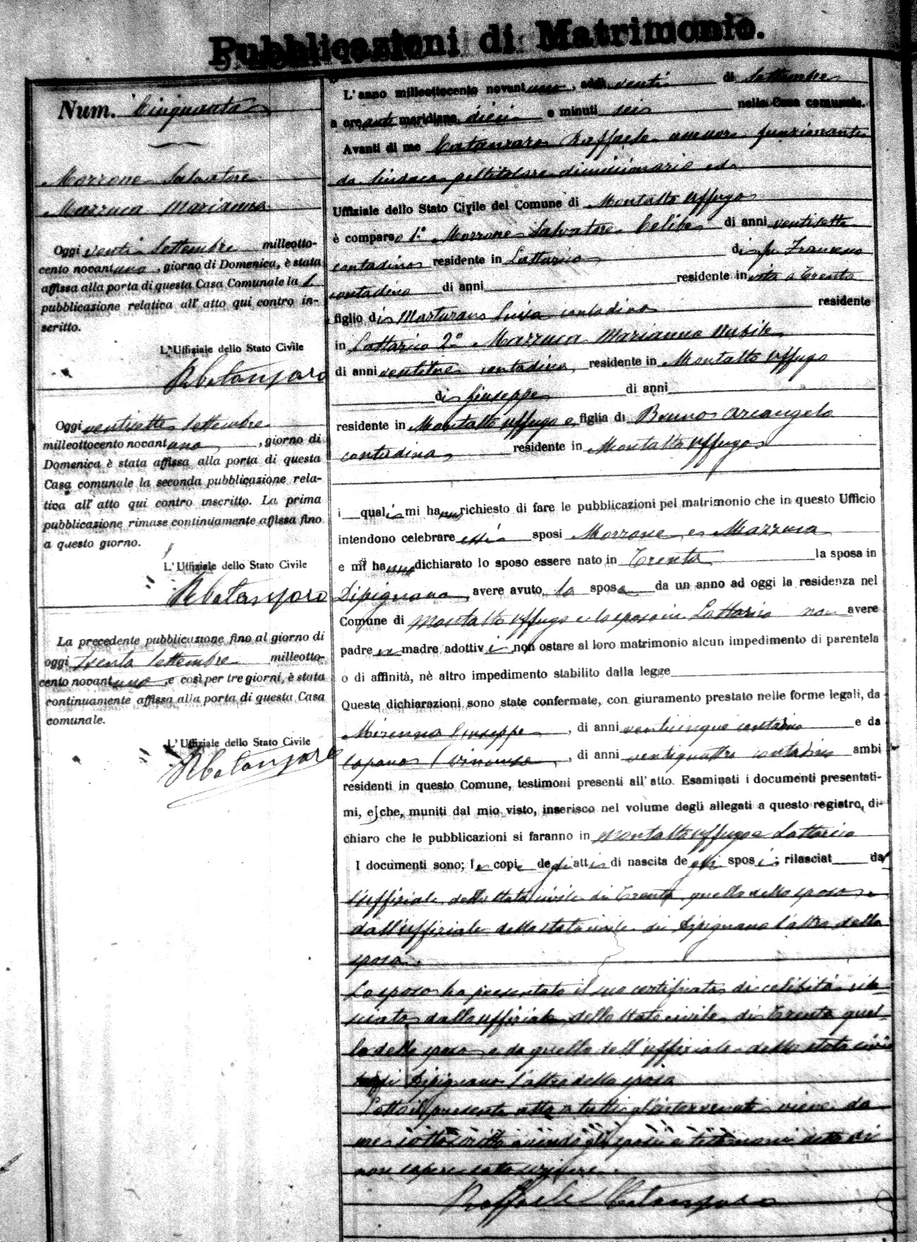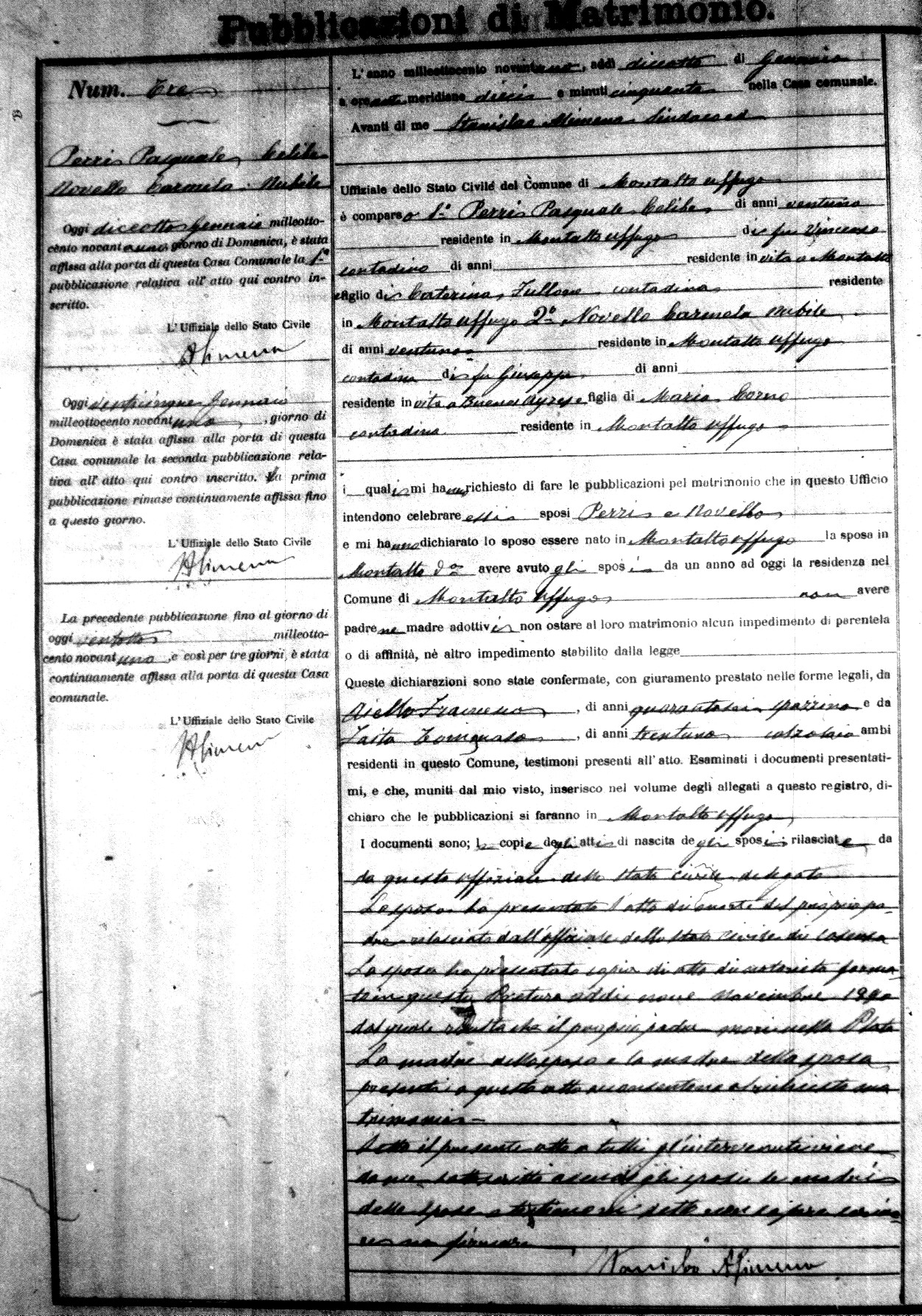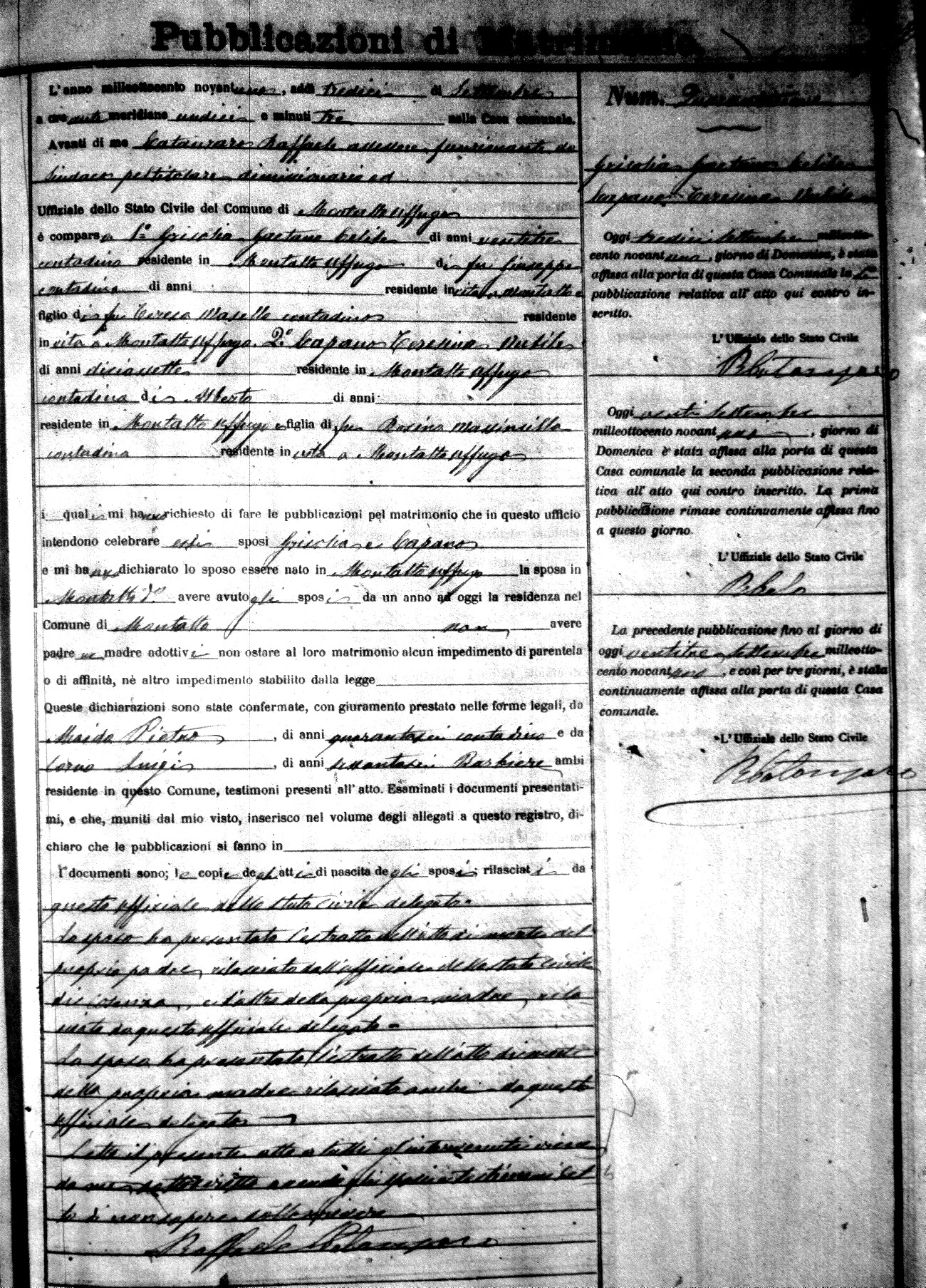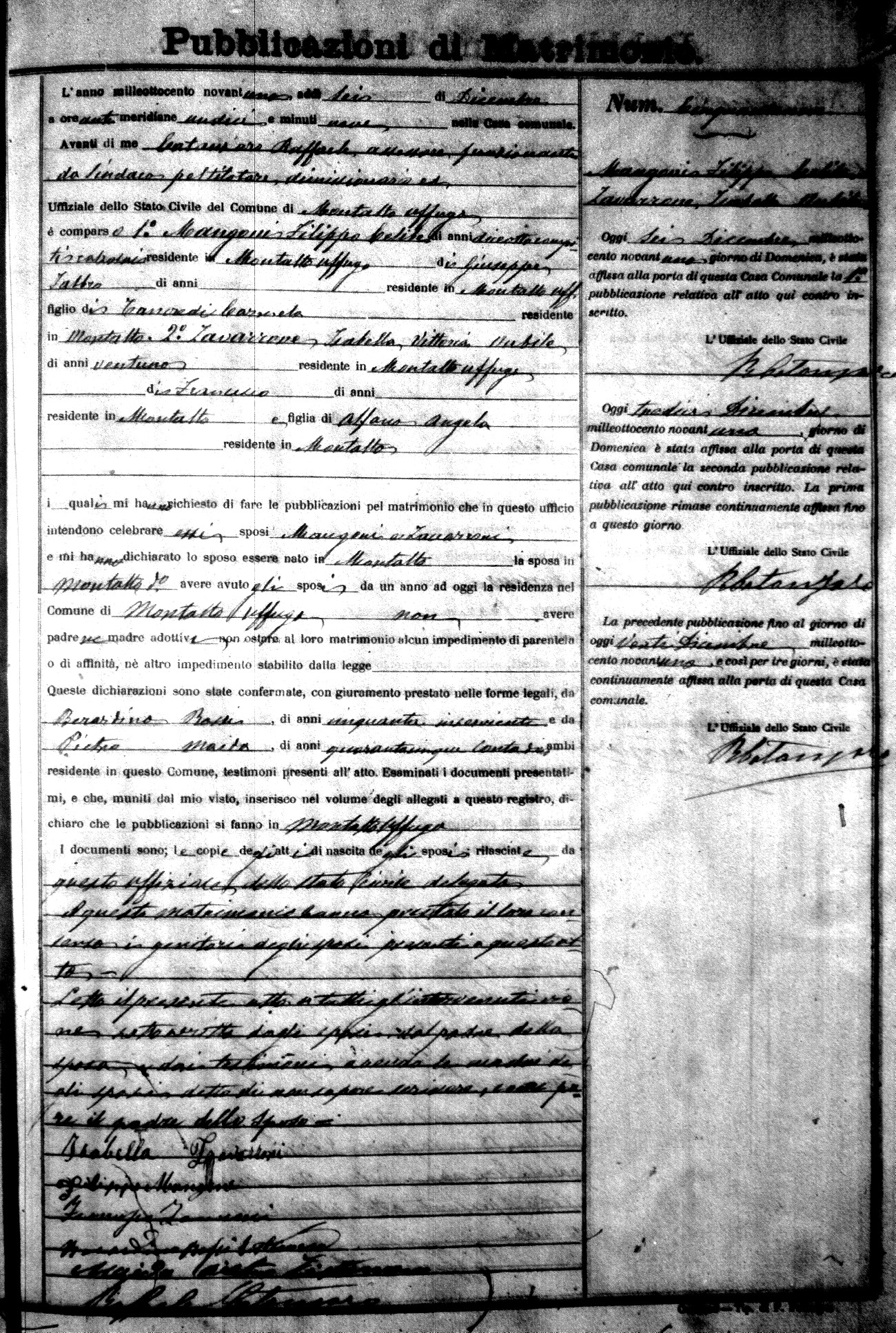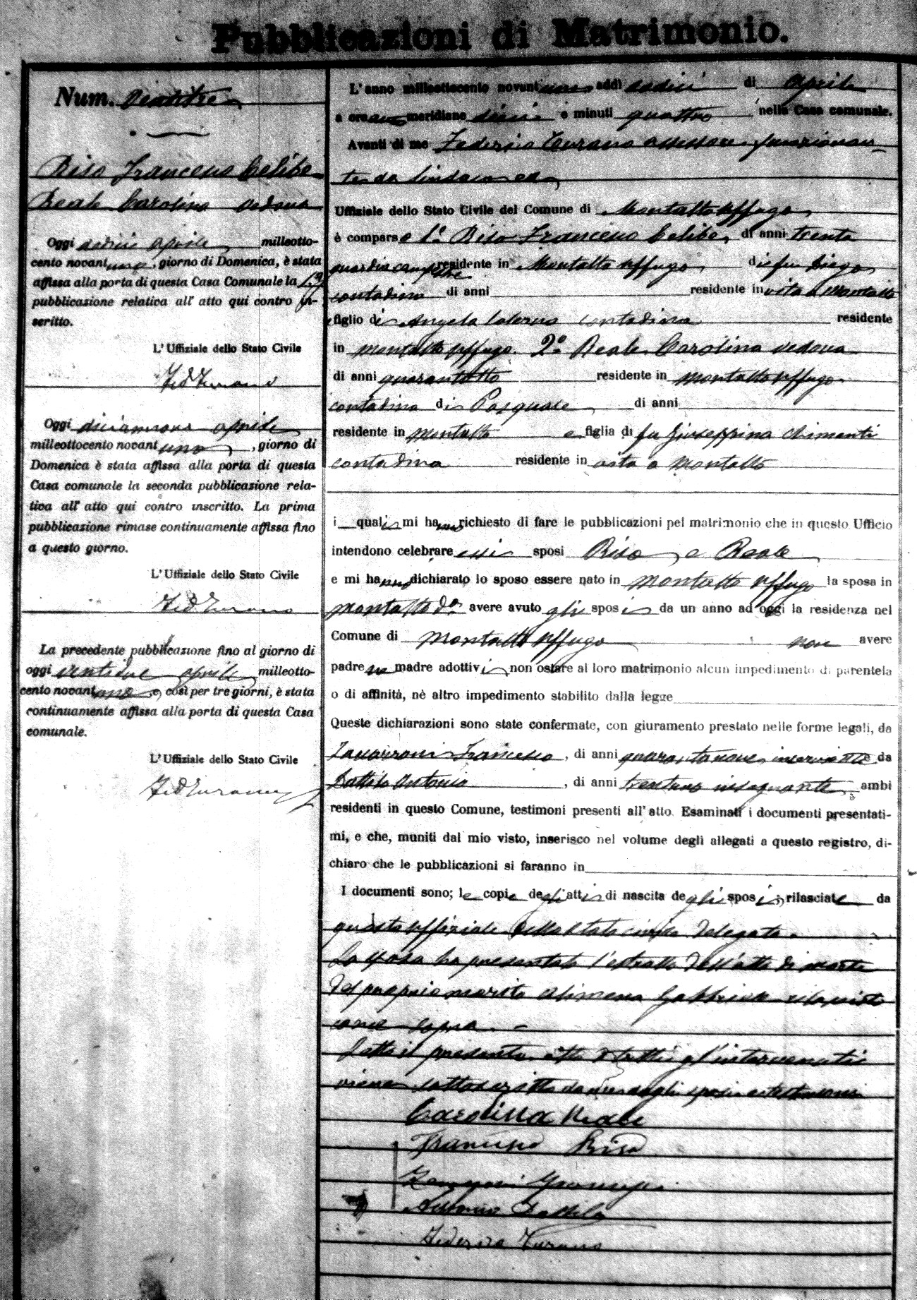 Here are the extractions for the marriage banns in 1891 for Montalto Uffugo. Each extraction has a link to a copy of the original document on the groom's surname. Please note: (fu) indicates the the person was deceased at the time of the marriage bann. For a translation of the basic Pubblicazioni document, look here.