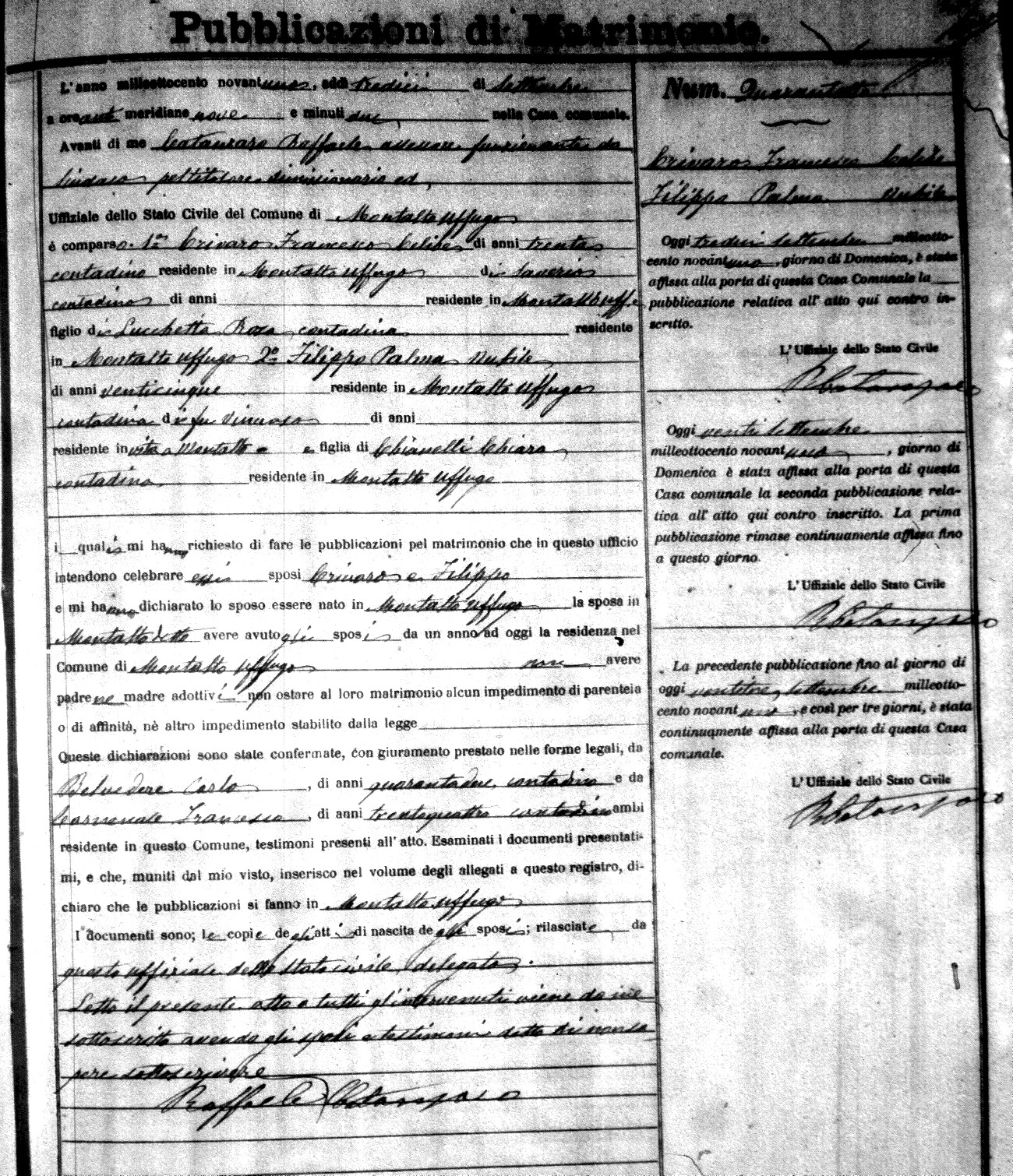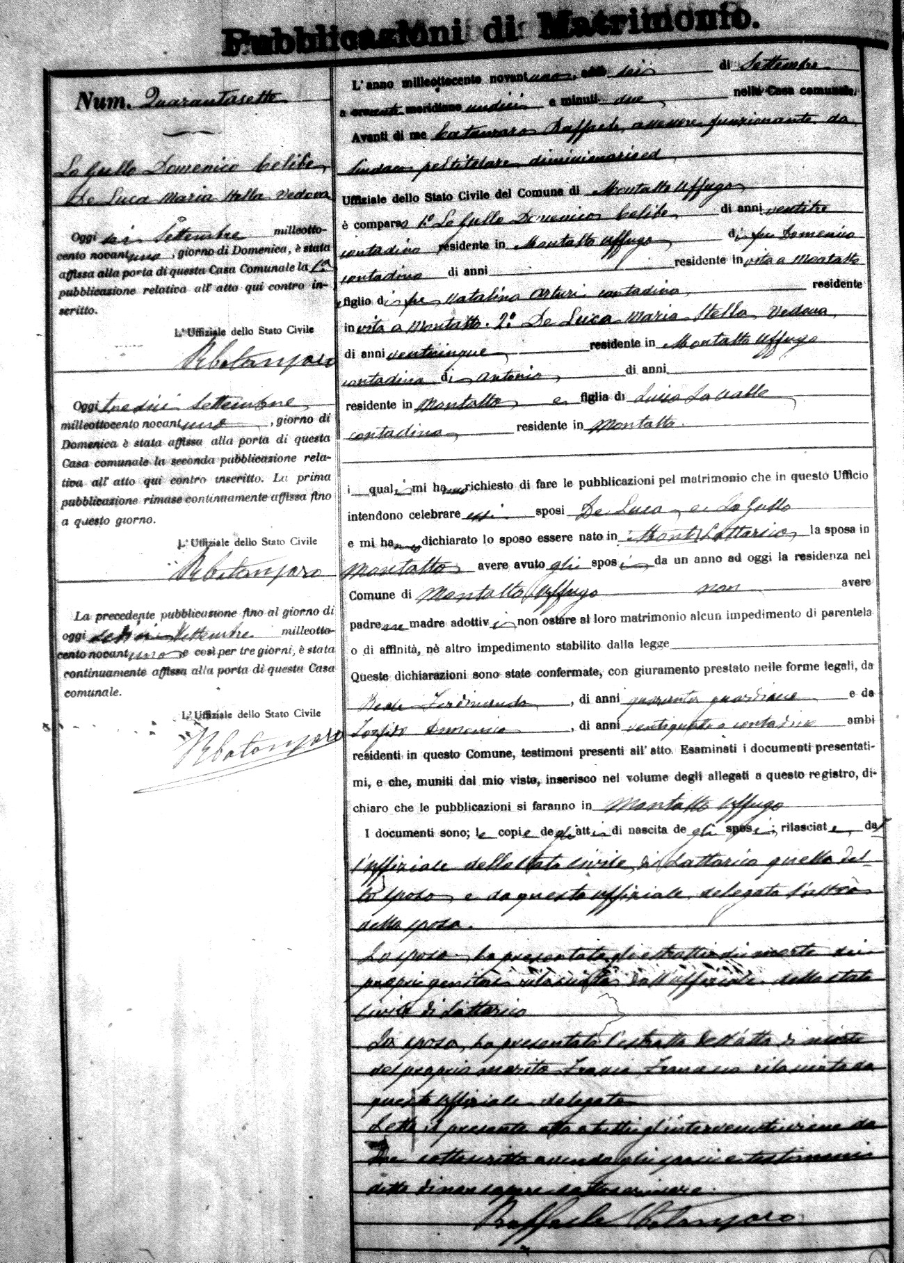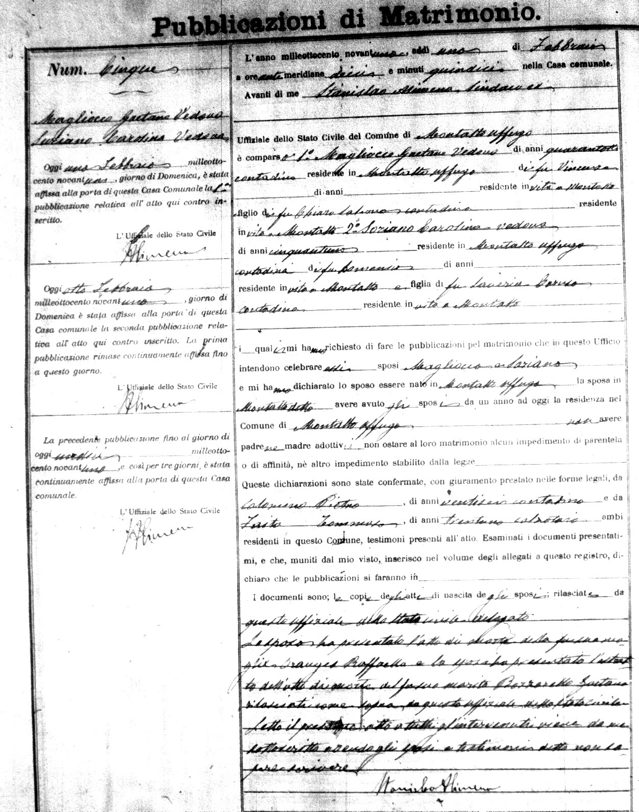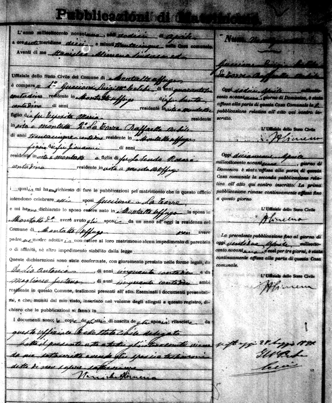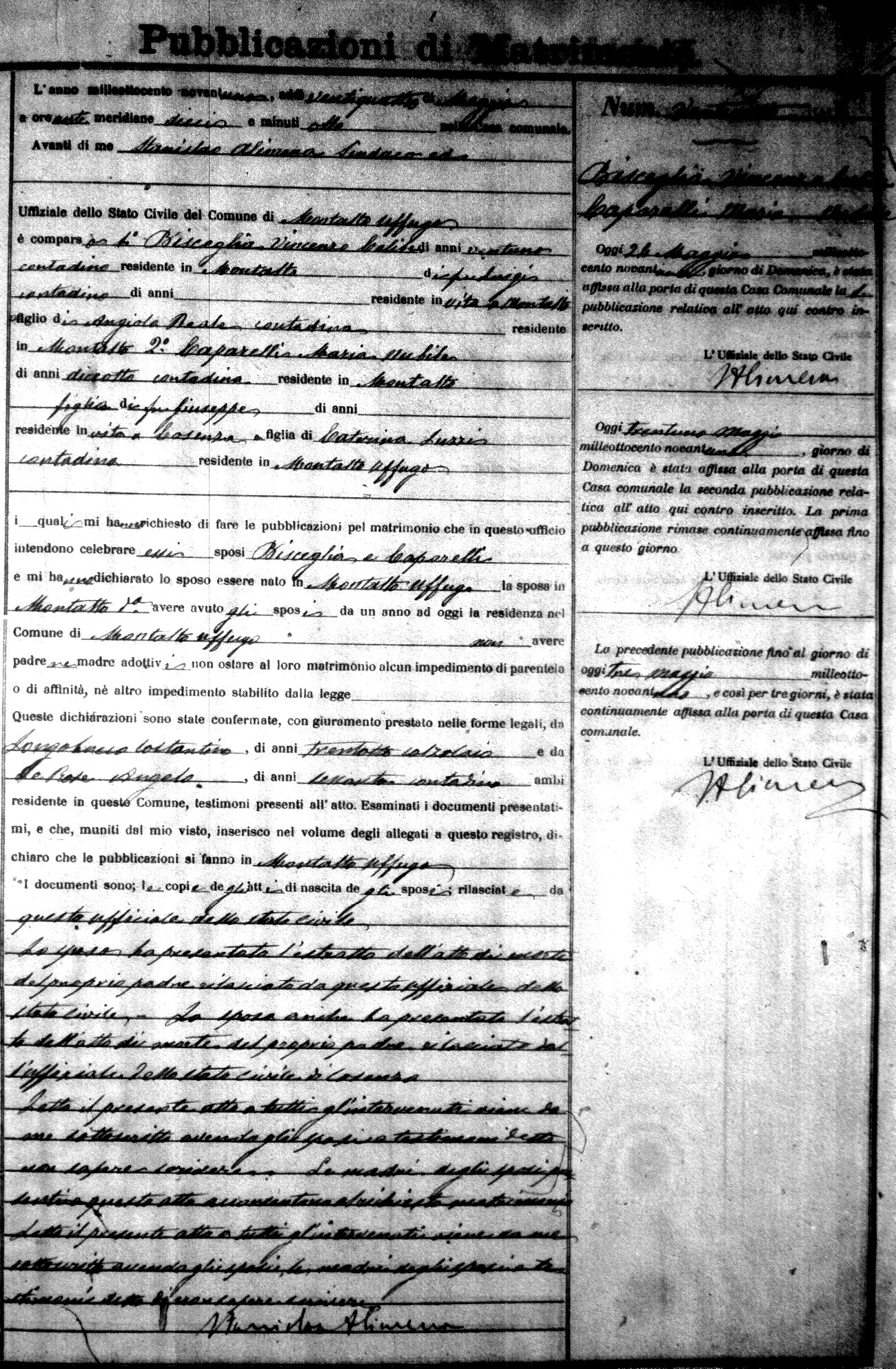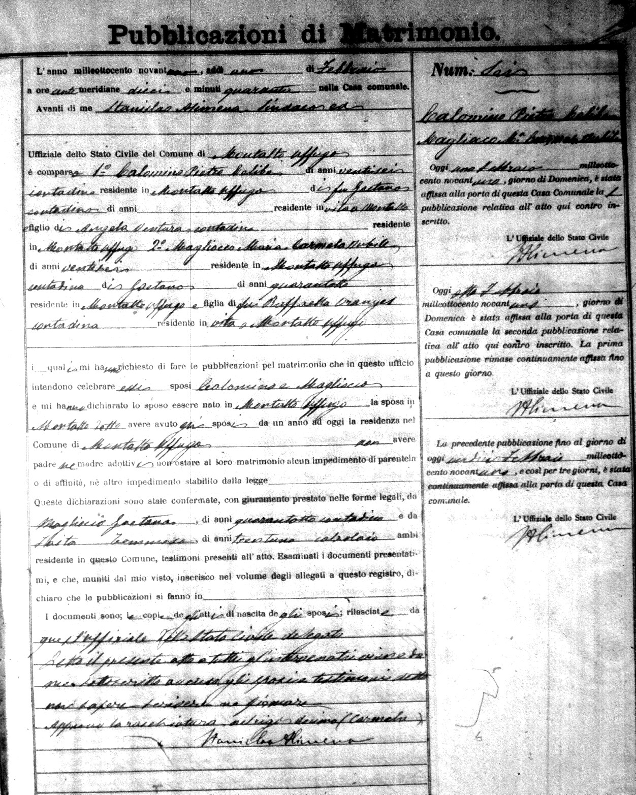 Here are the extractions for the marriage banns in 1891 for Montalto Uffugo. Each extraction has a link to a copy of the original document on the groom's surname. Please note: (fu) indicates the the person was deceased at the time of the marriage bann. For a translation of the basic Pubblicazioni document, look here.