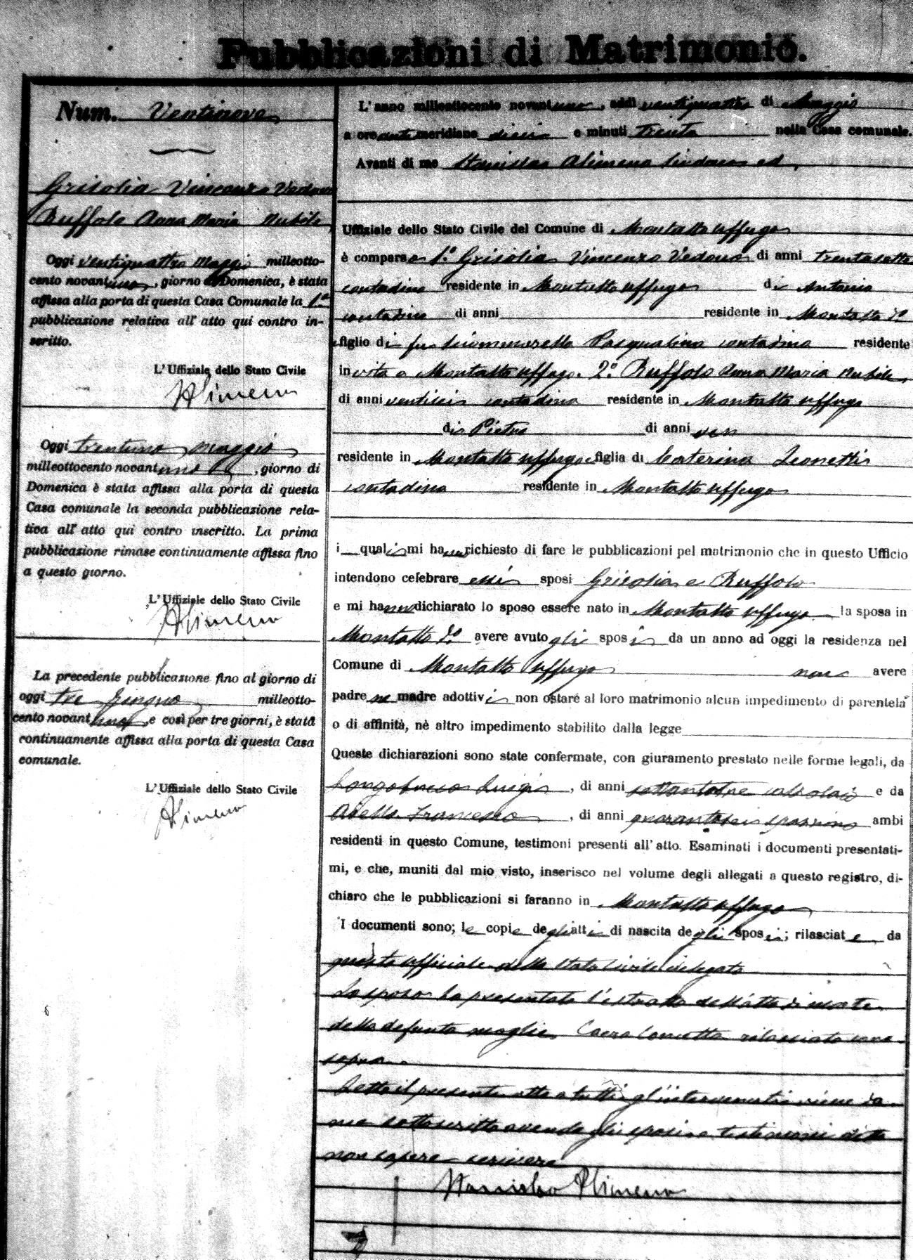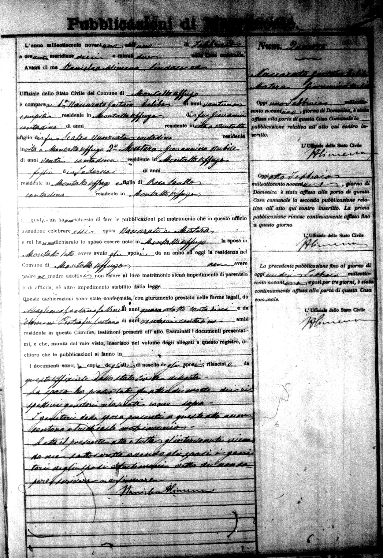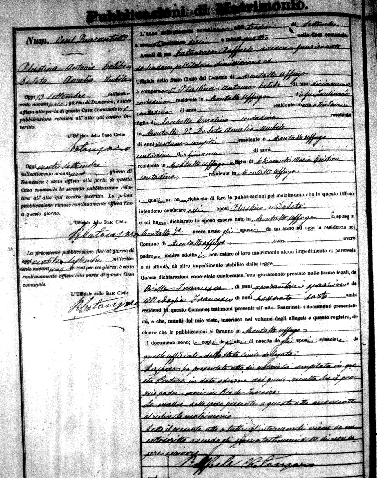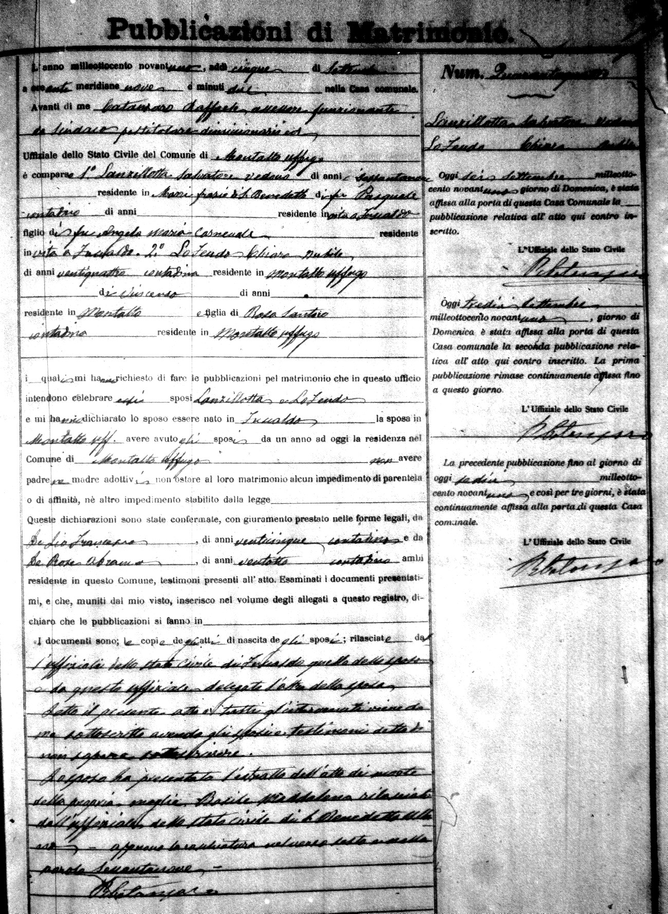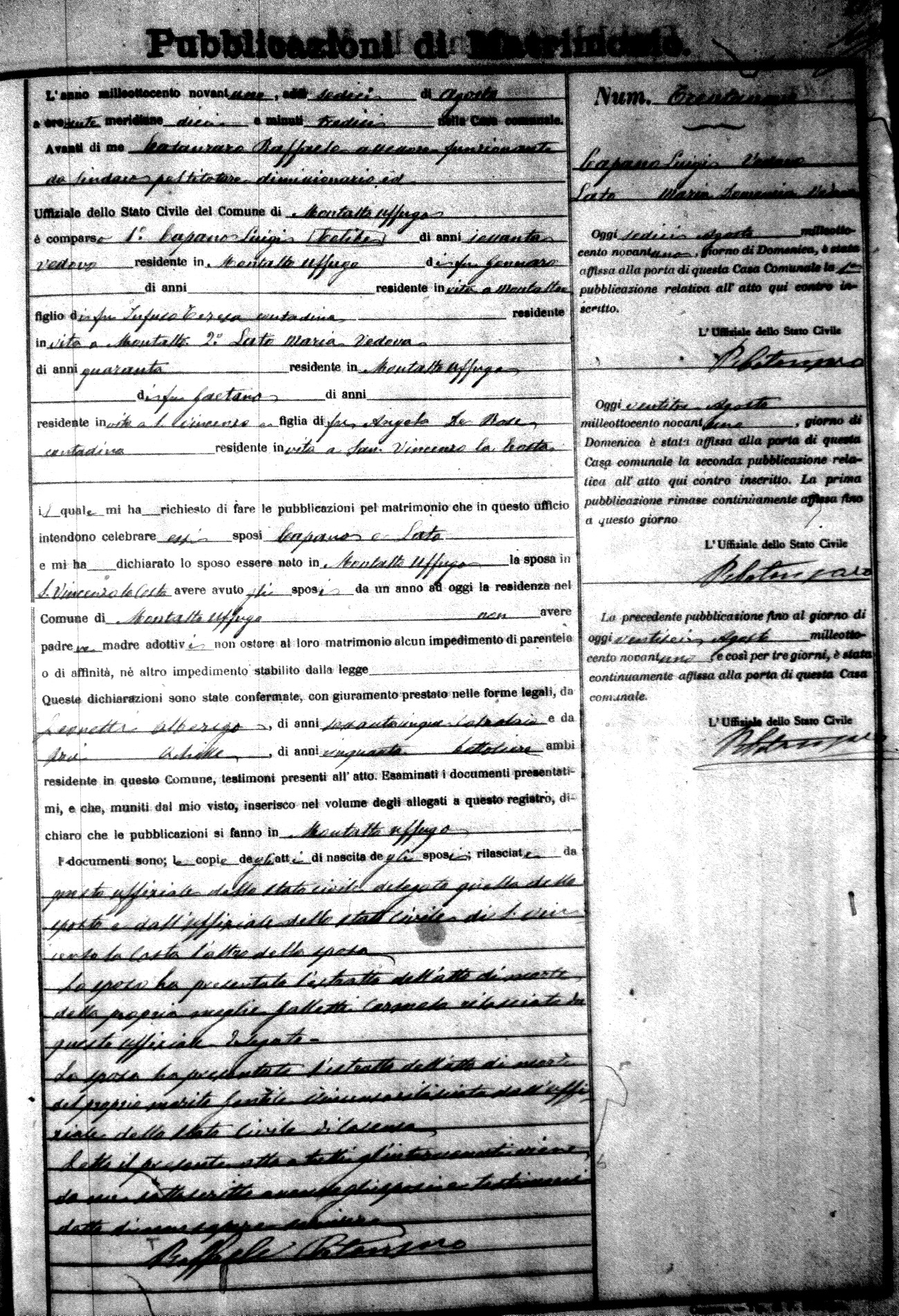 Here are the extractions for the marriage banns in 1891 for Montalto Uffugo. Each extraction has a link to a copy of the original document on the groom's surname. Please note: (fu) indicates the the person was deceased at the time of the marriage bann. For a translation of the basic Pubblicazioni document, look here.
