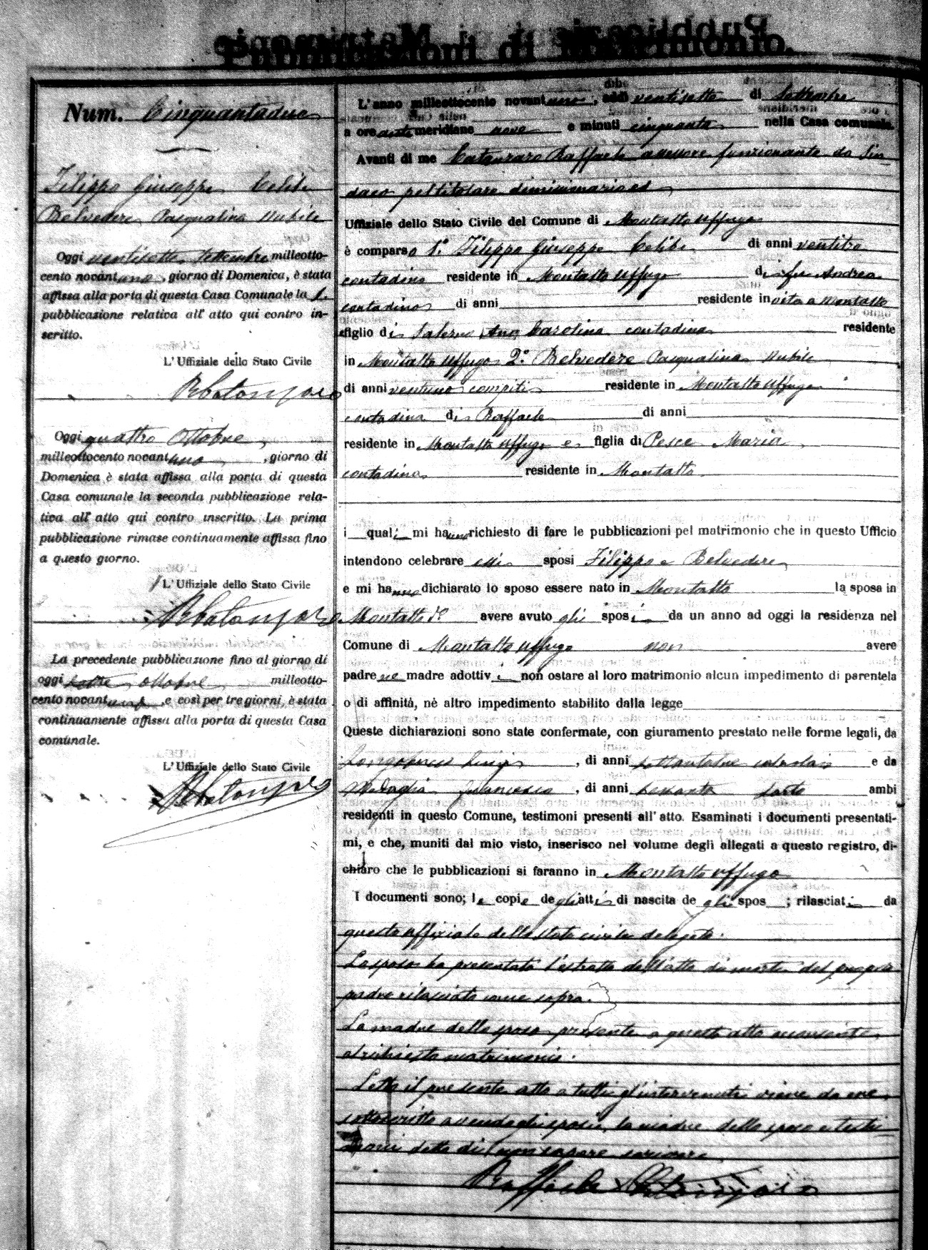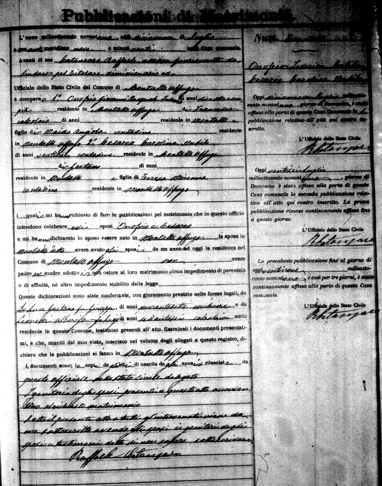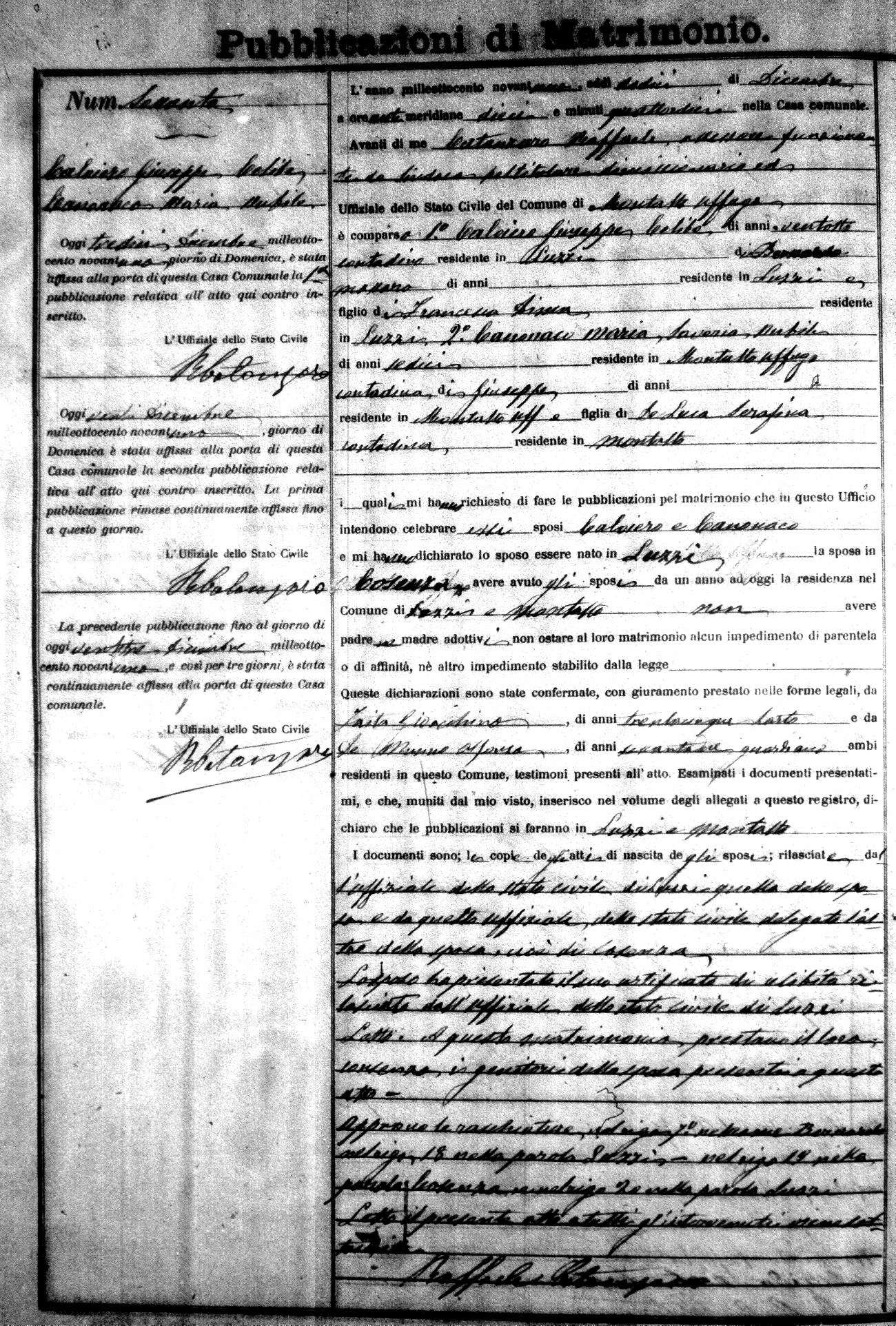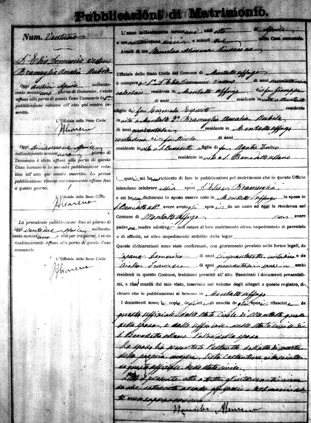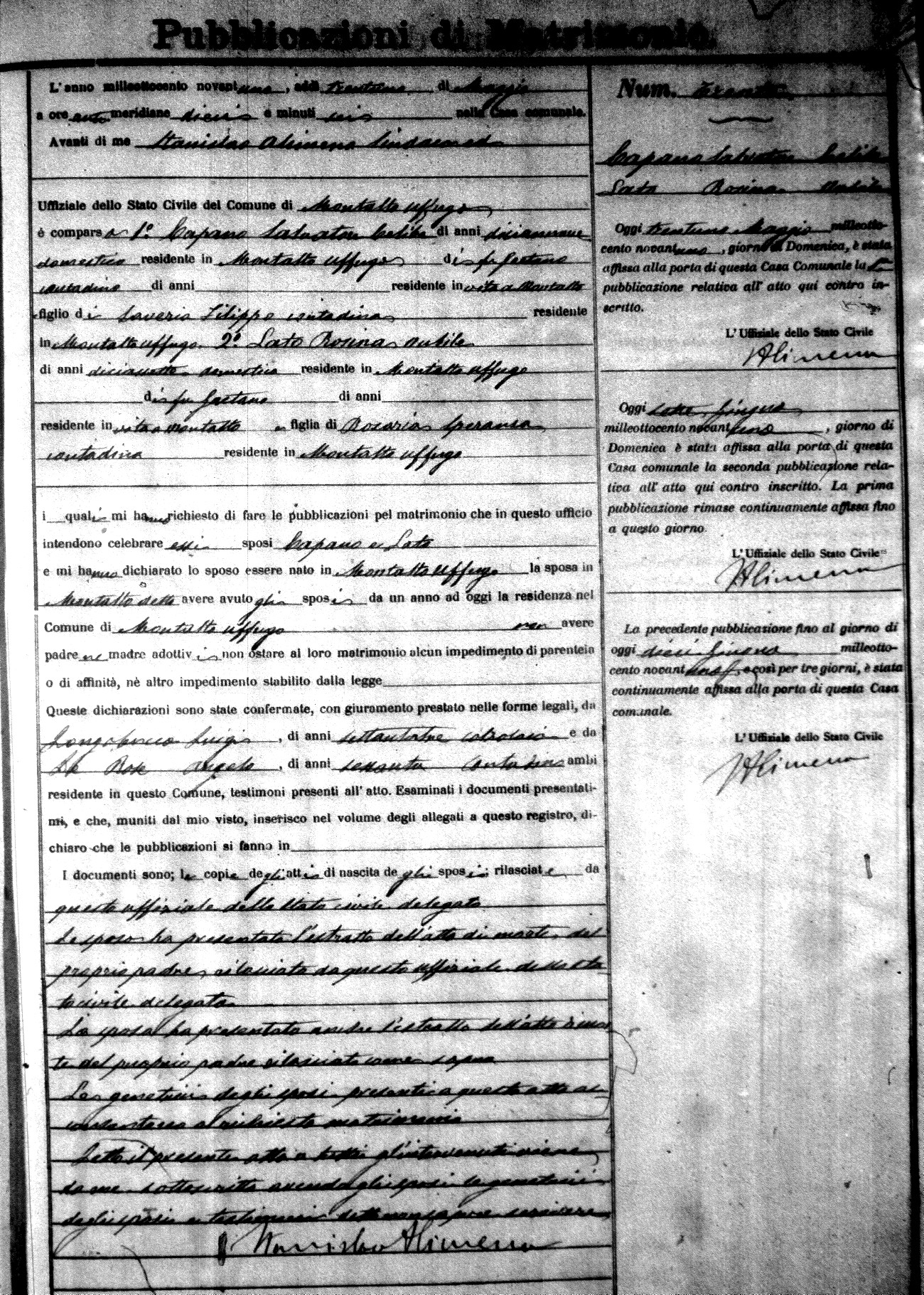 Here are the extractions for the marriage banns in 1891 for Montalto Uffugo. Each extraction has a link to a copy of the original document on the groom's surname. Please note: (fu) indicates the the person was deceased at the time of the marriage bann. For a translation of the basic Pubblicazioni document, look here.