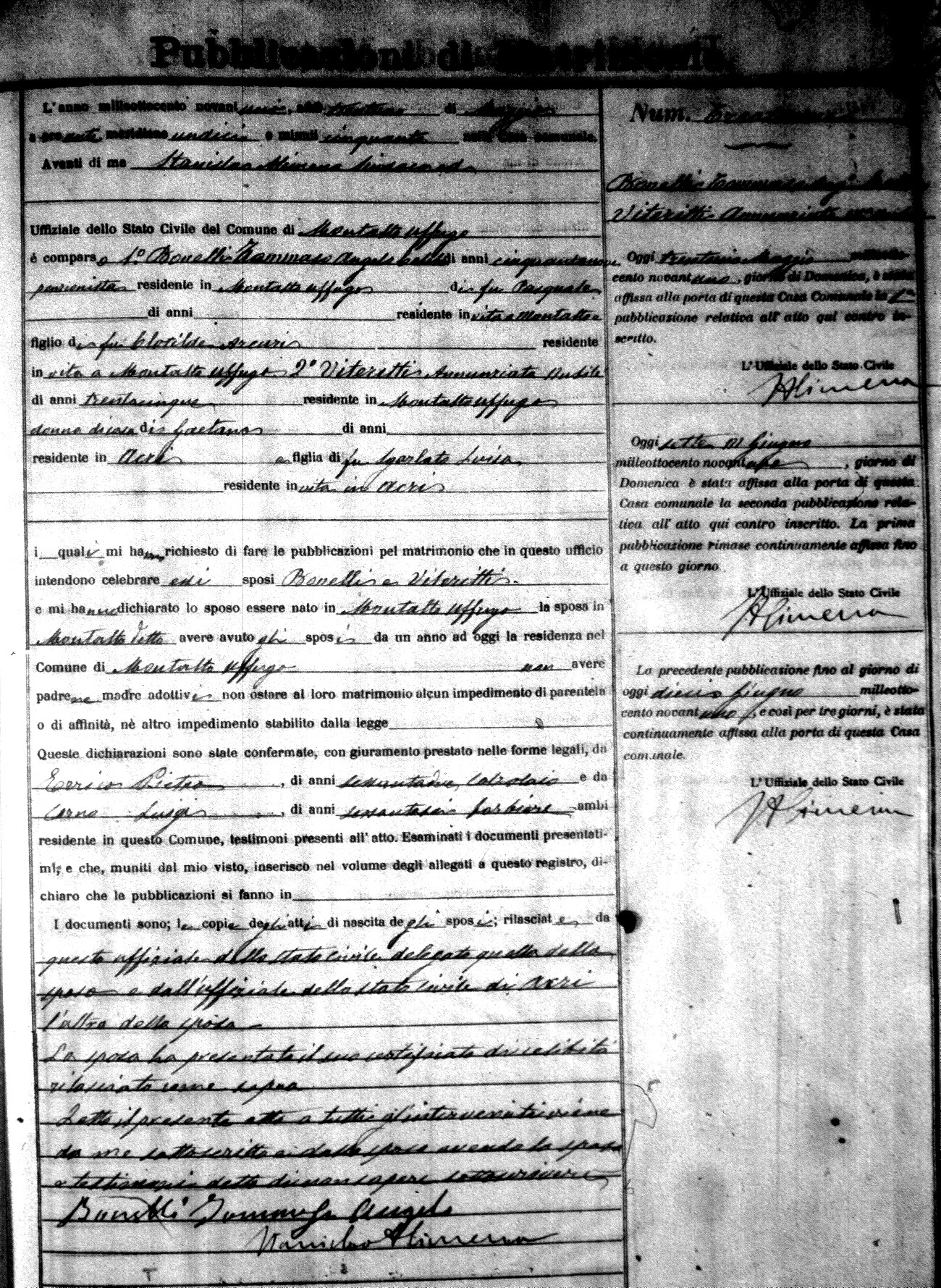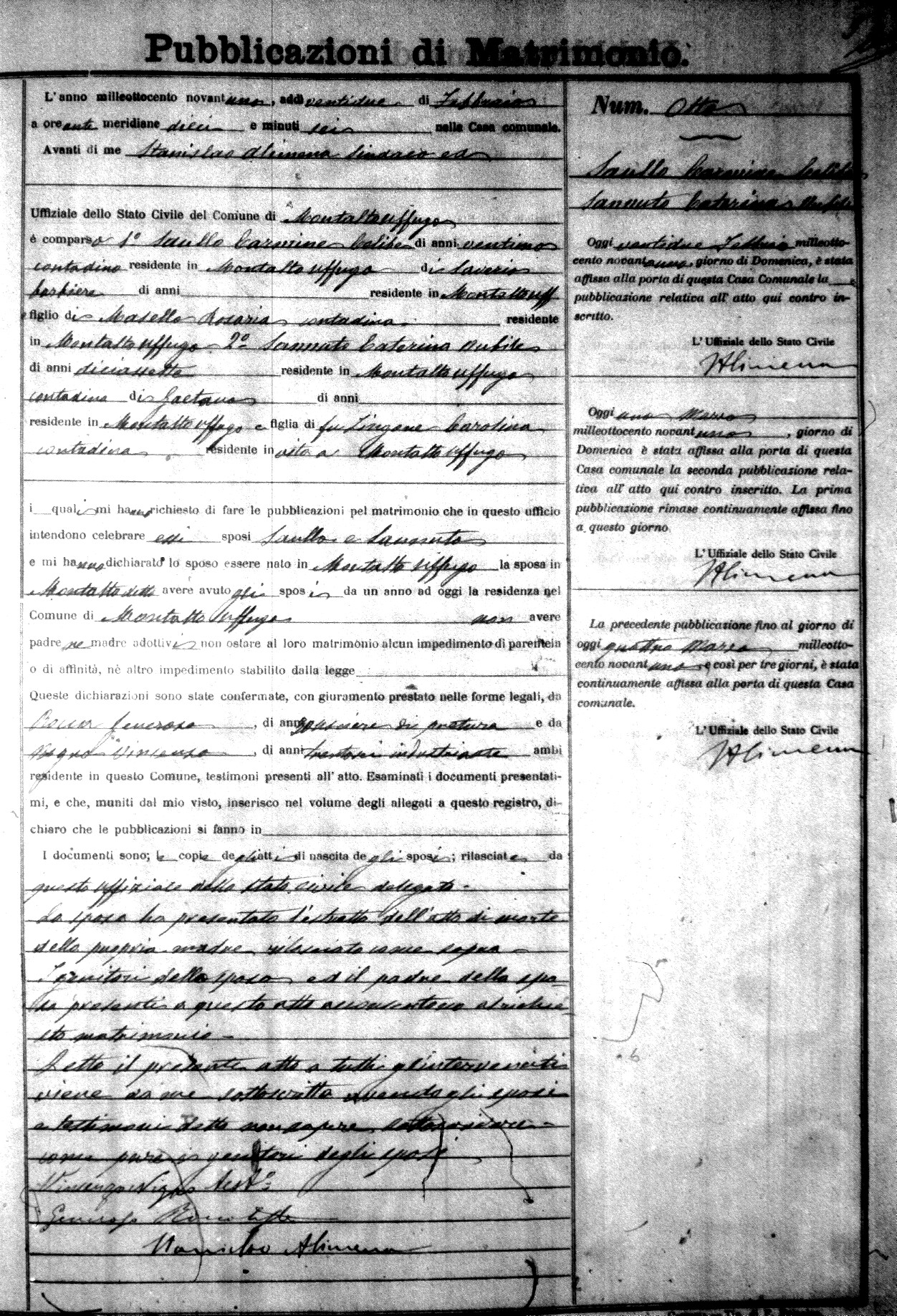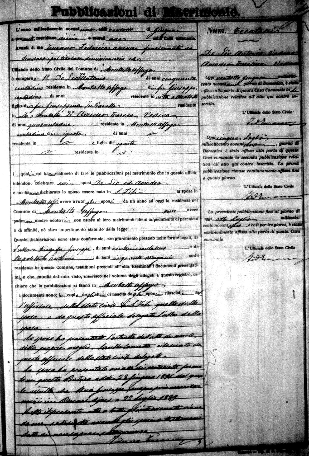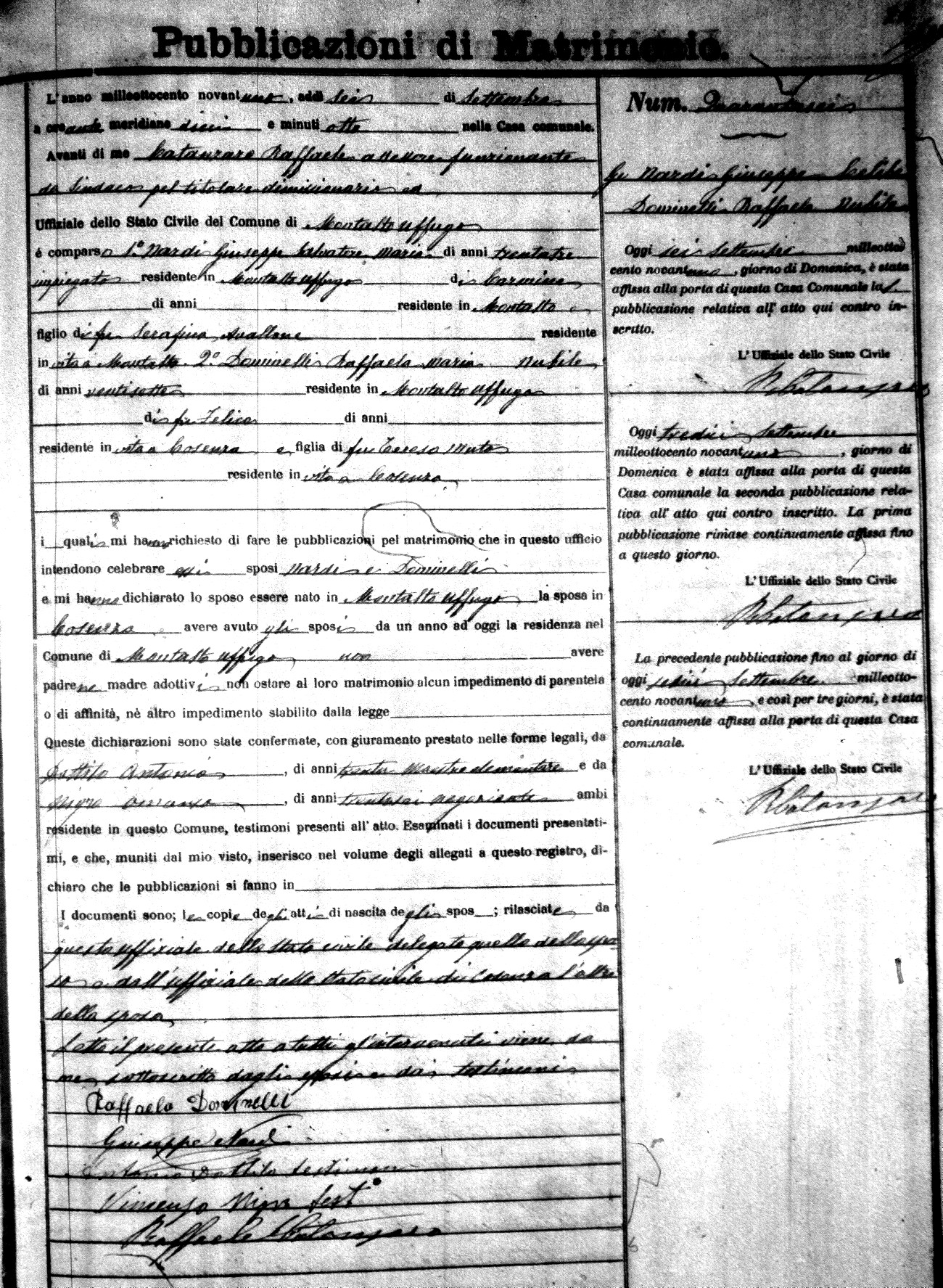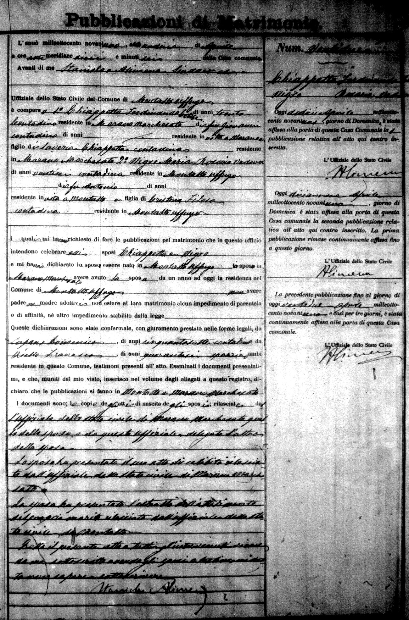Here are the extractions for the marriage banns in 1891 for Montalto Uffugo. Each extraction has a link to a copy of the original document on the groom's surname. Please note: (fu) indicates the the person was deceased at the time of the marriage bann. For a translation of the basic Pubblicazioni document, look here.