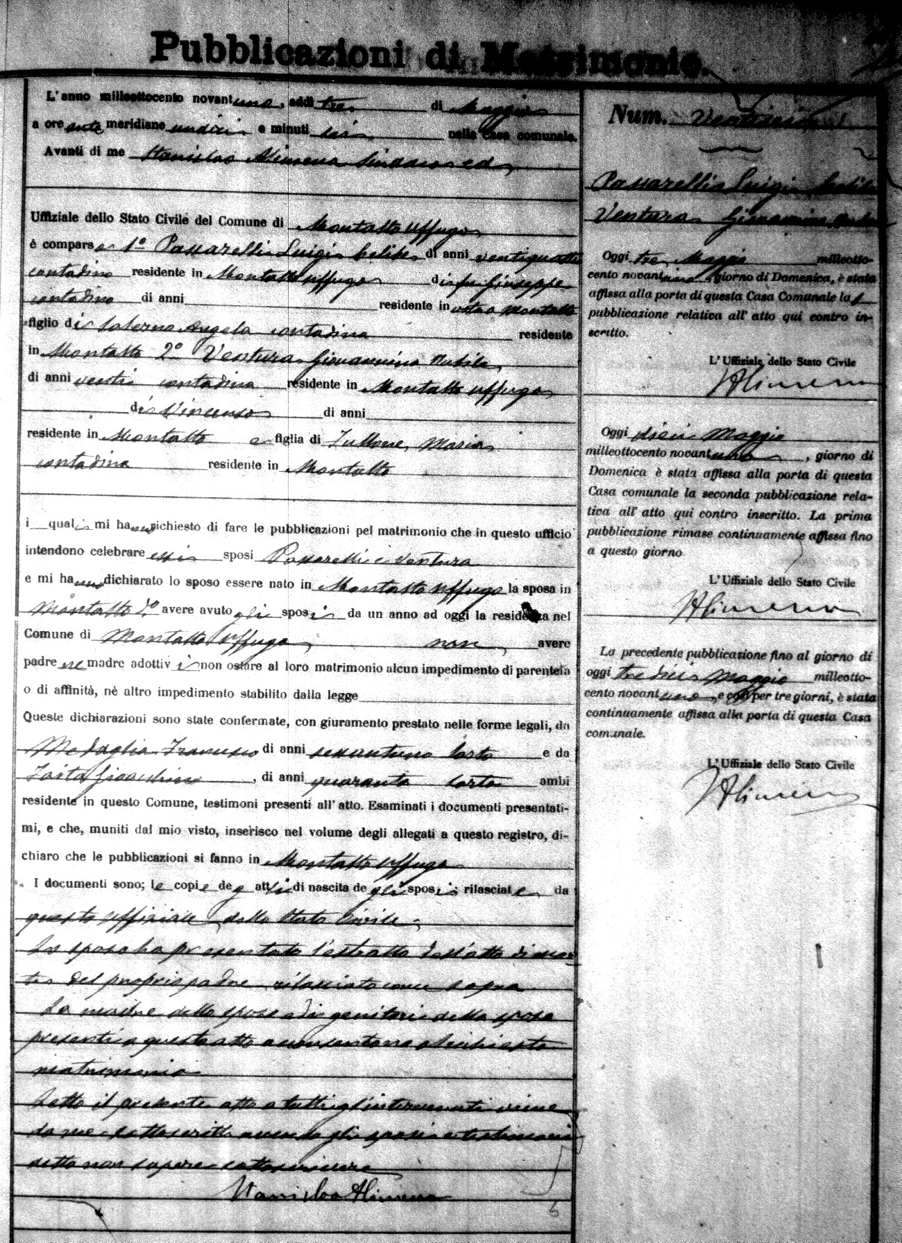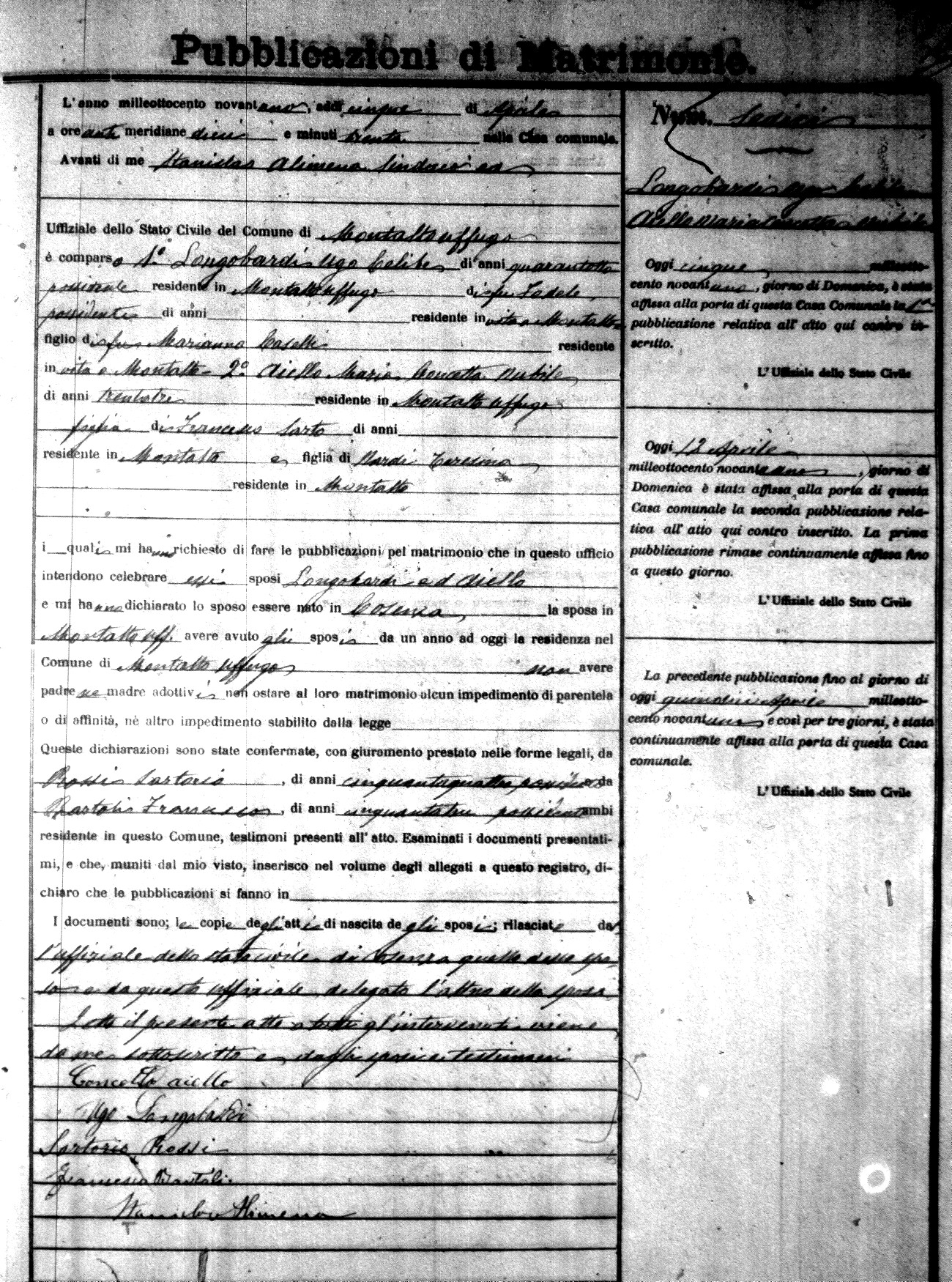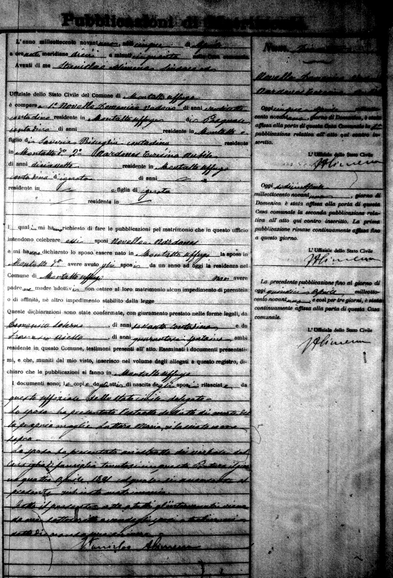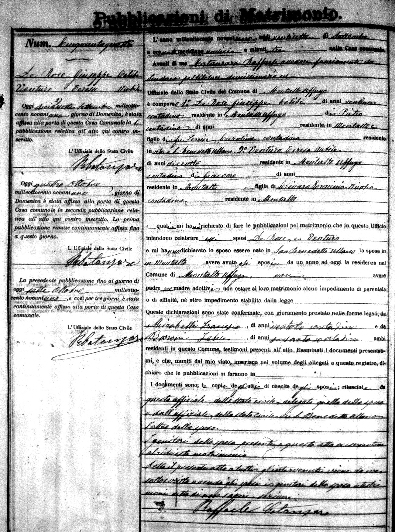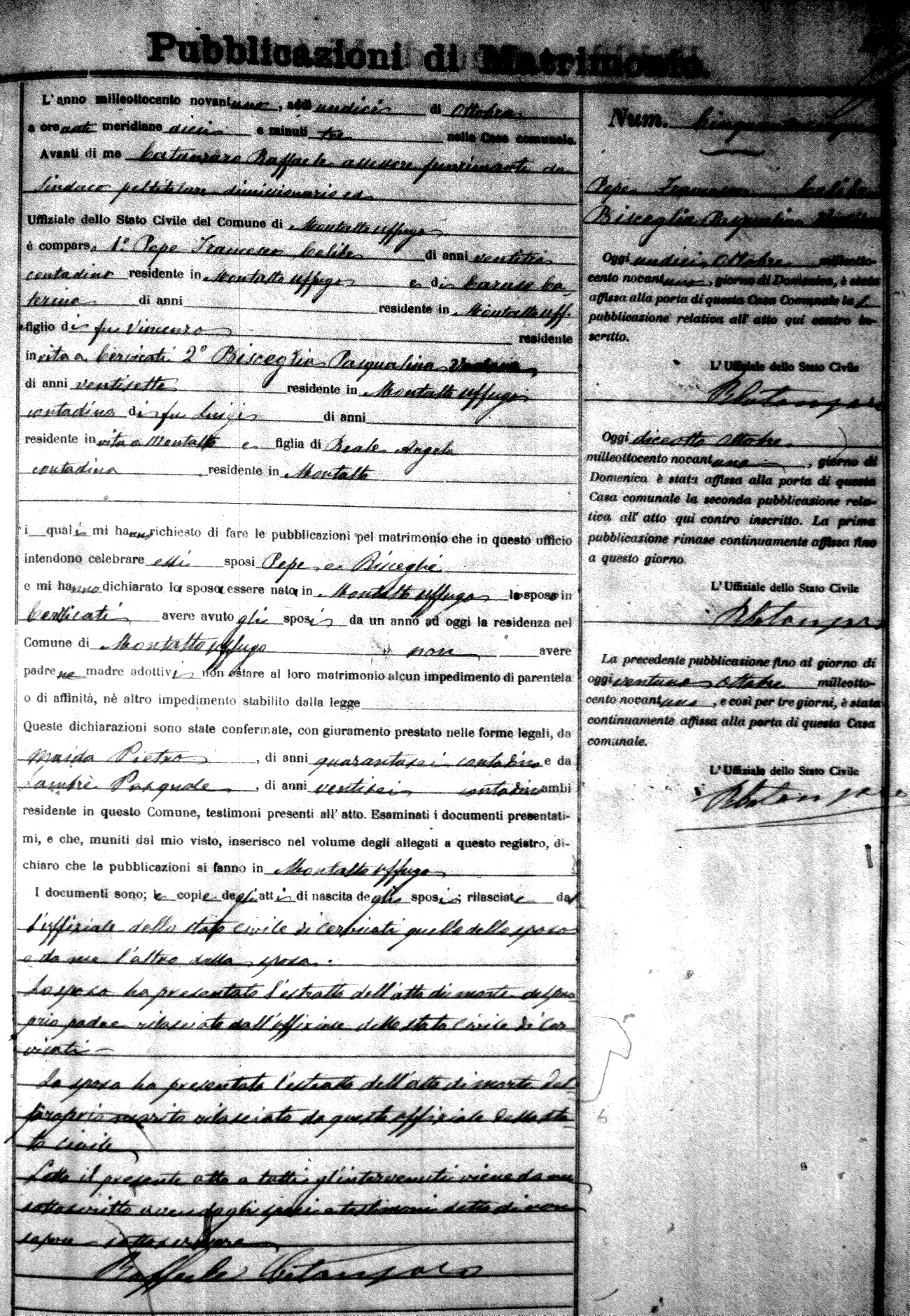 Here are the extractions for the marriage banns in 1891 for Montalto Uffugo. Each extraction has a link to a copy of the original document on the groom's surname. Please note: (fu) indicates the the person was deceased at the time of the marriage bann. For a translation of the basic Pubblicazioni document, look here.
