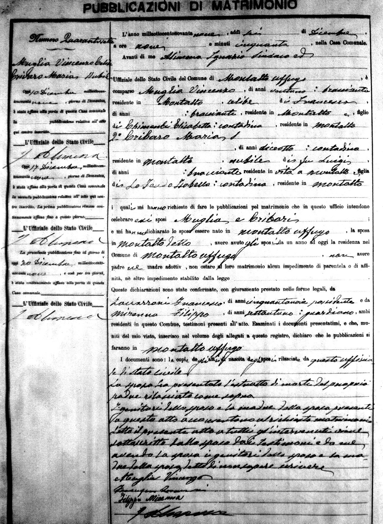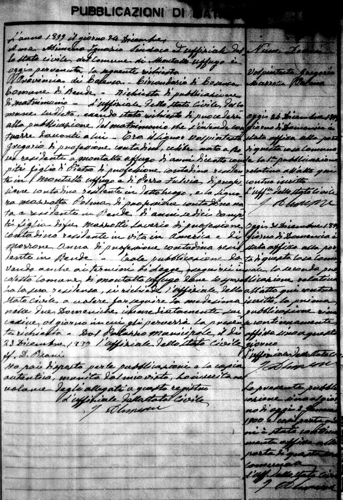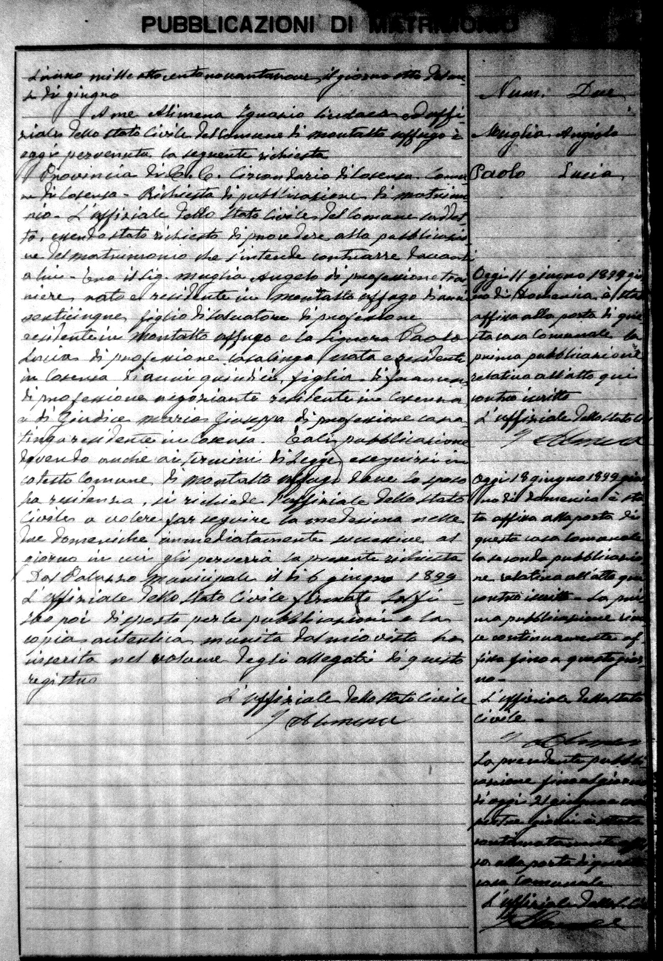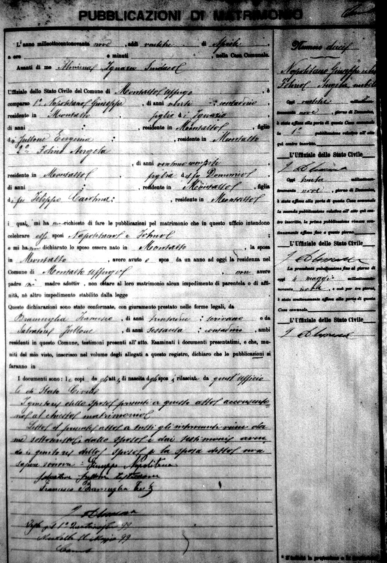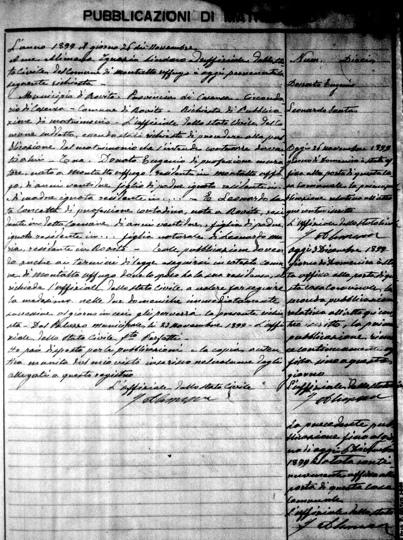 Here are the extractions for the marriage banns in 1899 for Montalto Uffugo. Each extraction has a link to a copy of the original document on the groom's surname. Please note: (fu) indicates the the person was deceased at the time of the marriage bann. For a translation of the basic Pubblicazioni document, look here.