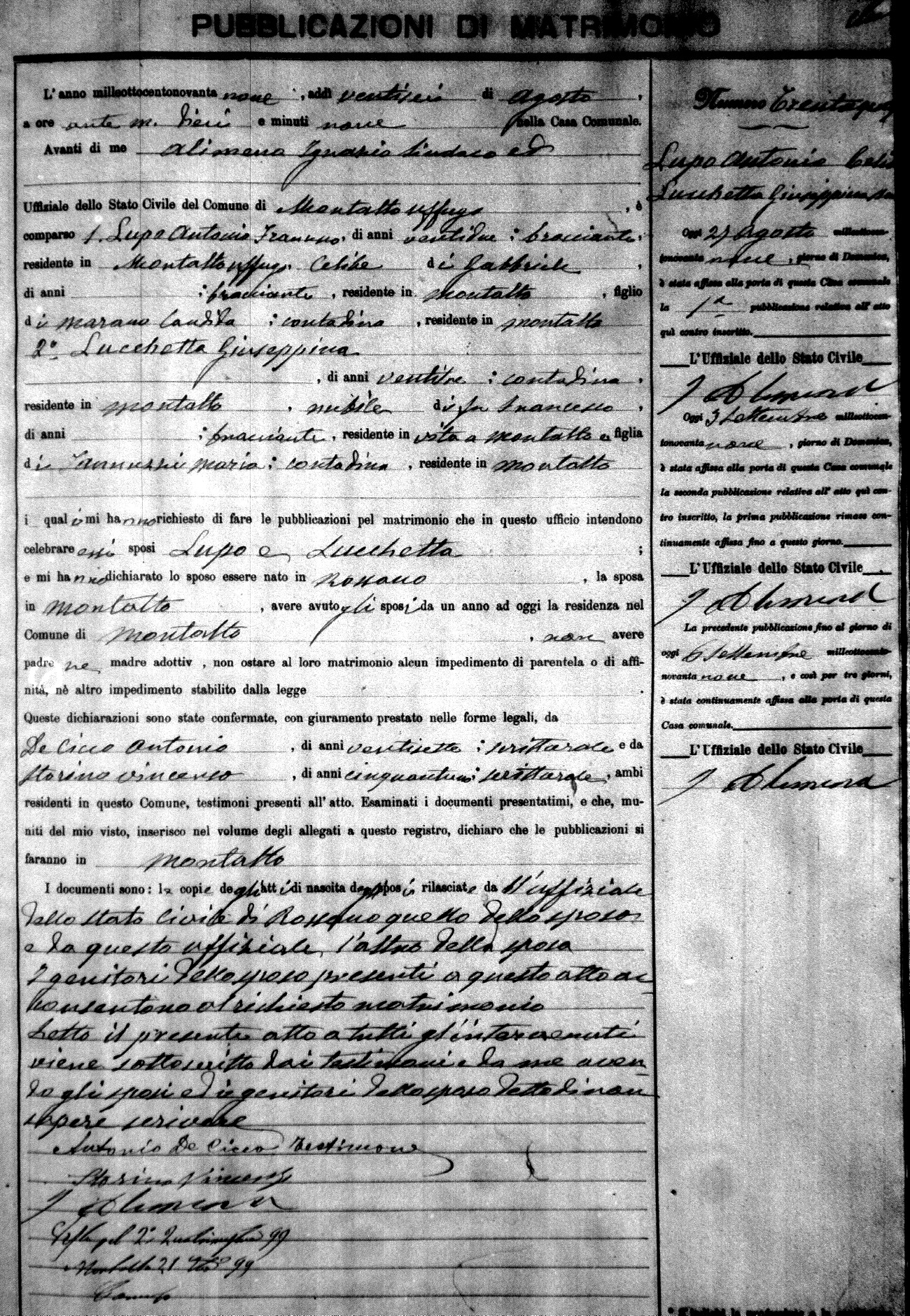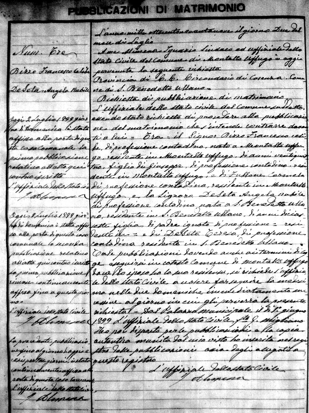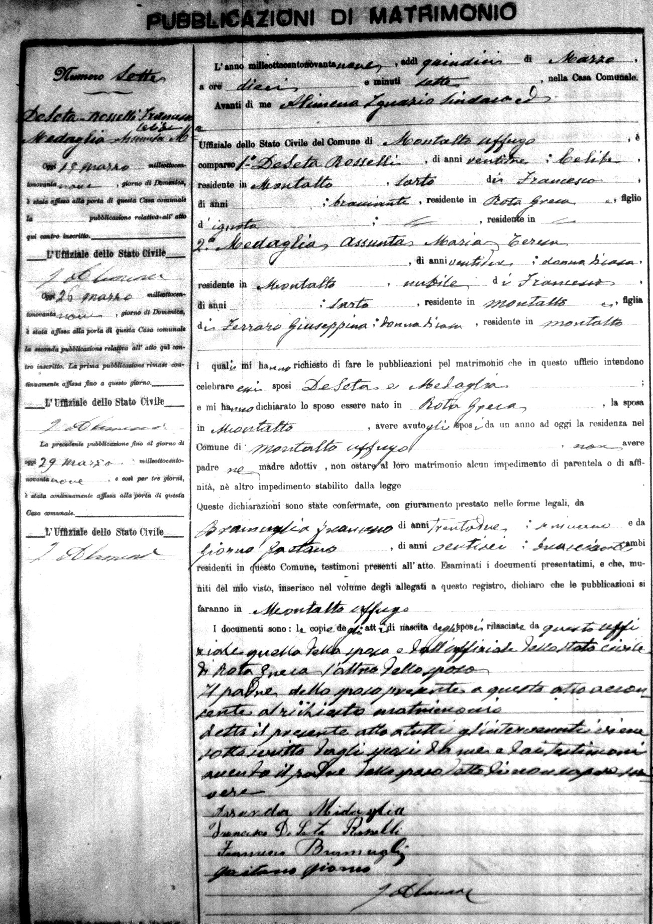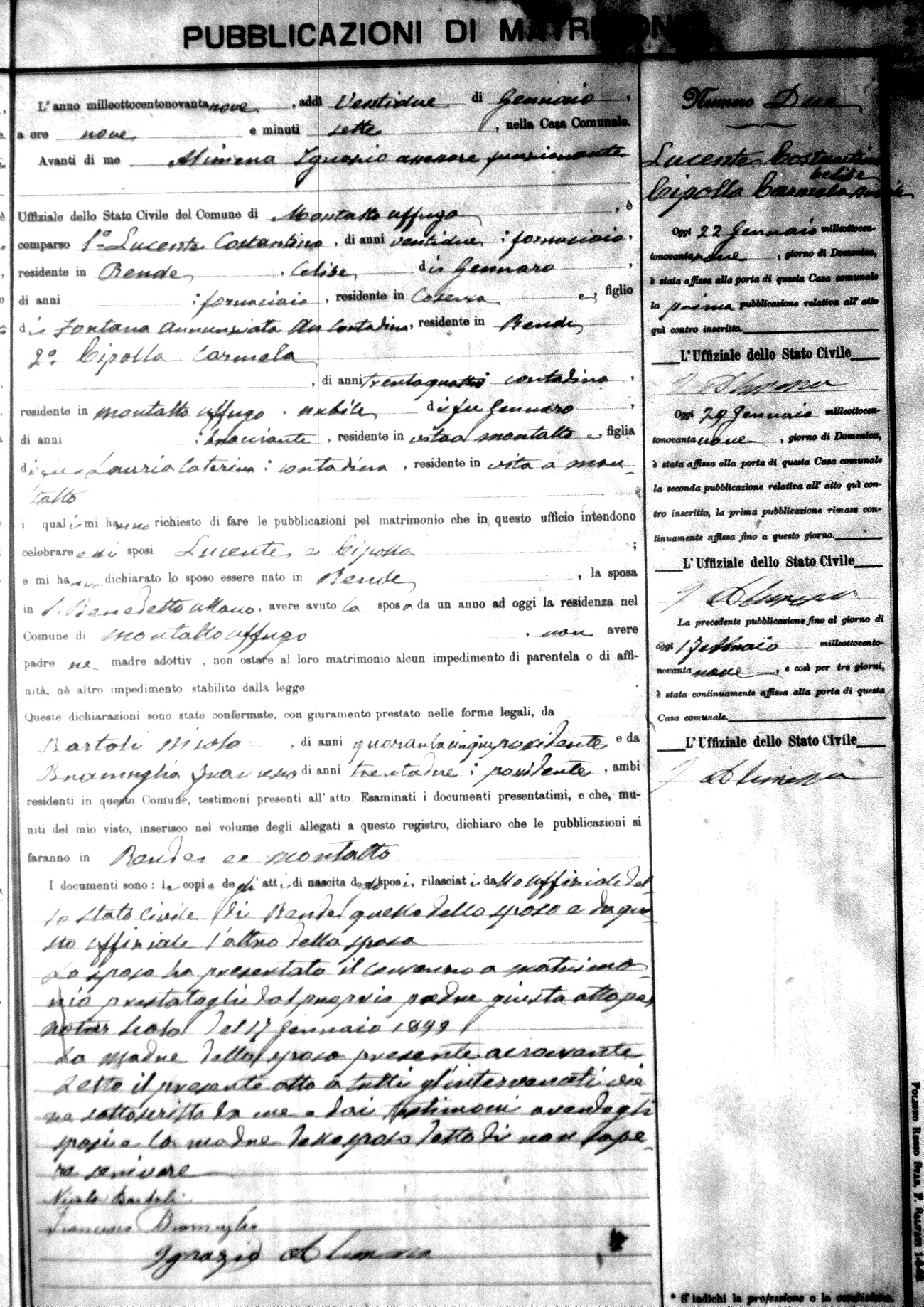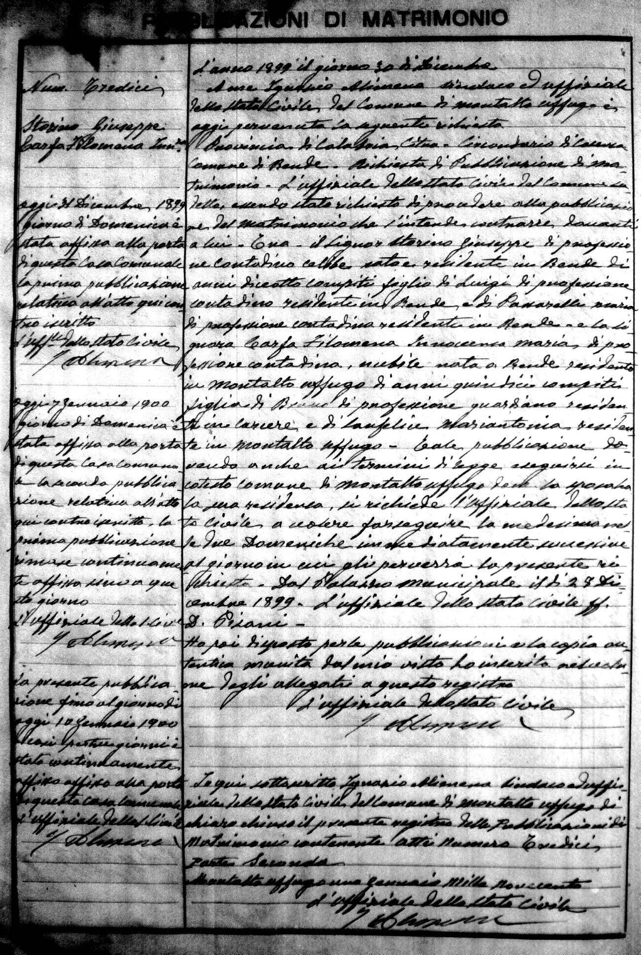Here are the extractions for the marriage banns in 1899 for Montalto Uffugo. Each extraction has a link to a copy of the original document on the groom's surname. Please note: (fu) indicates the the person was deceased at the time of the marriage bann. For a translation of the basic Pubblicazioni document, look here.