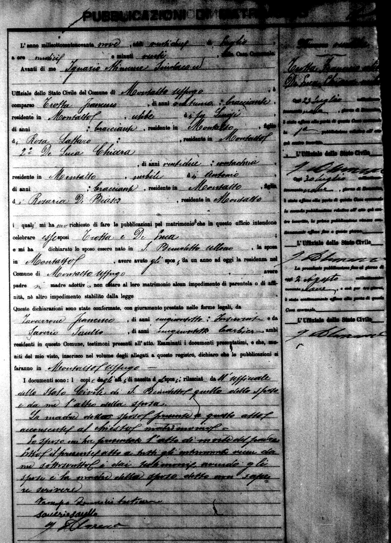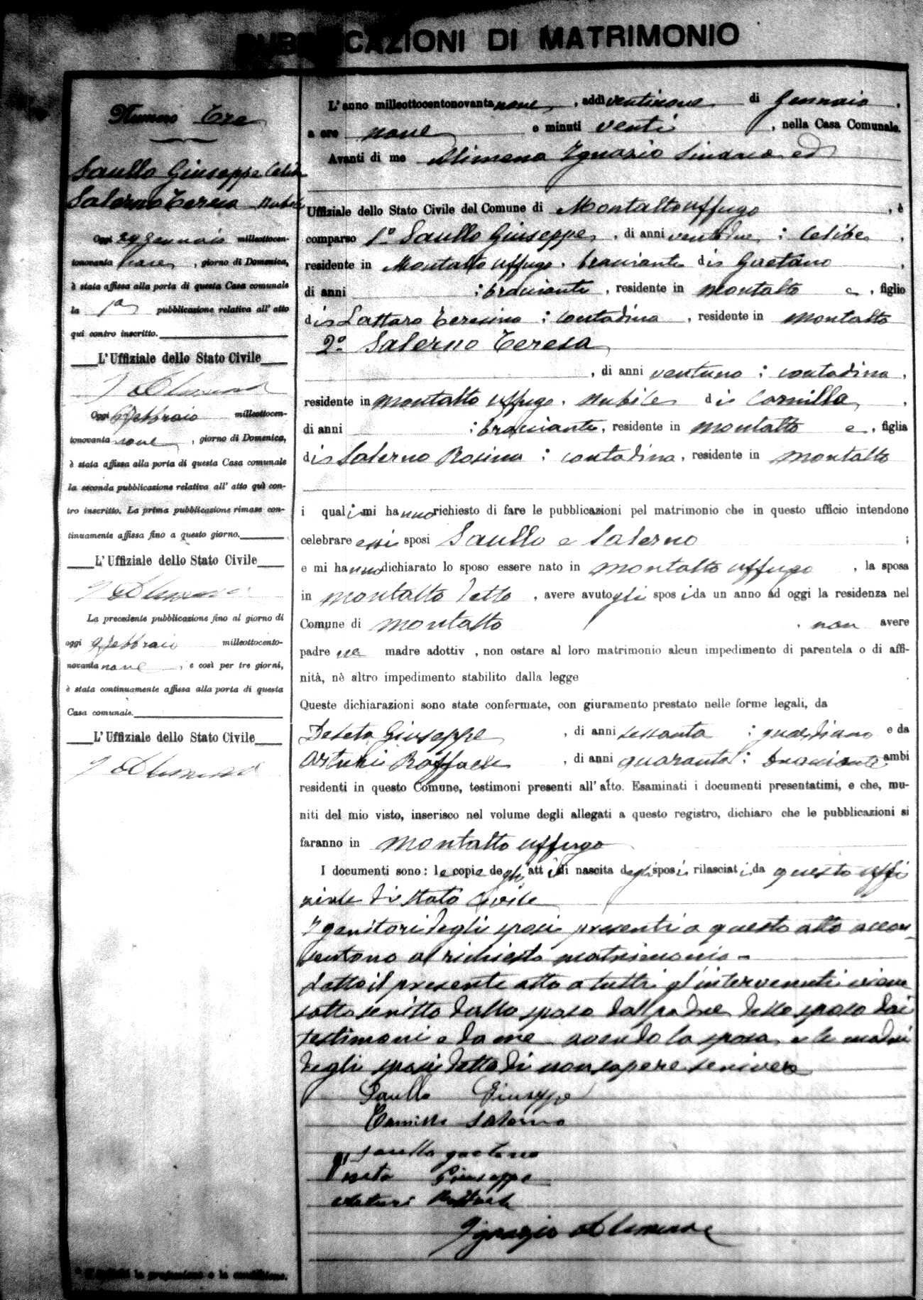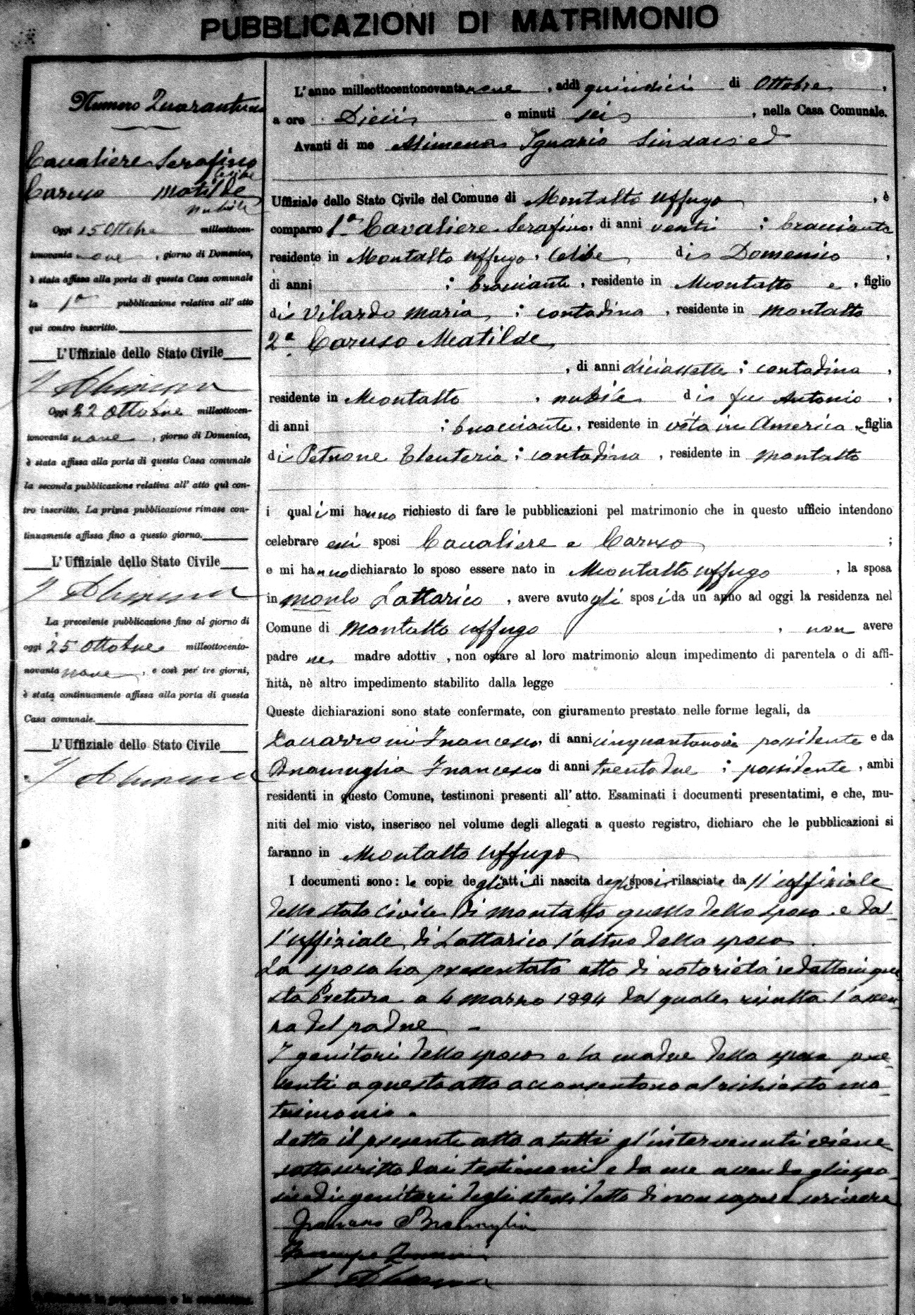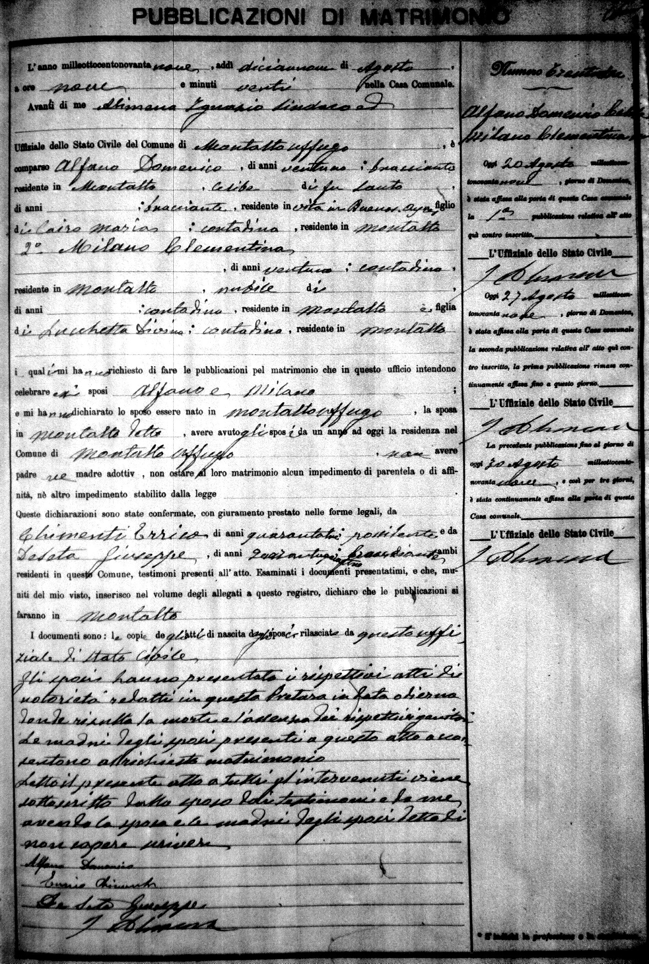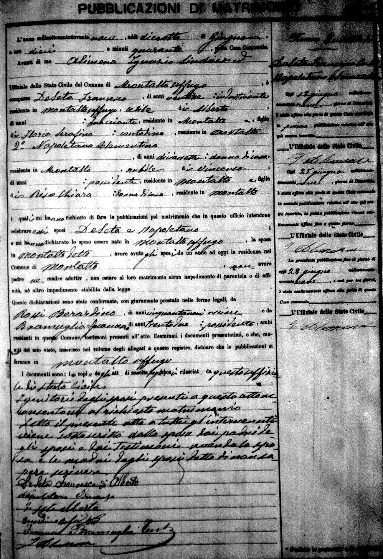 Here are the extractions for the marriage banns in 1899 for Montalto Uffugo. Each extraction has a link to a copy of the original document on the groom's surname. Please note: (fu) indicates the the person was deceased at the time of the marriage bann. For a translation of the basic Pubblicazioni document, look here.