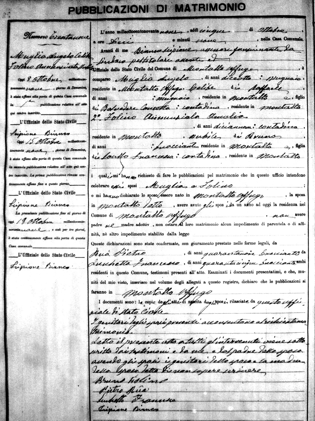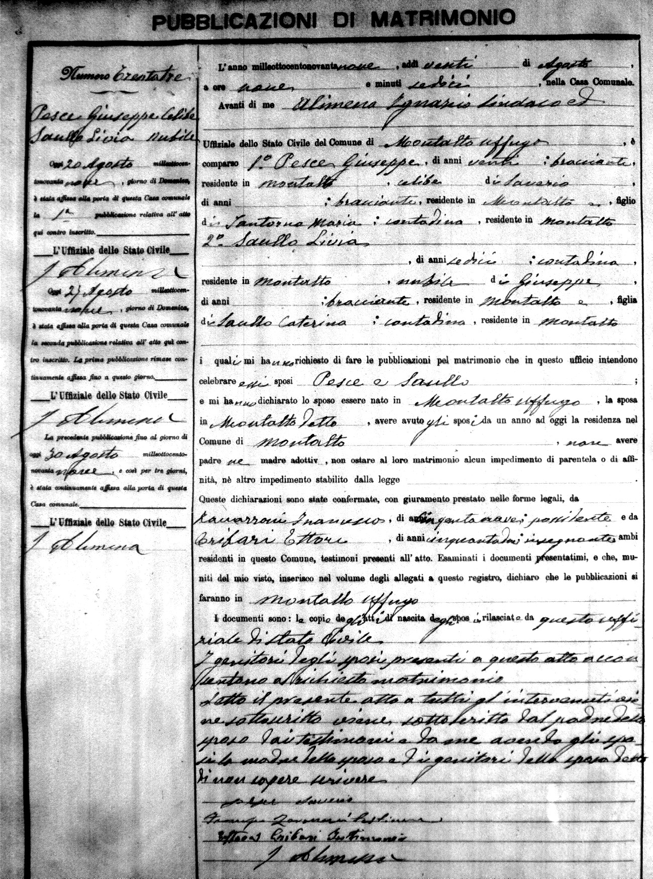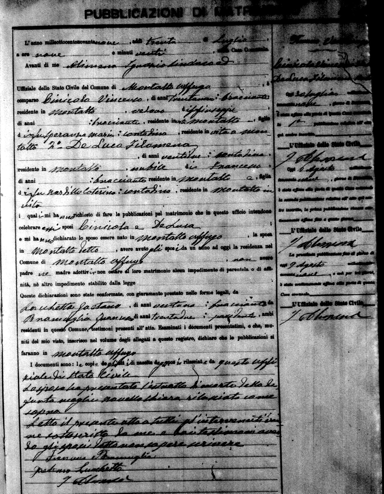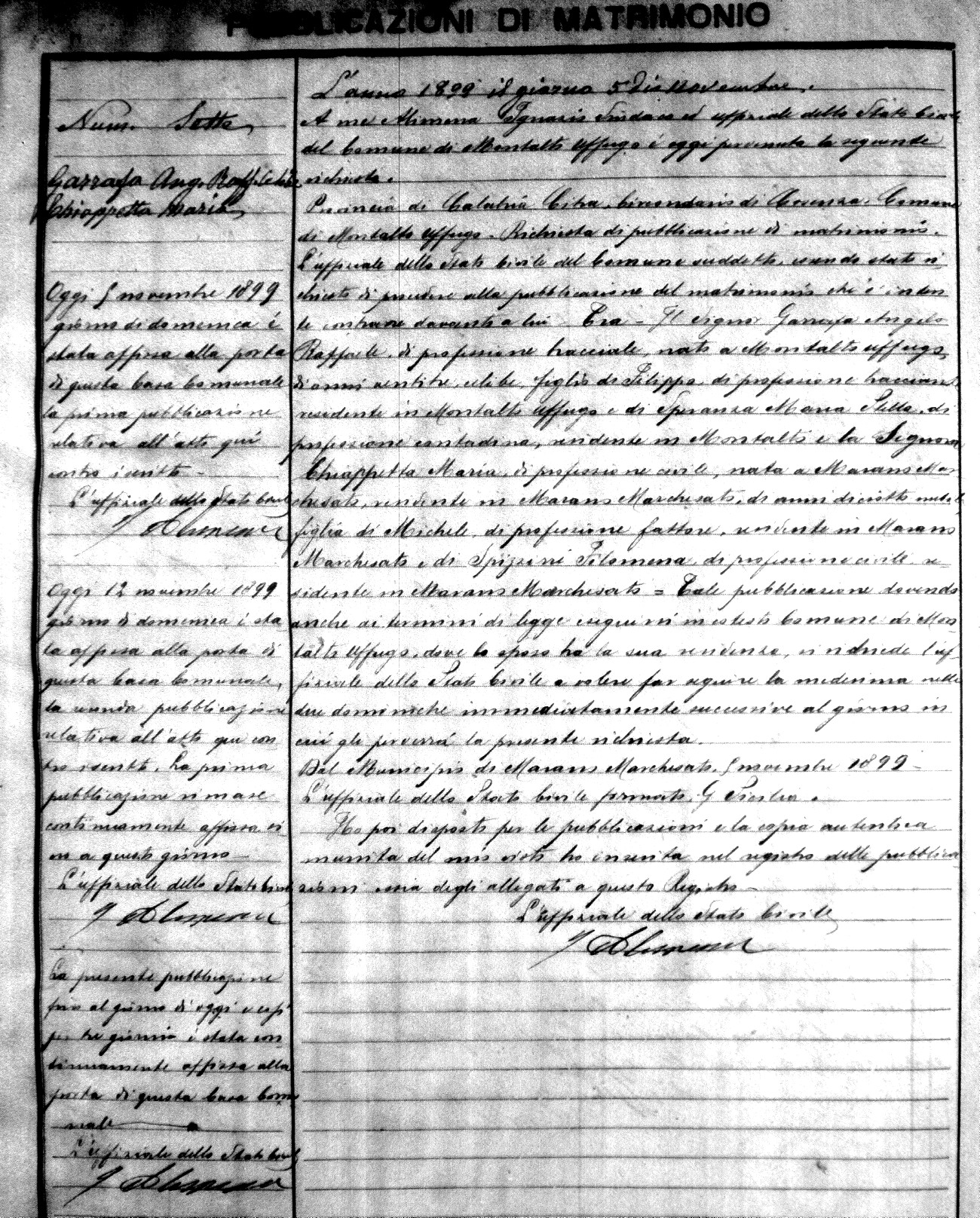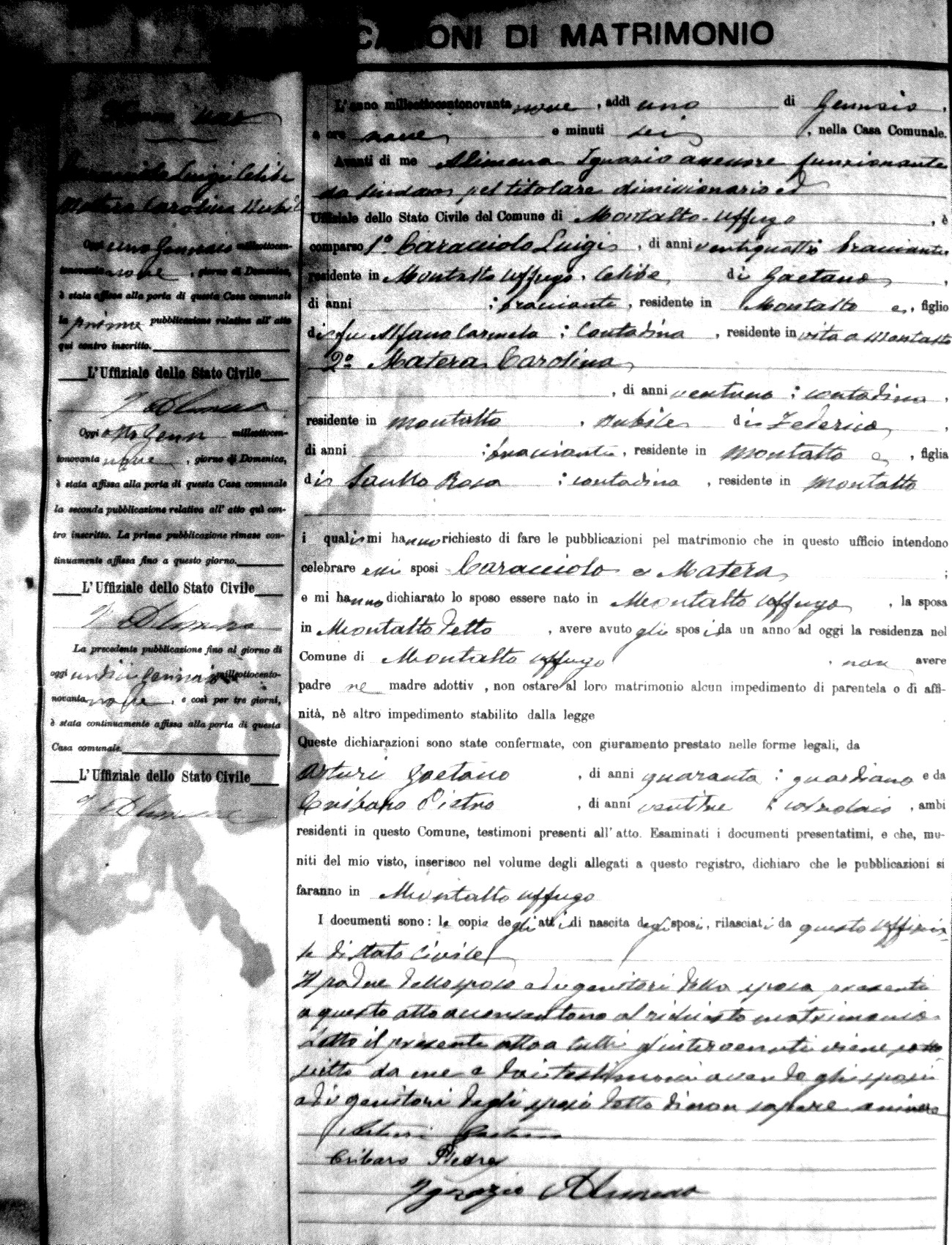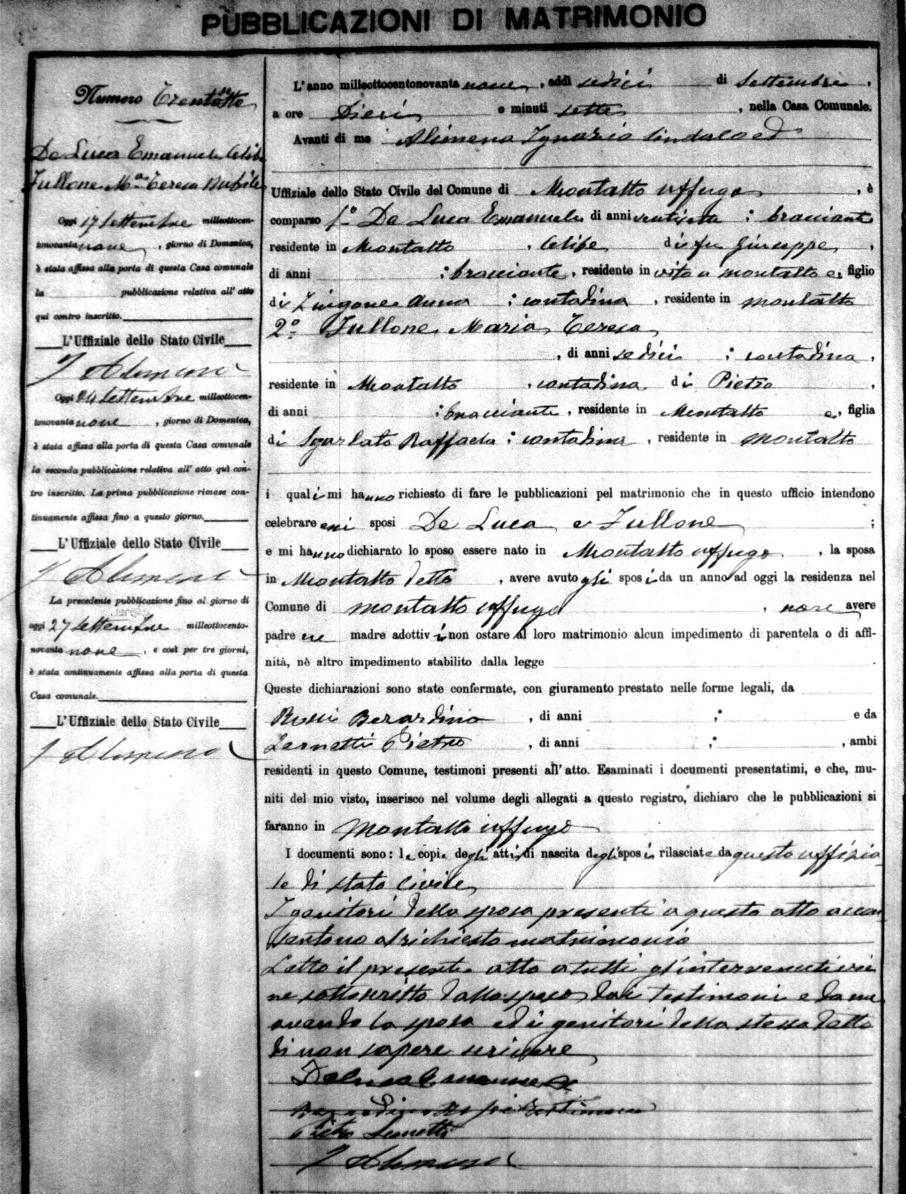 Here are the extractions for the marriage banns in 1899 for Montalto Uffugo. Each extraction has a link to a copy of the original document on the groom's surname. Please note: (fu) indicates the the person was deceased at the time of the marriage bann. For a translation of the basic Pubblicazioni document, look here.