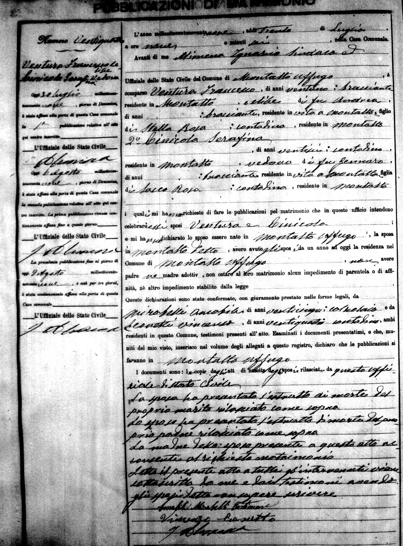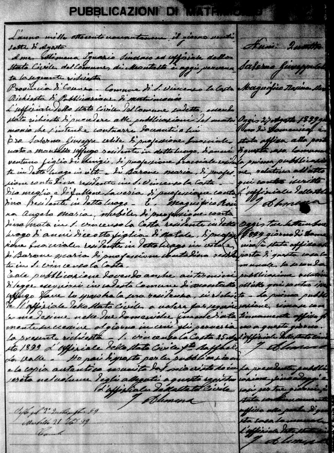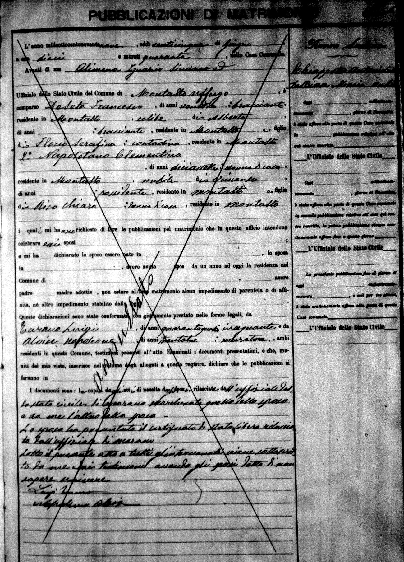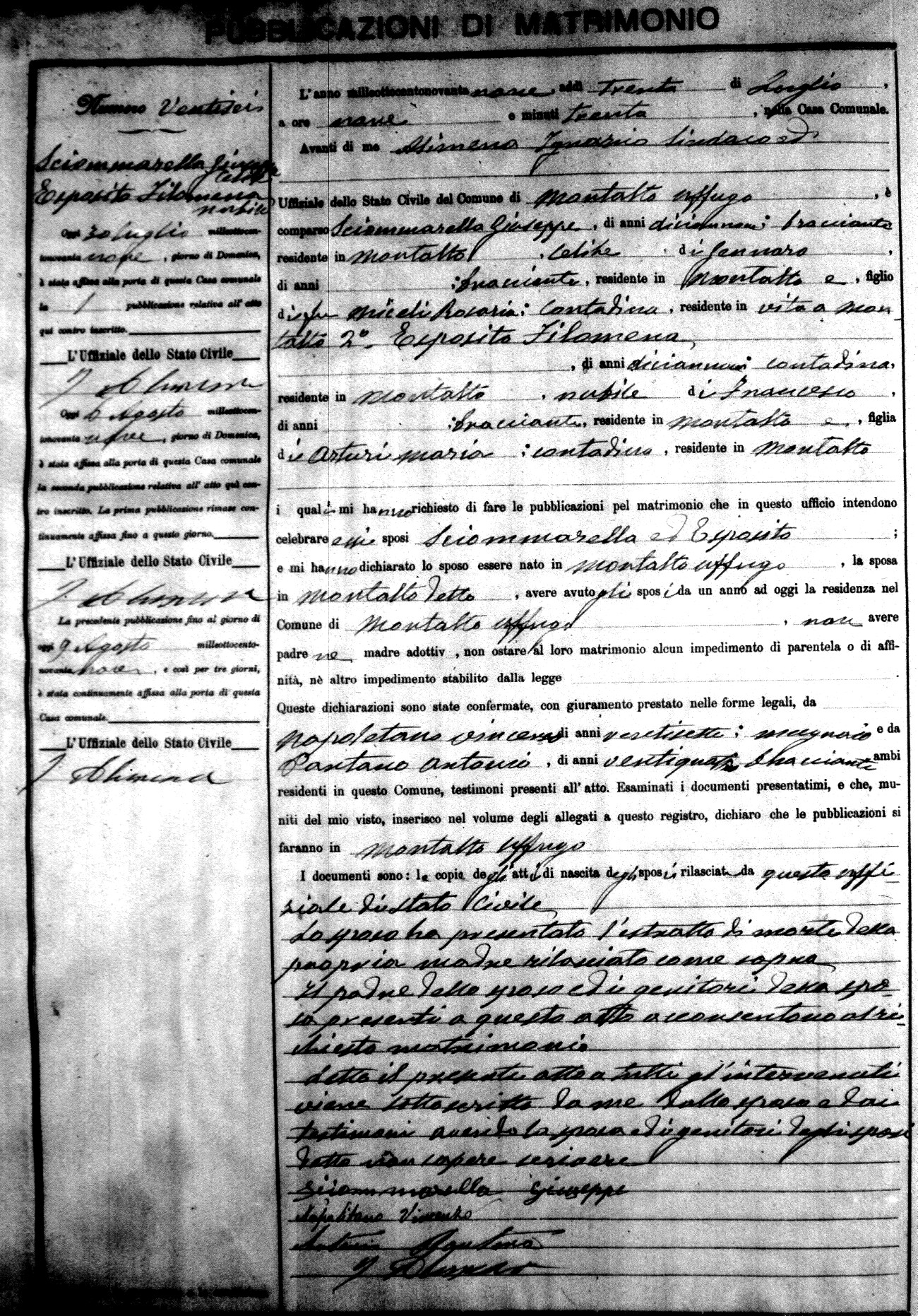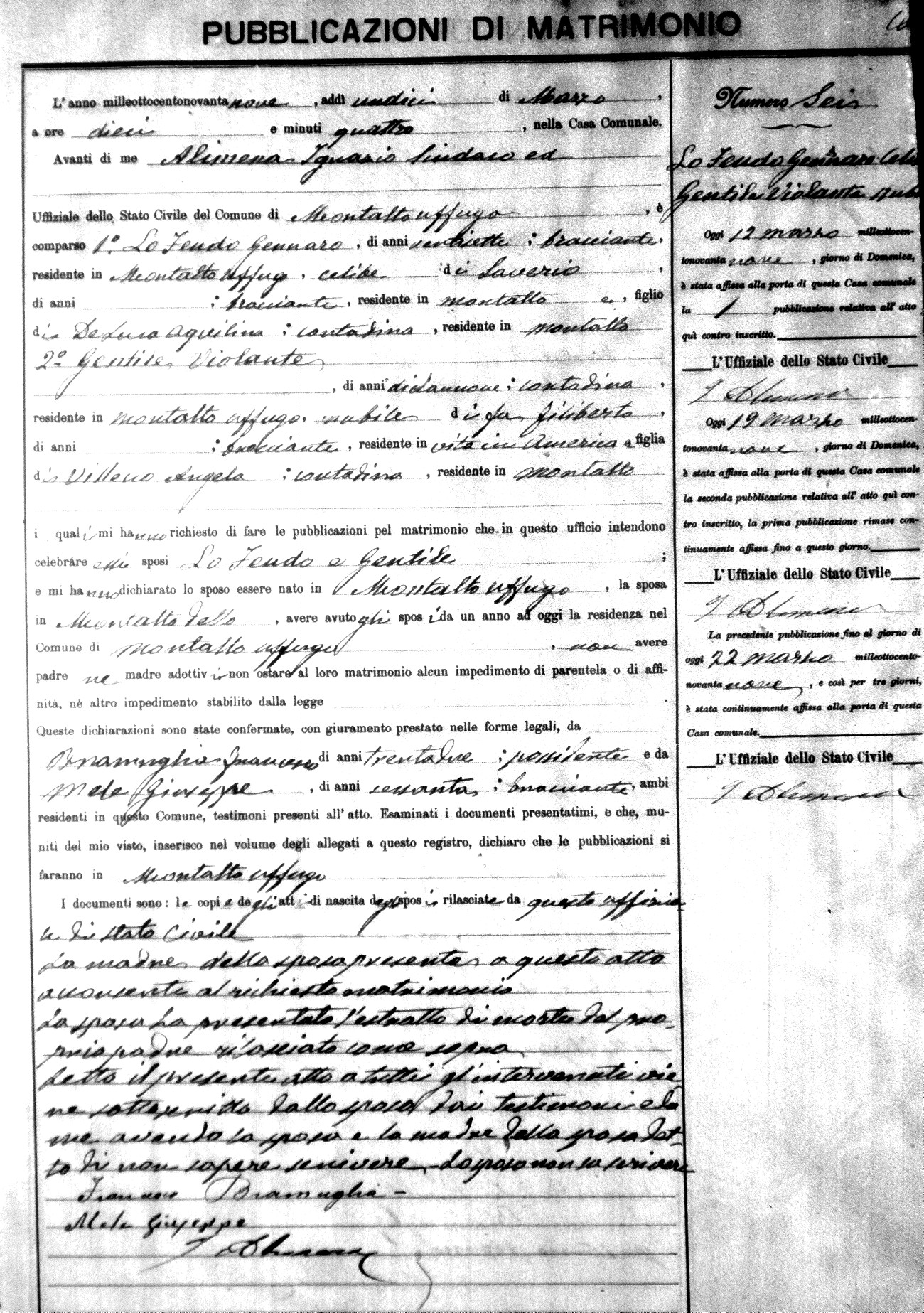 Here are the extractions for the marriage banns in 1899 for Montalto Uffugo. Each extraction has a link to a copy of the original document on the groom's surname. Please note: (fu) indicates the the person was deceased at the time of the marriage bann. For a translation of the basic Pubblicazioni document, look here.