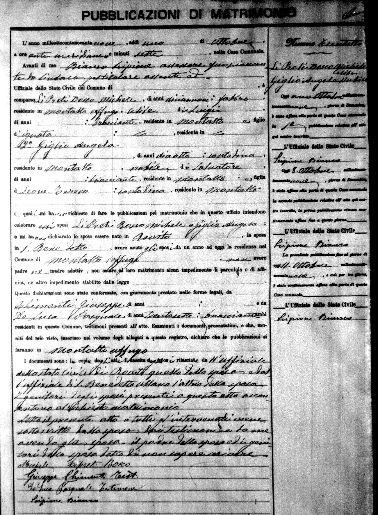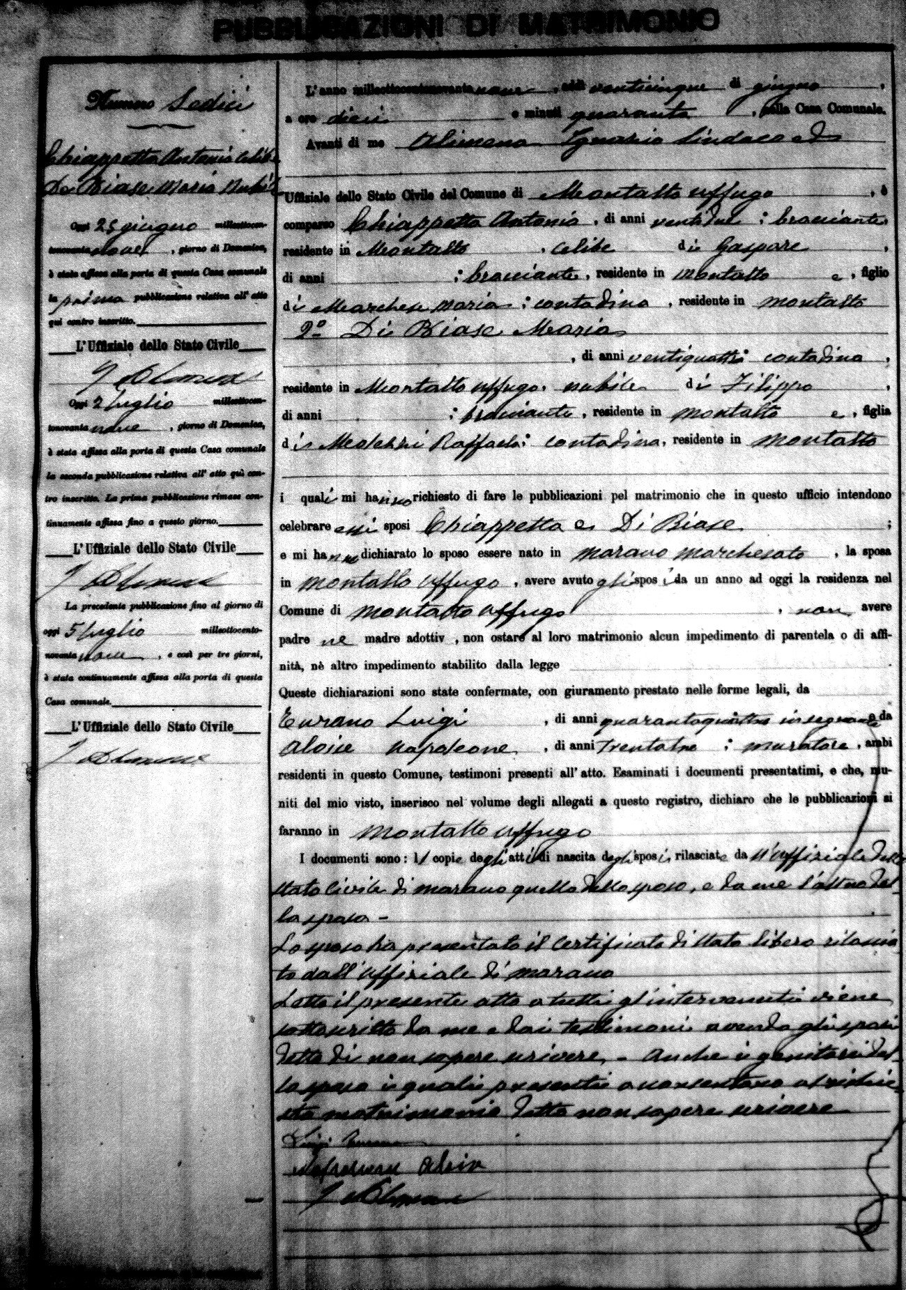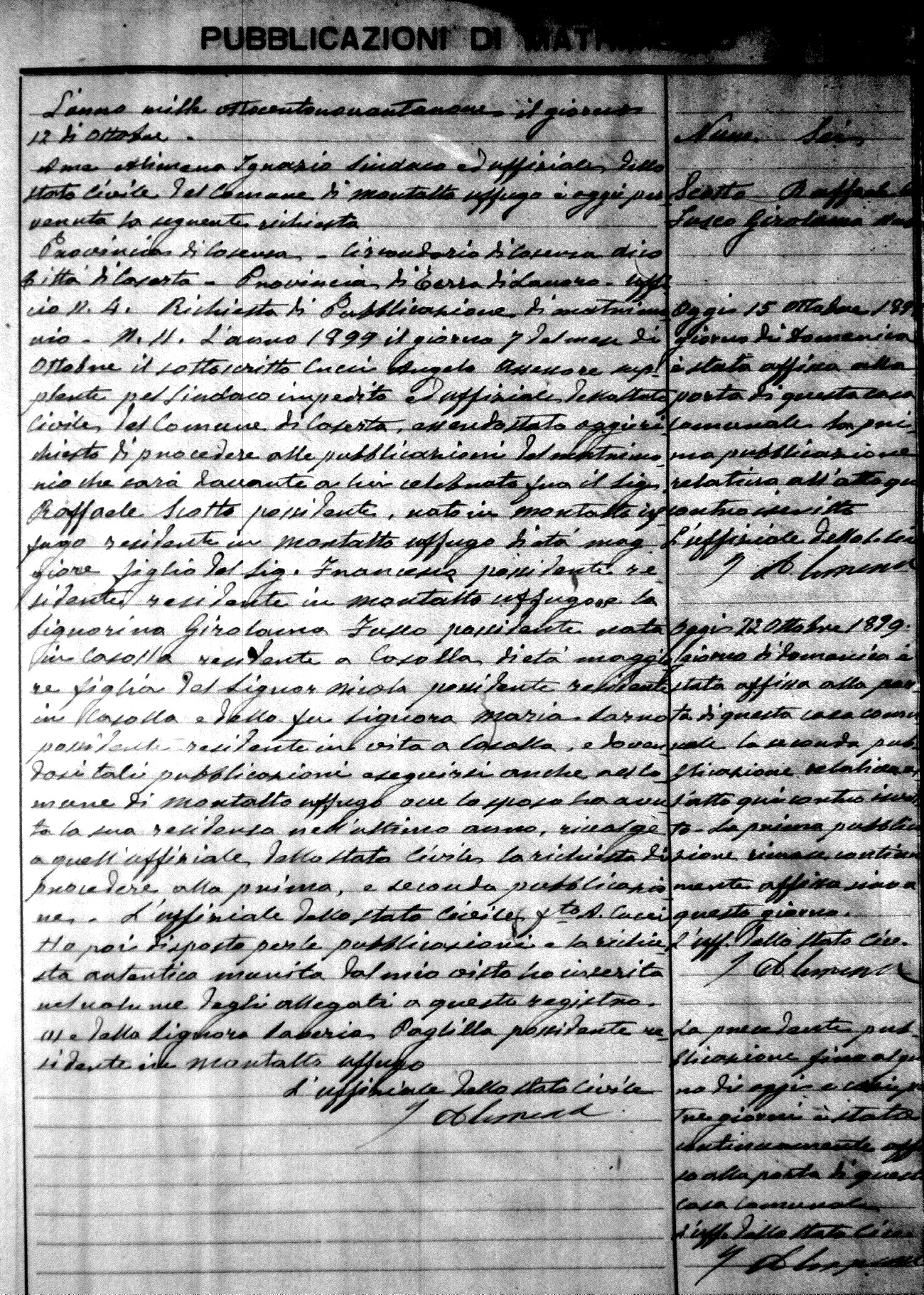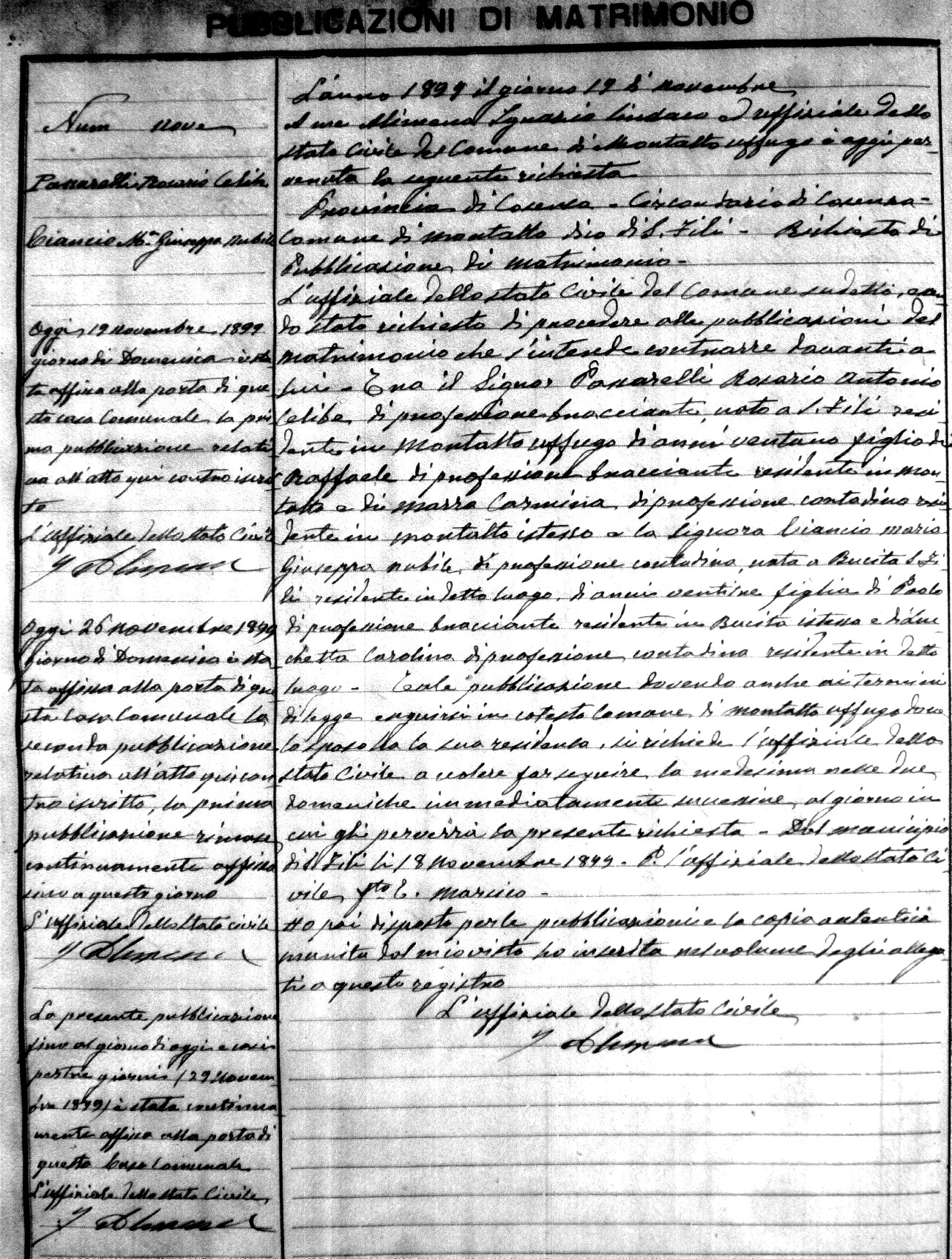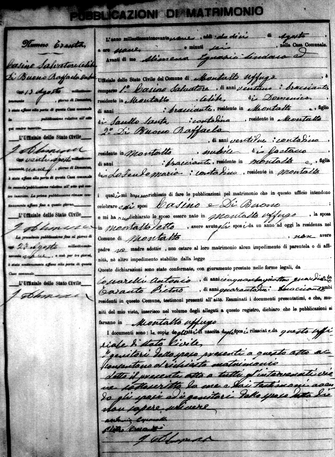 Here are the extractions for the marriage banns in 1899 for Montalto Uffugo. Each extraction has a link to a copy of the original document on the groom's surname. Please note: (fu) indicates the the person was deceased at the time of the marriage bann. For a translation of the basic Pubblicazioni document, look here.