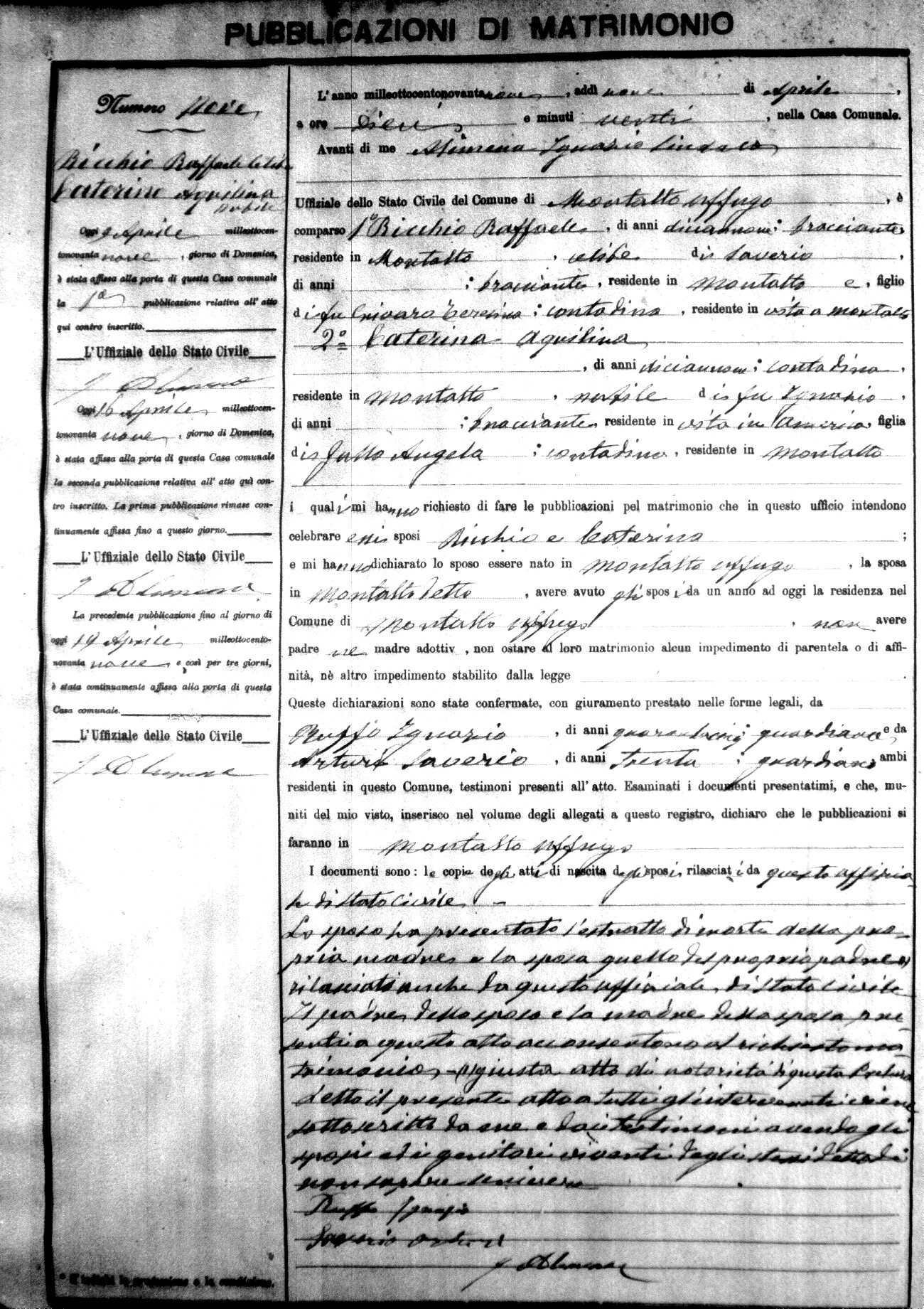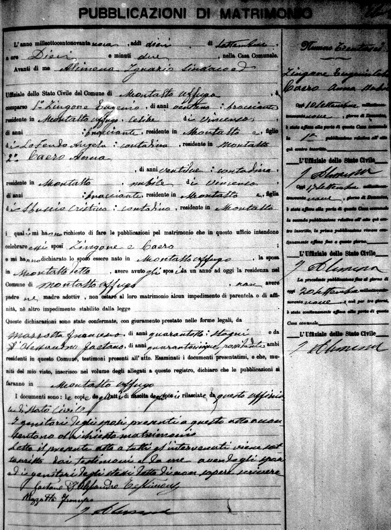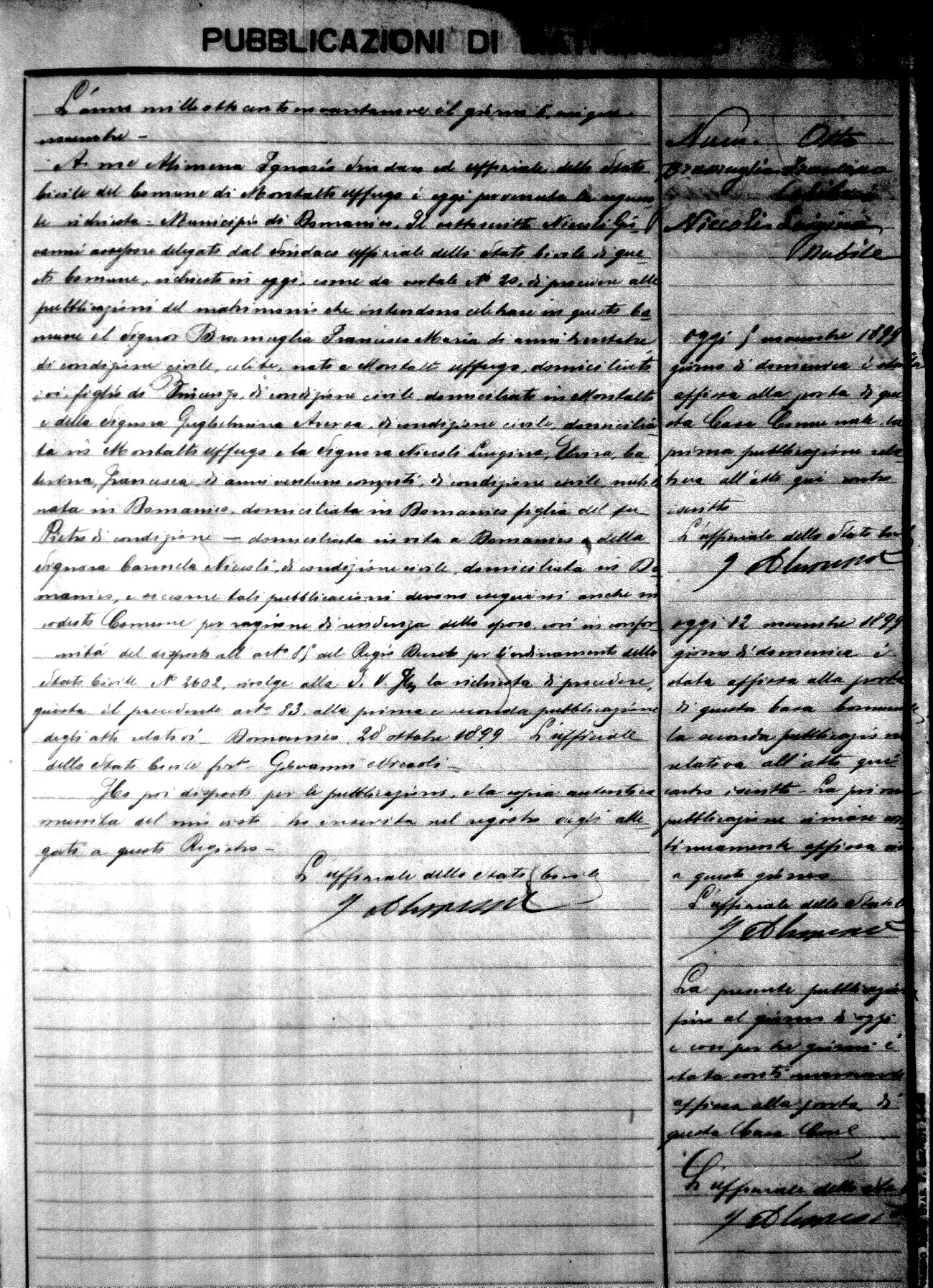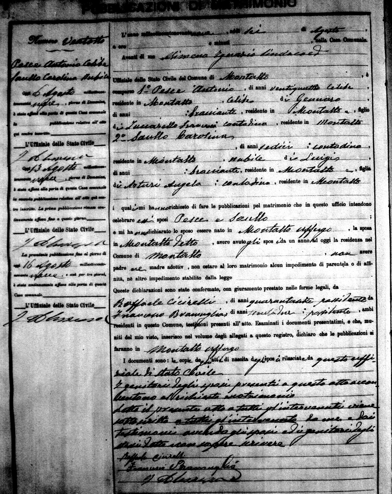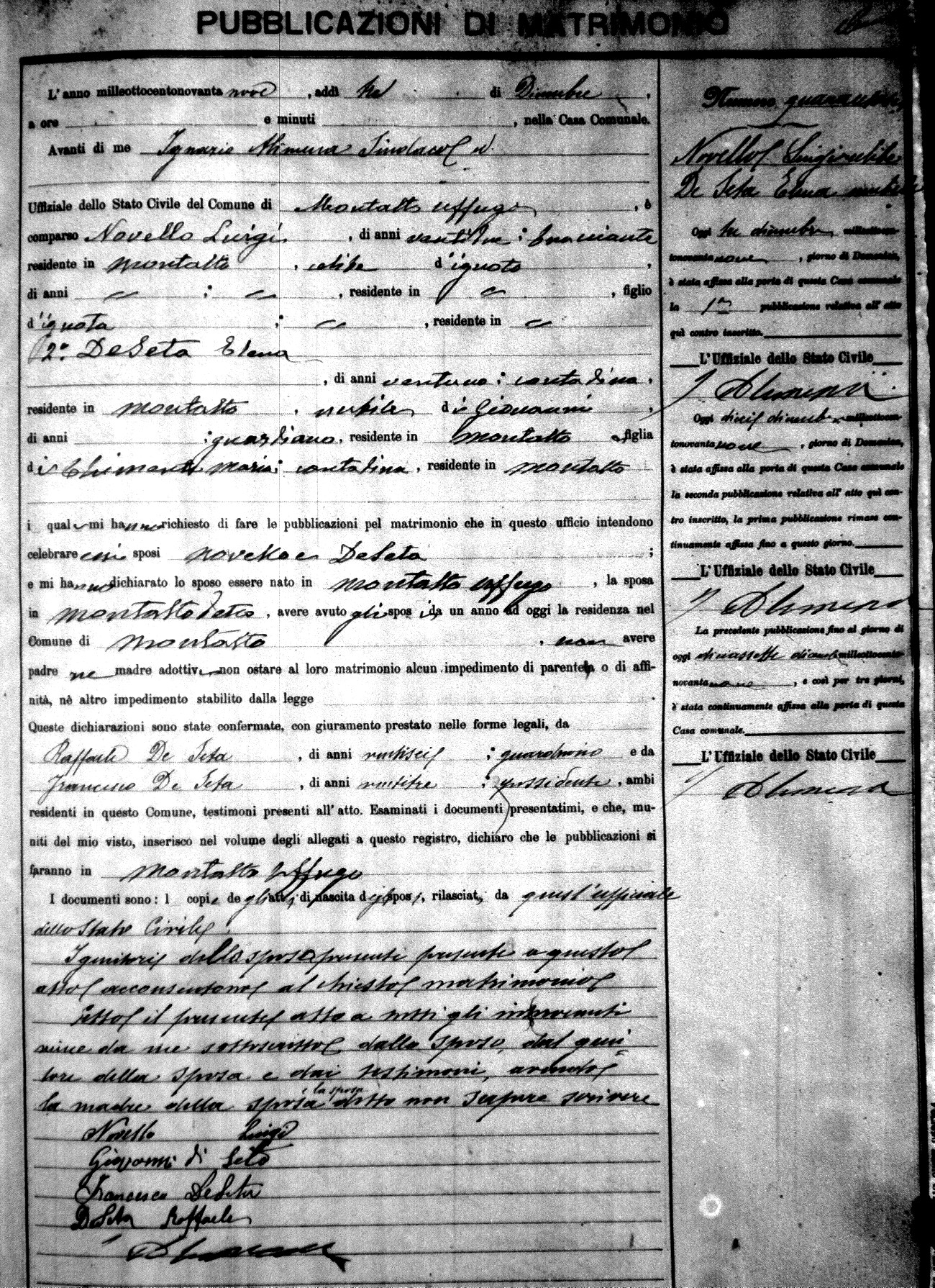 Here are the extractions for the marriage banns in 1899 for Montalto Uffugo. Each extraction has a link to a copy of the original document on the groom's surname. Please note: (fu) indicates the the person was deceased at the time of the marriage bann. For a translation of the basic Pubblicazioni document, look here.