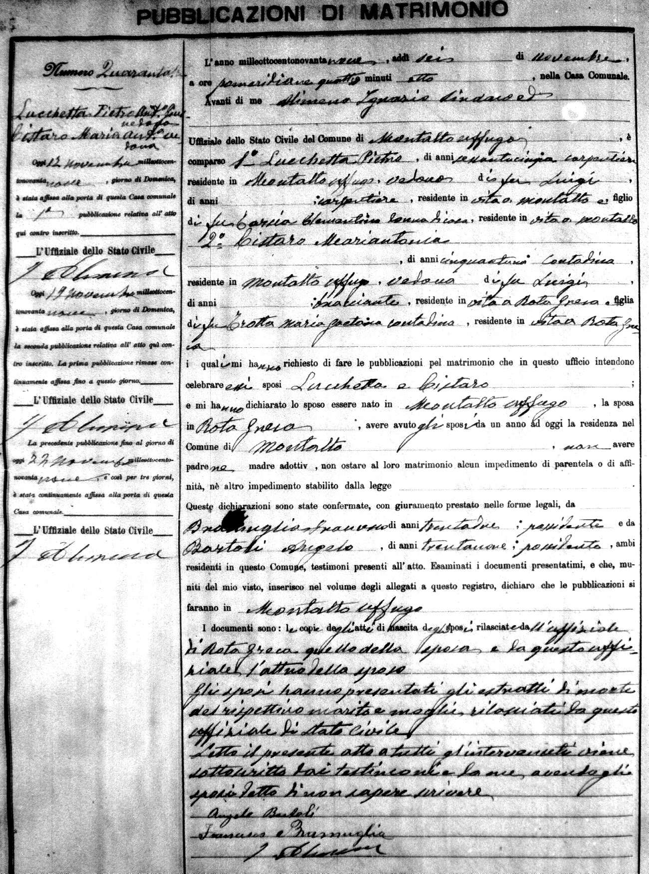 | 6 Nov | Lucchetta | Pietro Antonio | Luigi (fu) | Tarsia | Clementina (fu) | Cistaro | Mariantonia | Luigi (fu) | Trotta | Maria Gaetana |