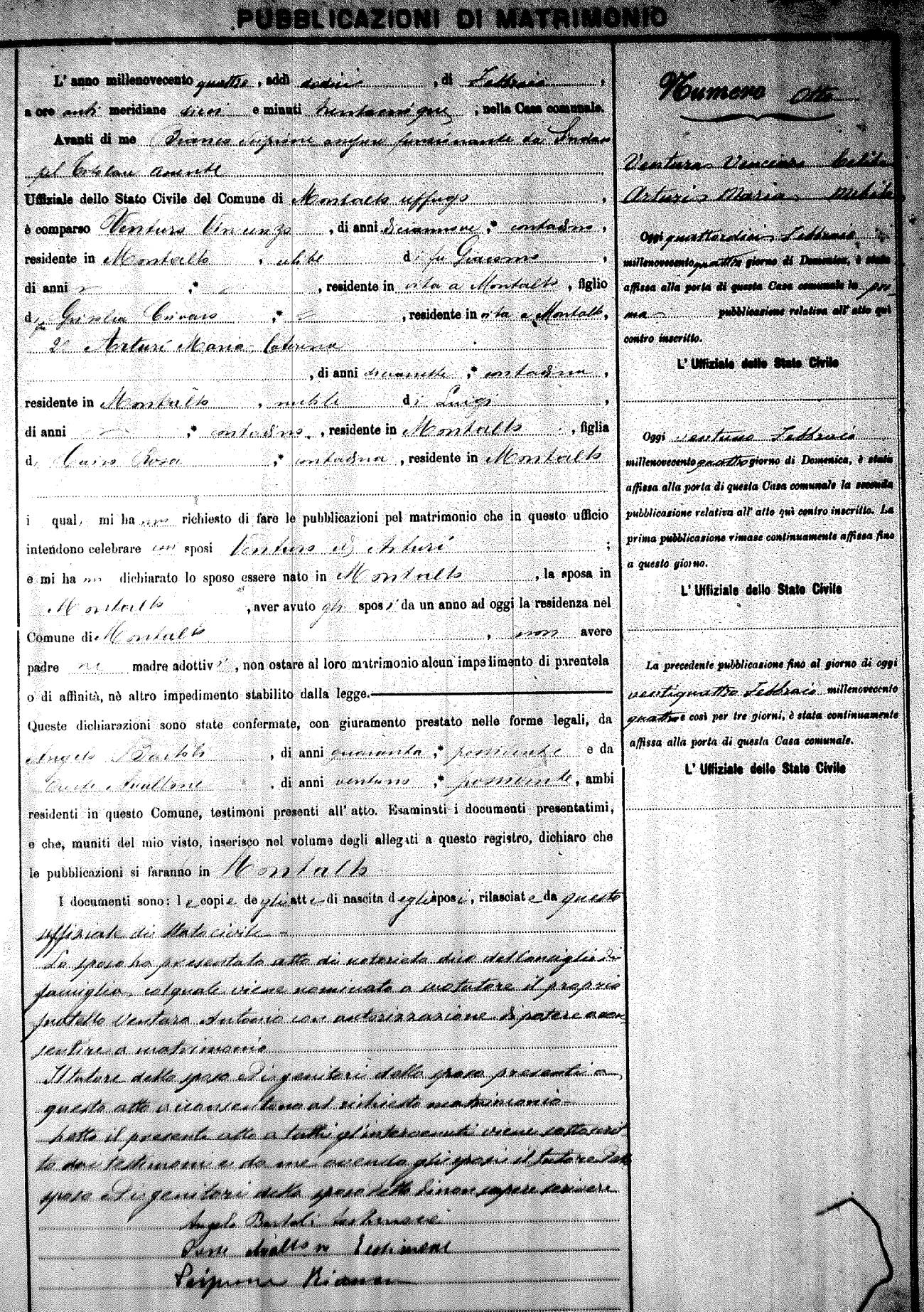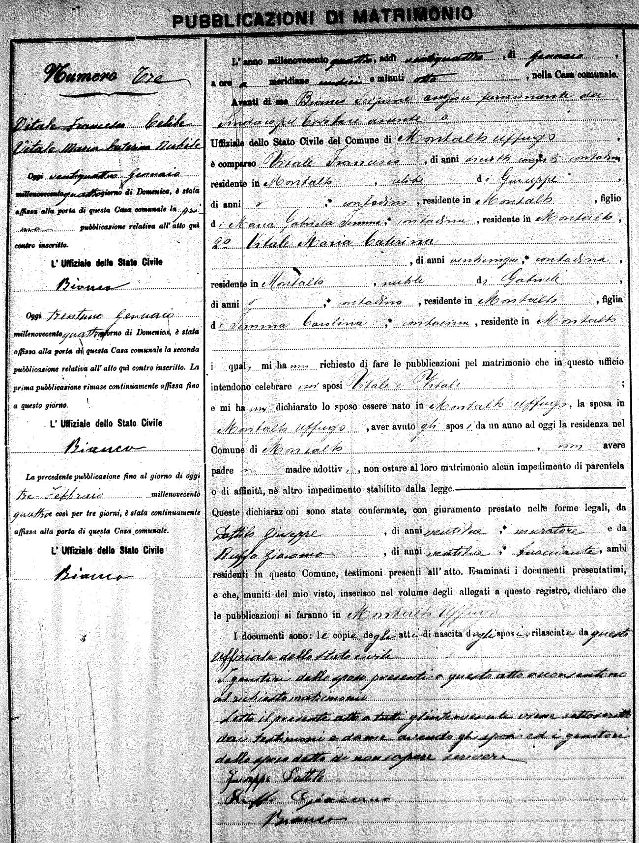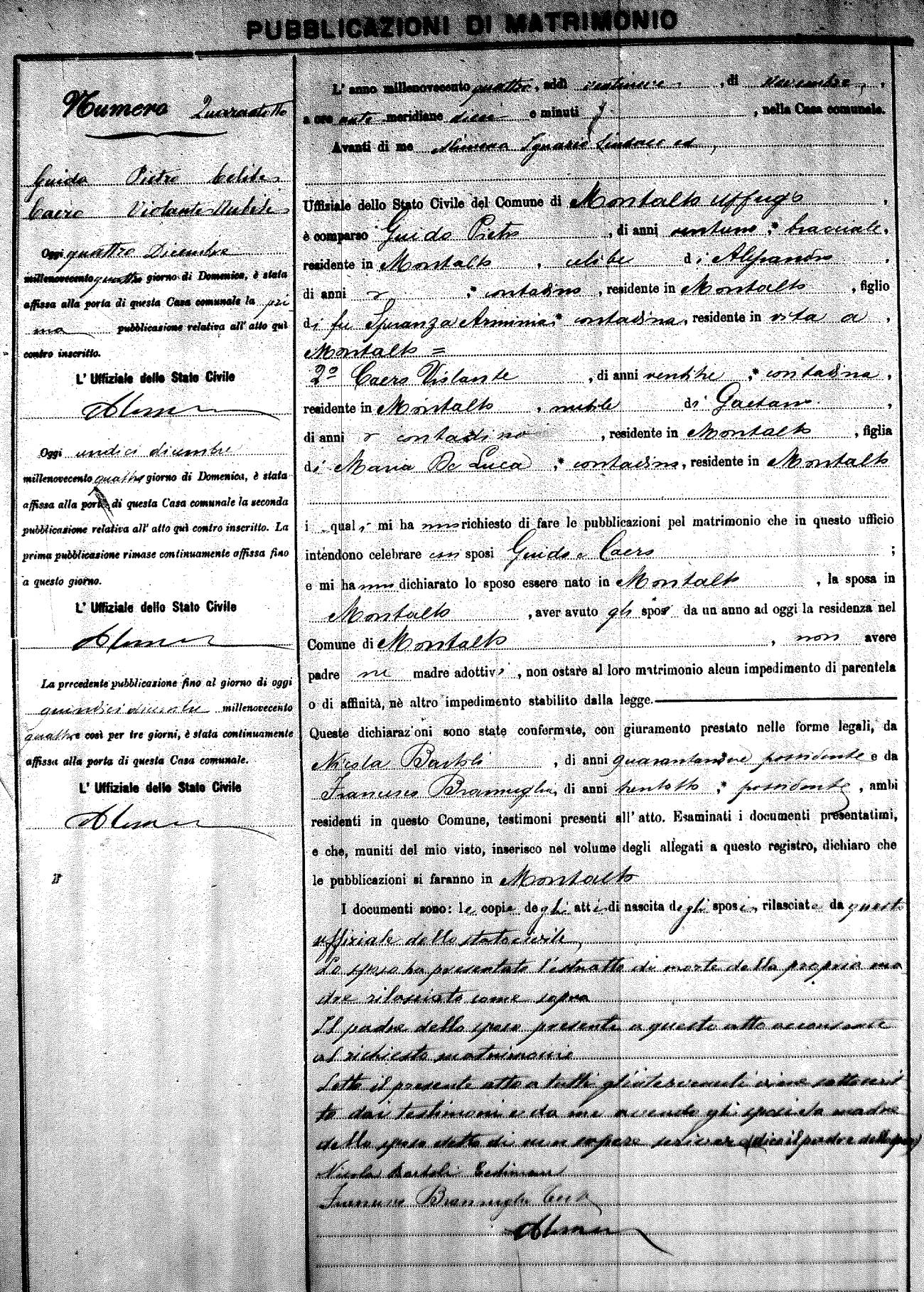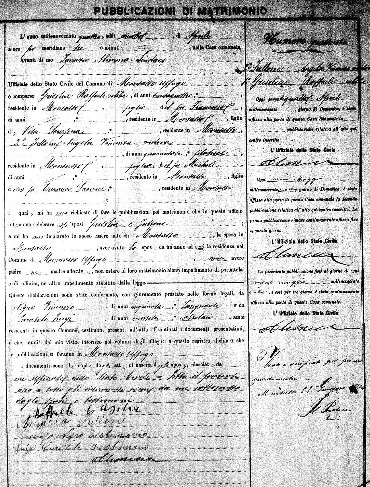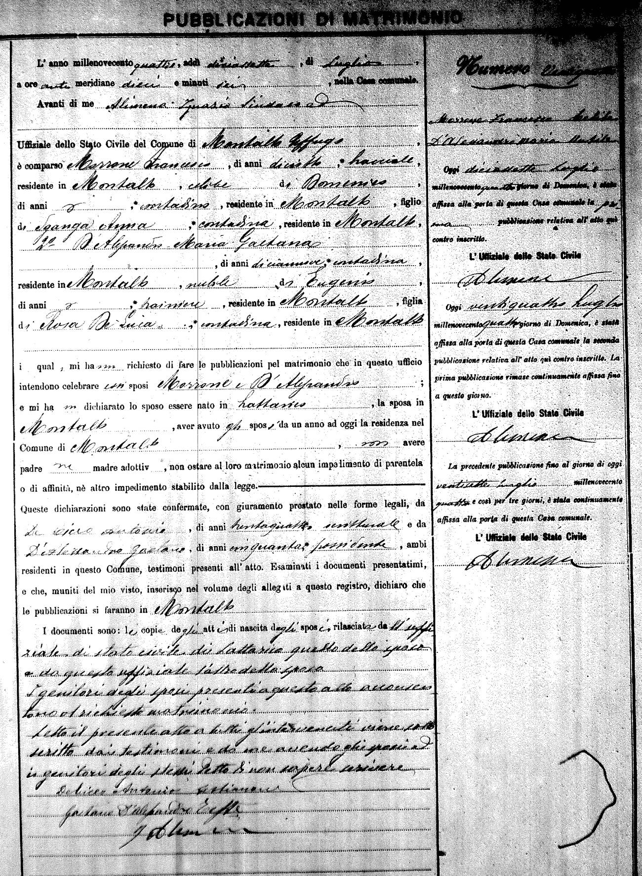 Here are the extractions for the marriage banns in 1904 for Montalto Uffugo. Each extraction has a link to a copy of the original document on the groom's surname. Please note: (fu) indicates the the person was deceased at the time of the marriage bann. For a translation of the basic Pubblicazioni document, look here.