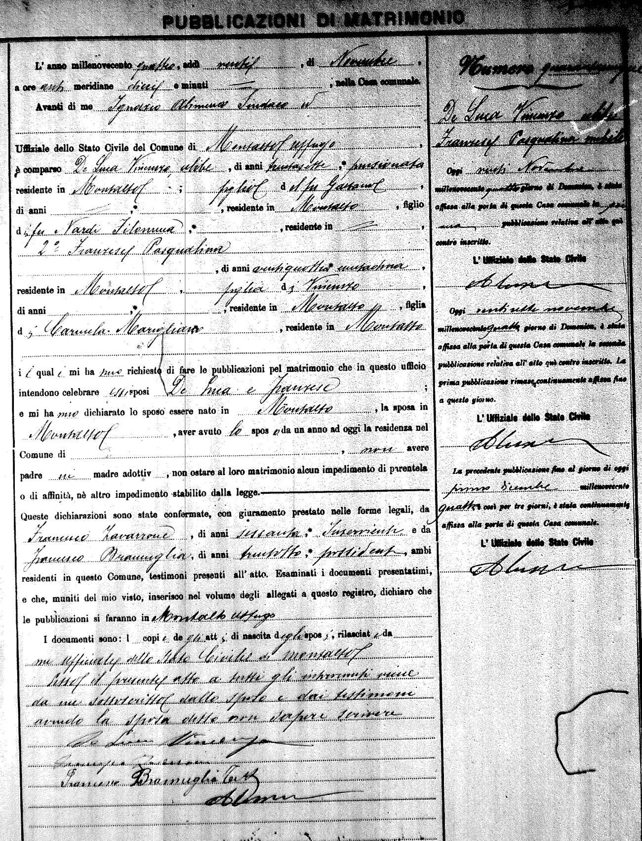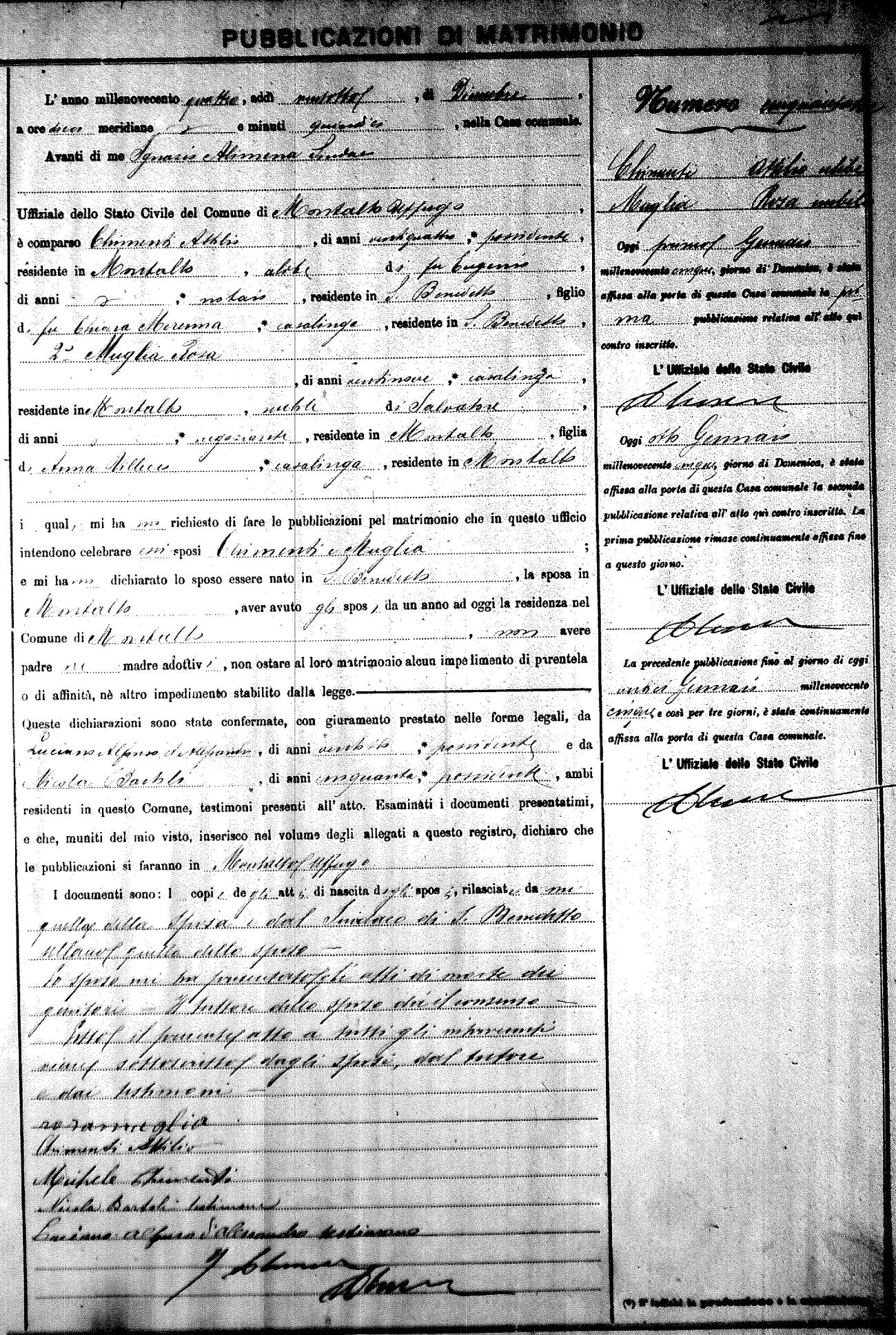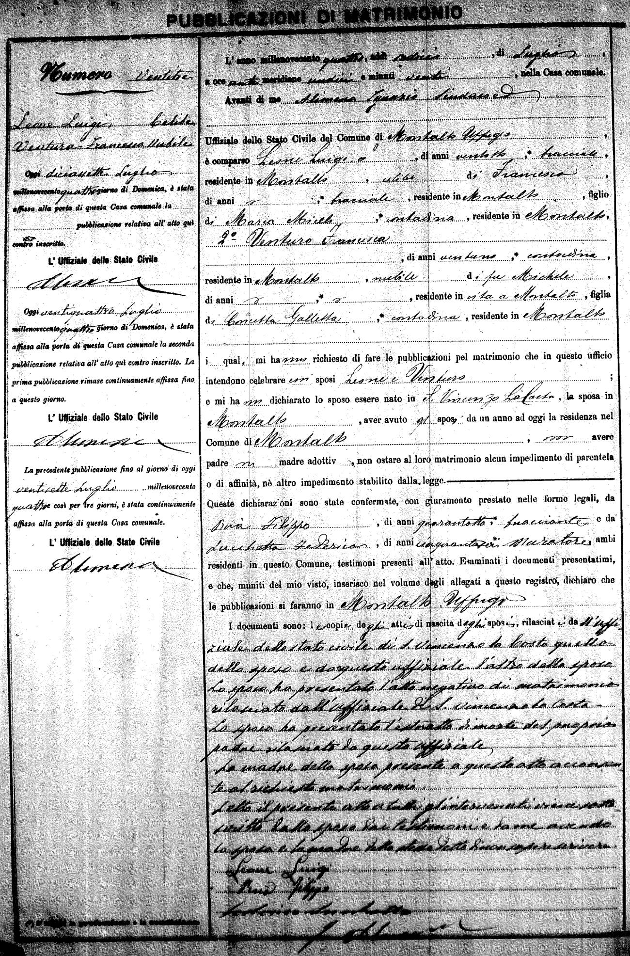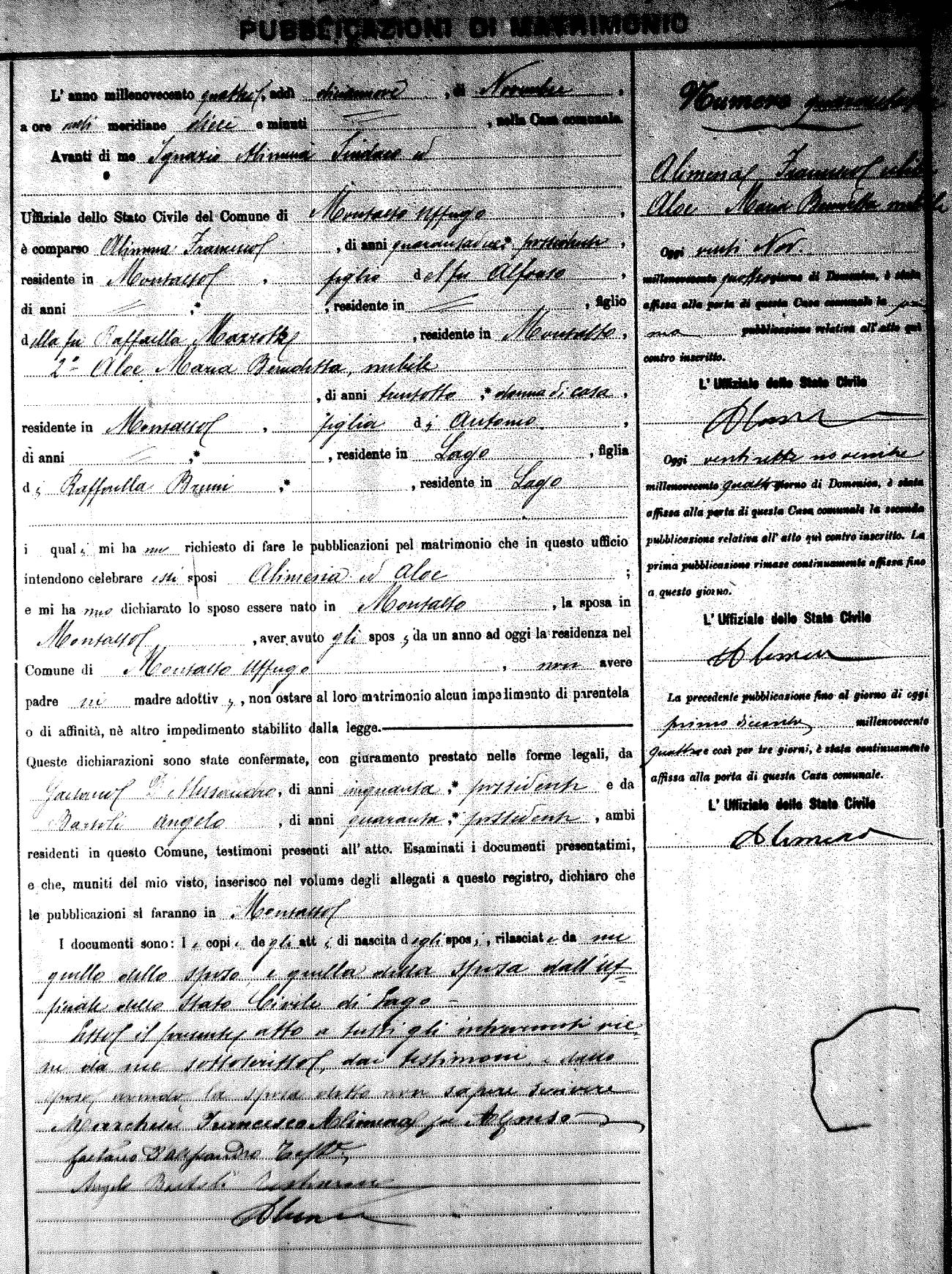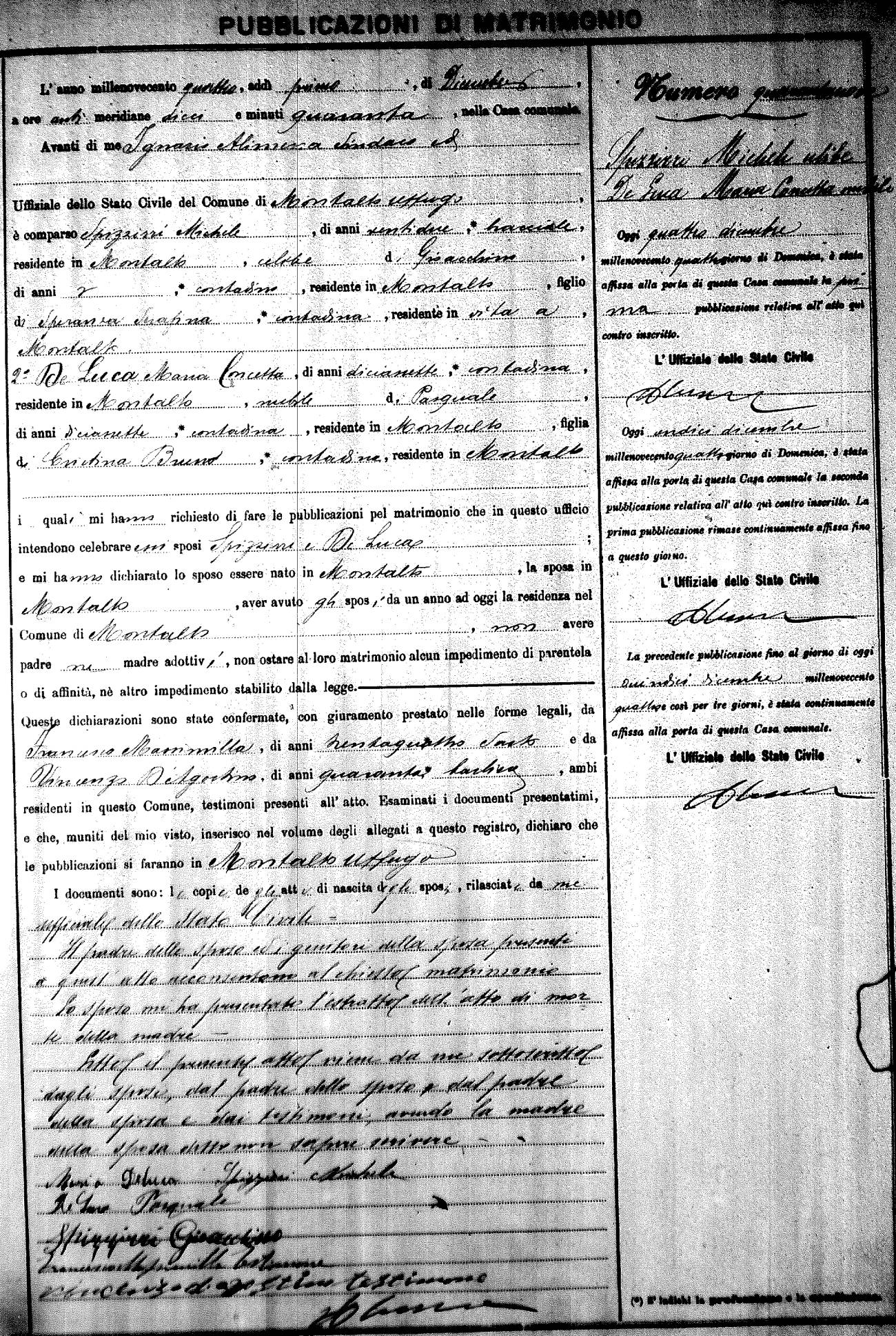 Here are the extractions for the marriage banns in 1904 for Montalto Uffugo. Each extraction has a link to a copy of the original document on the groom's surname. Please note: (fu) indicates the the person was deceased at the time of the marriage bann. For a translation of the basic Pubblicazioni document, look here.