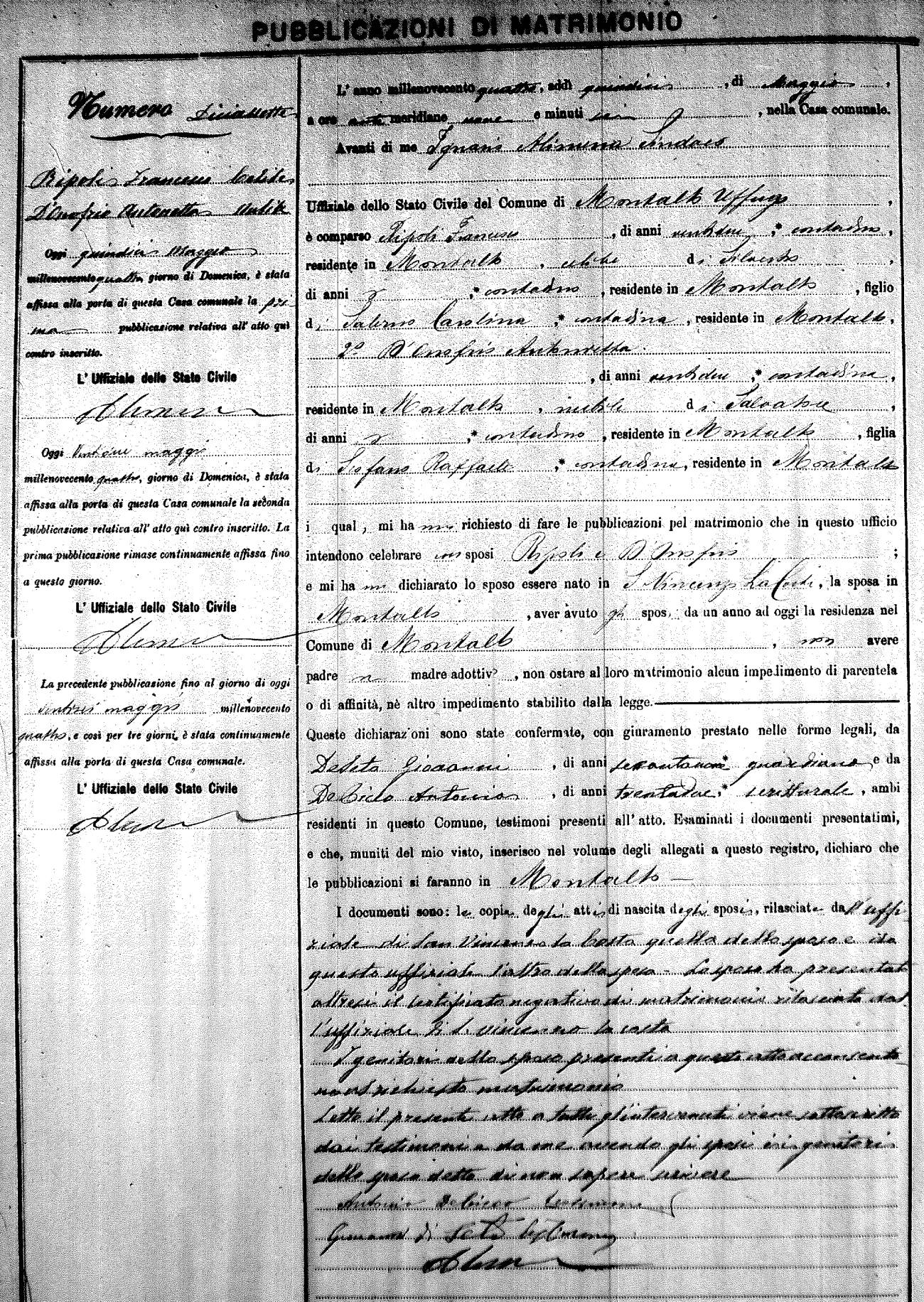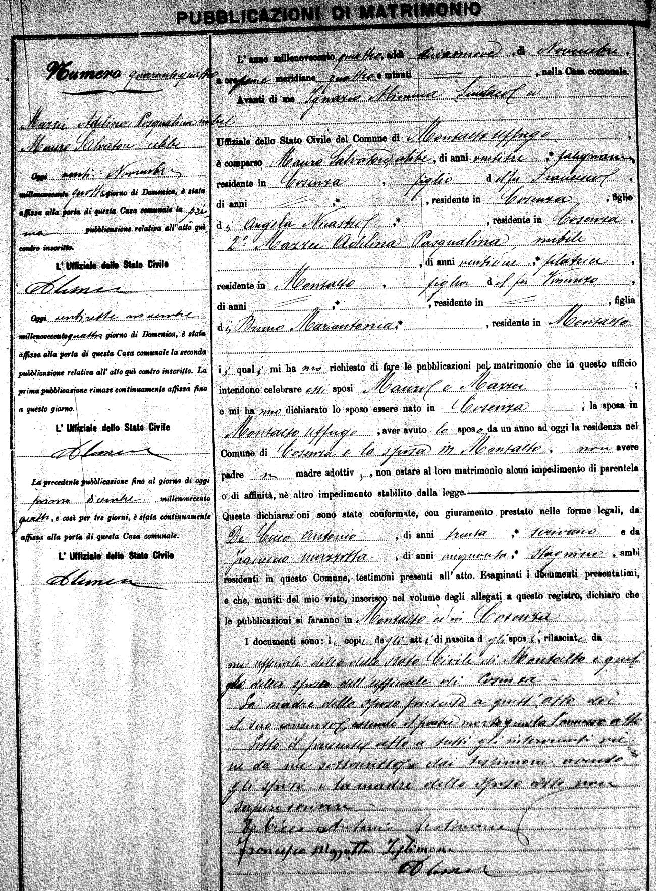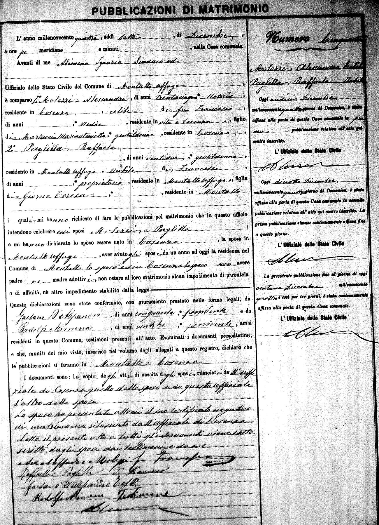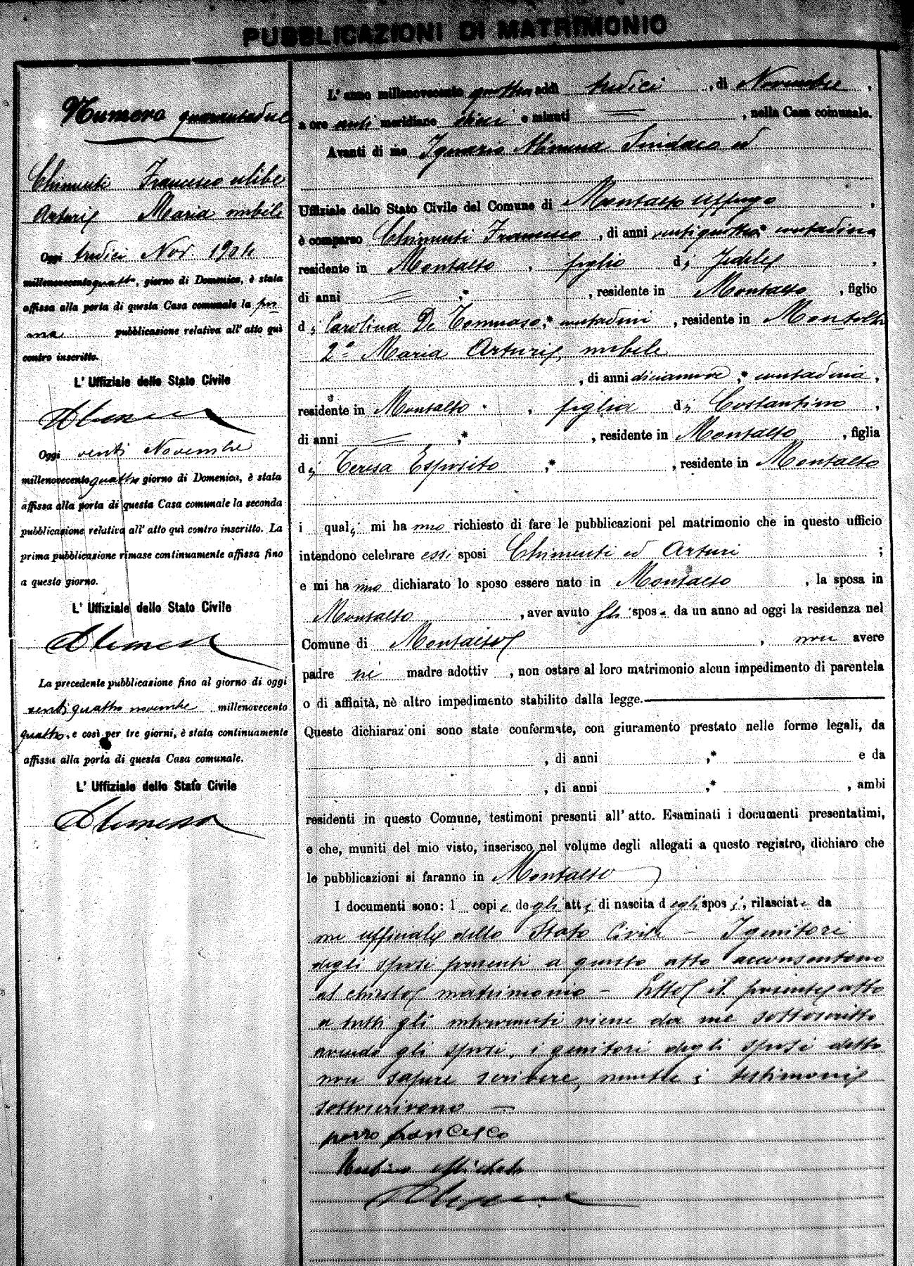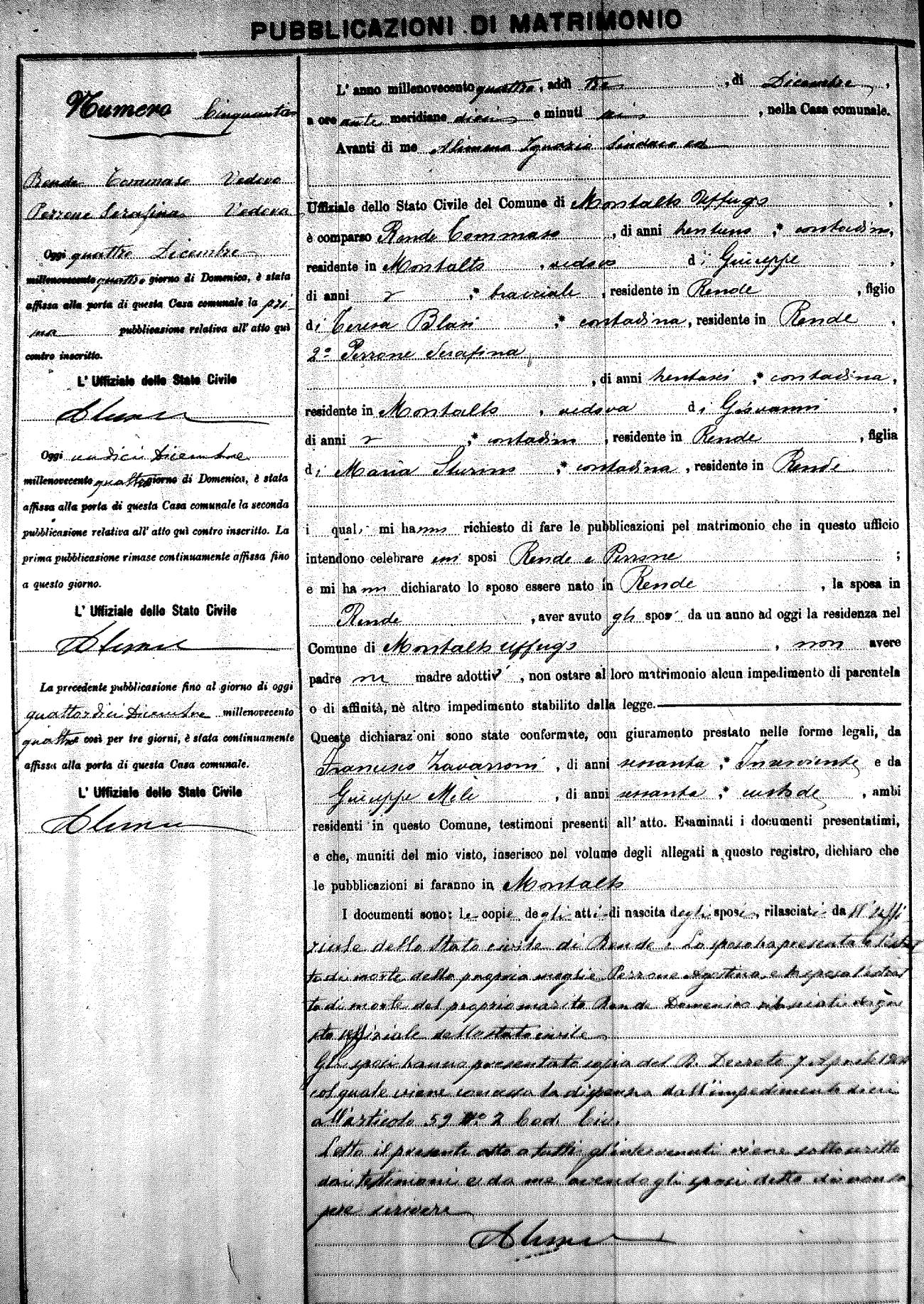 Here are the extractions for the marriage banns in 1904 for Montalto Uffugo. Each extraction has a link to a copy of the original document on the groom's surname. Please note: (fu) indicates the the person was deceased at the time of the marriage bann. For a translation of the basic Pubblicazioni document, look here.