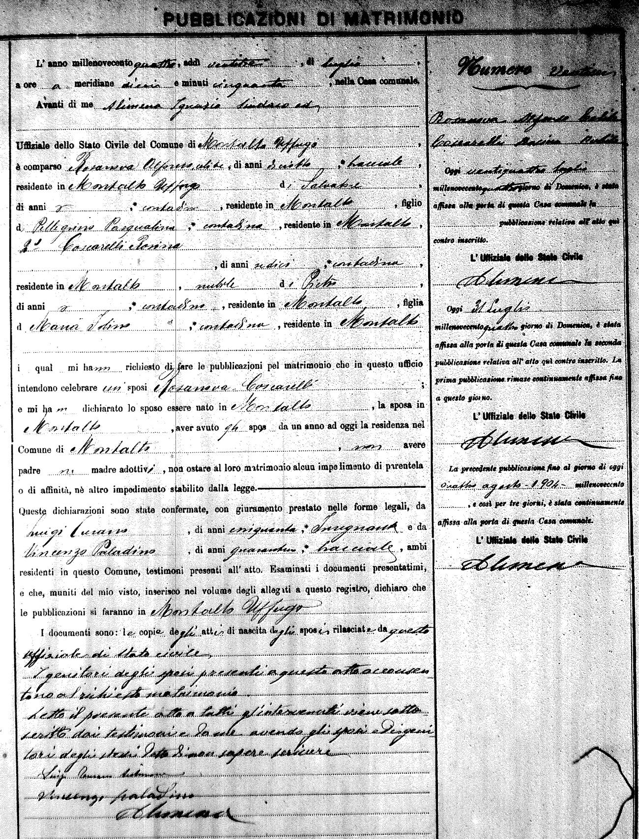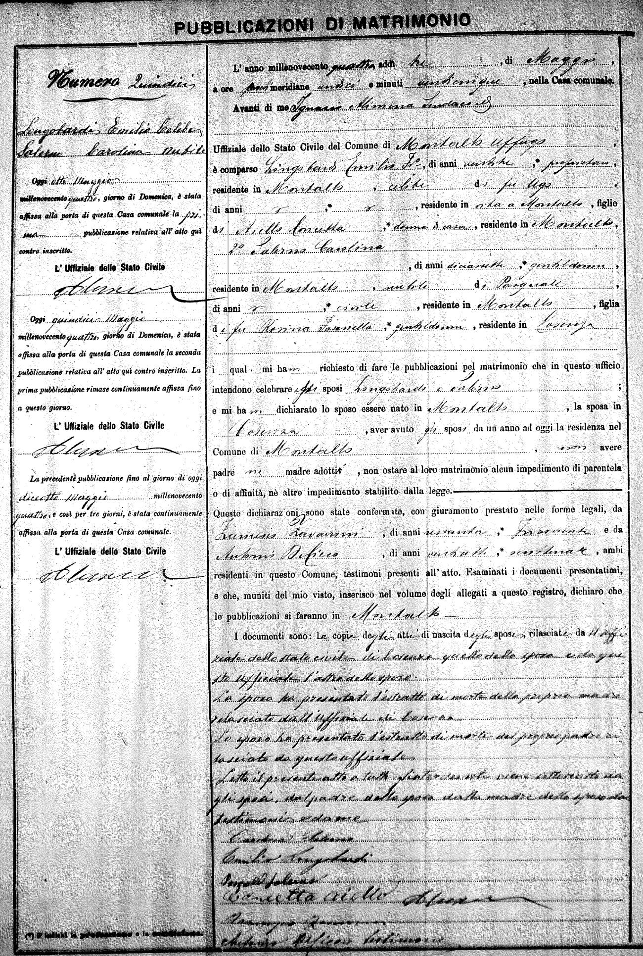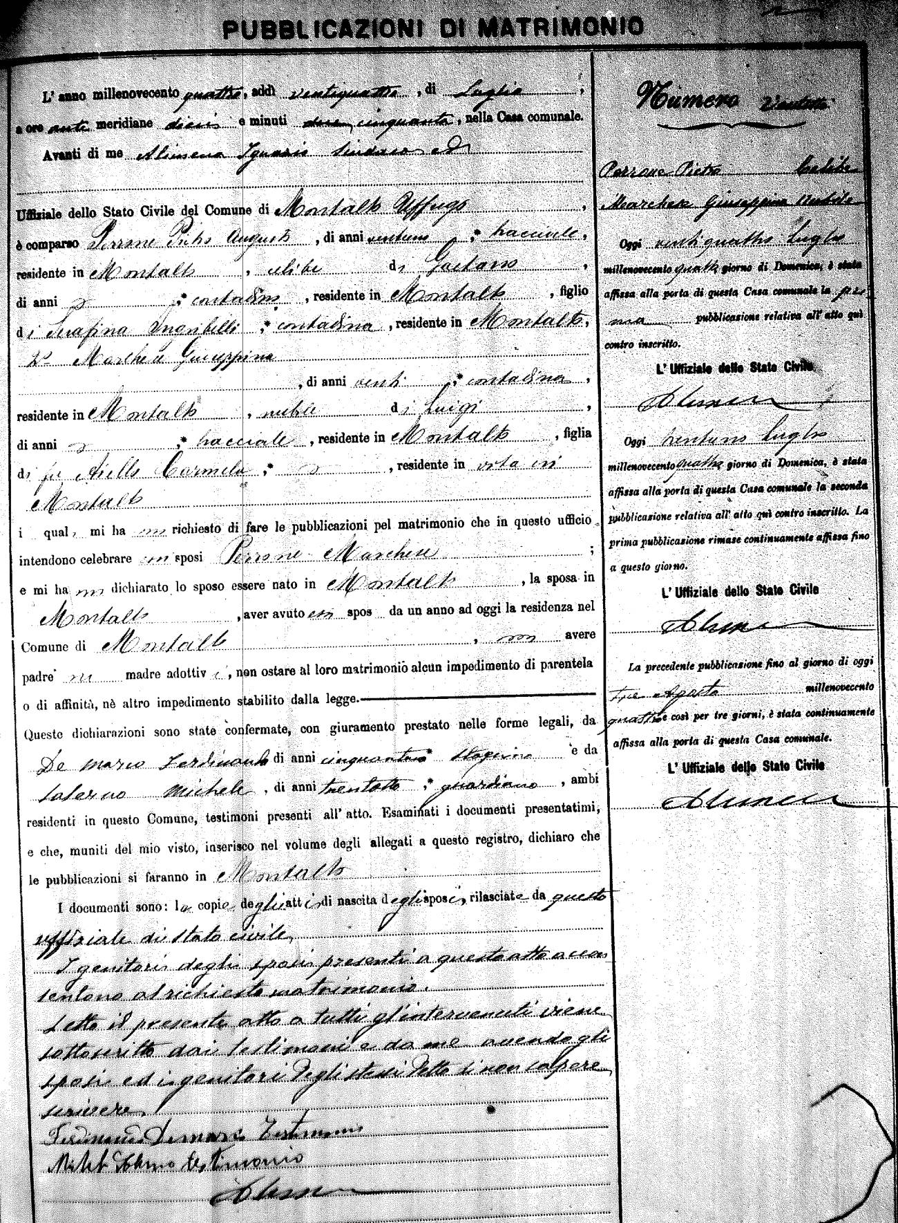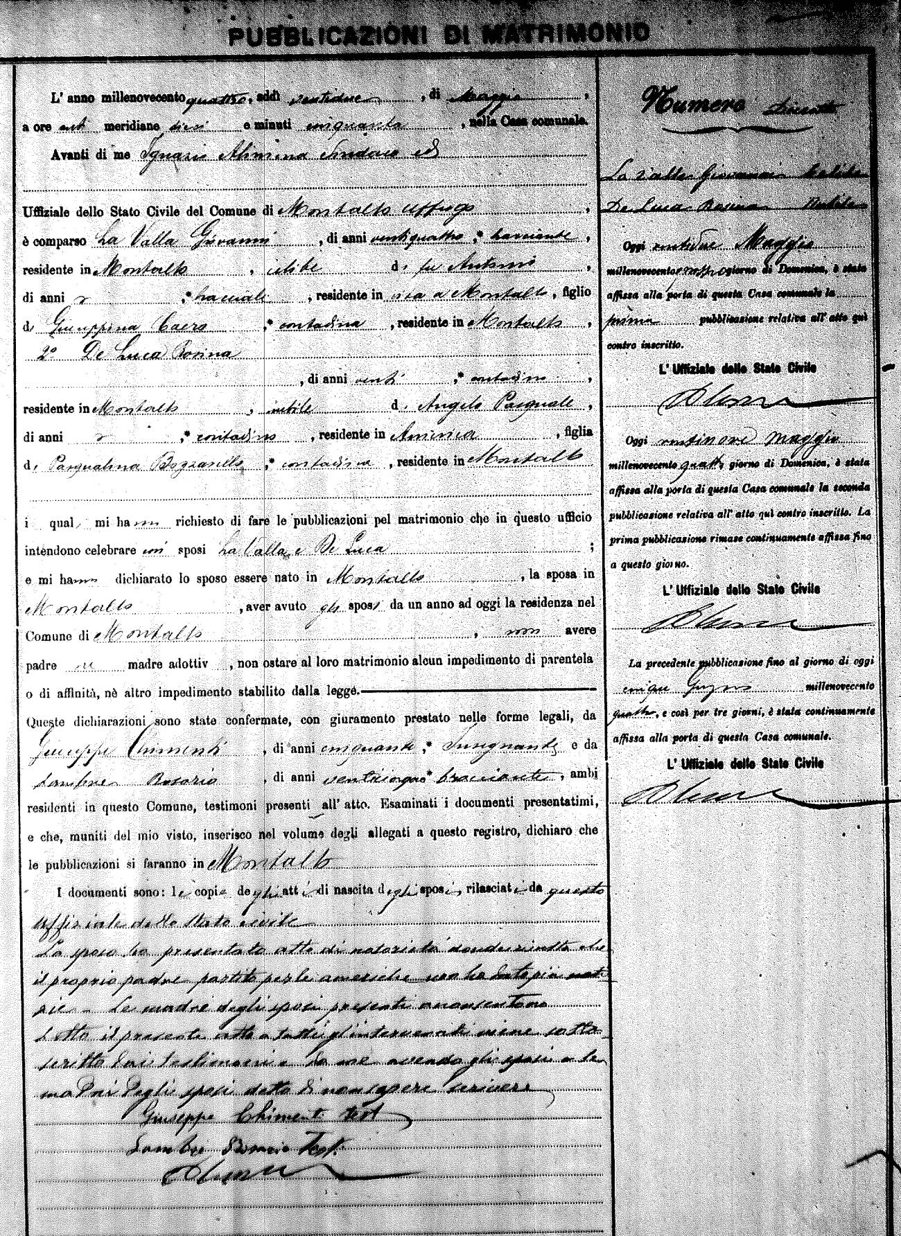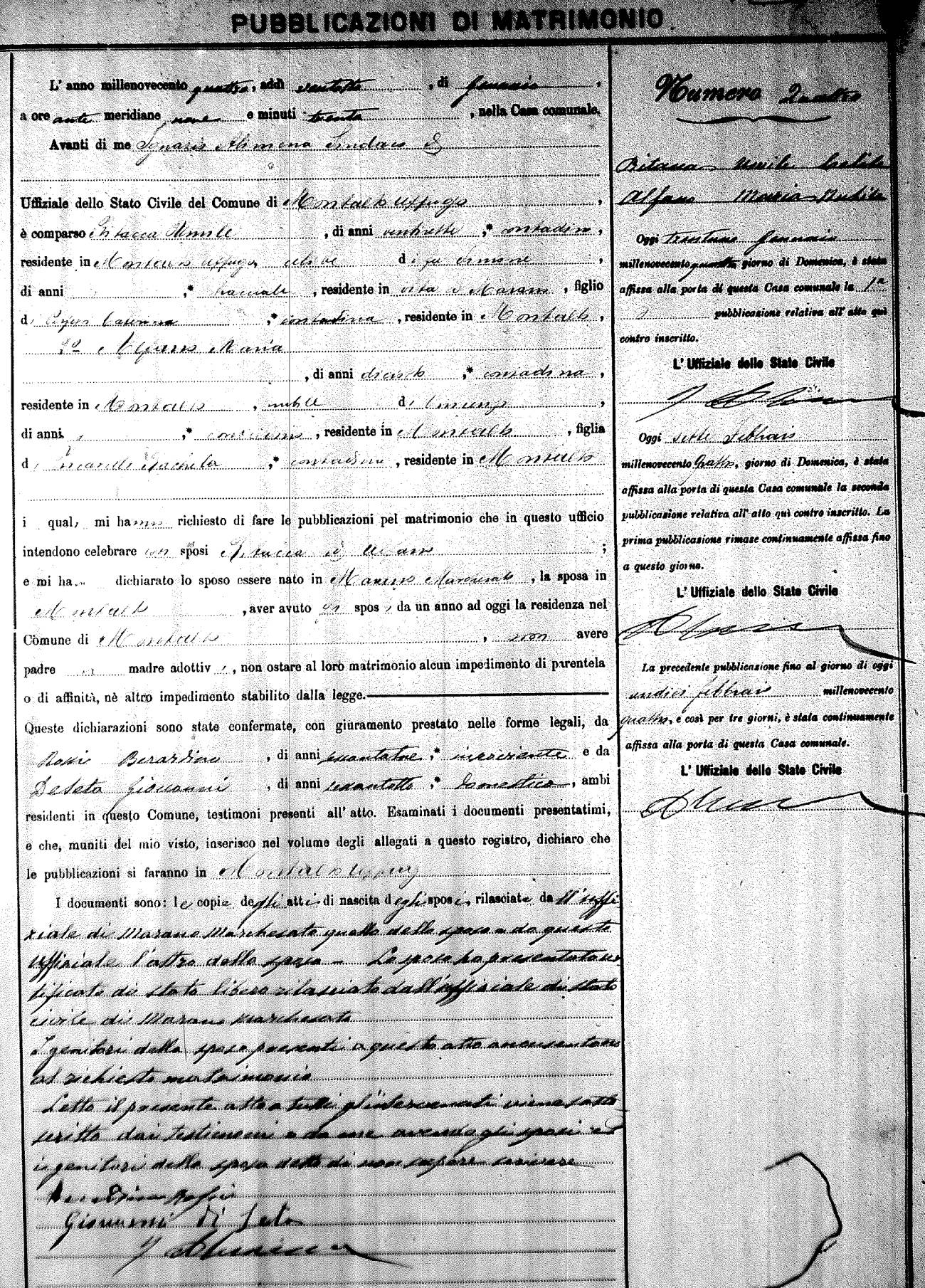 Here are the extractions for the marriage banns in 1904 for Montalto Uffugo. Each extraction has a link to a copy of the original document on the groom's surname. Please note: (fu) indicates the the person was deceased at the time of the marriage bann. For a translation of the basic Pubblicazioni document, look here.