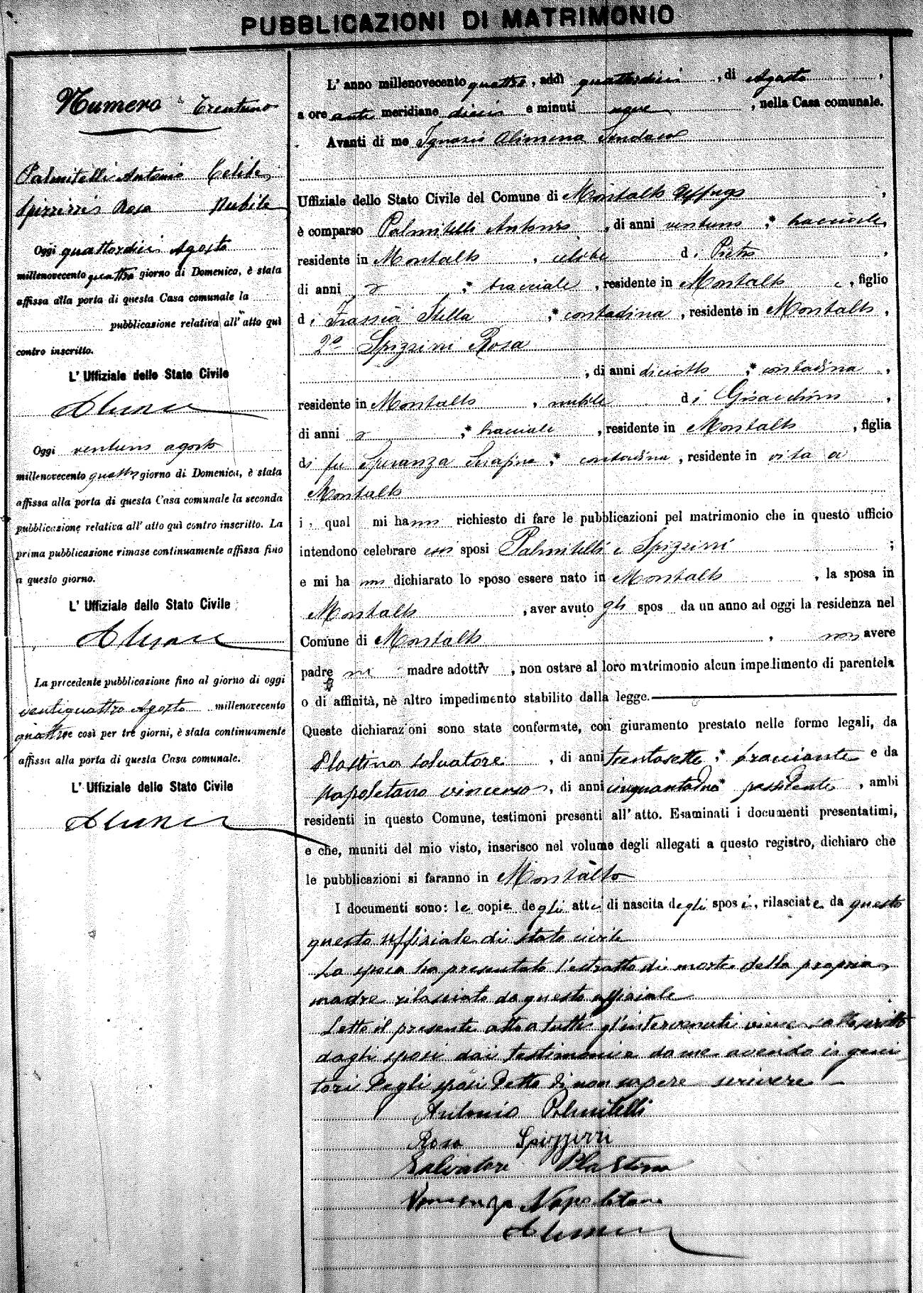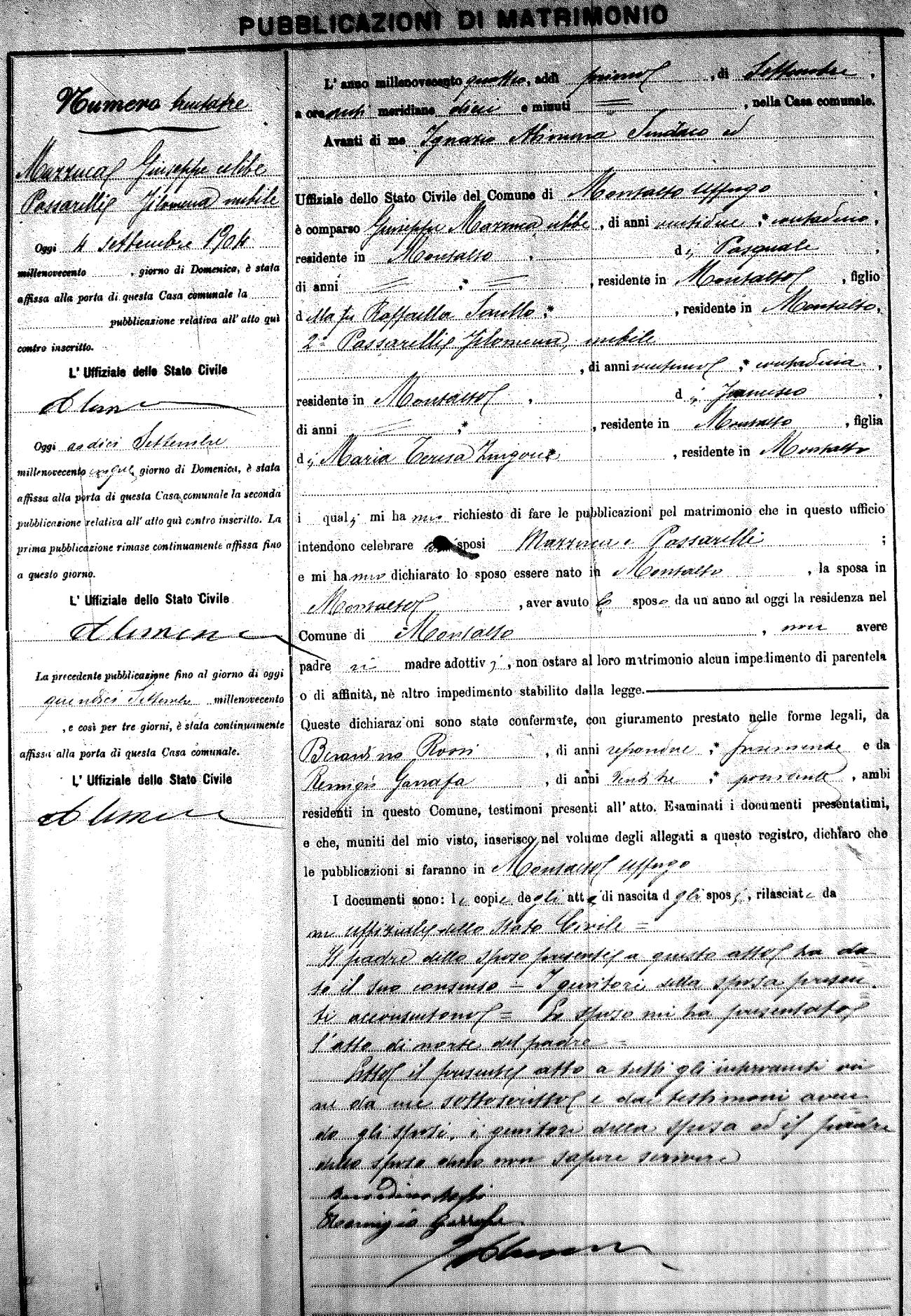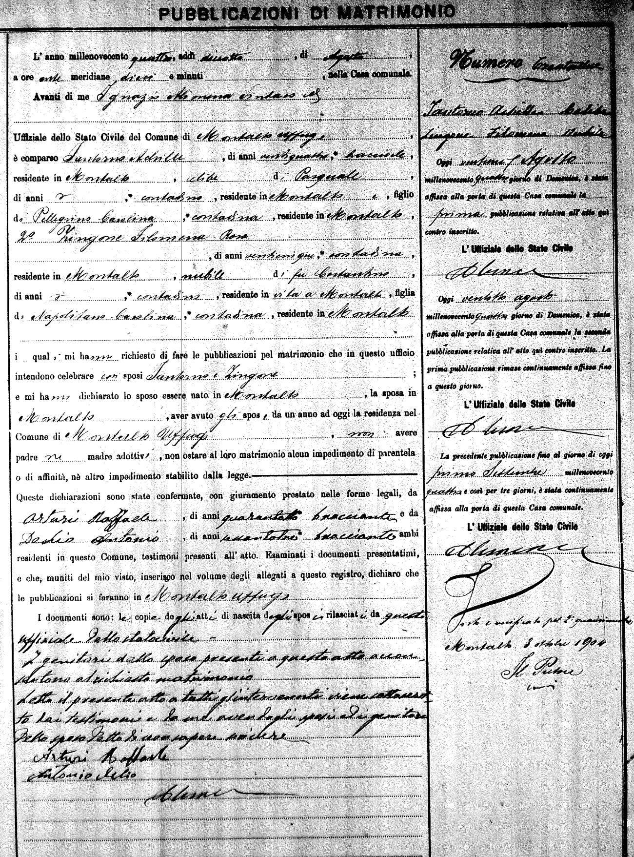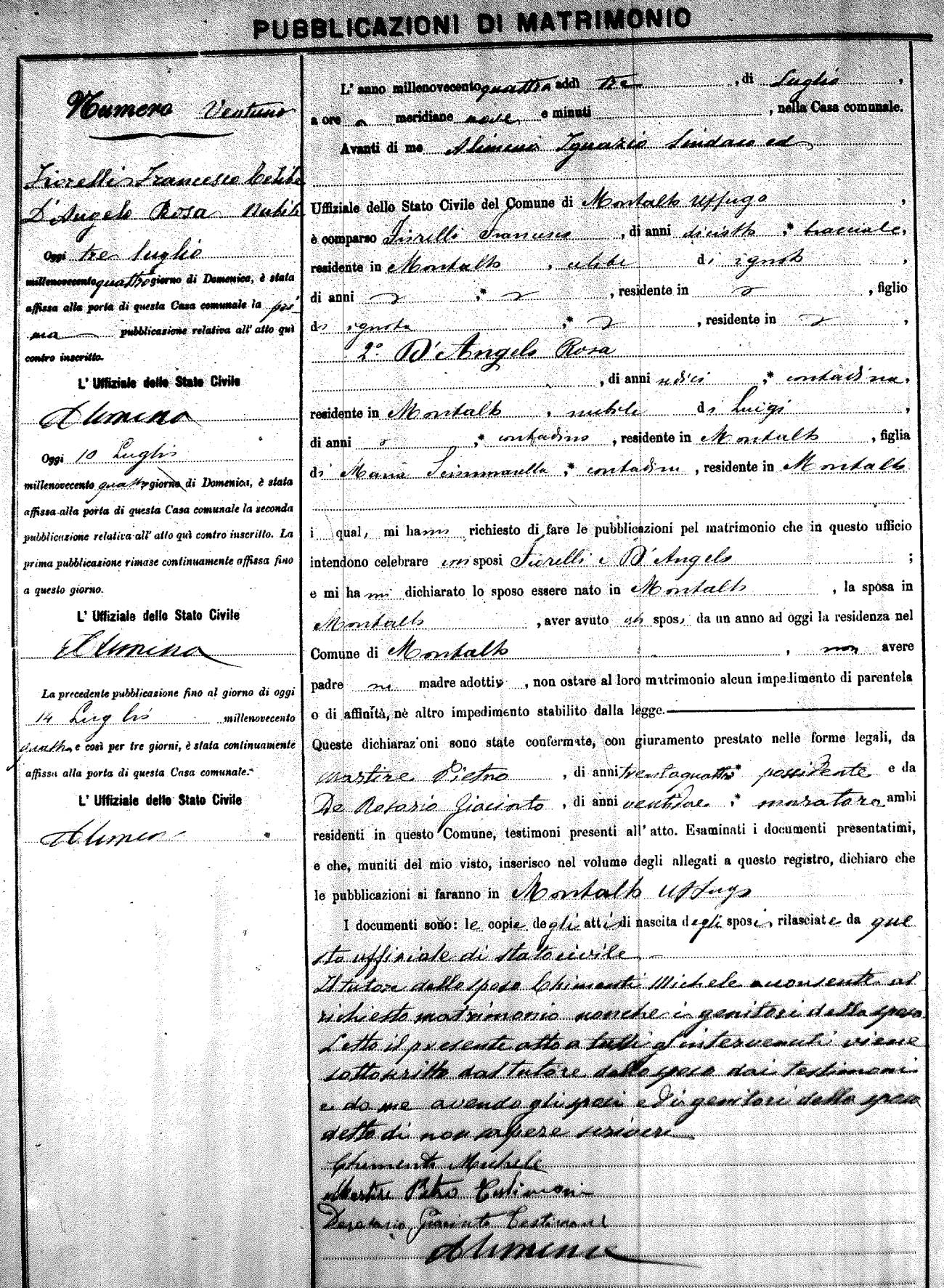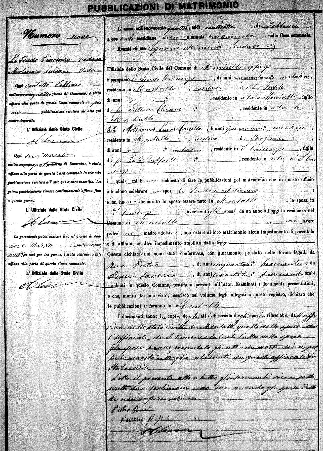 Here are the extractions for the marriage banns in 1904 for Montalto Uffugo. Each extraction has a link to a copy of the original document on the groom's surname. Please note: (fu) indicates the the person was deceased at the time of the marriage bann. For a translation of the basic Pubblicazioni document, look here.