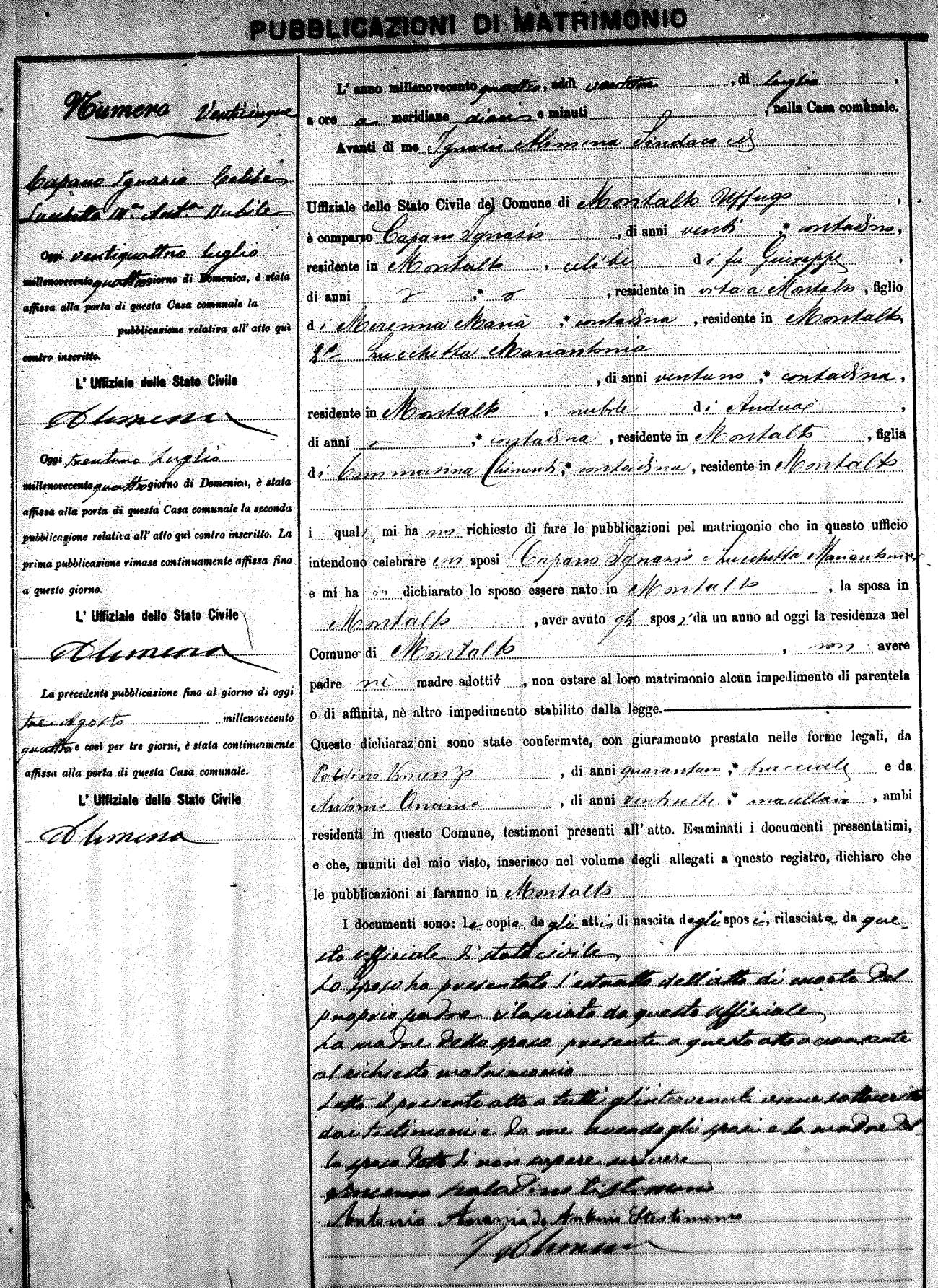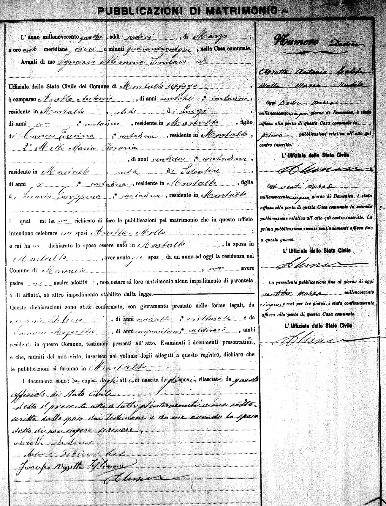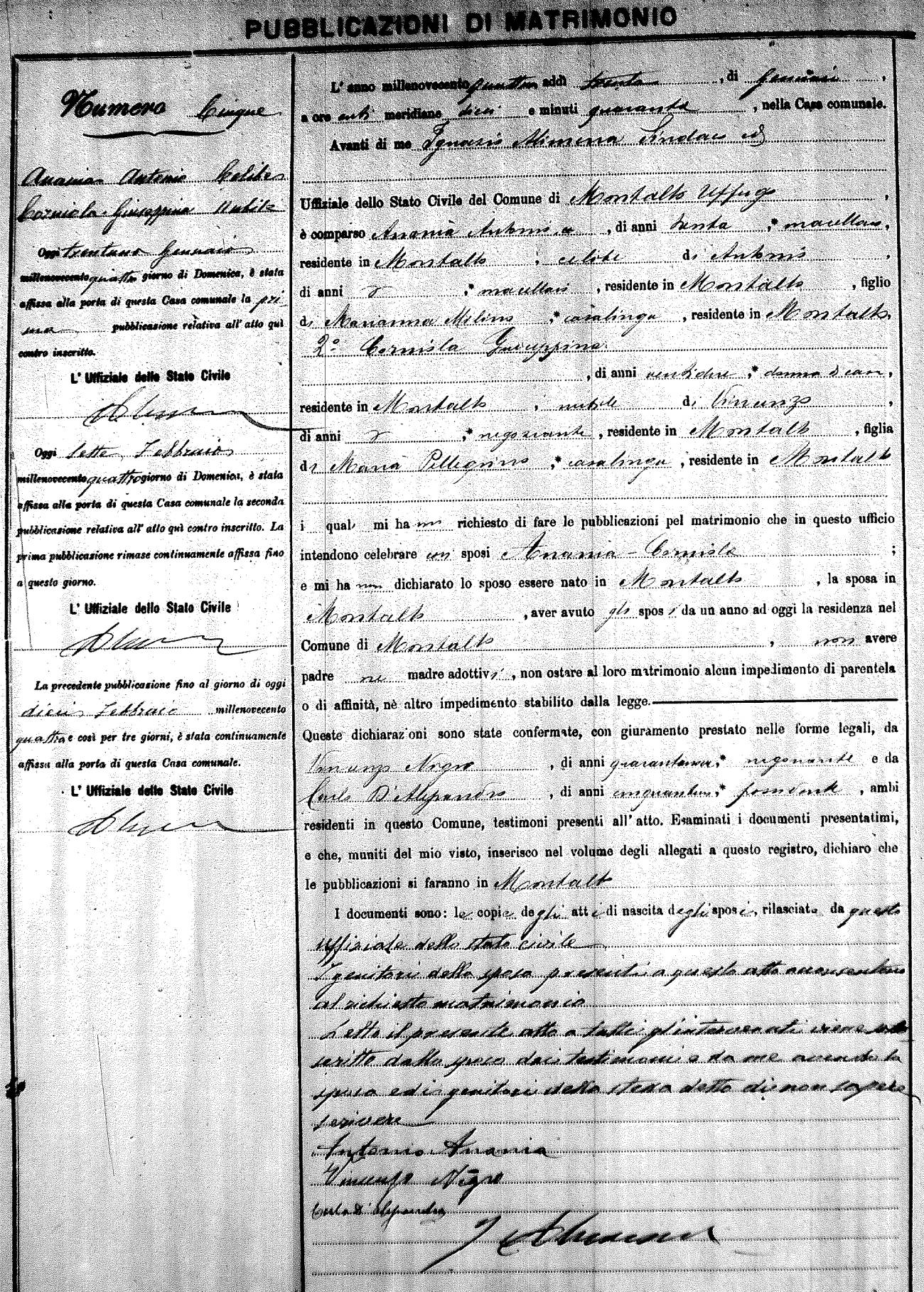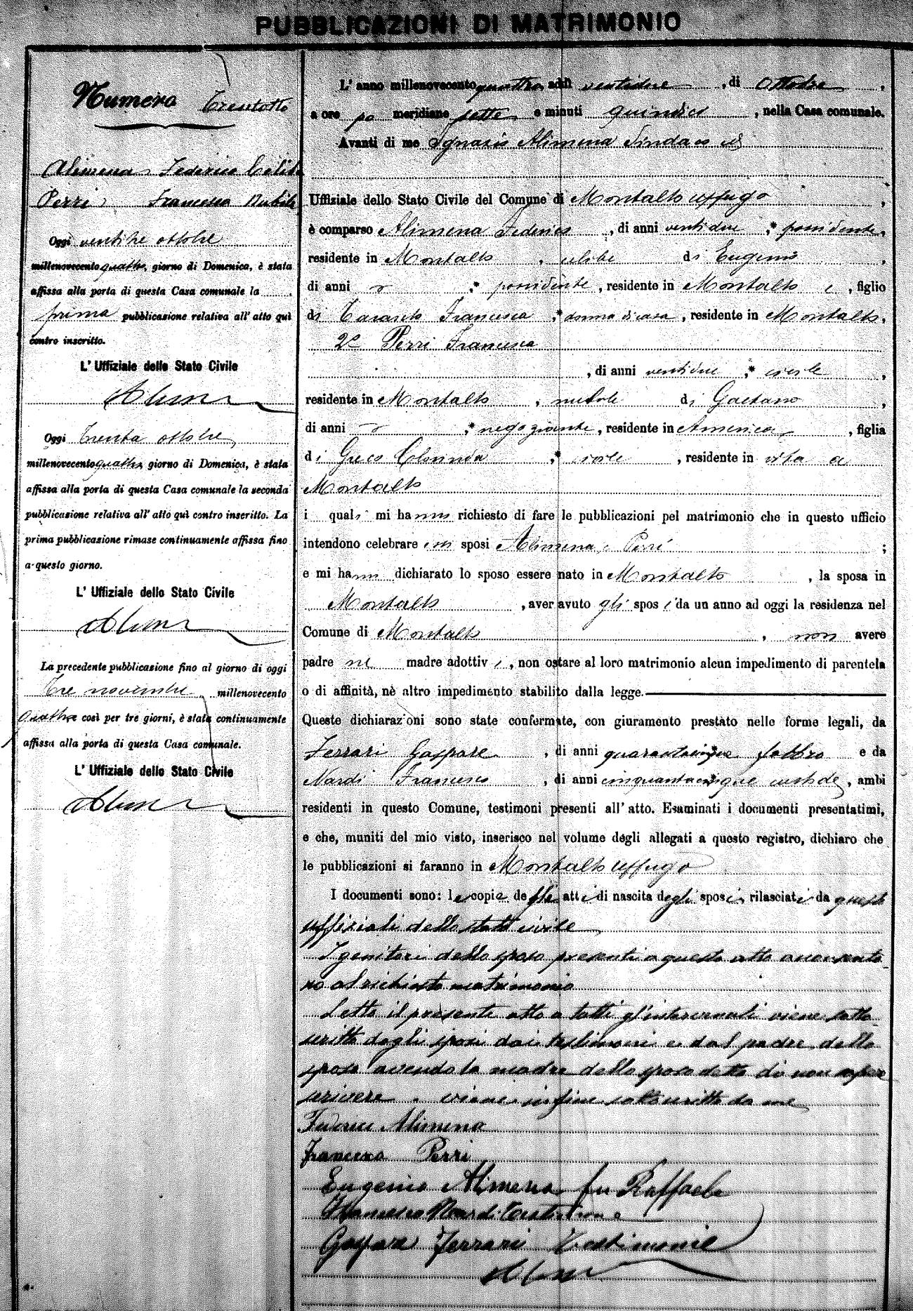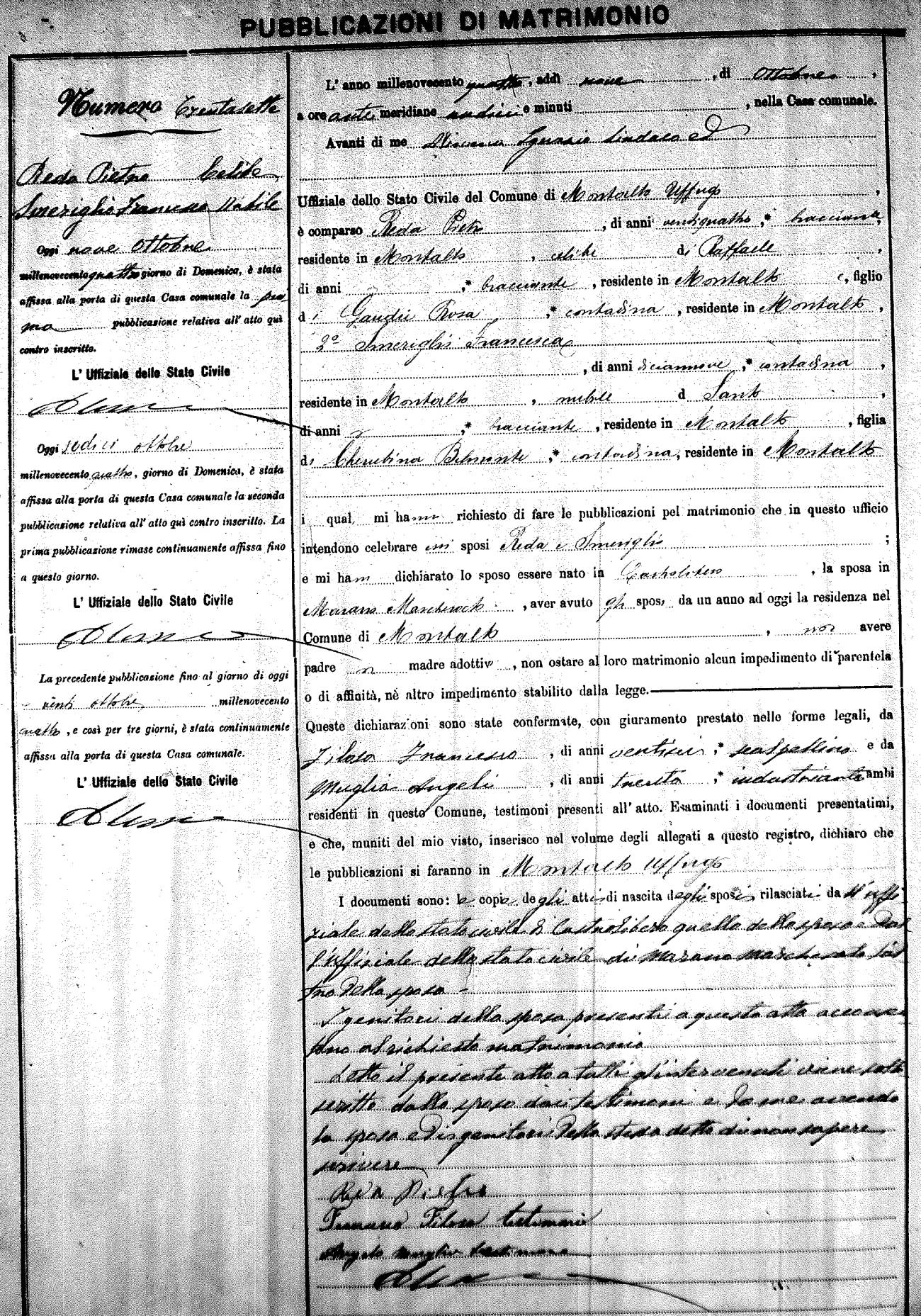 Here are the extractions for the marriage banns in 1904 for Montalto Uffugo. Each extraction has a link to a copy of the original document on the groom's surname. Please note: (fu) indicates the the person was deceased at the time of the marriage bann. For a translation of the basic Pubblicazioni document, look here.