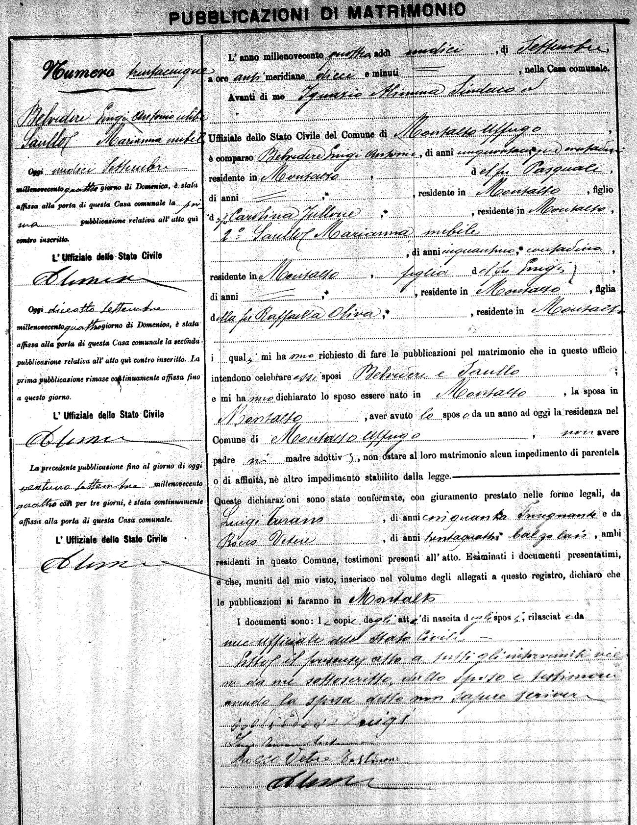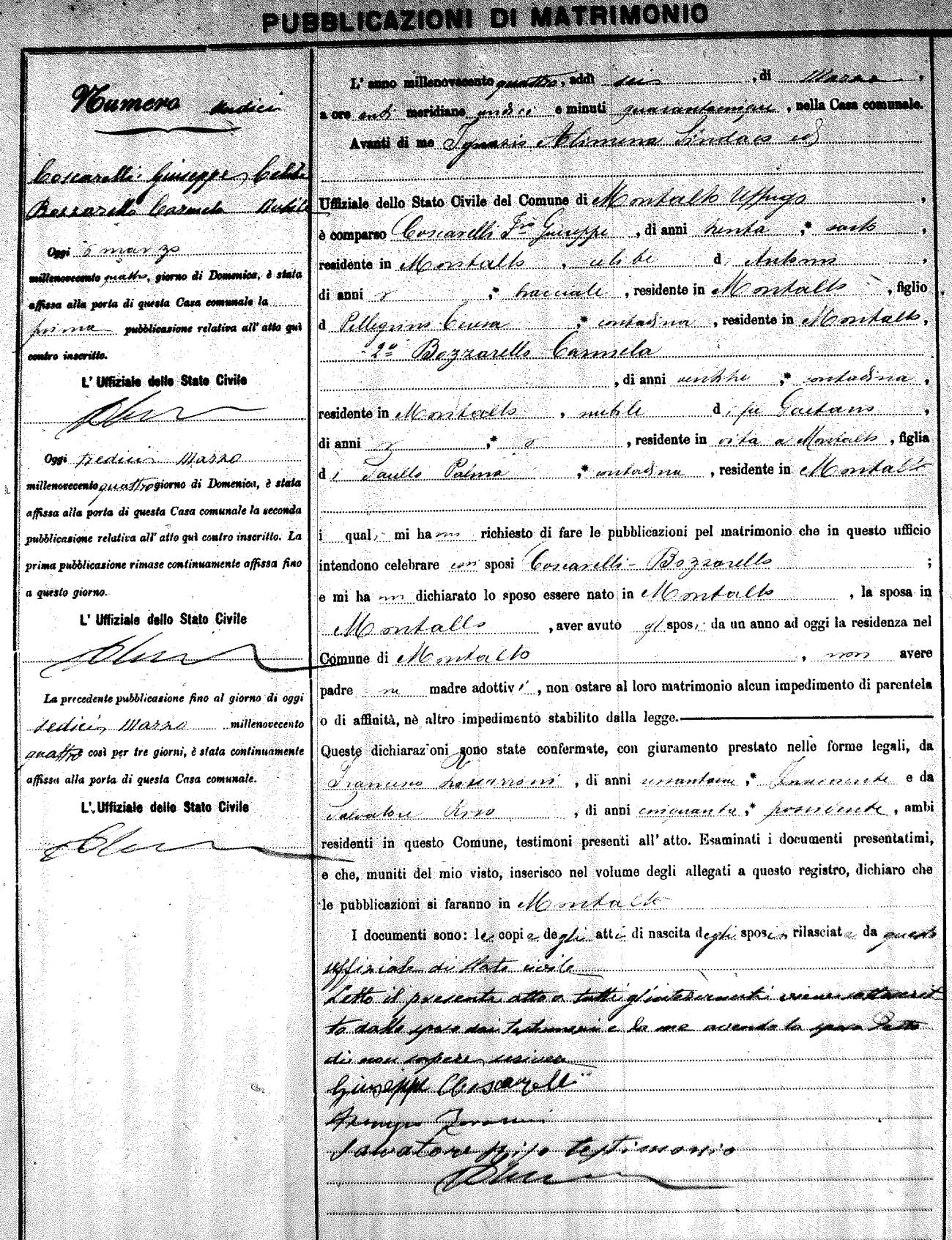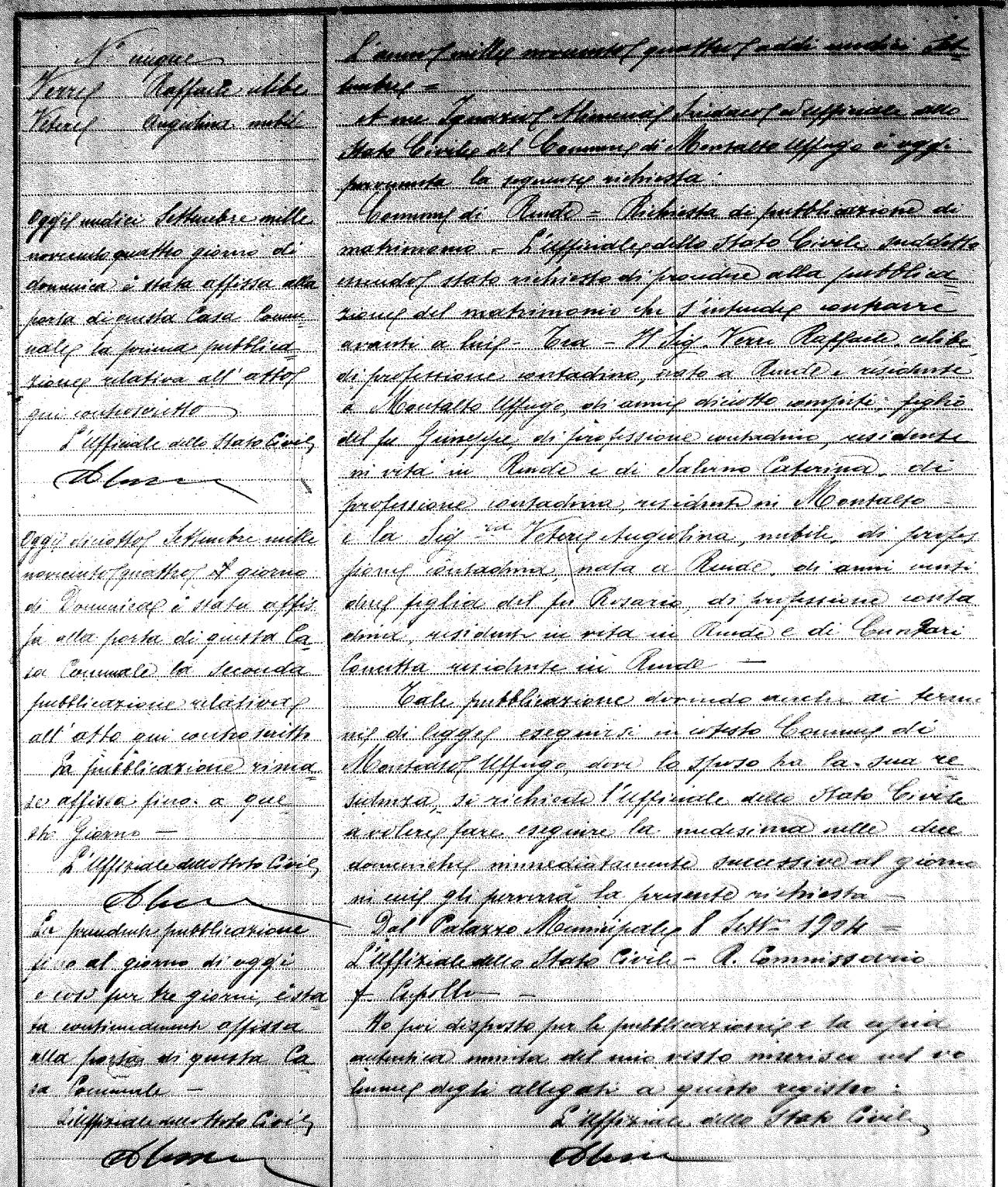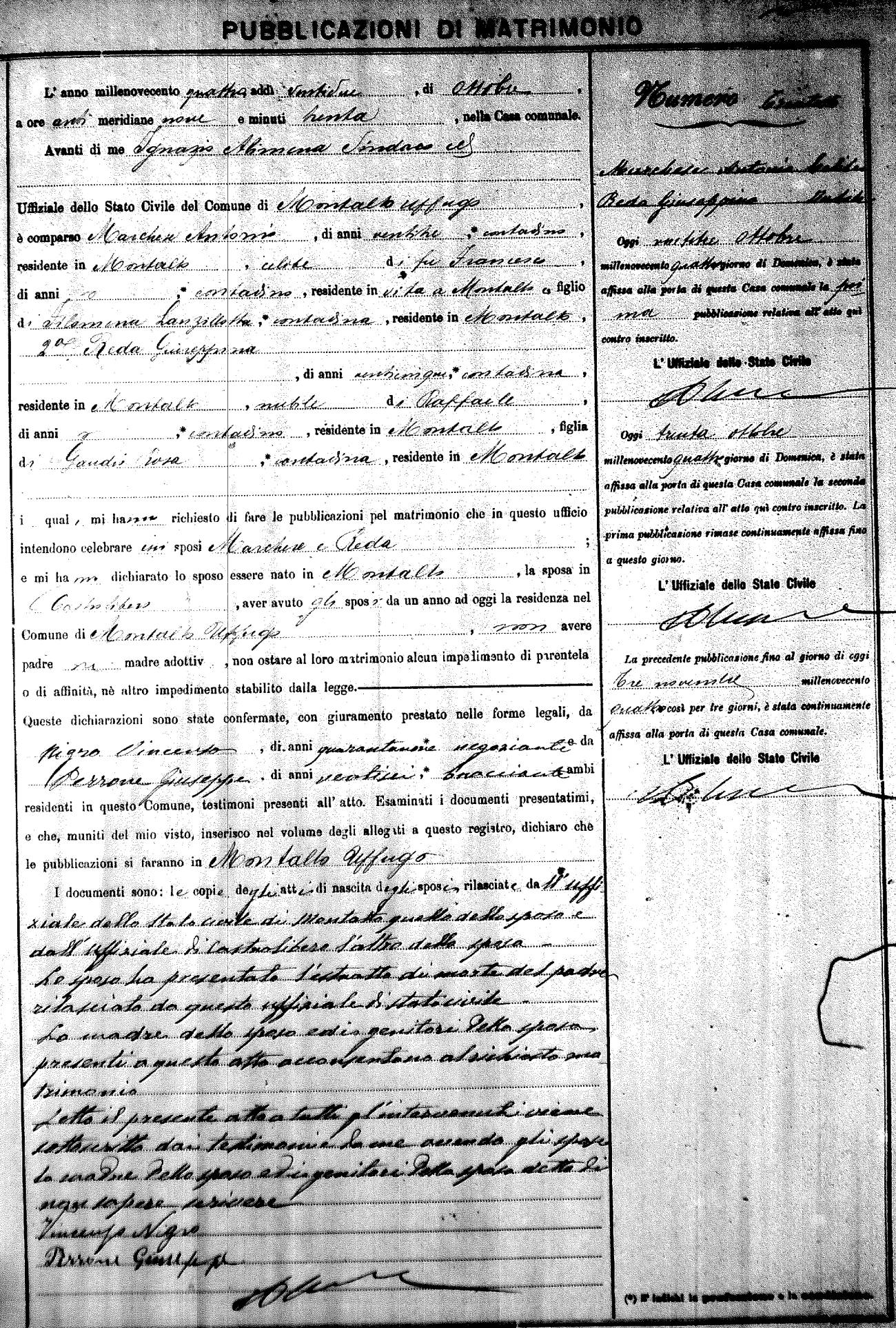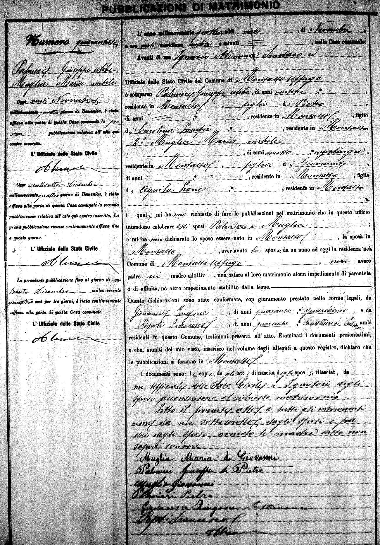 Here are the extractions for the marriage banns in 1904 for Montalto Uffugo. Each extraction has a link to a copy of the original document on the groom's surname. Please note: (fu) indicates the the person was deceased at the time of the marriage bann. For a translation of the basic Pubblicazioni document, look here.