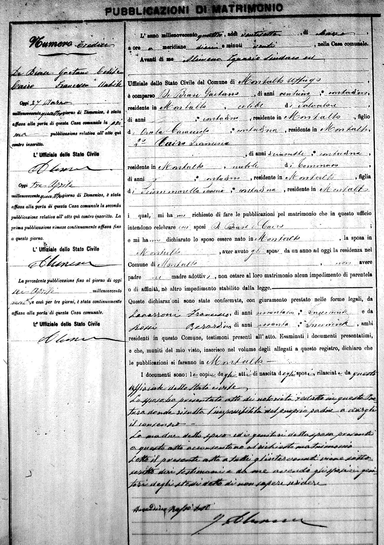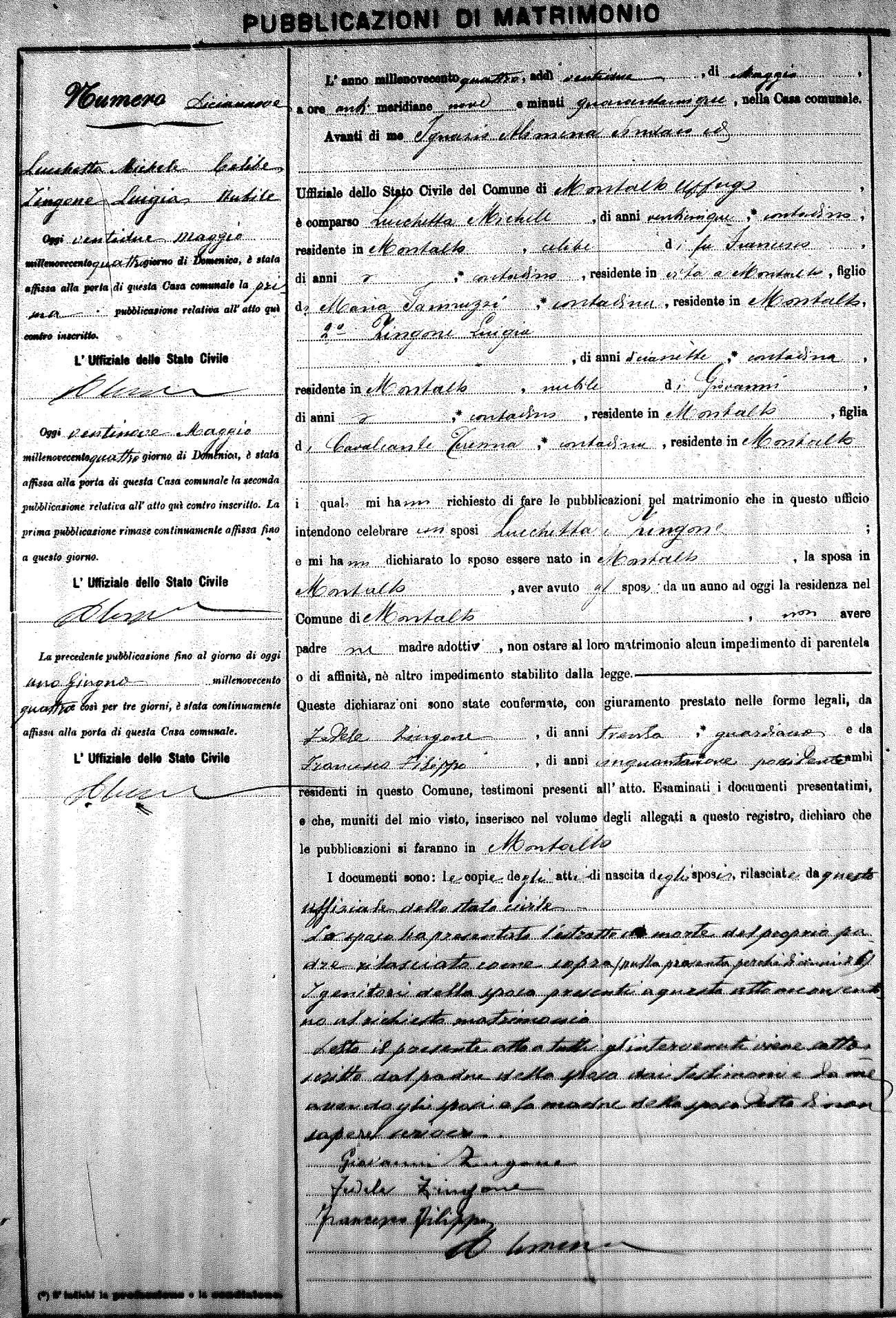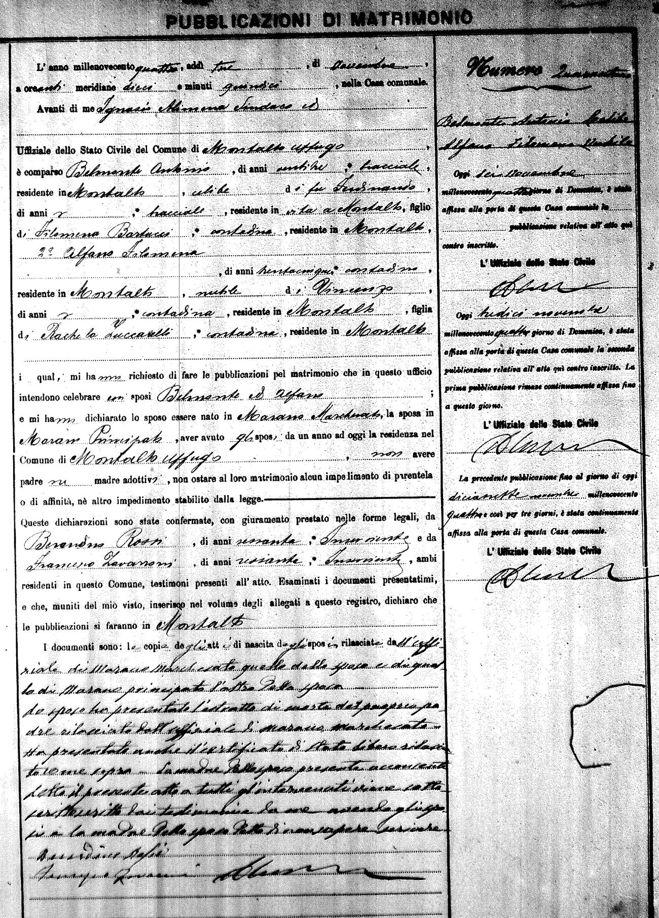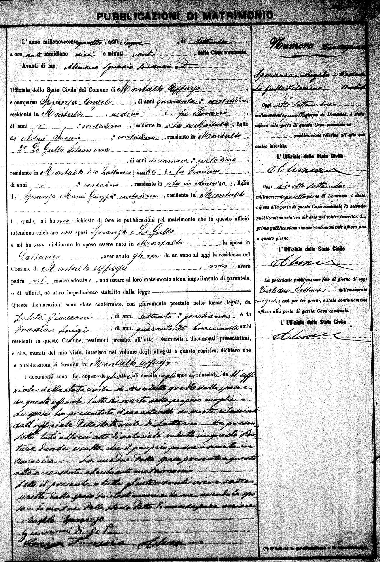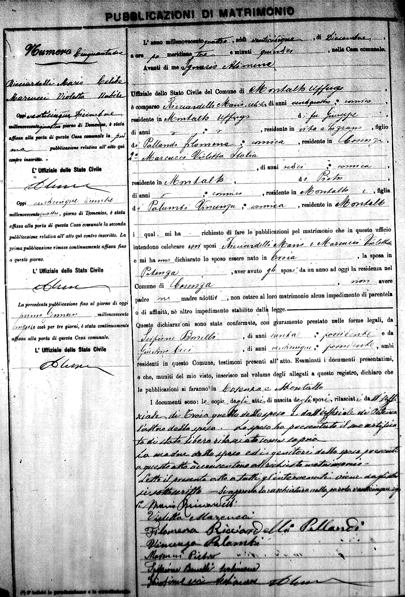 Here are the extractions for the marriage banns in 1904 for Montalto Uffugo. Each extraction has a link to a copy of the original document on the groom's surname. Please note: (fu) indicates the the person was deceased at the time of the marriage bann. For a translation of the basic Pubblicazioni document, look here.
