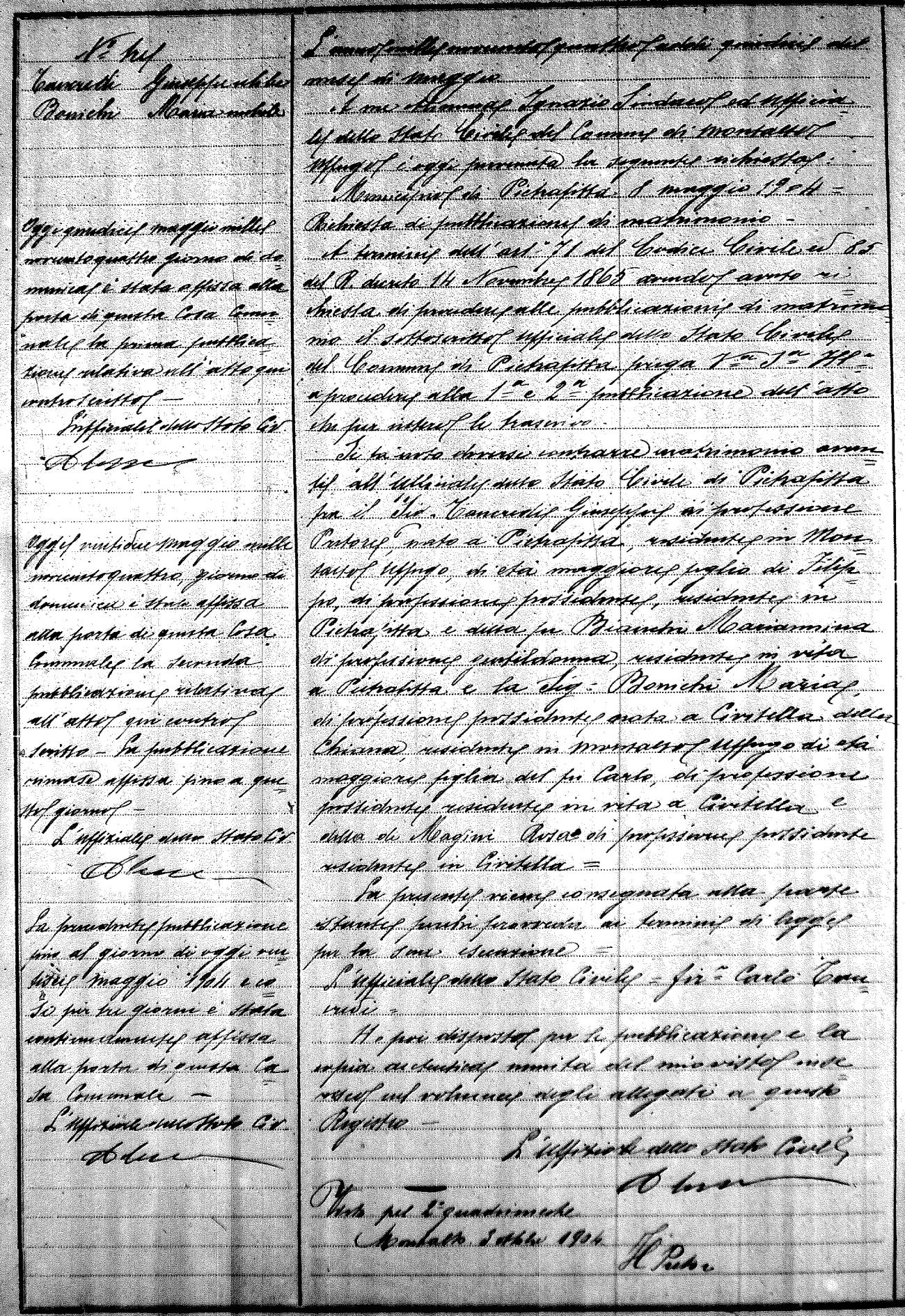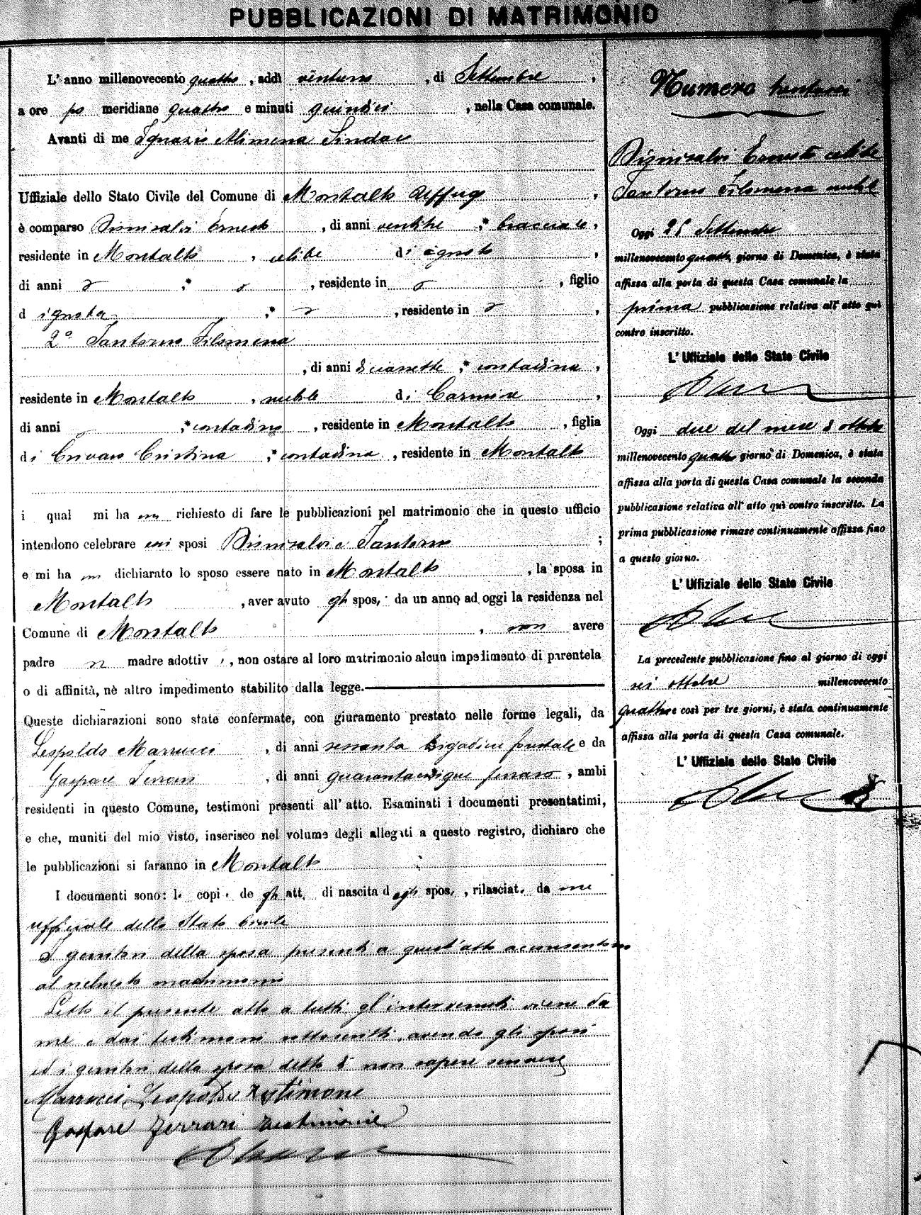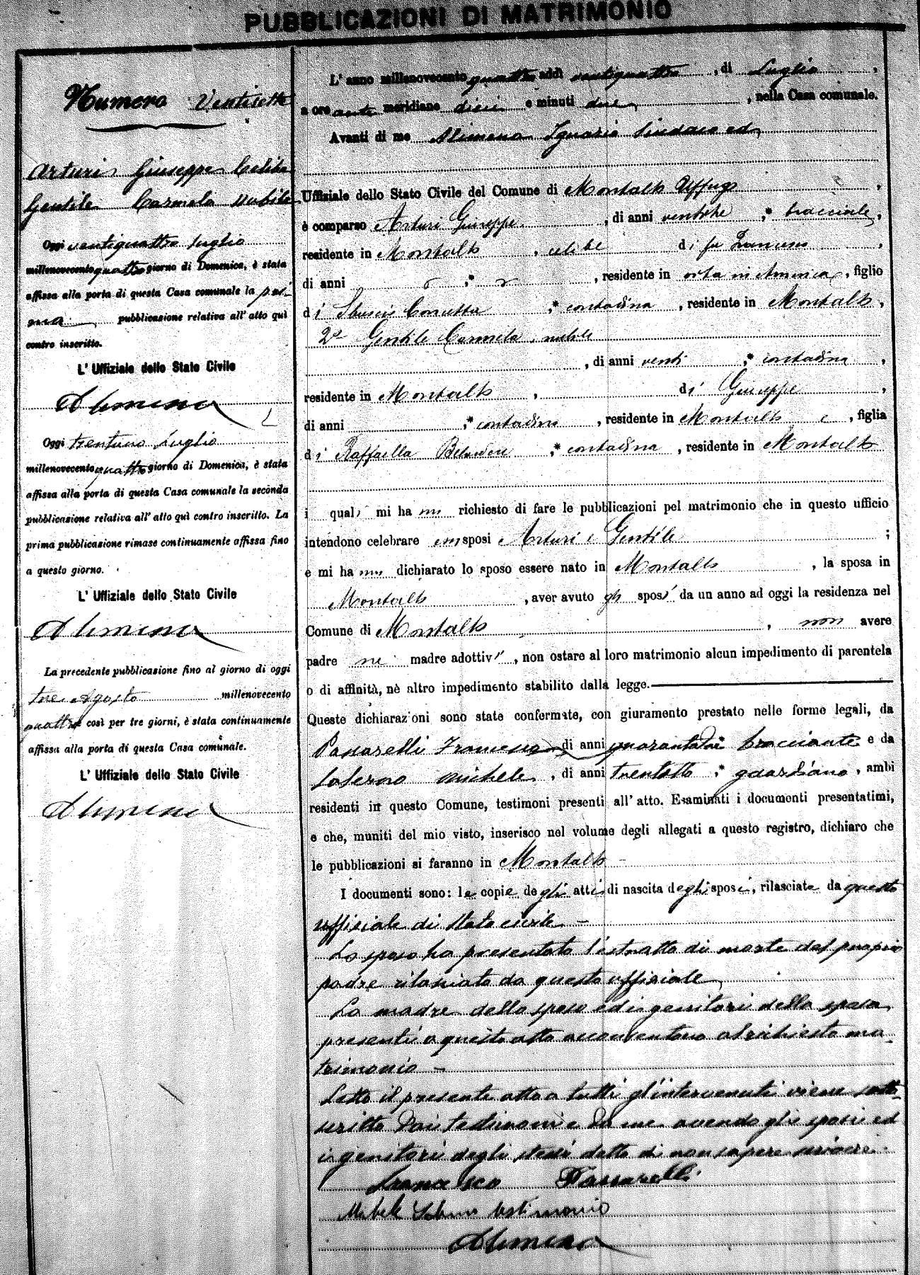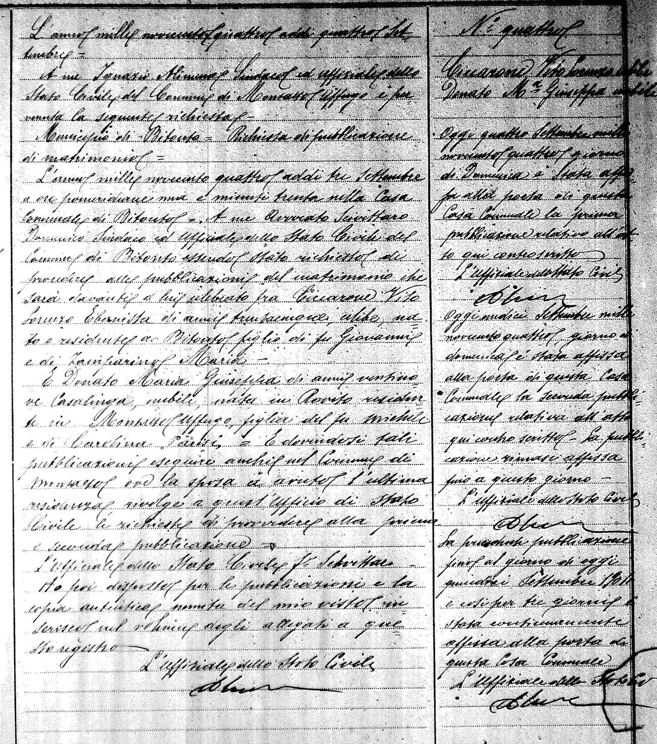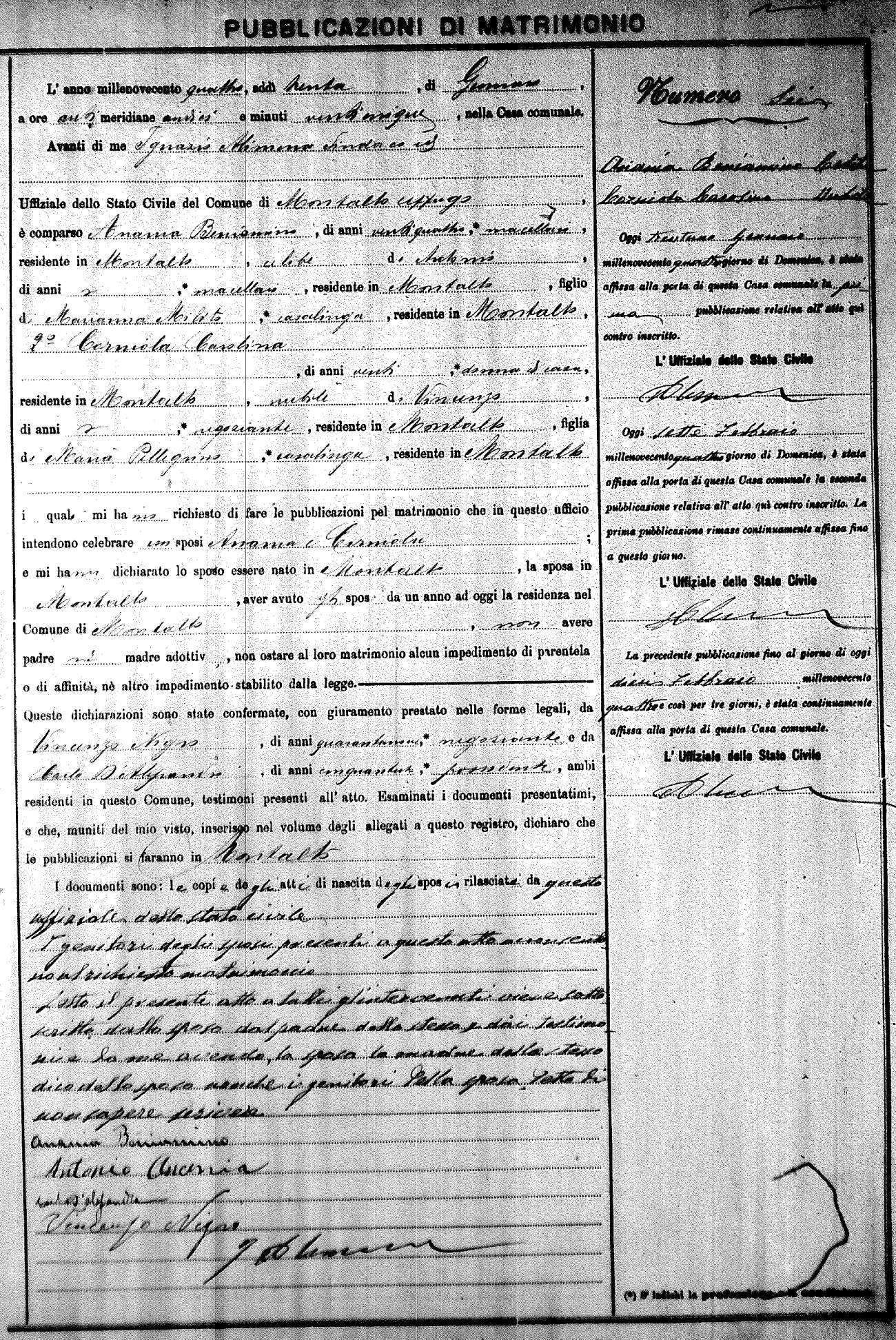 Here are the extractions for the marriage banns in 1904 for Montalto Uffugo. Each extraction has a link to a copy of the original document on the groom's surname. Please note: (fu) indicates the the person was deceased at the time of the marriage bann. For a translation of the basic Pubblicazioni document, look here.