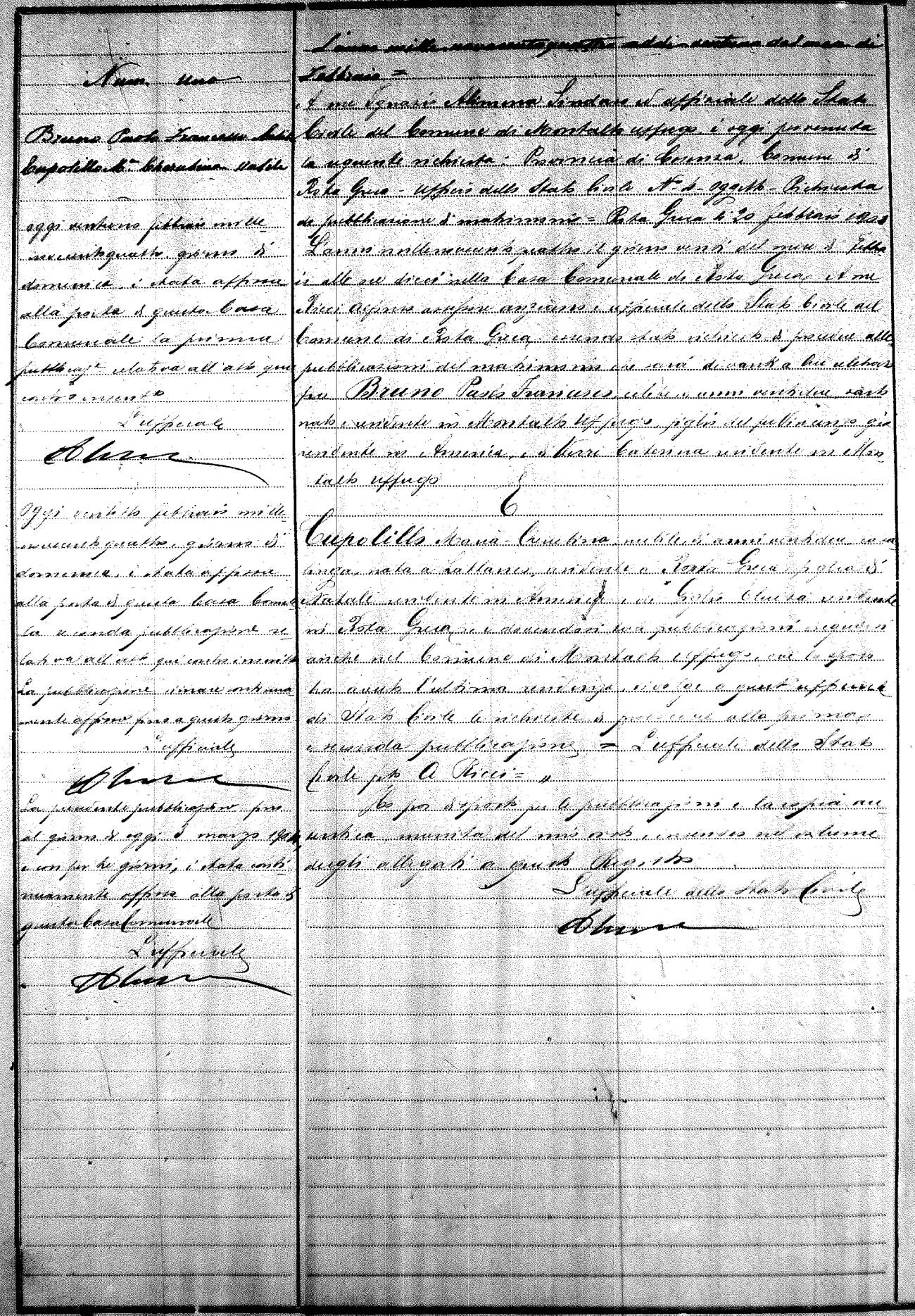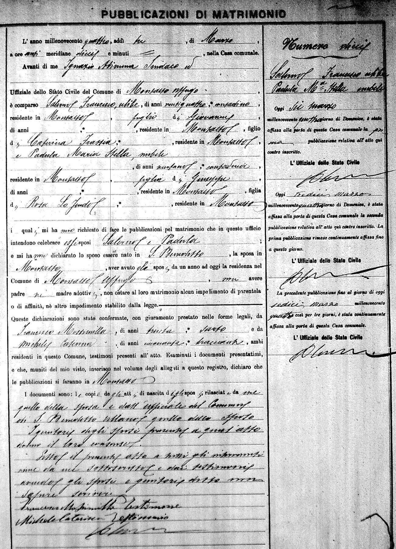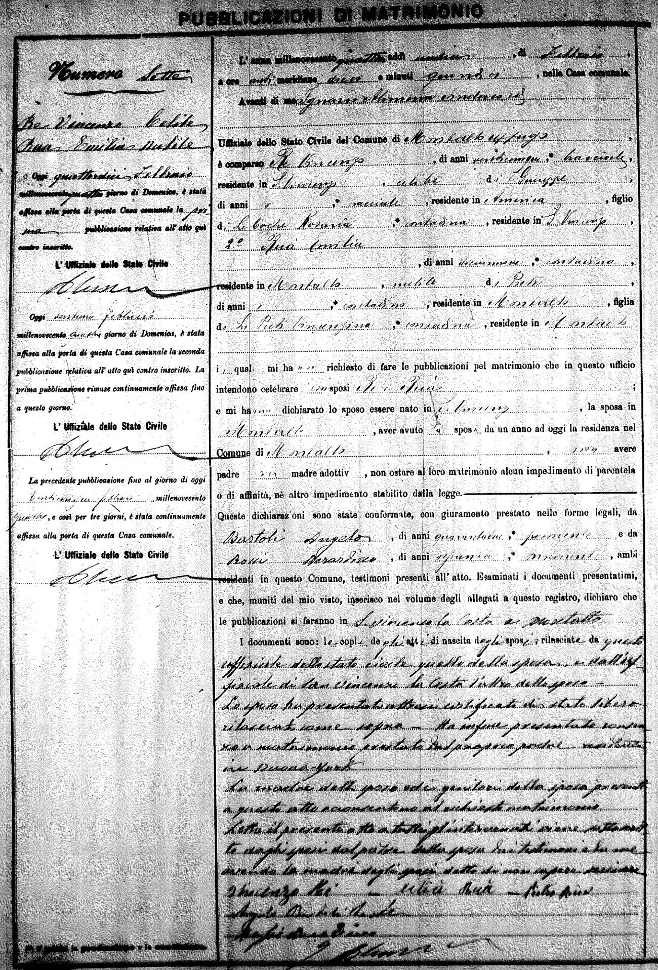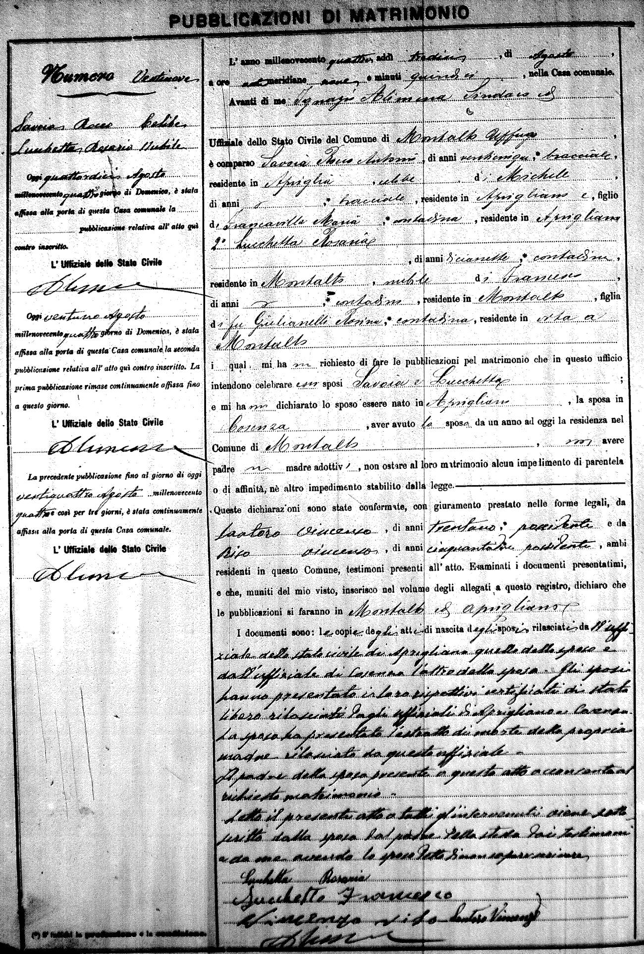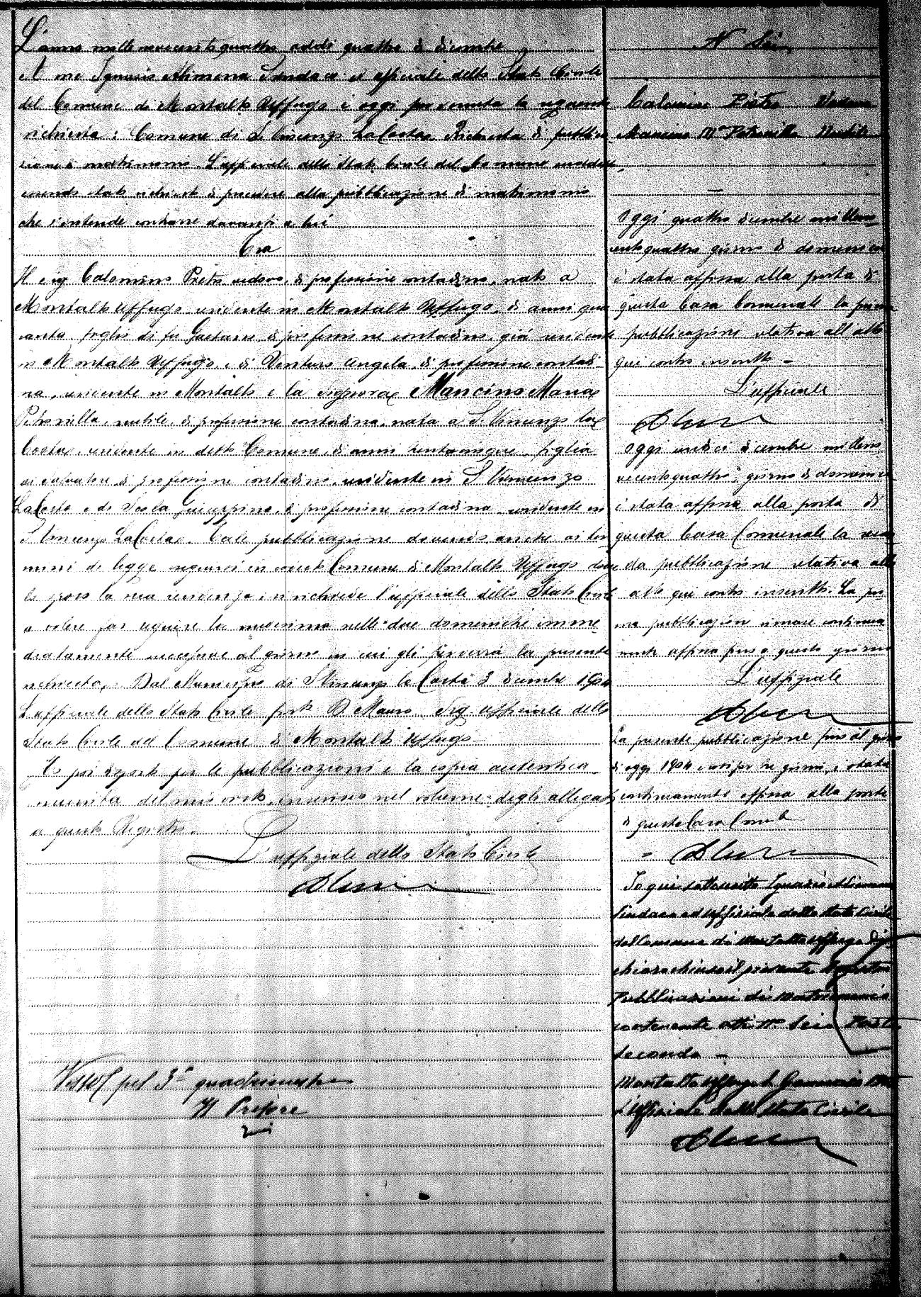 Here are the extractions for the marriage banns in 1904 for Montalto Uffugo. Each extraction has a link to a copy of the original document on the groom's surname. Please note: (fu) indicates the the person was deceased at the time of the marriage bann. For a translation of the basic Pubblicazioni document, look here.