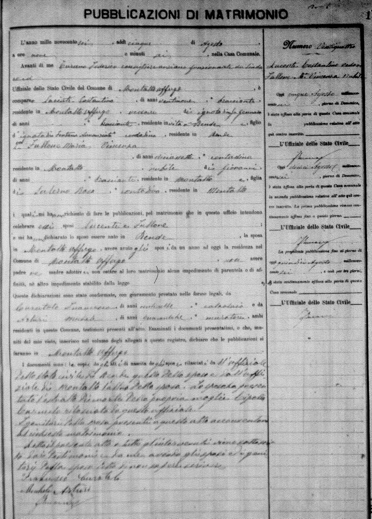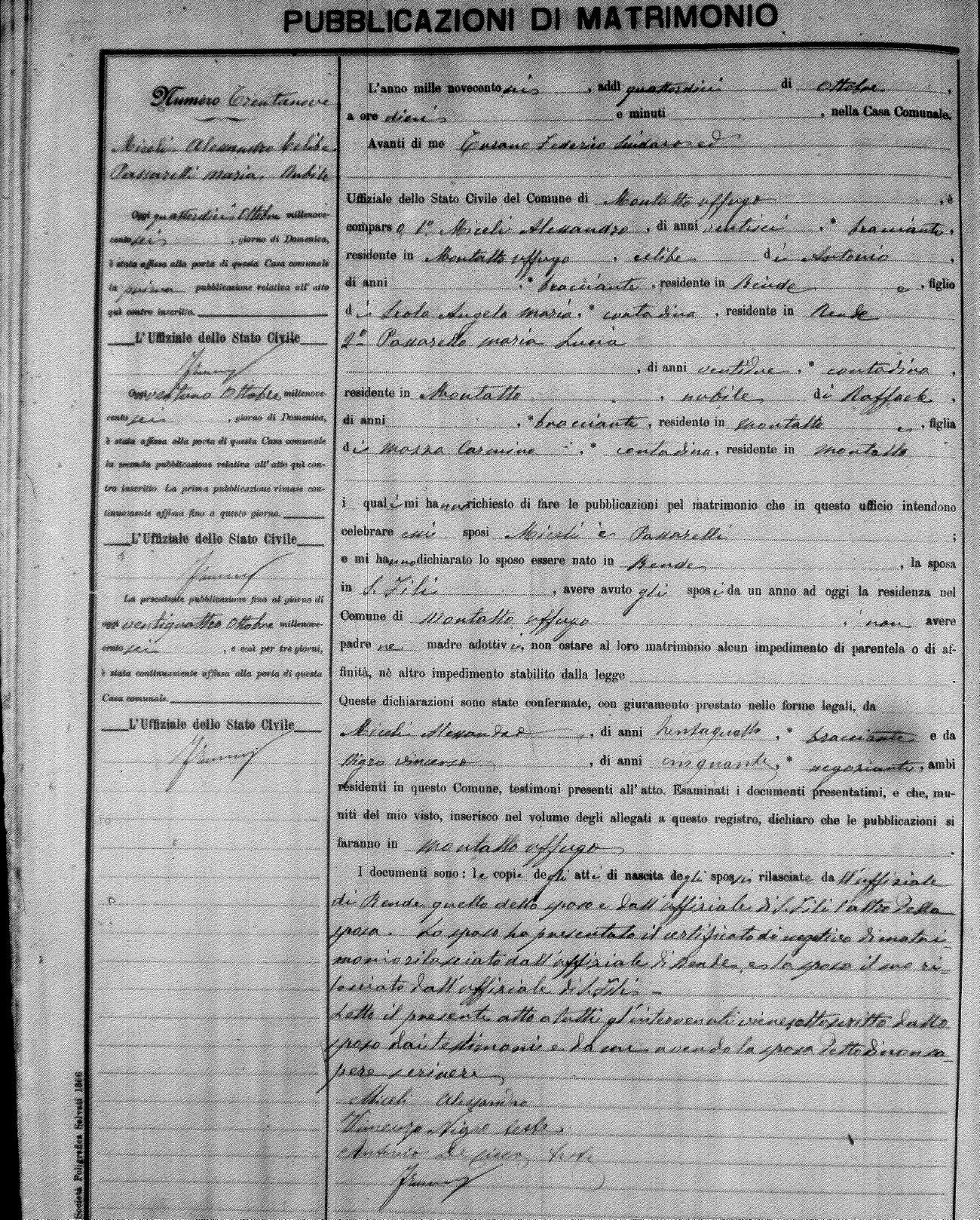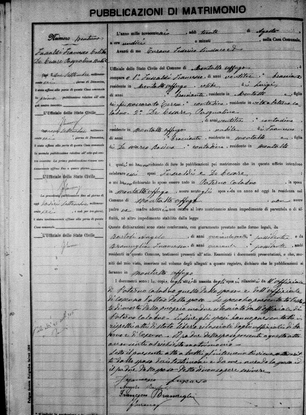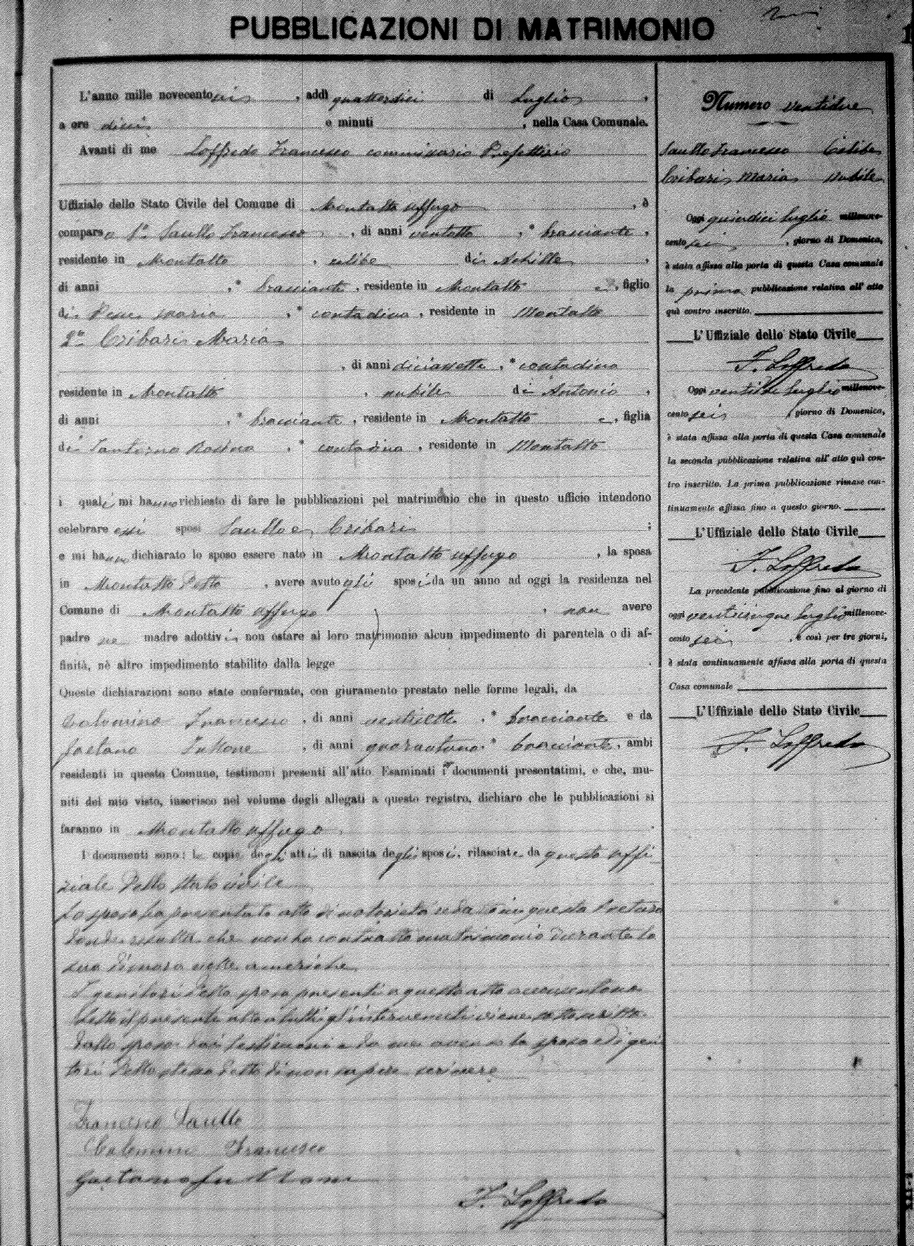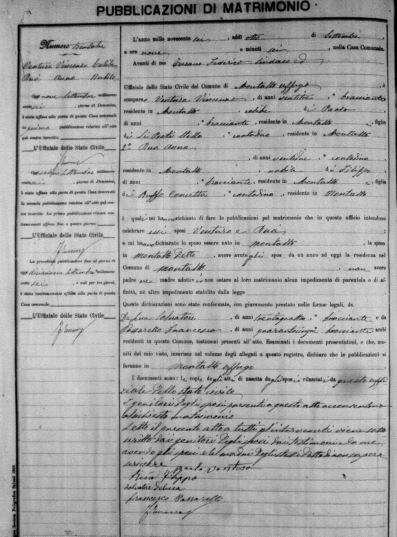 Here are the extractions for the marriage banns in 1906 for Montalto Uffugo. Each extraction has a link to a copy of the original document on the groom's surname. Please note: (fu) indicates the the person was deceased at the time of the marriage bann. For a translation of the basic Pubblicazioni document, look here.