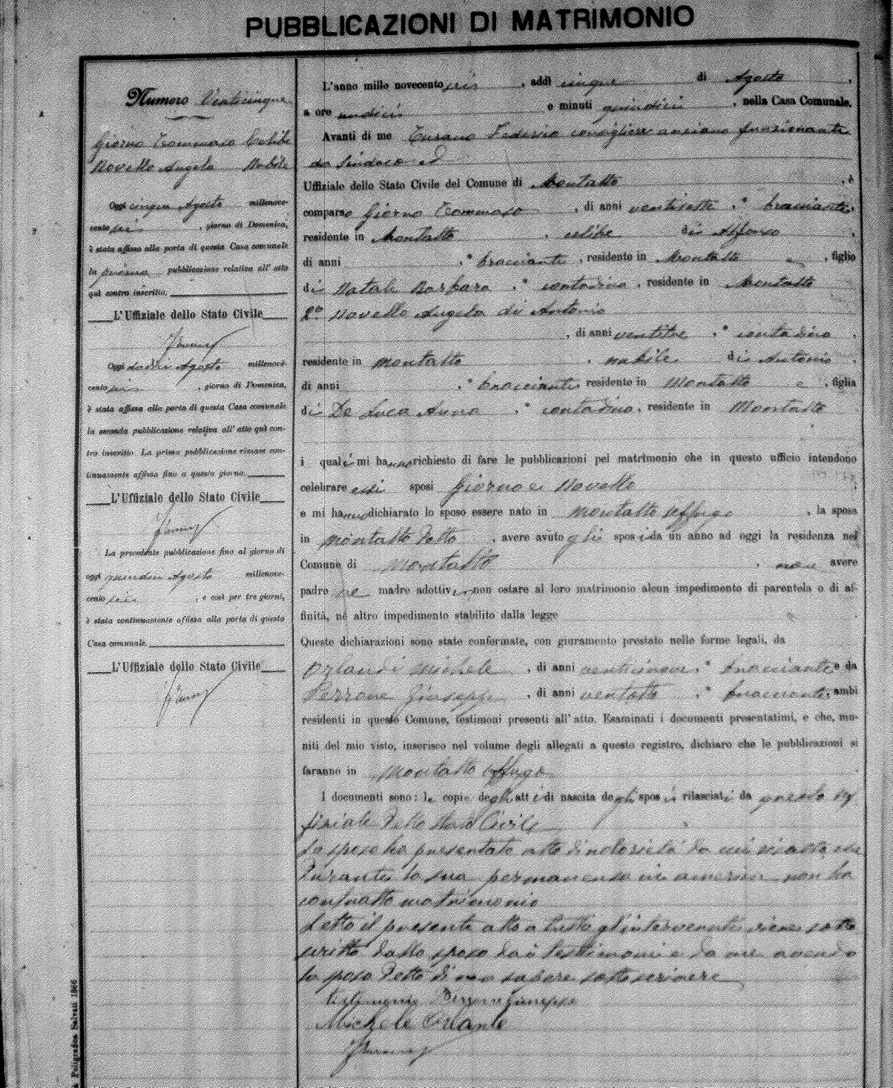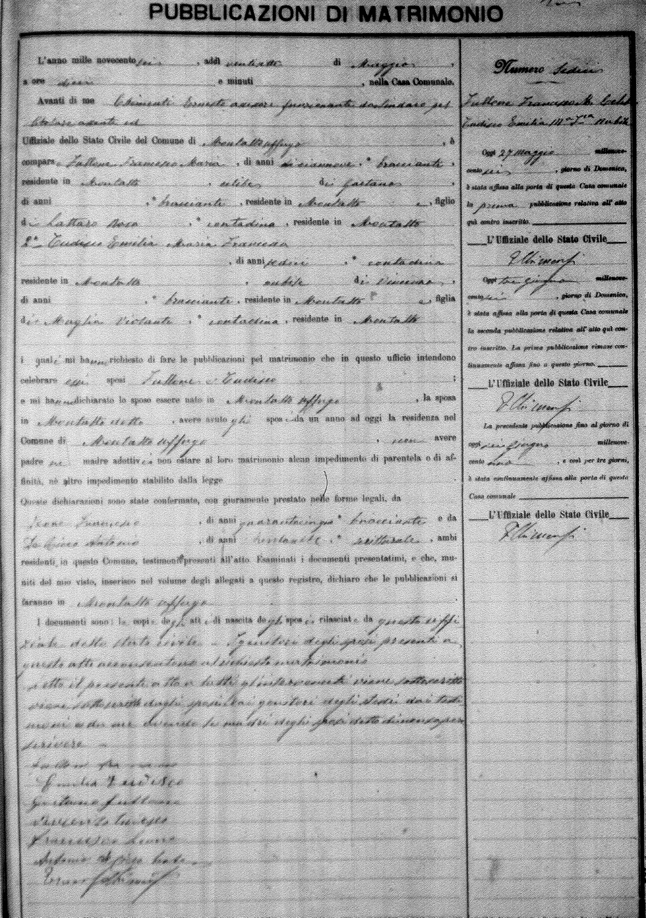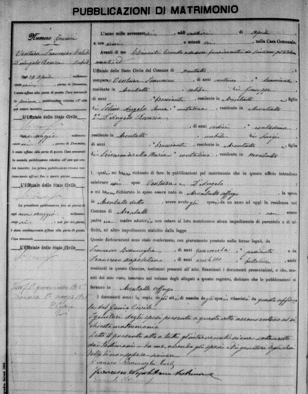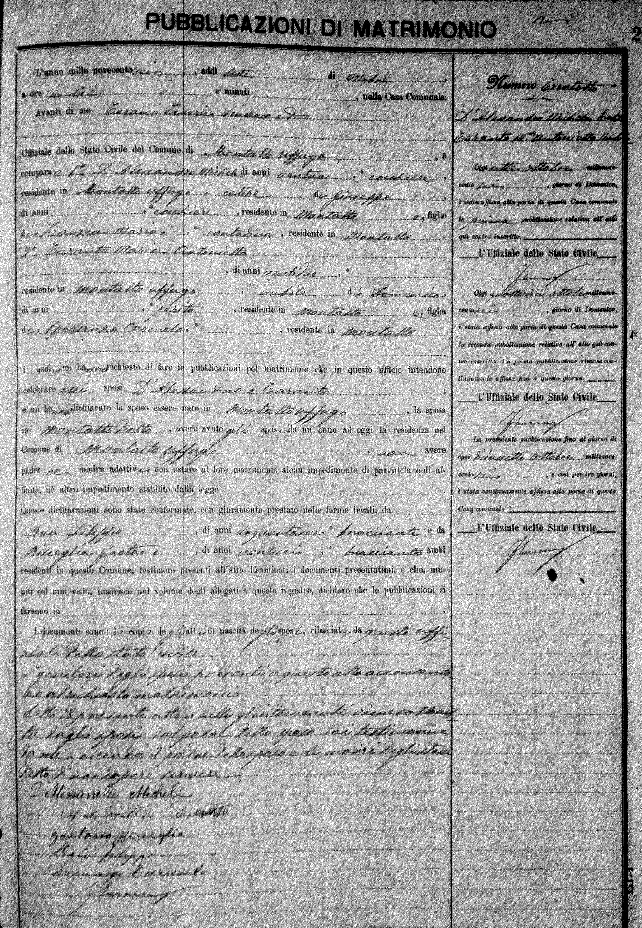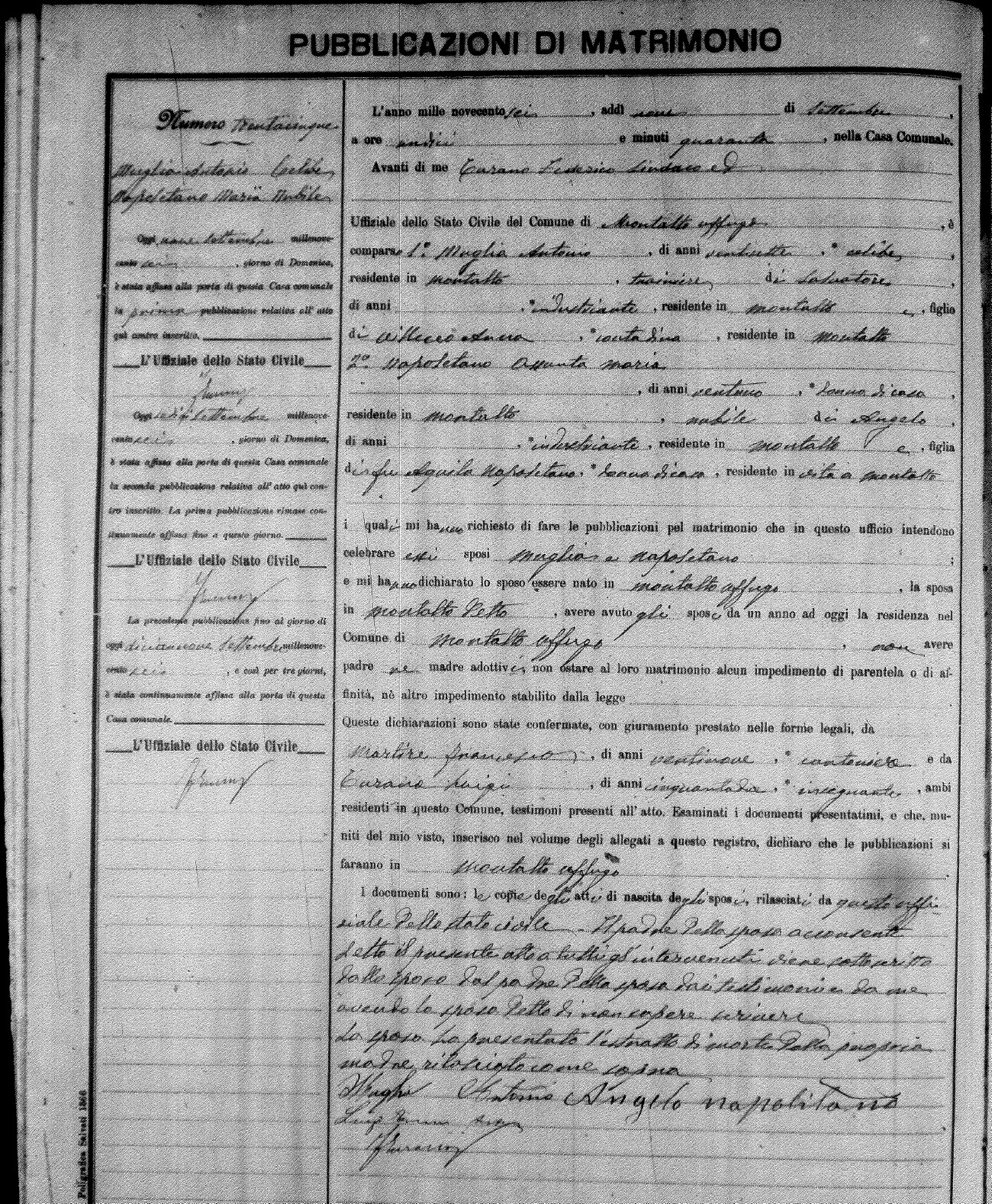 Here are the extractions for the marriage banns in 1906 for Montalto Uffugo. Each extraction has a link to a copy of the original document on the groom's surname. Please note: (fu) indicates the the person was deceased at the time of the marriage bann. For a translation of the basic Pubblicazioni document, look here.