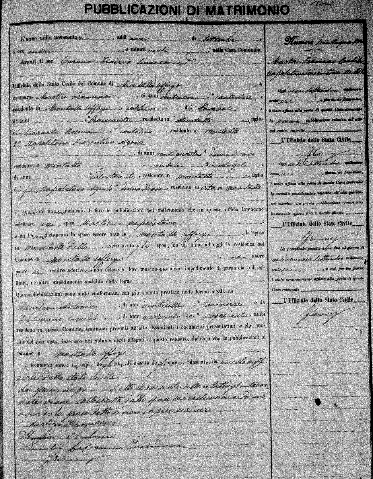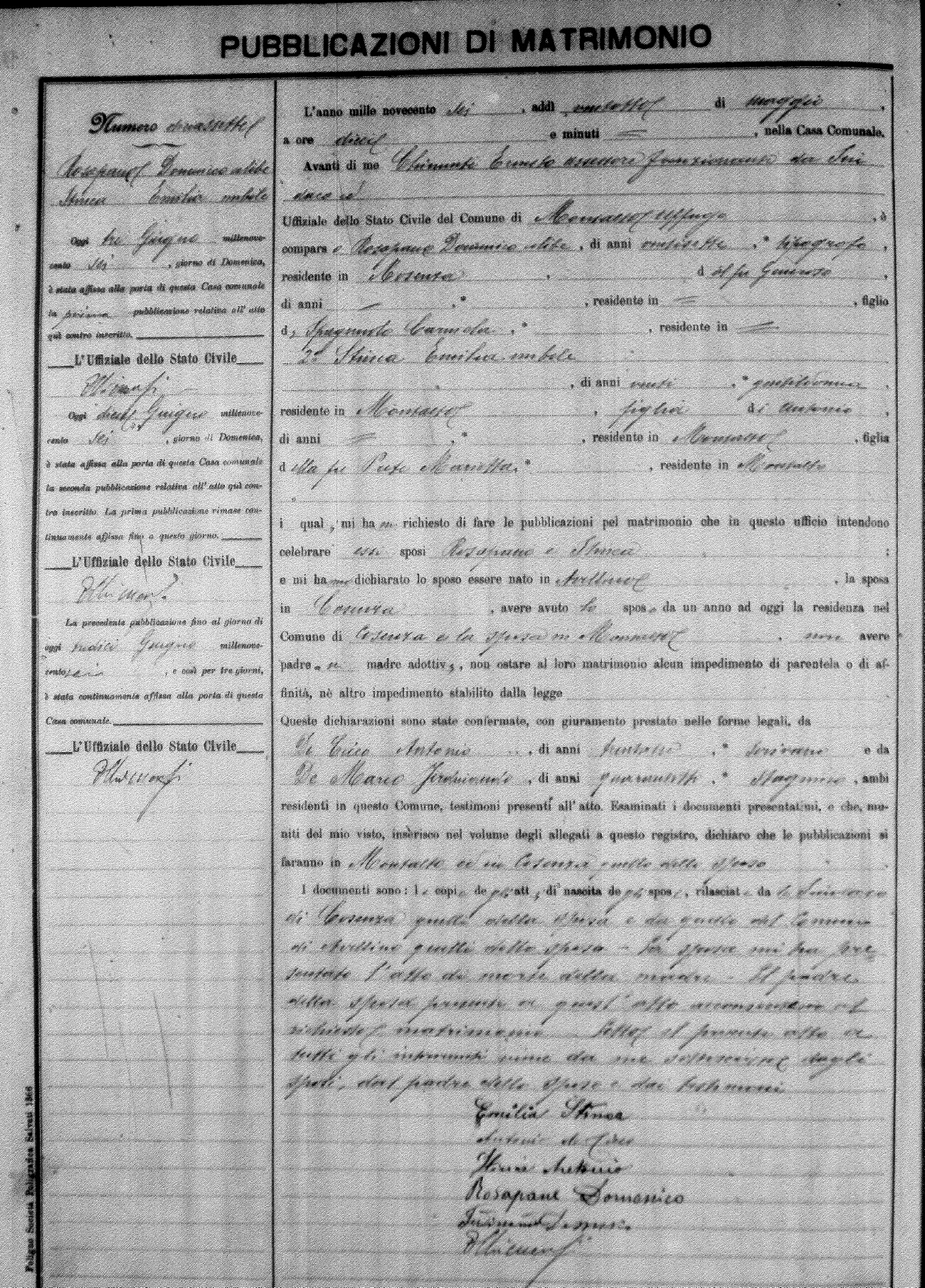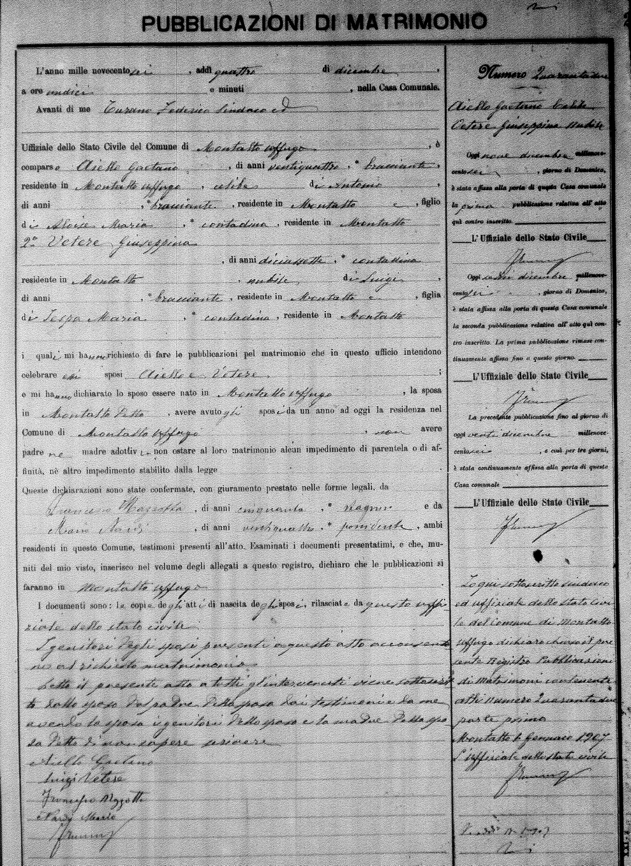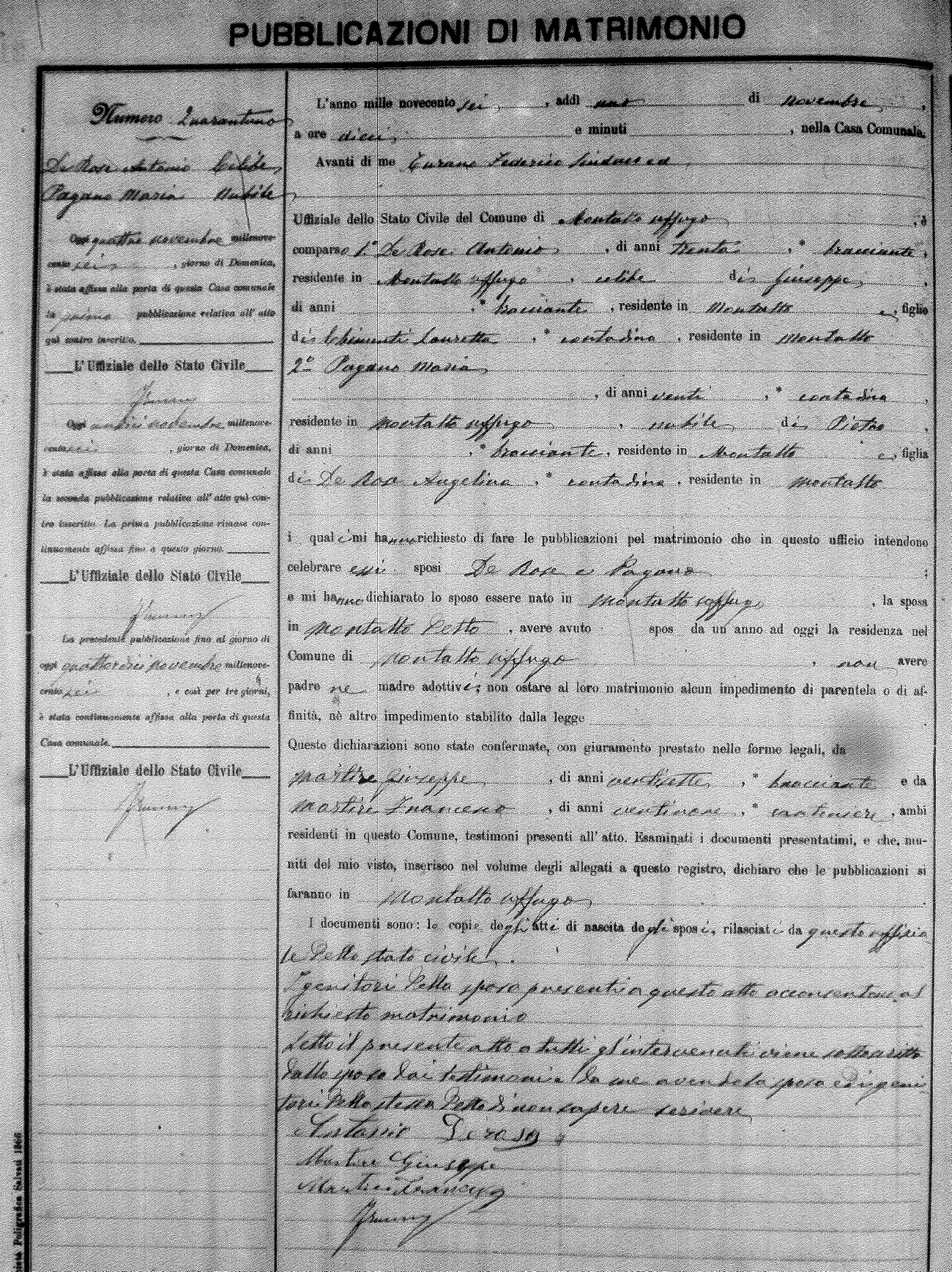 Here are the extractions for the marriage banns in 1906 for Montalto Uffugo. Each extraction has a link to a copy of the original document on the groom's surname. Please note: (fu) indicates the the person was deceased at the time of the marriage bann. For a translation of the basic Pubblicazioni document, look here.