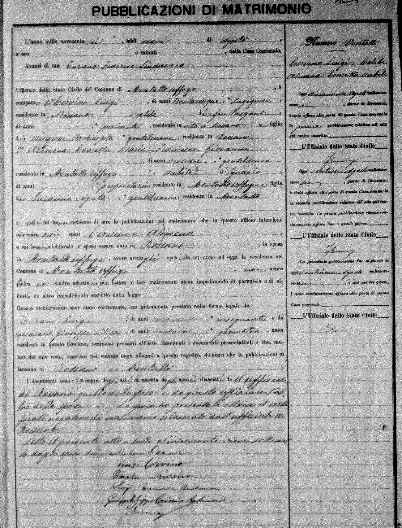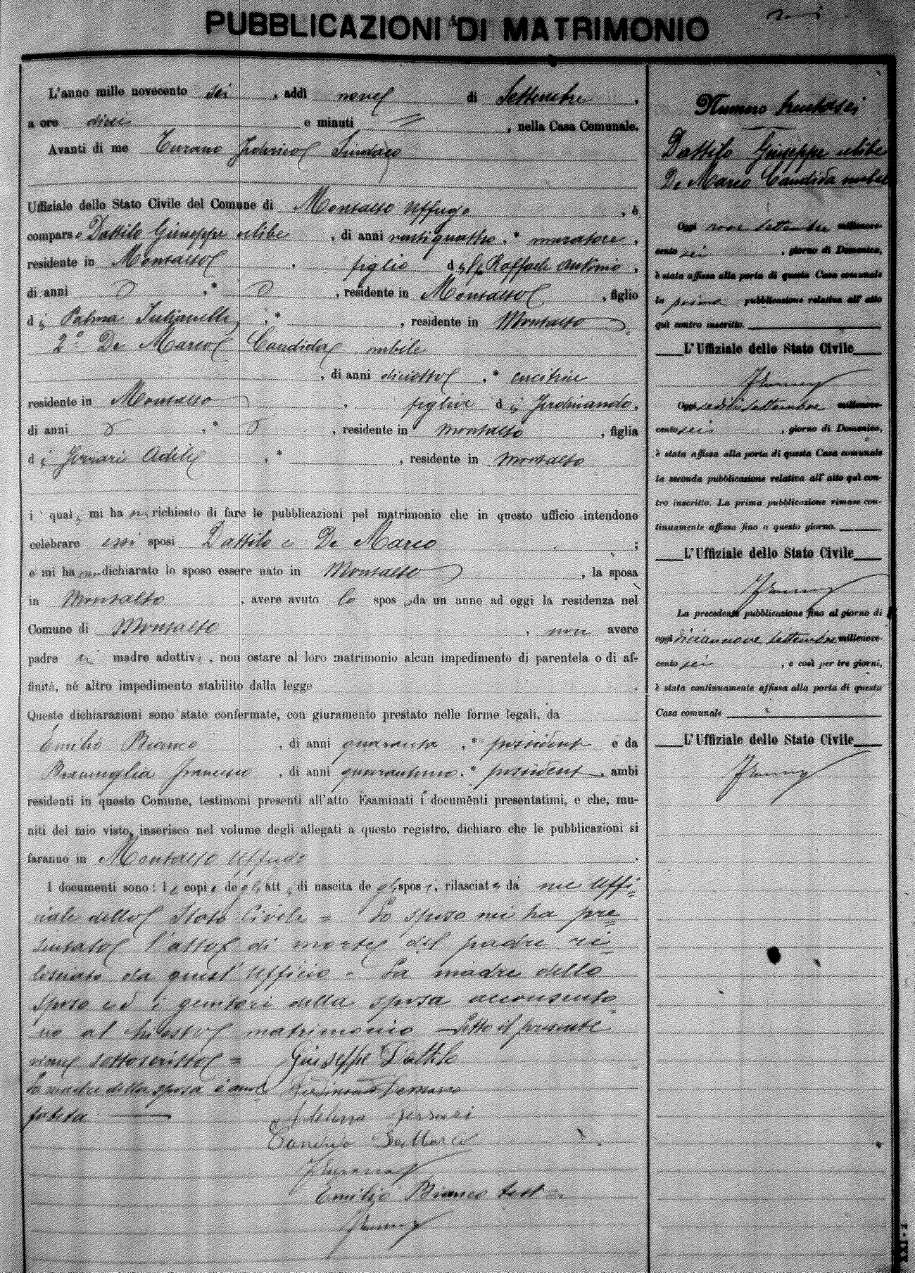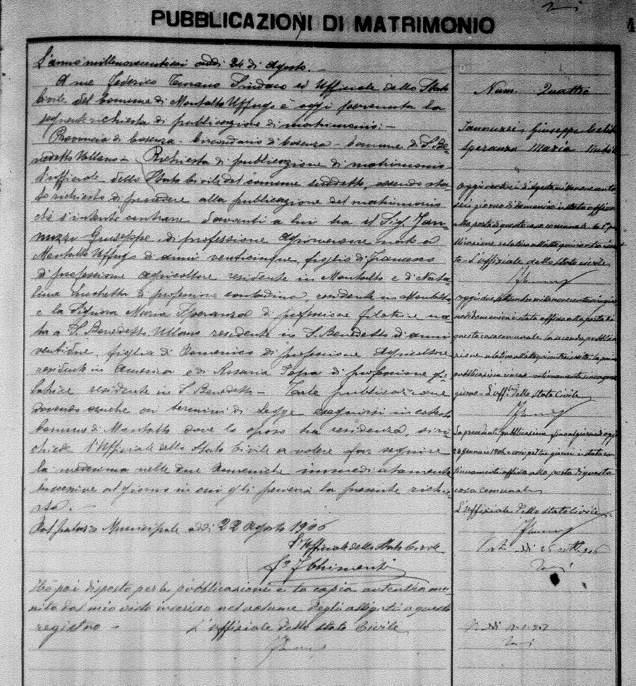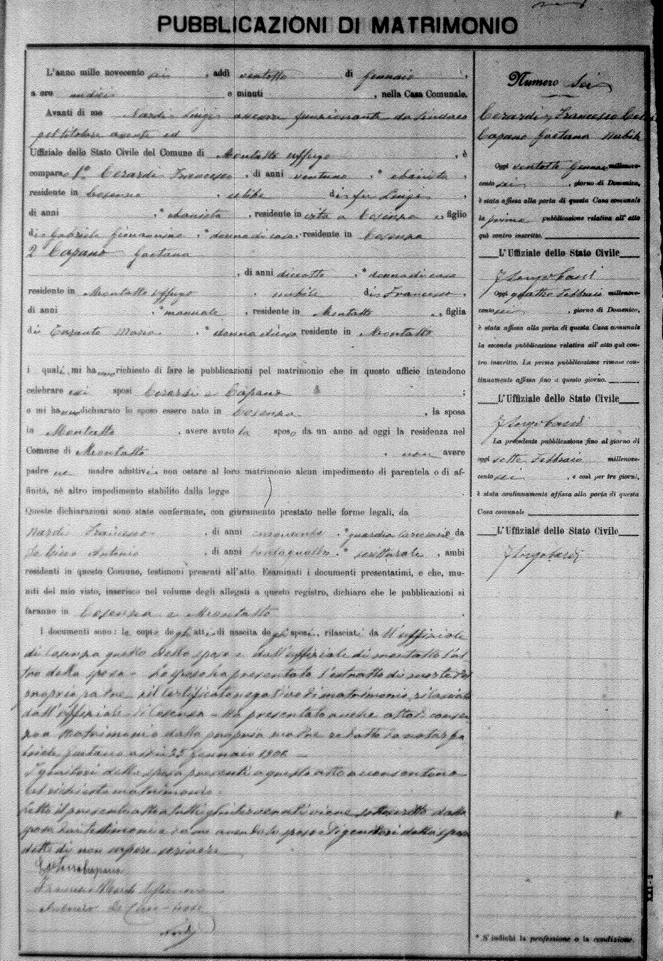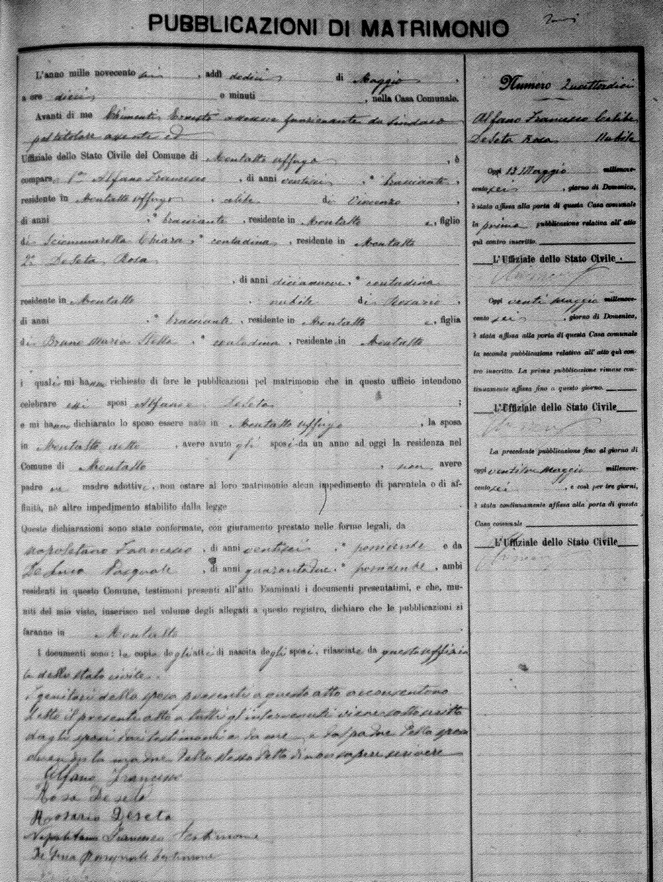 Here are the extractions for the marriage banns in 1906 for Montalto Uffugo. Each extraction has a link to a copy of the original document on the groom's surname. Please note: (fu) indicates the the person was deceased at the time of the marriage bann. For a translation of the basic Pubblicazioni document, look here.