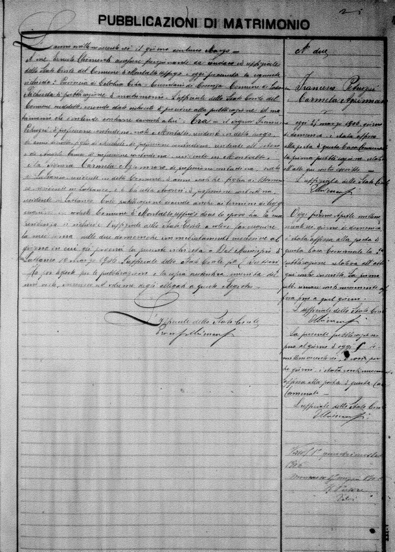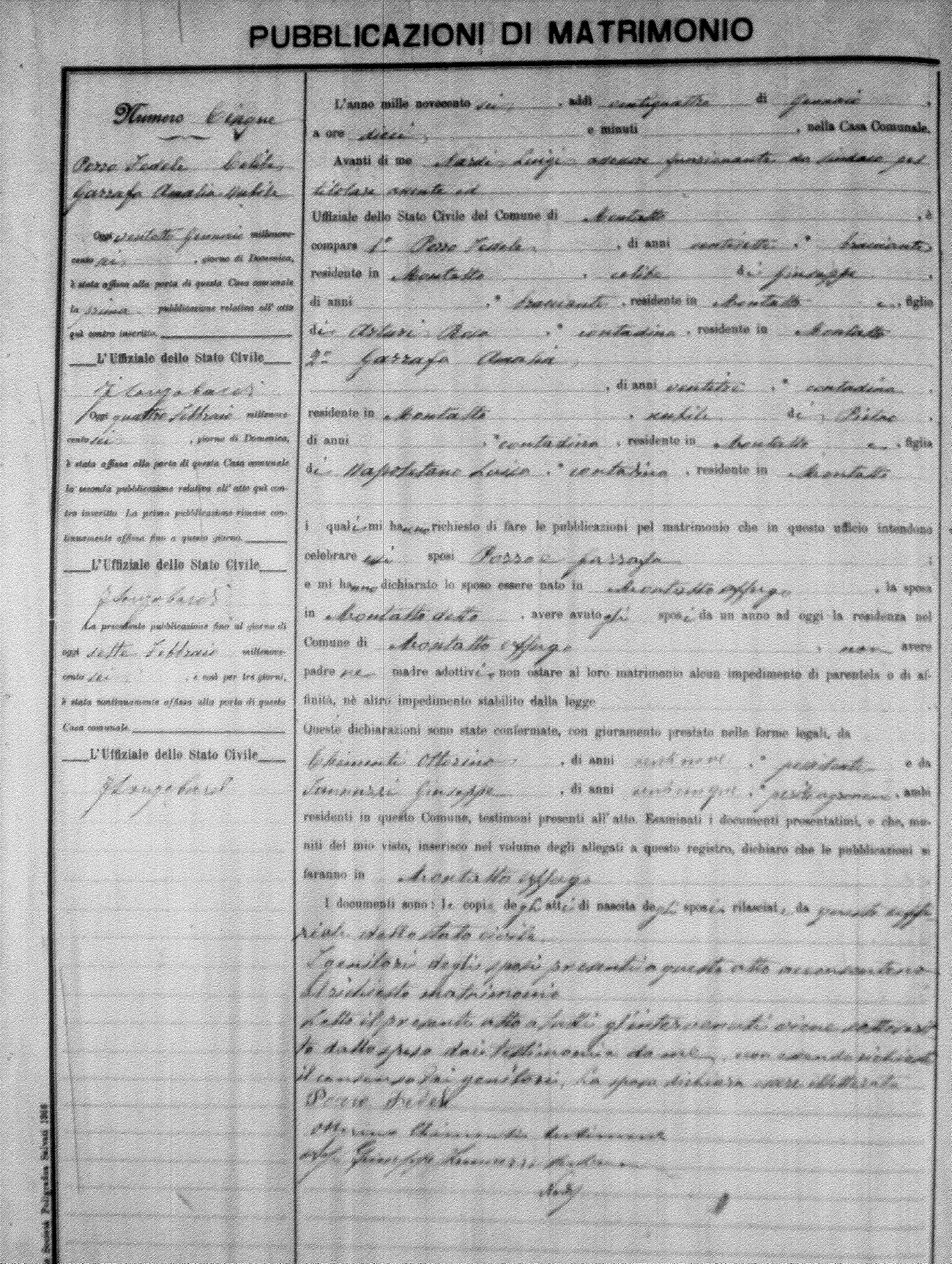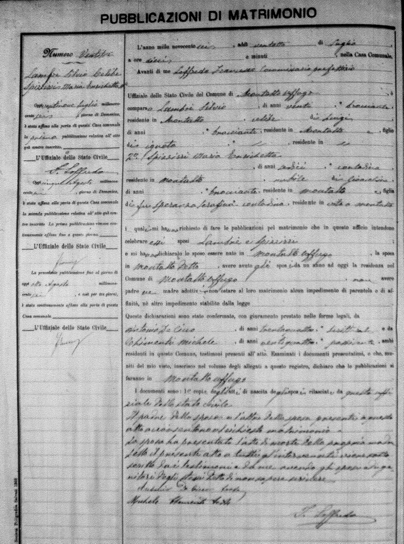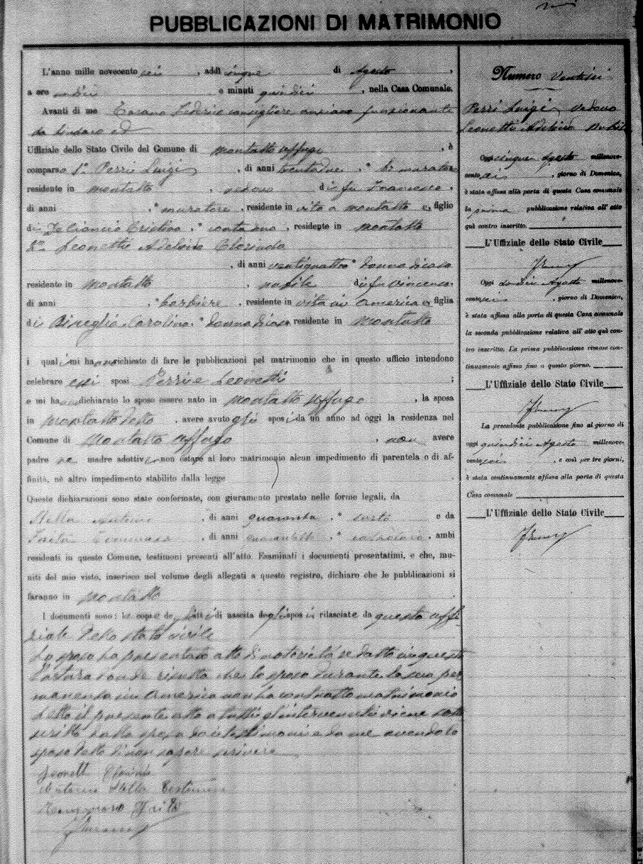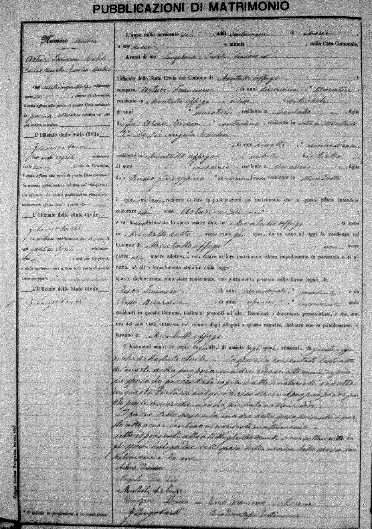 Here are the extractions for the marriage banns in 1906 for Montalto Uffugo. Each extraction has a link to a copy of the original document on the groom's surname. Please note: (fu) indicates the the person was deceased at the time of the marriage bann. For a translation of the basic Pubblicazioni document, look here.