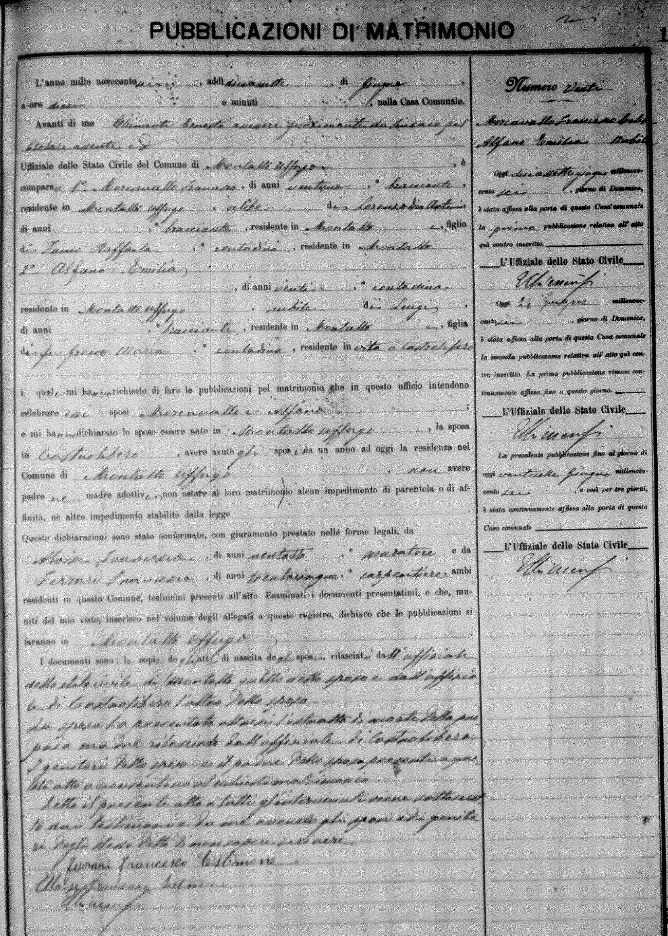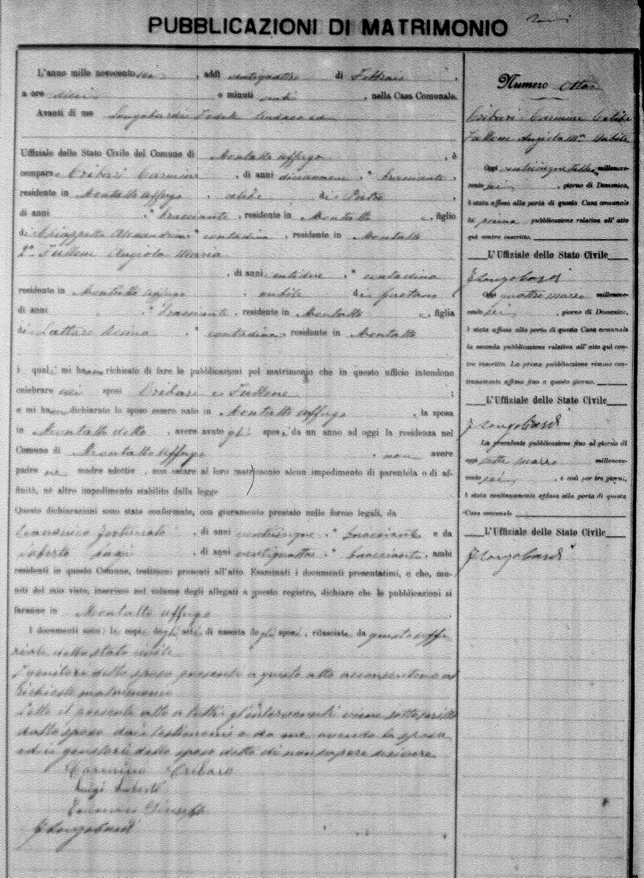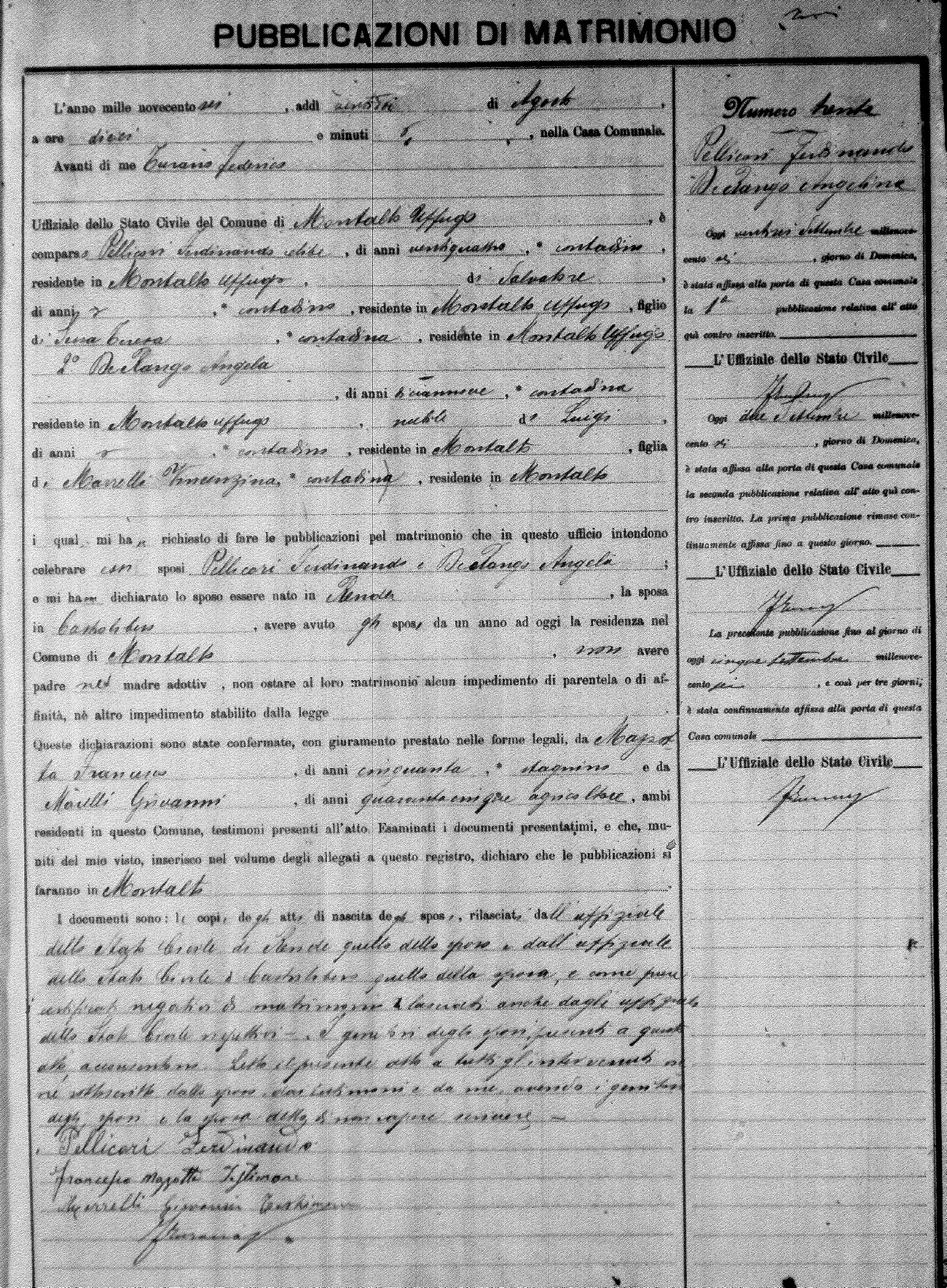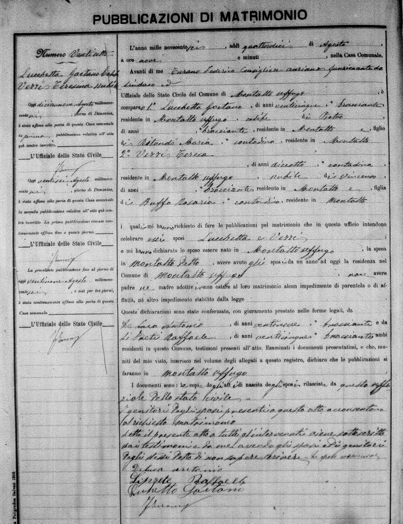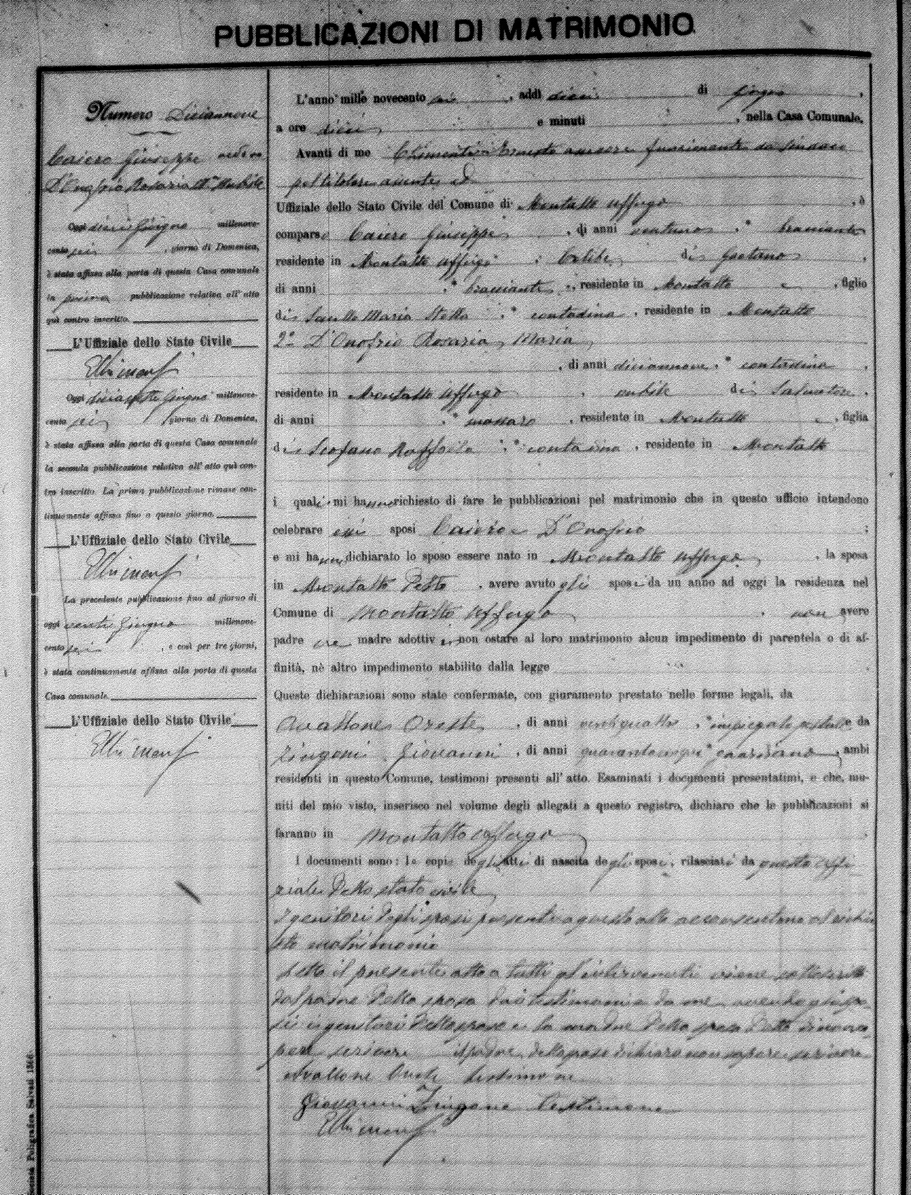Here are the extractions for the marriage banns in 1906 for Montalto Uffugo. Each extraction has a link to a copy of the original document on the groom's surname. Please note: (fu) indicates the the person was deceased at the time of the marriage bann. For a translation of the basic Pubblicazioni document, look here.