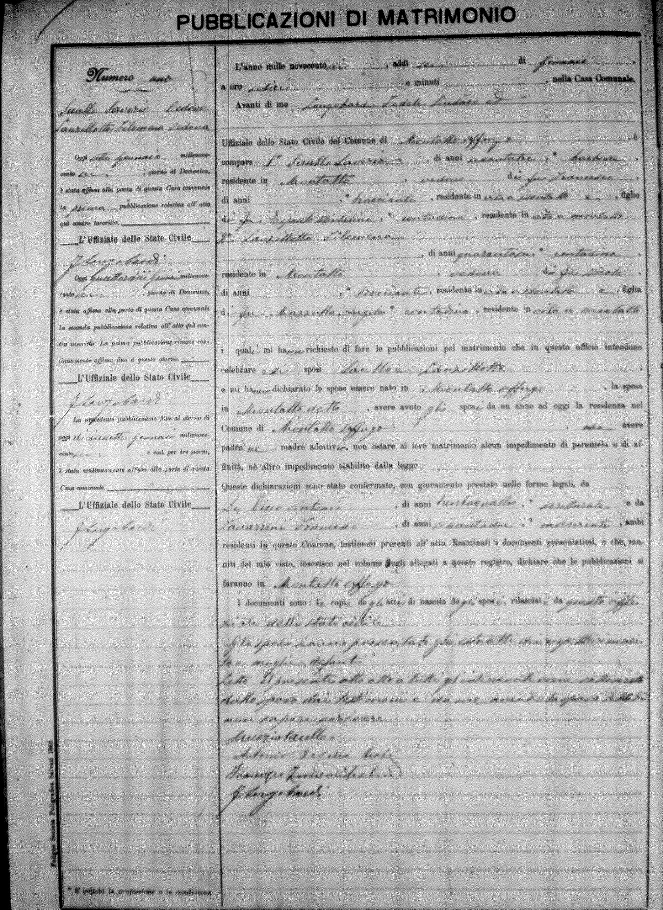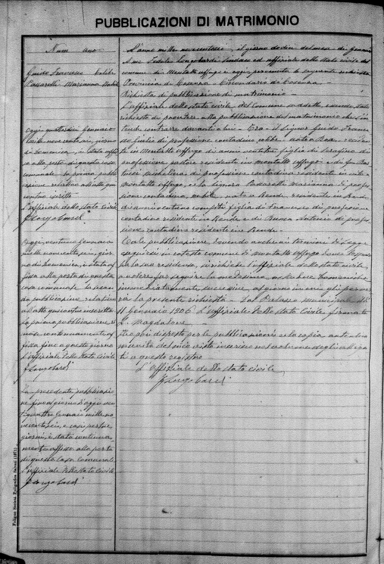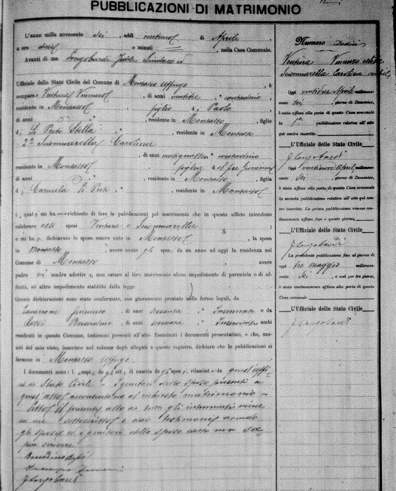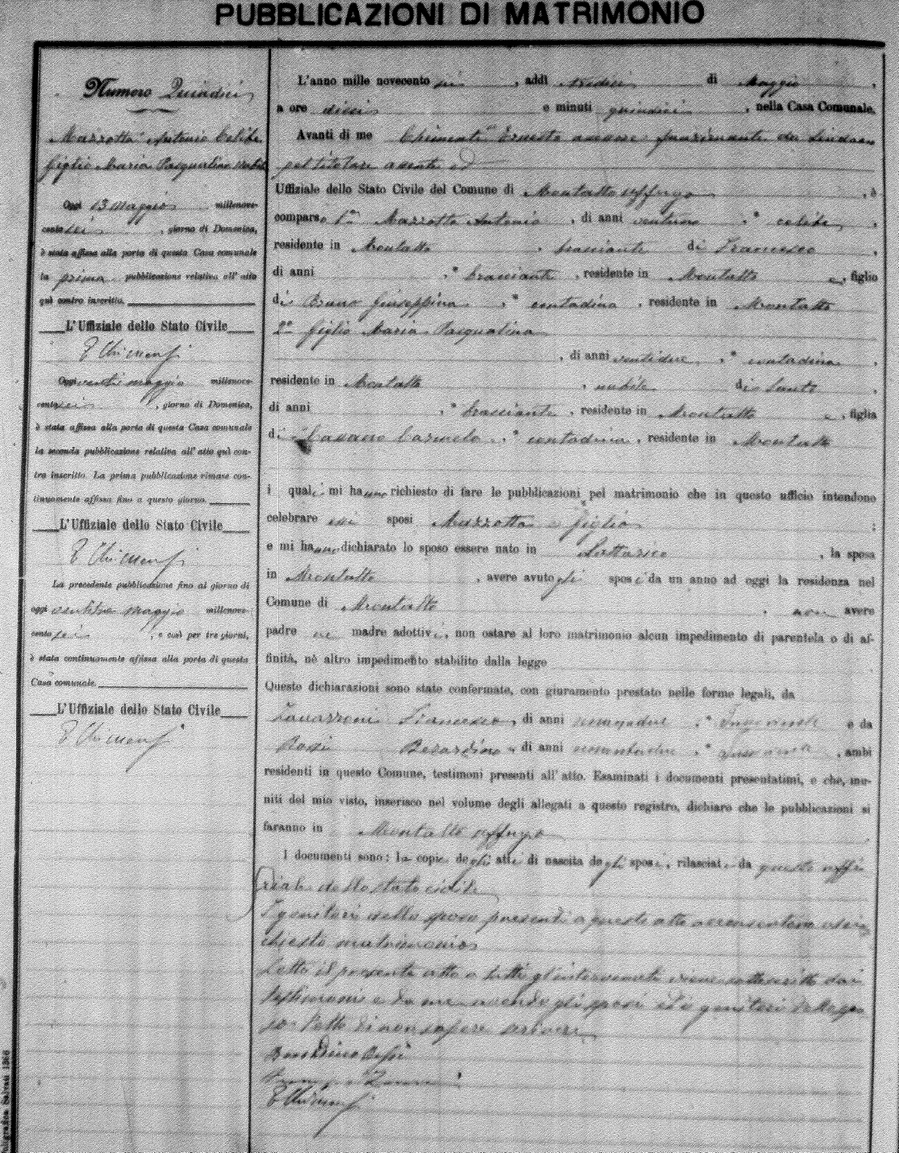 Here are the extractions for the marriage banns in 1906 for Montalto Uffugo. Each extraction has a link to a copy of the original document on the groom's surname. Please note: (fu) indicates the the person was deceased at the time of the marriage bann. For a translation of the basic Pubblicazioni document, look here.