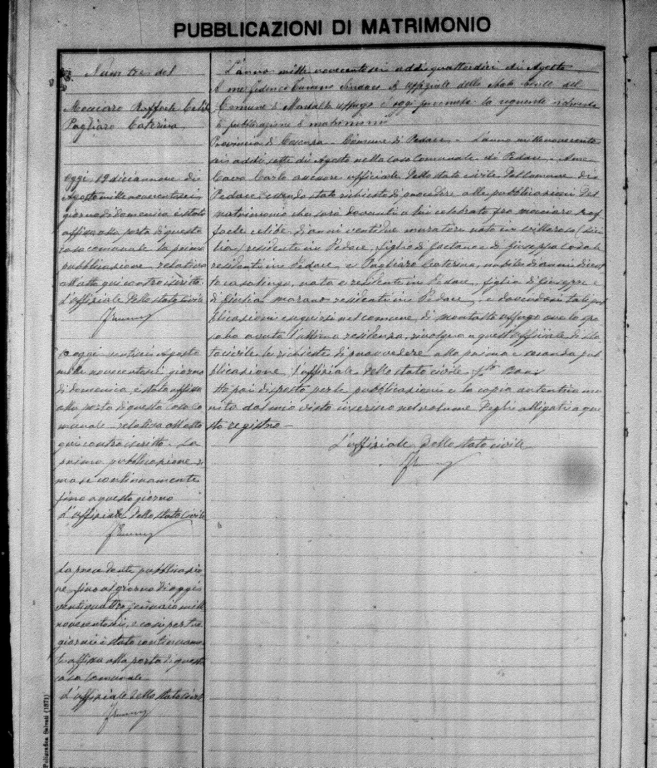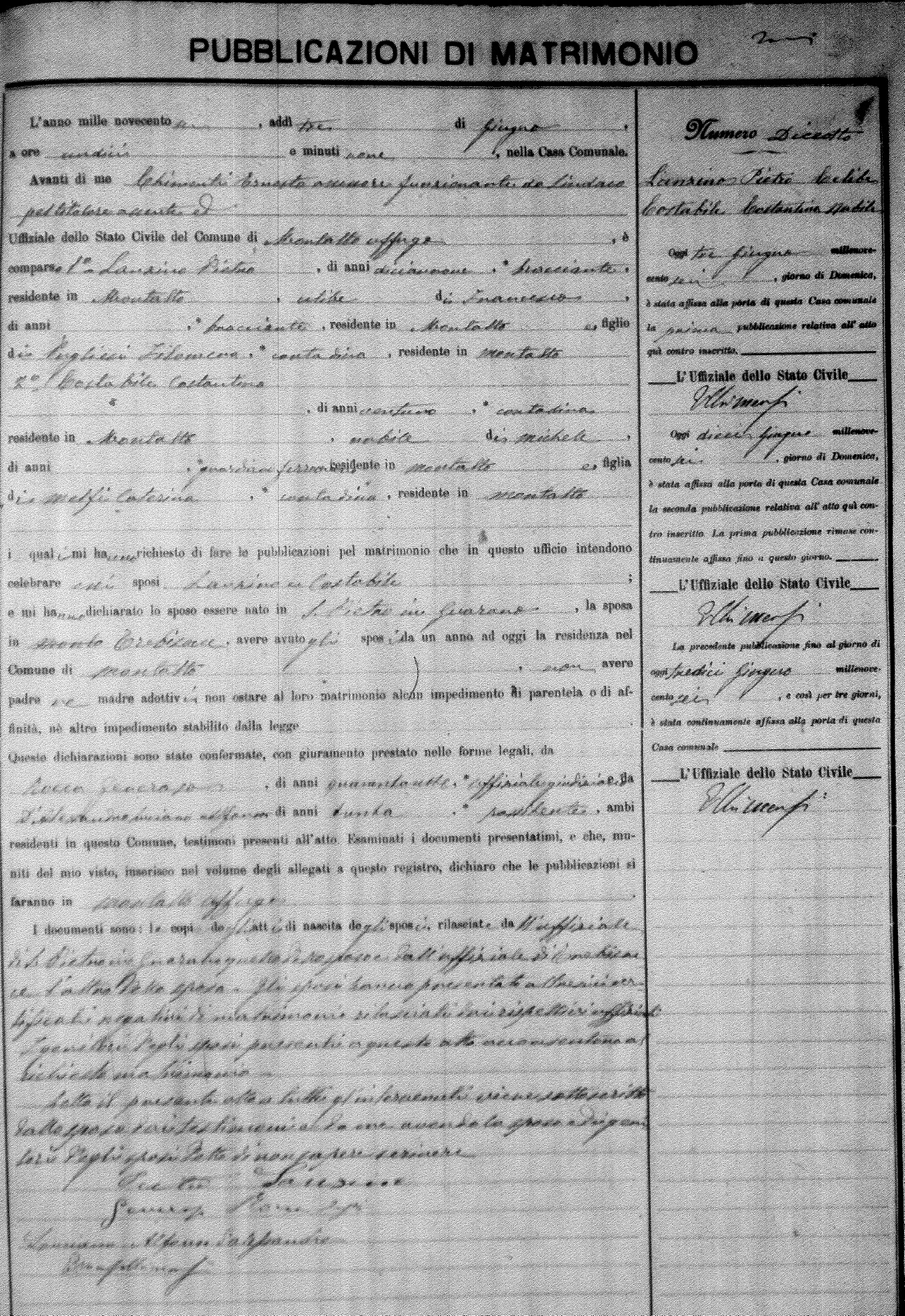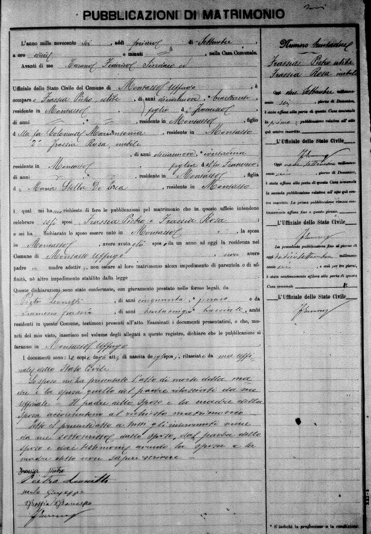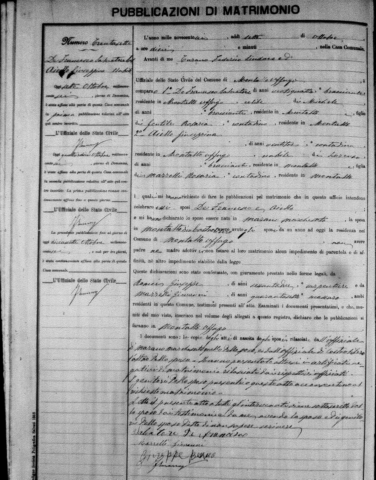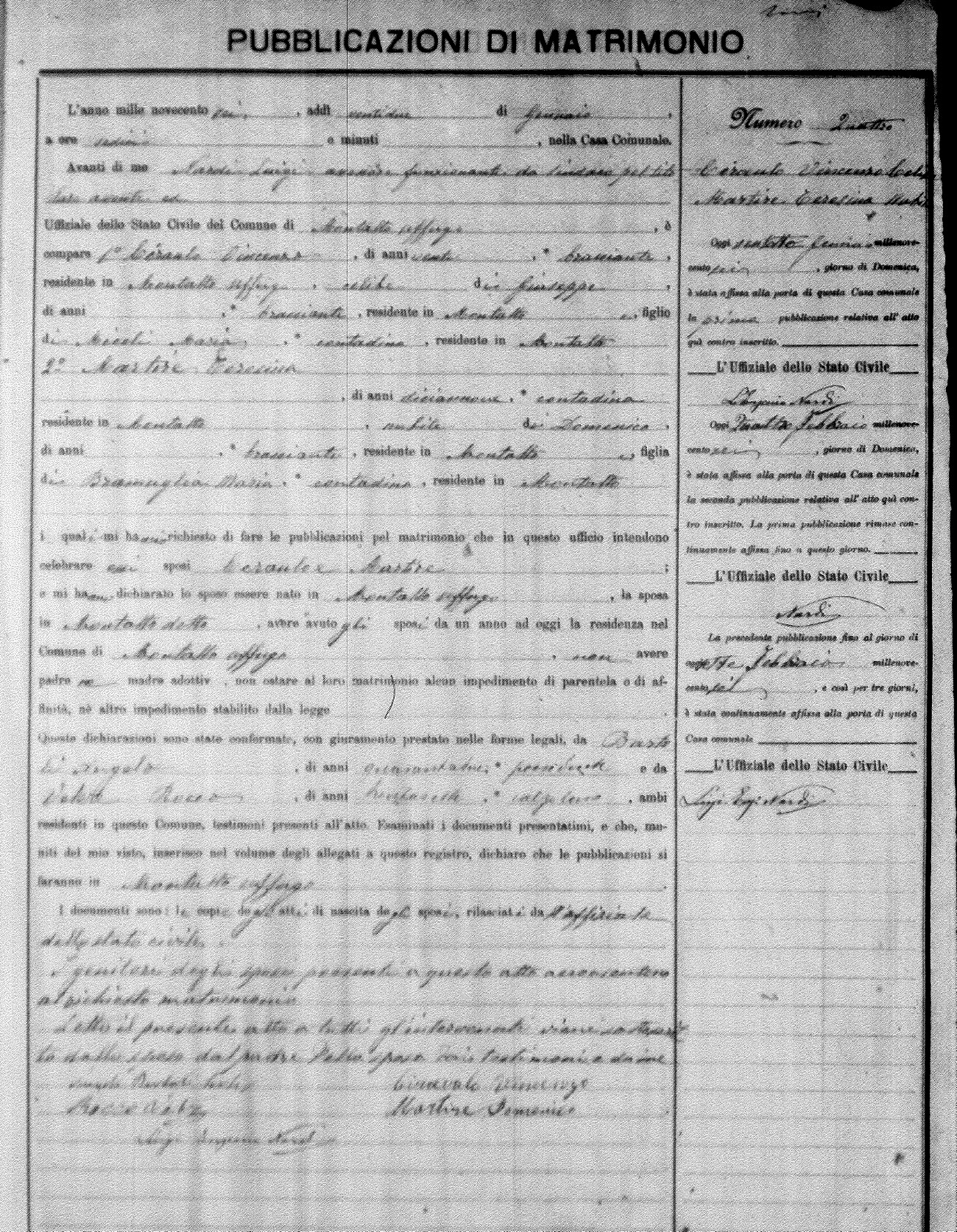 Here are the extractions for the marriage banns in 1906 for Montalto Uffugo. Each extraction has a link to a copy of the original document on the groom's surname. Please note: (fu) indicates the the person was deceased at the time of the marriage bann. For a translation of the basic Pubblicazioni document, look here.