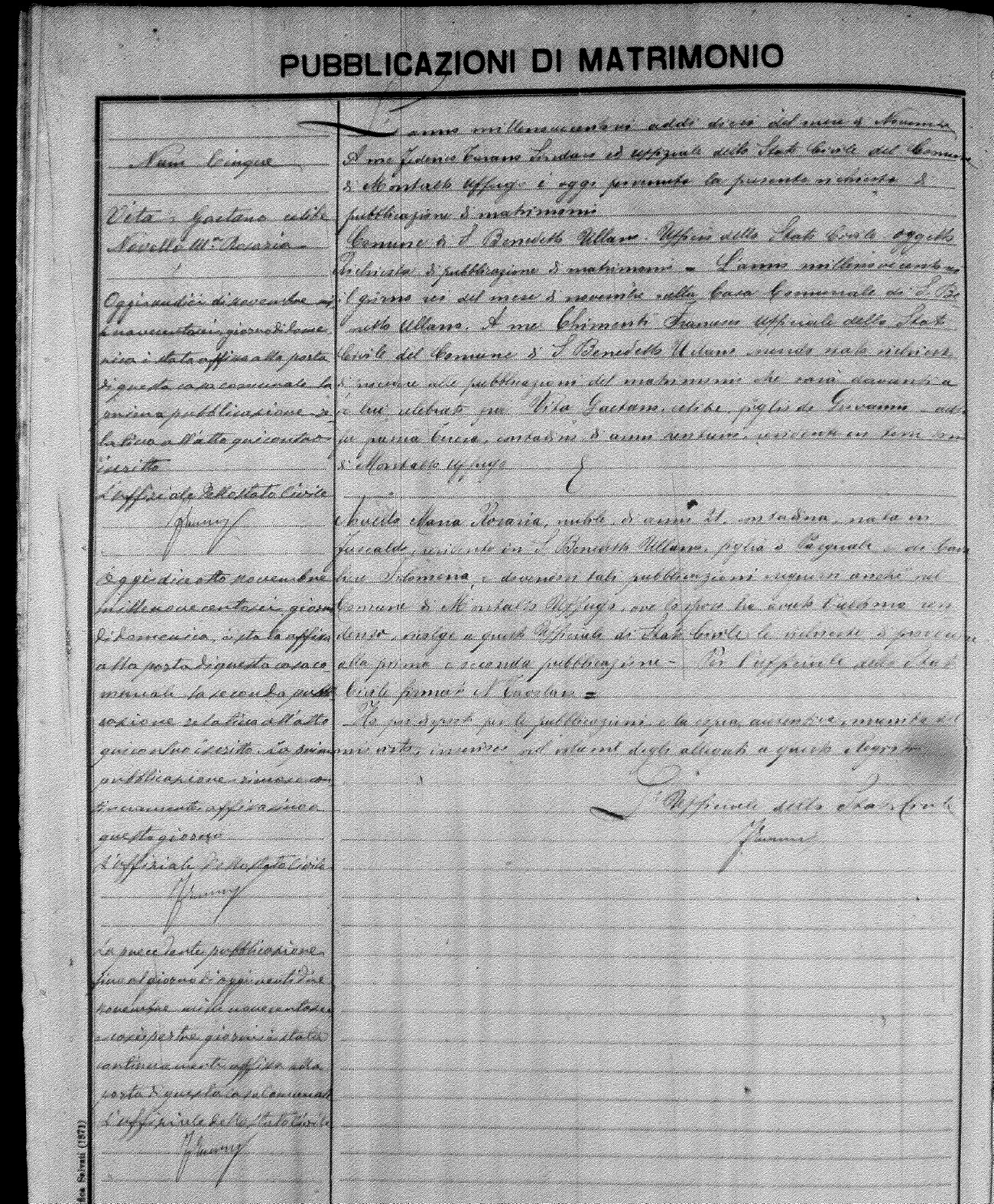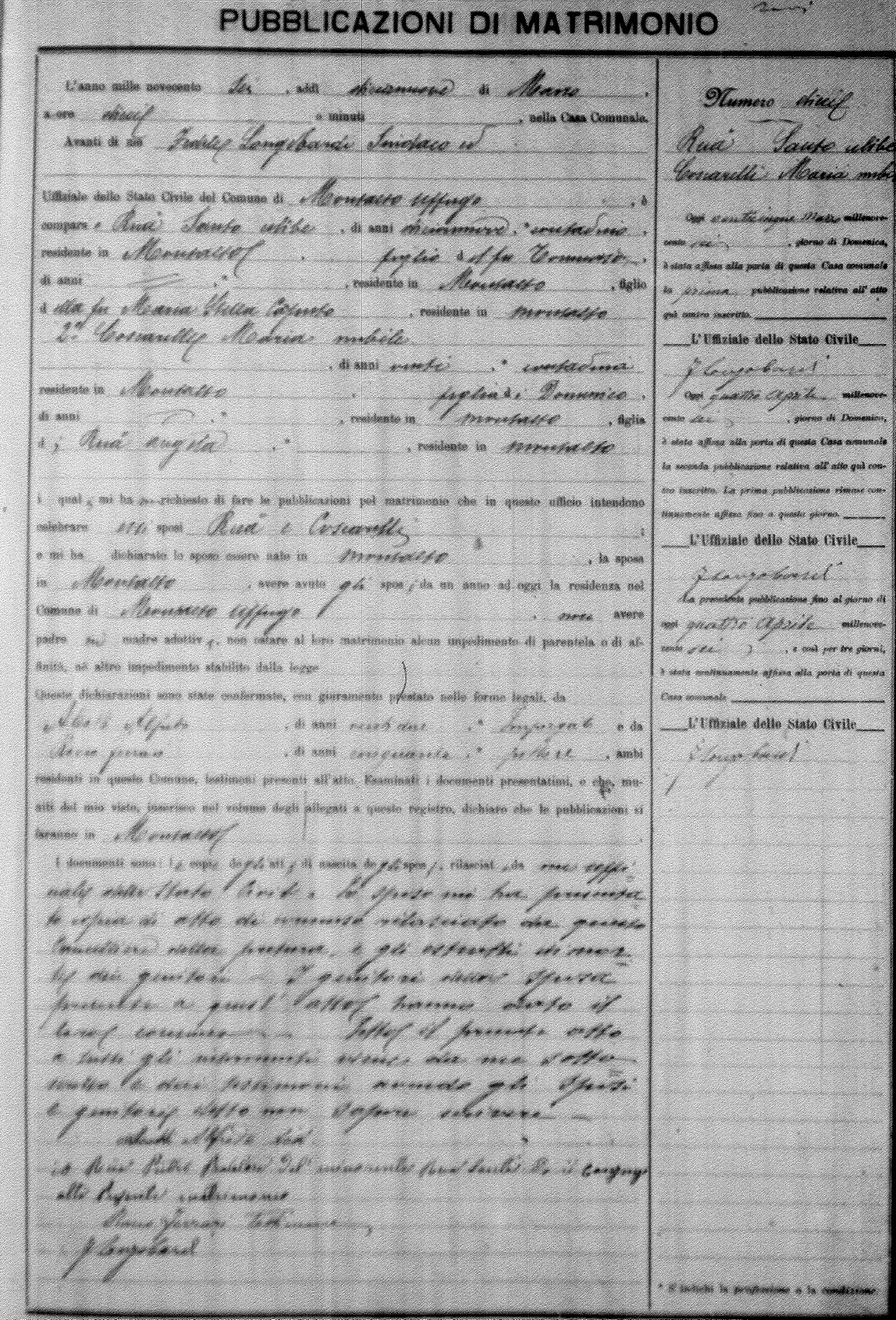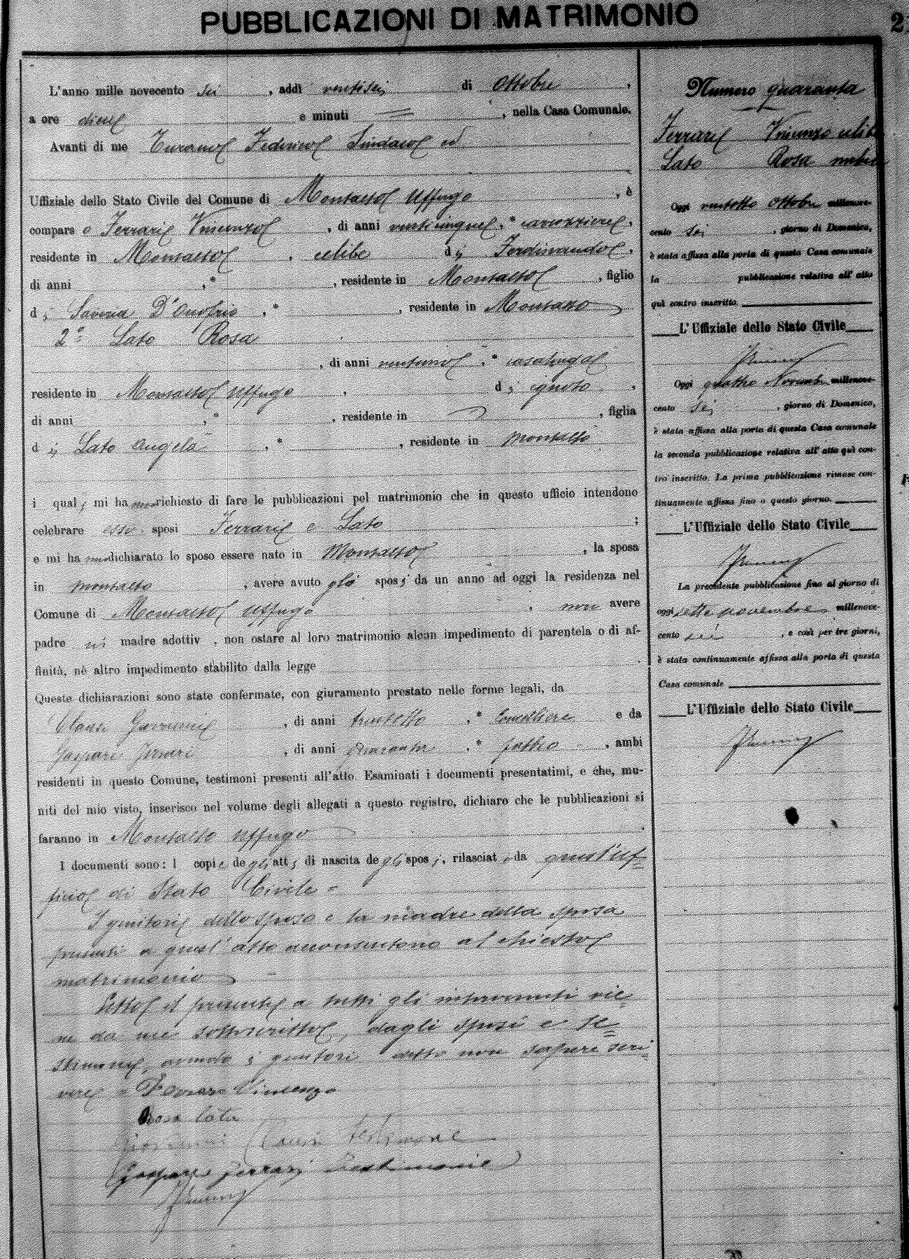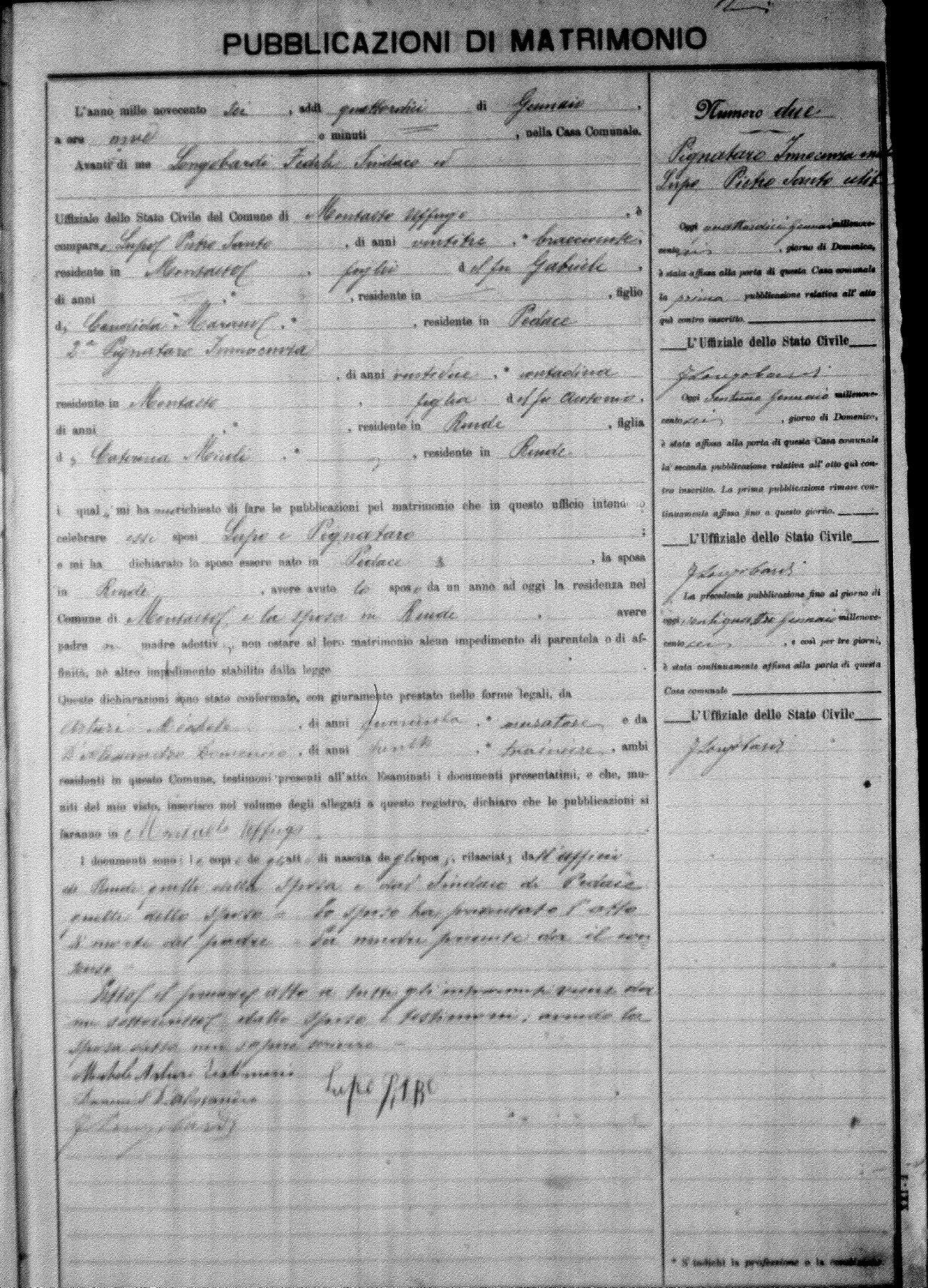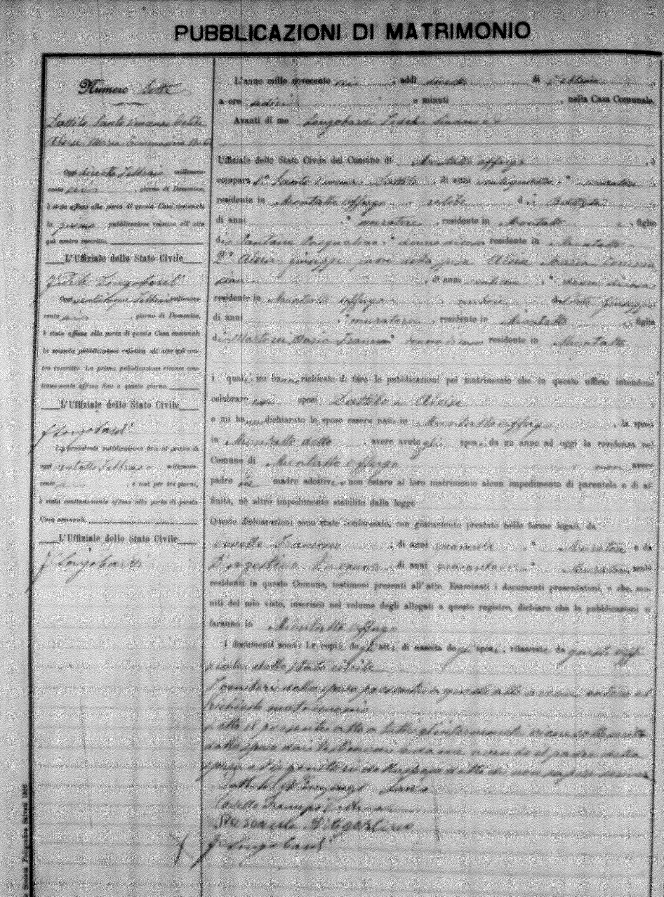 Here are the extractions for the marriage banns in 1906 for Montalto Uffugo. Each extraction has a link to a copy of the original document on the groom's surname. Please note: (fu) indicates the the person was deceased at the time of the marriage bann. For a translation of the basic Pubblicazioni document, look here.