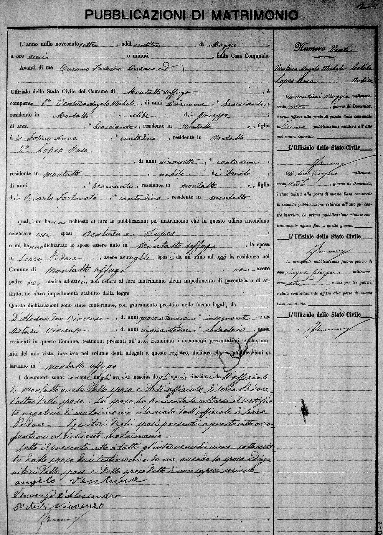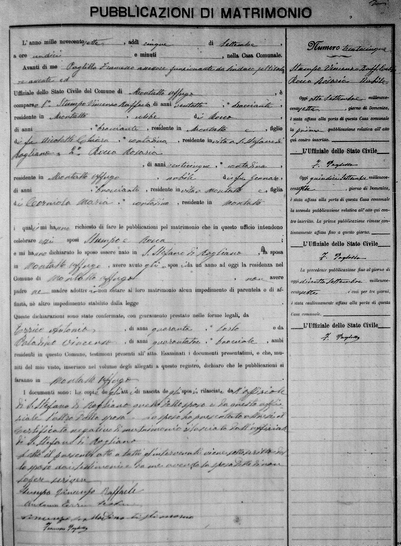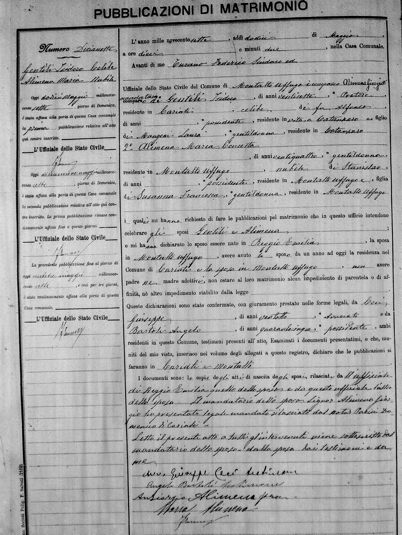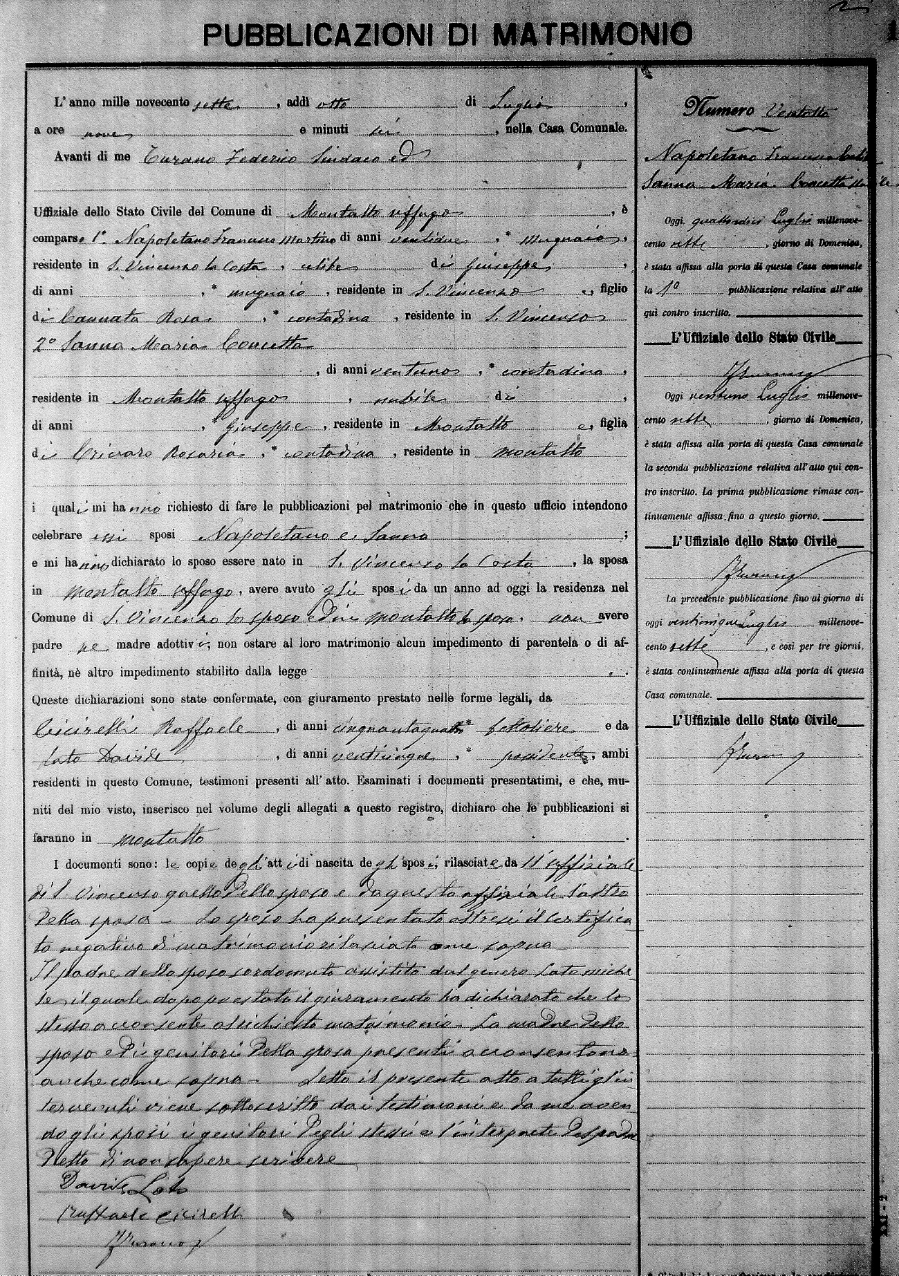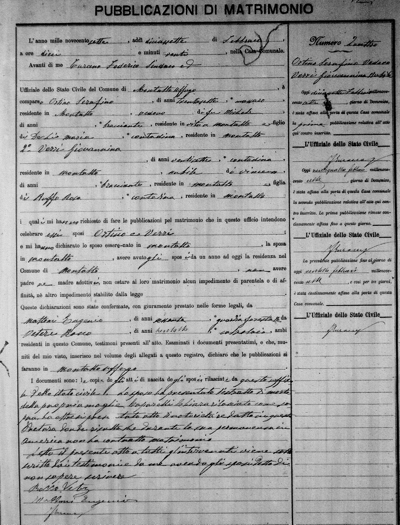 Here are the extractions for the marriage banns in 1907 for Montalto Uffugo. Each extraction has a link to a copy of the original document on the groom's surname. Please note: (fu) indicates the the person was deceased at the time of the marriage bann. For a translation of the basic Pubblicazioni document, look here.
