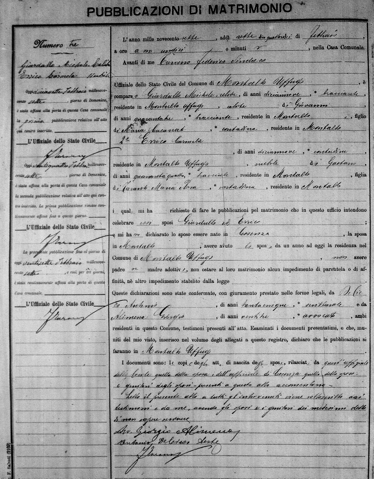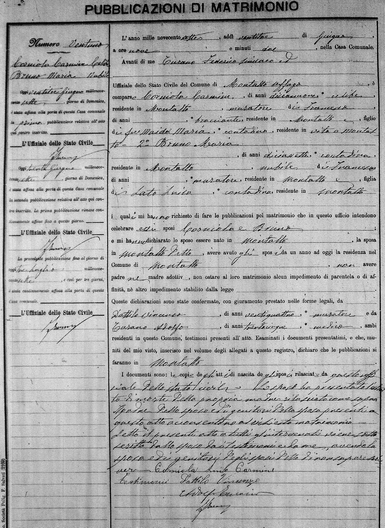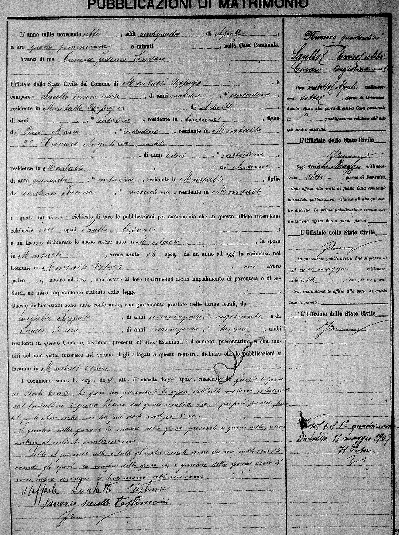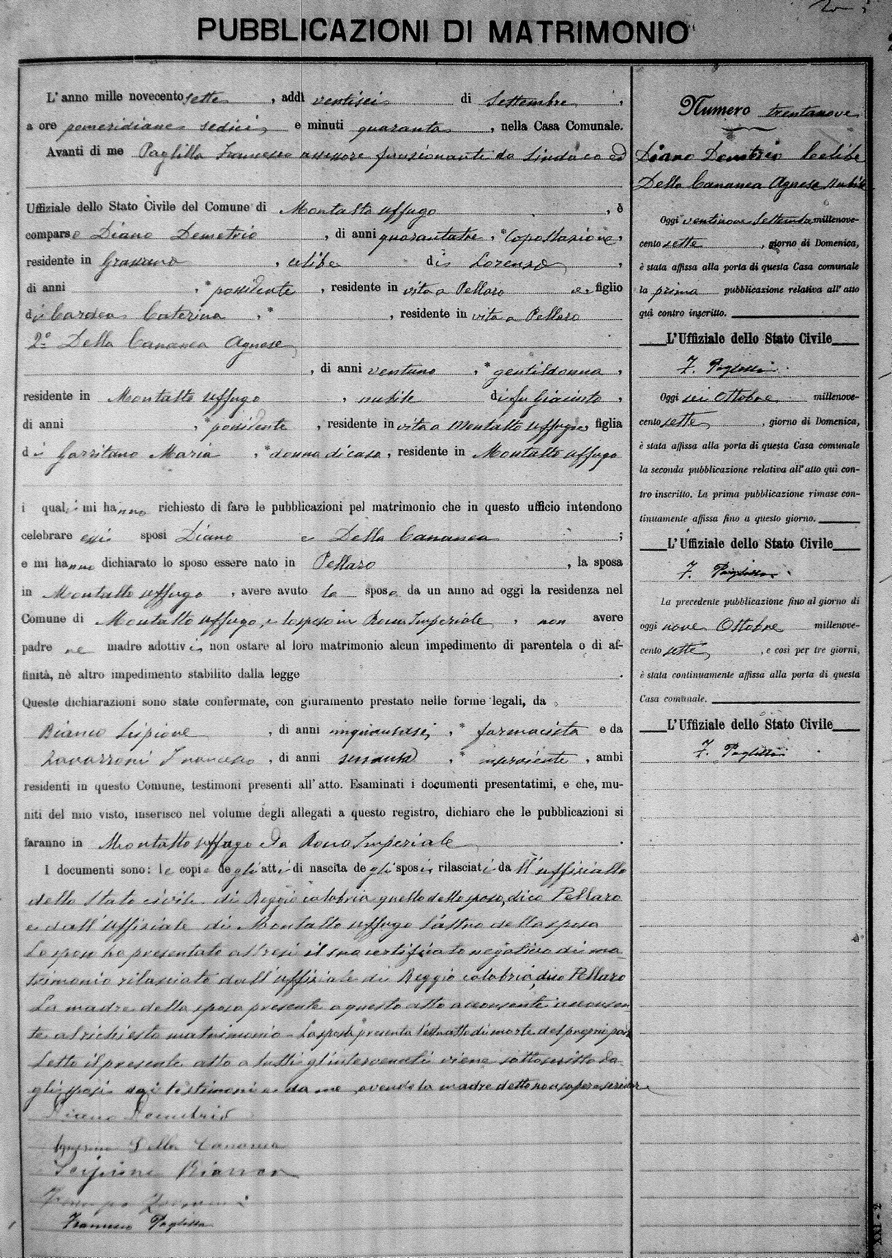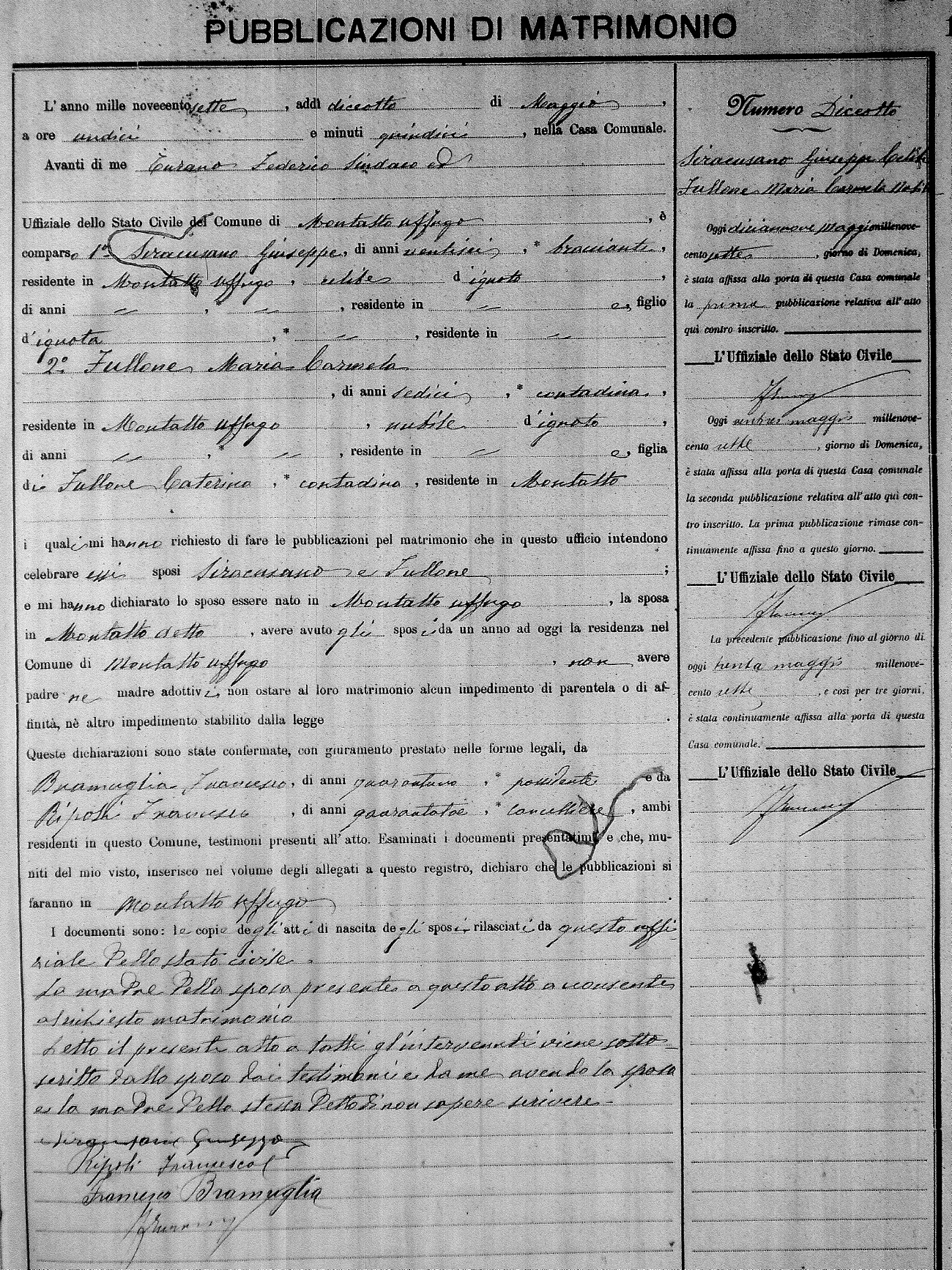 Here are the extractions for the marriage banns in 1907 for Montalto Uffugo. Each extraction has a link to a copy of the original document on the groom's surname. Please note: (fu) indicates the the person was deceased at the time of the marriage bann. For a translation of the basic Pubblicazioni document, look here.