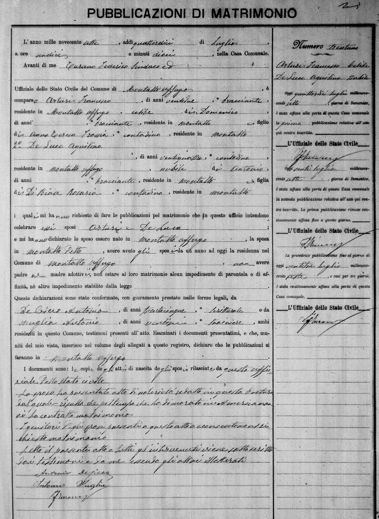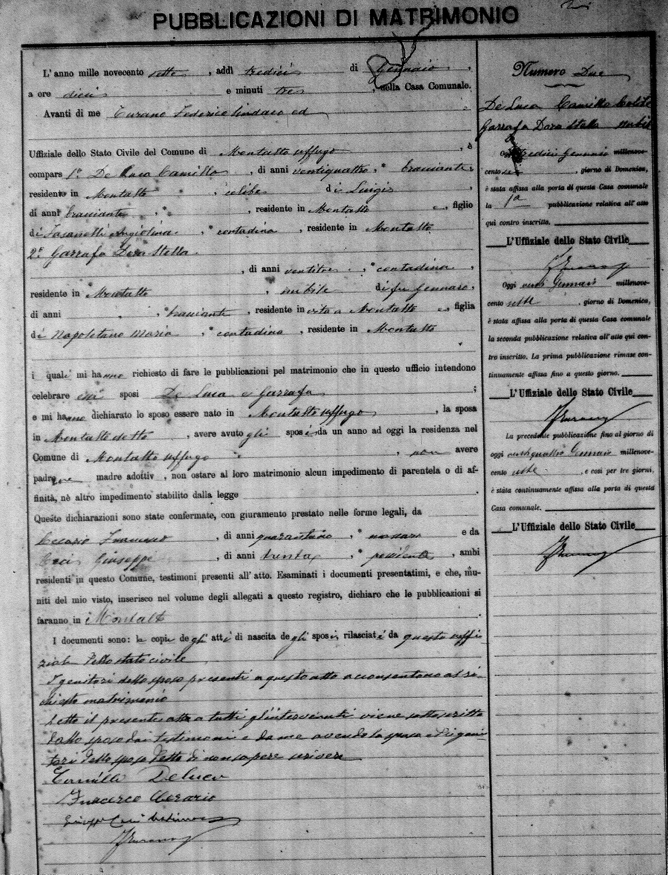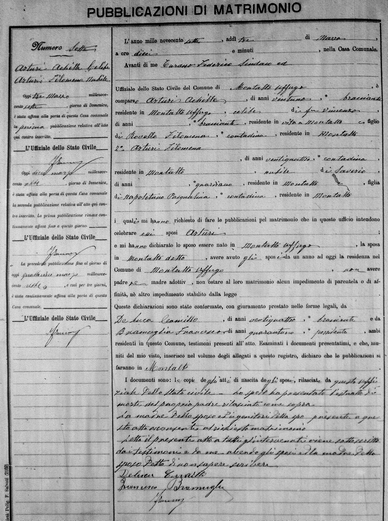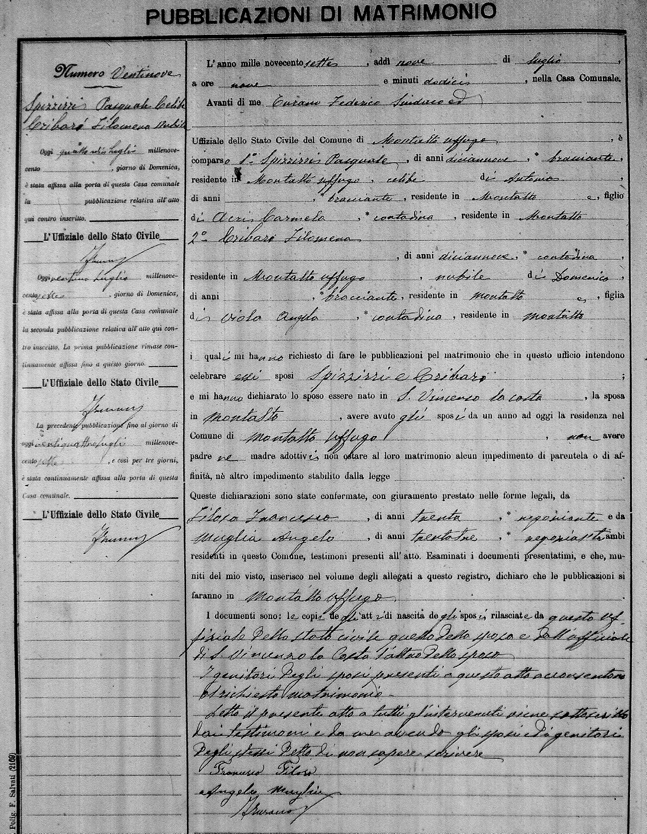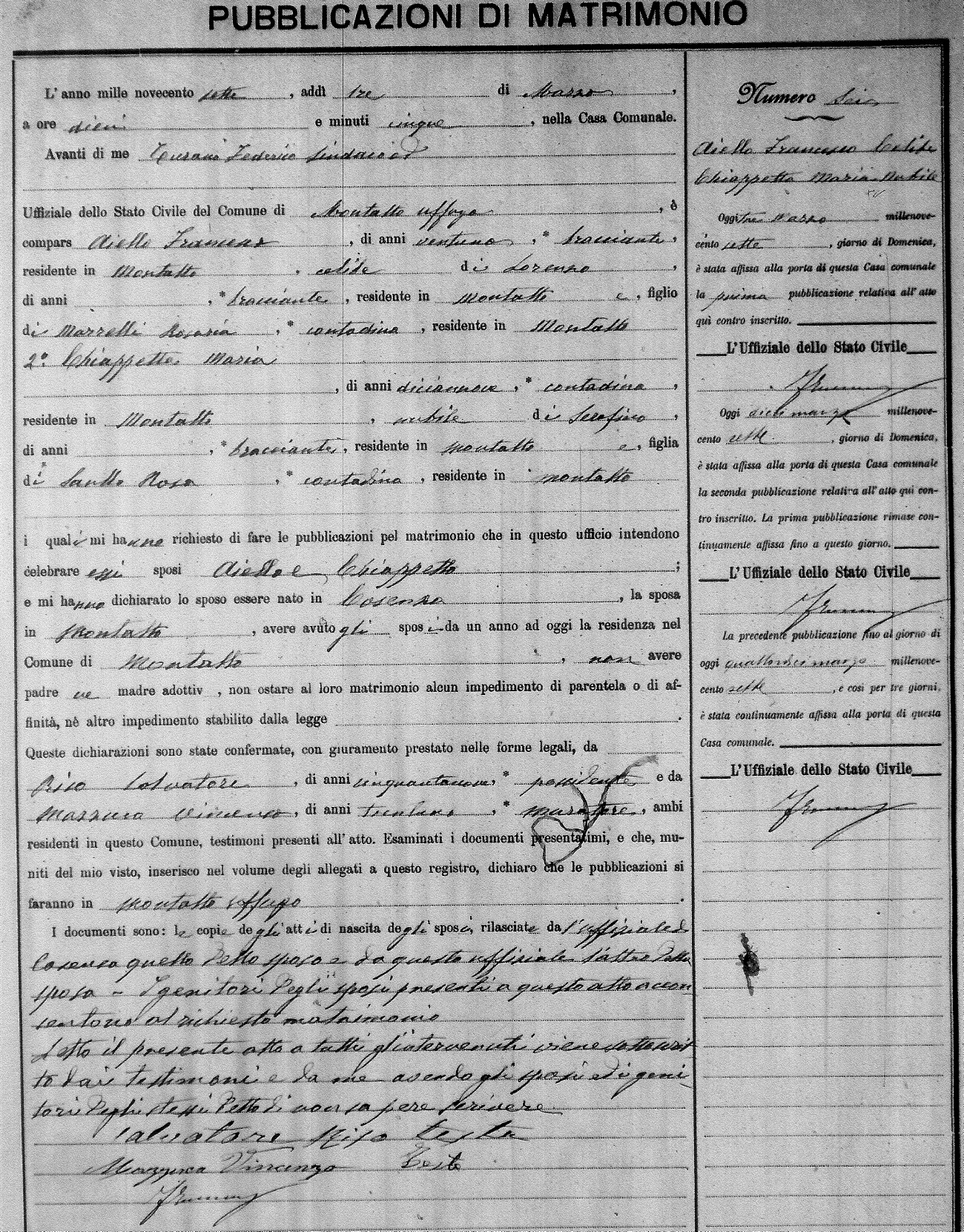 Here are the extractions for the marriage banns in 1907 for Montalto Uffugo. Each extraction has a link to a copy of the original document on the groom's surname. Please note: (fu) indicates the the person was deceased at the time of the marriage bann. For a translation of the basic Pubblicazioni document, look here.