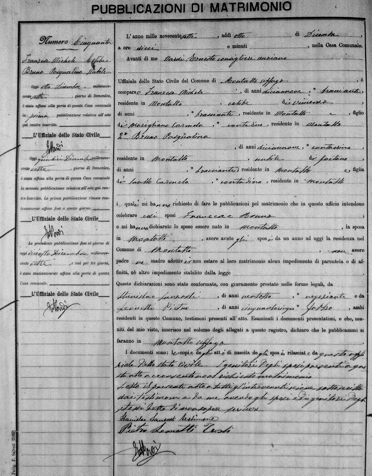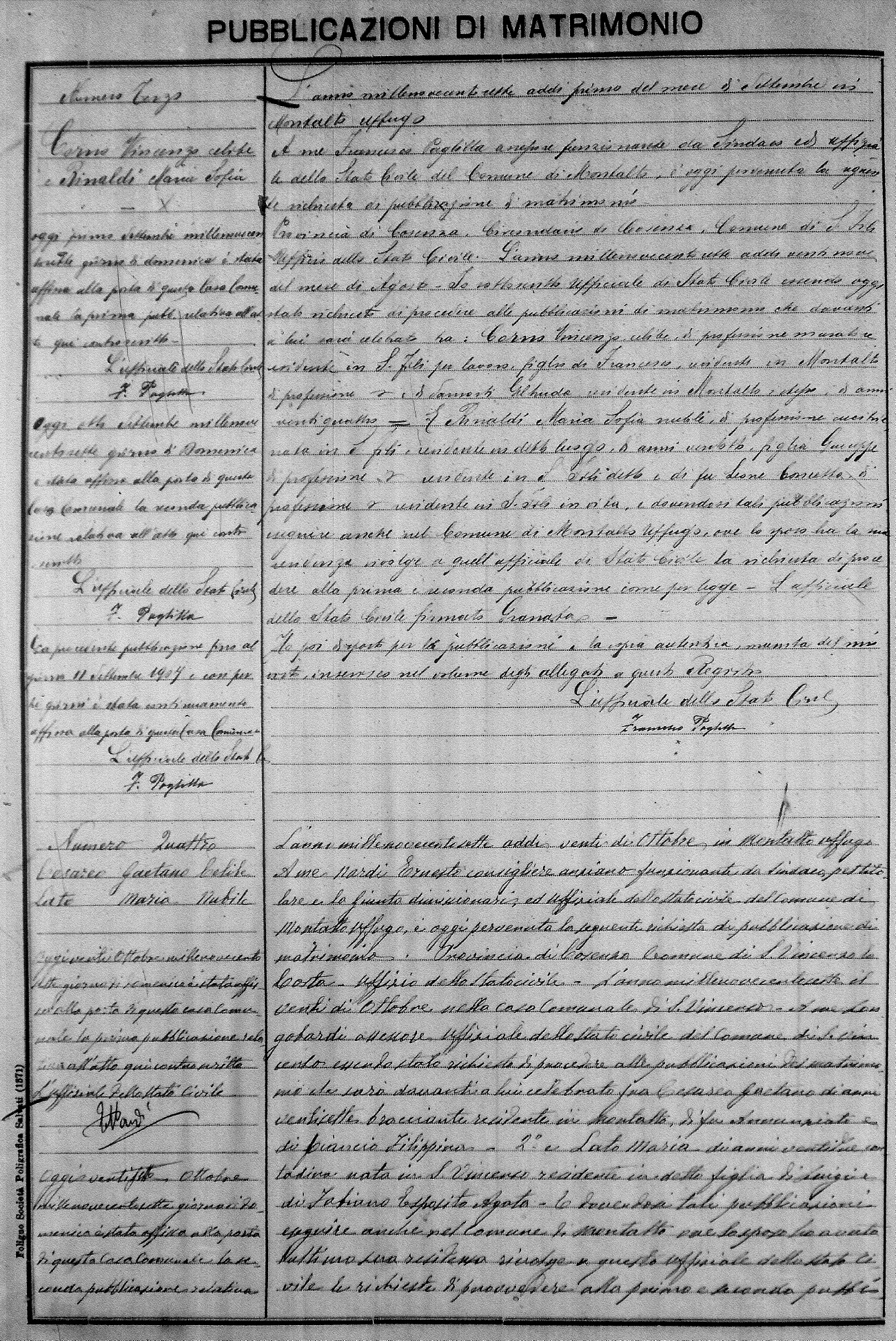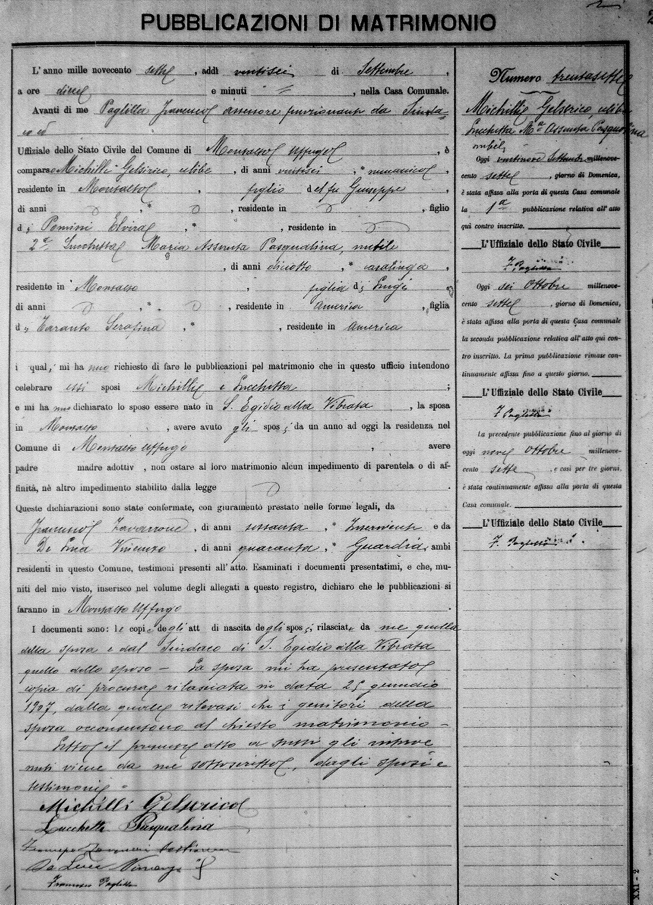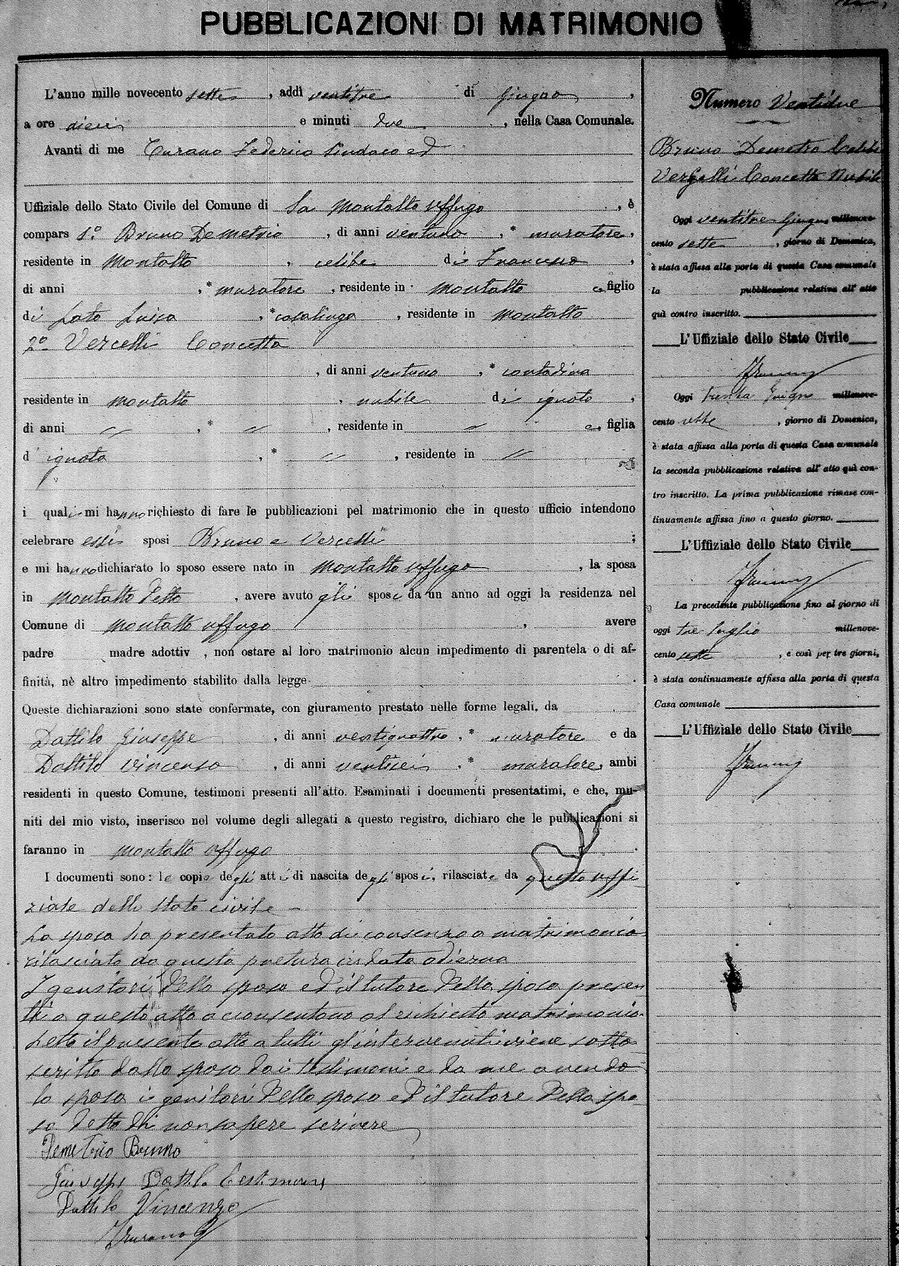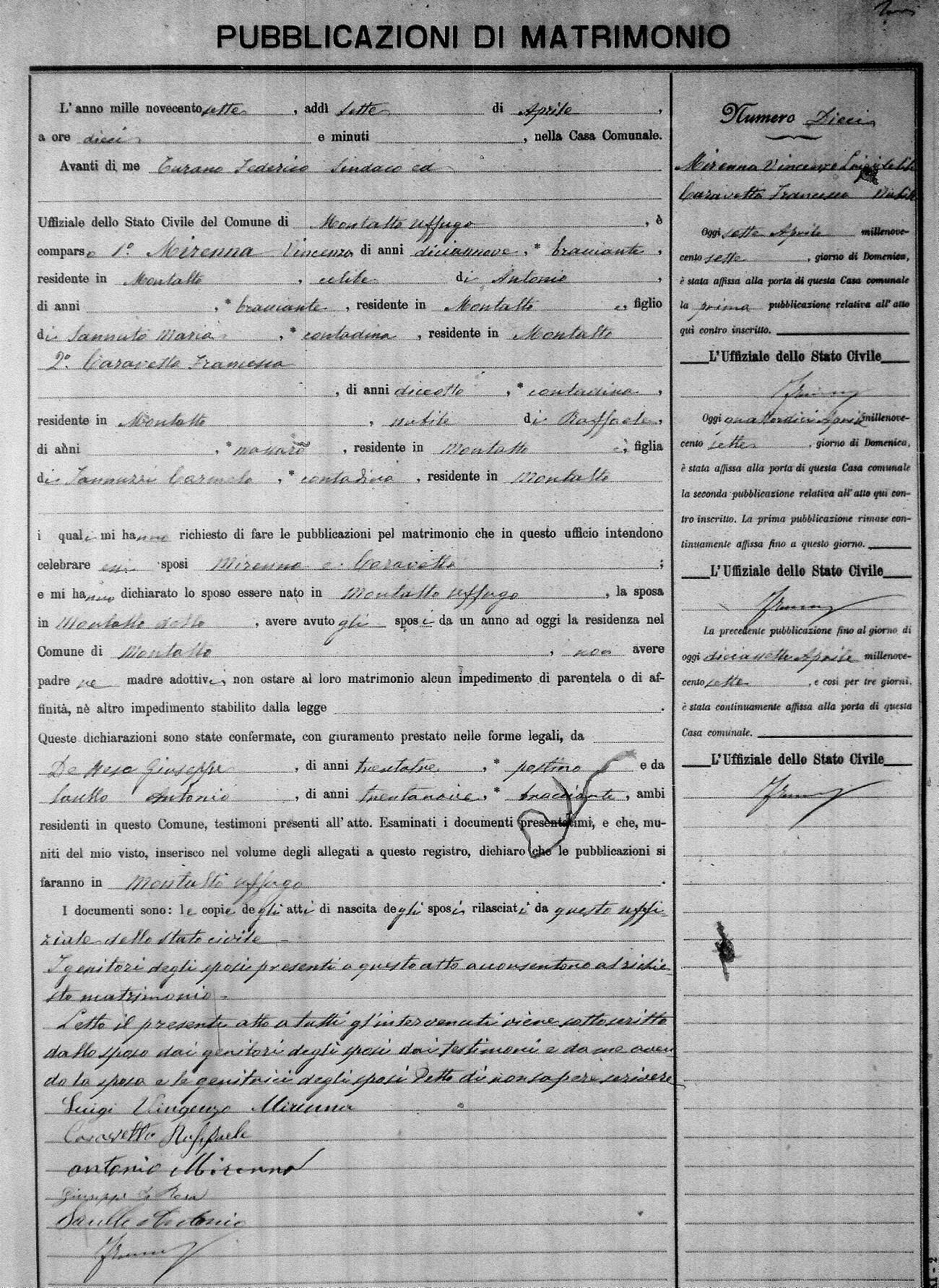 Here are the extractions for the marriage banns in 1907 for Montalto Uffugo. Each extraction has a link to a copy of the original document on the groom's surname. Please note: (fu) indicates the the person was deceased at the time of the marriage bann. For a translation of the basic Pubblicazioni document, look here.