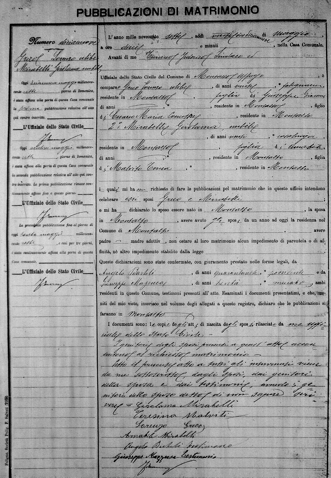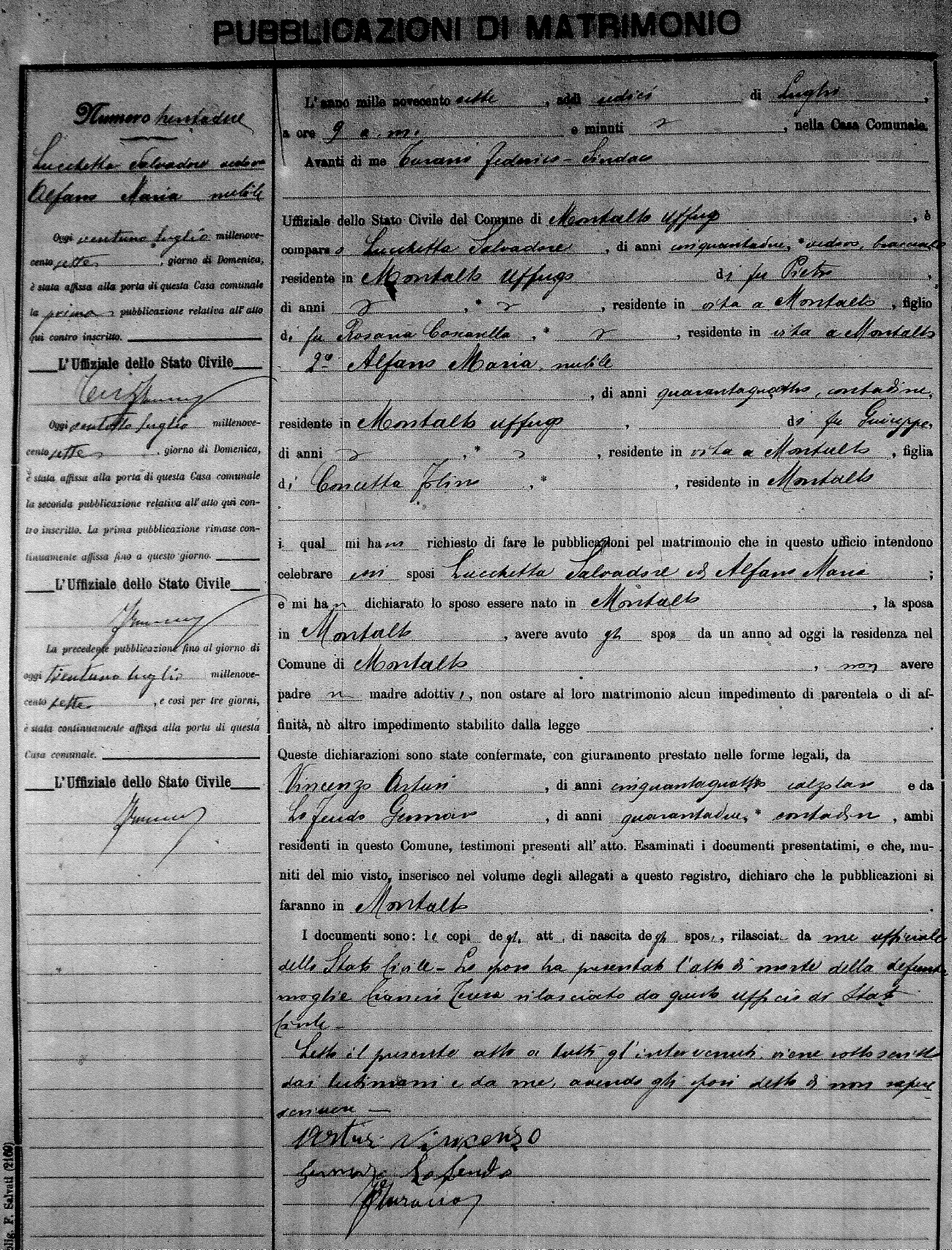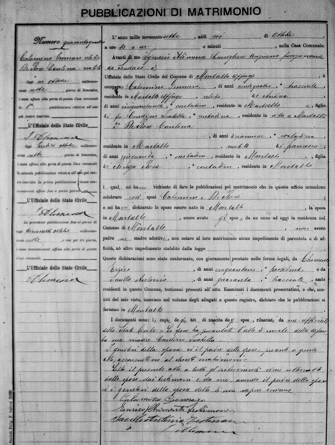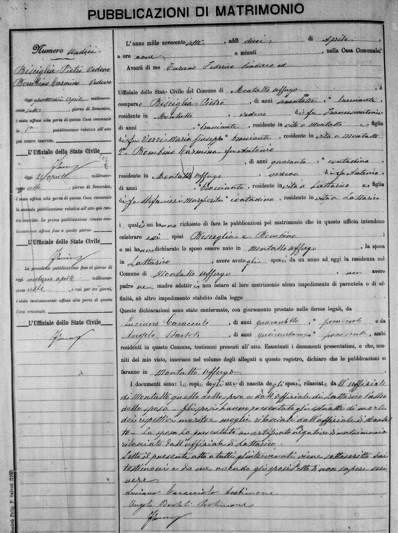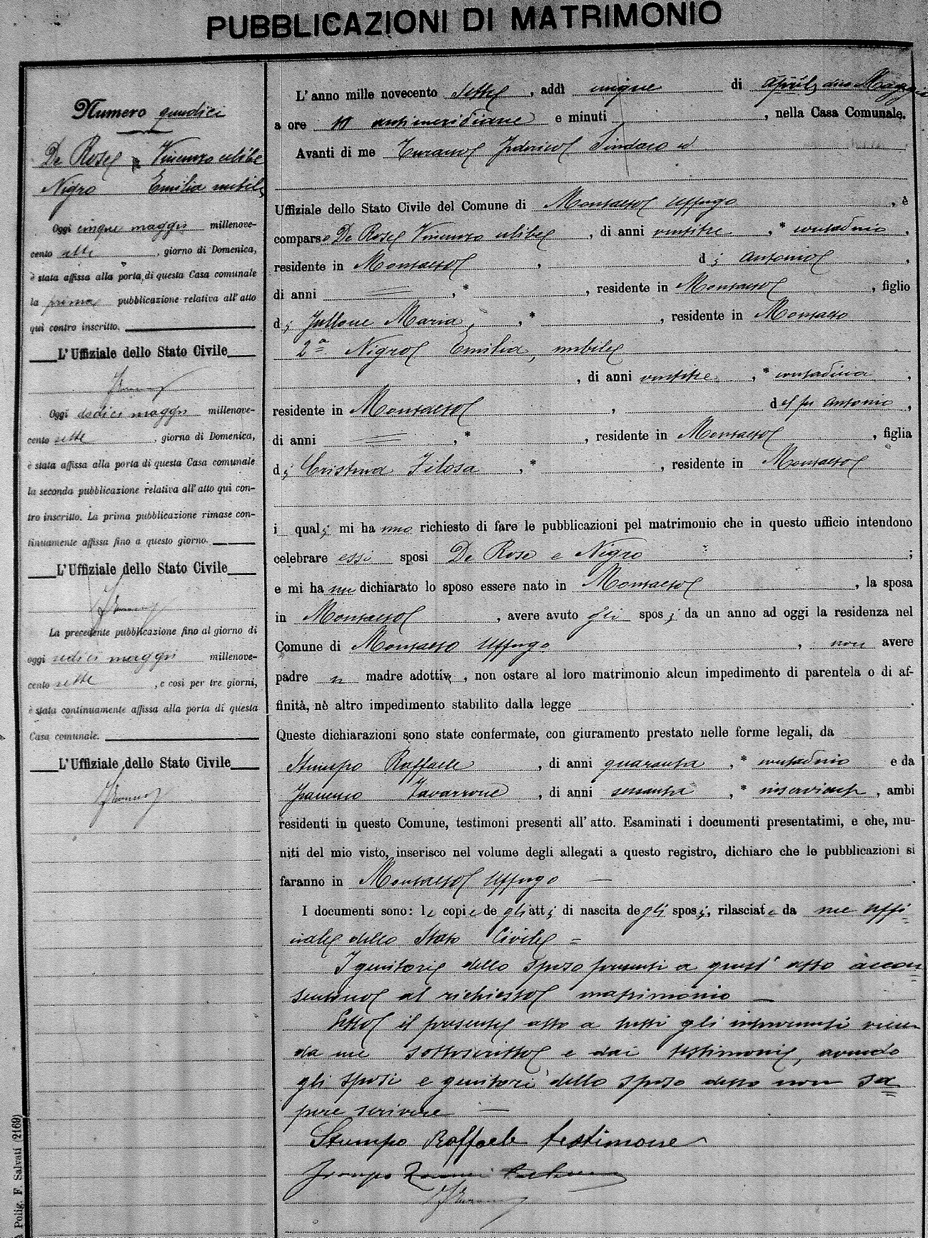 Here are the extractions for the marriage banns in 1907 for Montalto Uffugo. Each extraction has a link to a copy of the original document on the groom's surname. Please note: (fu) indicates the the person was deceased at the time of the marriage bann. For a translation of the basic Pubblicazioni document, look here.