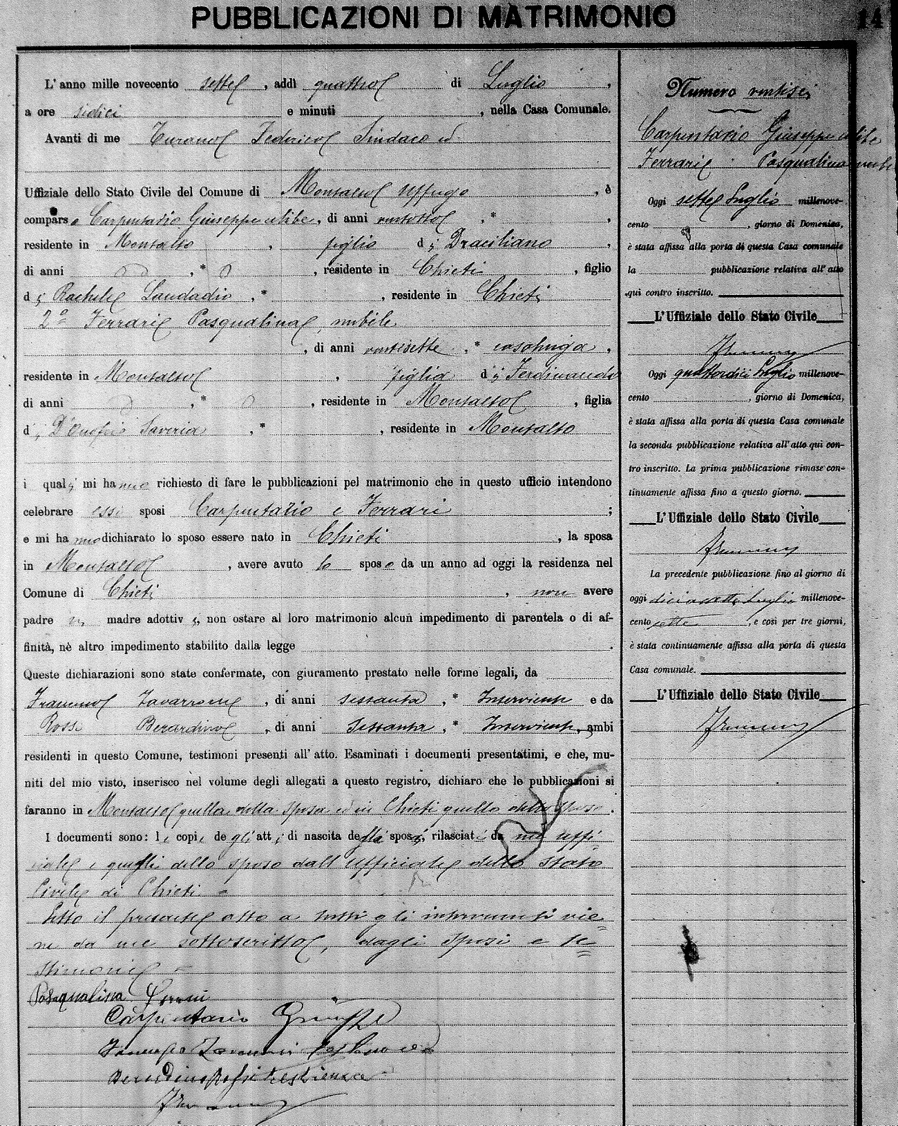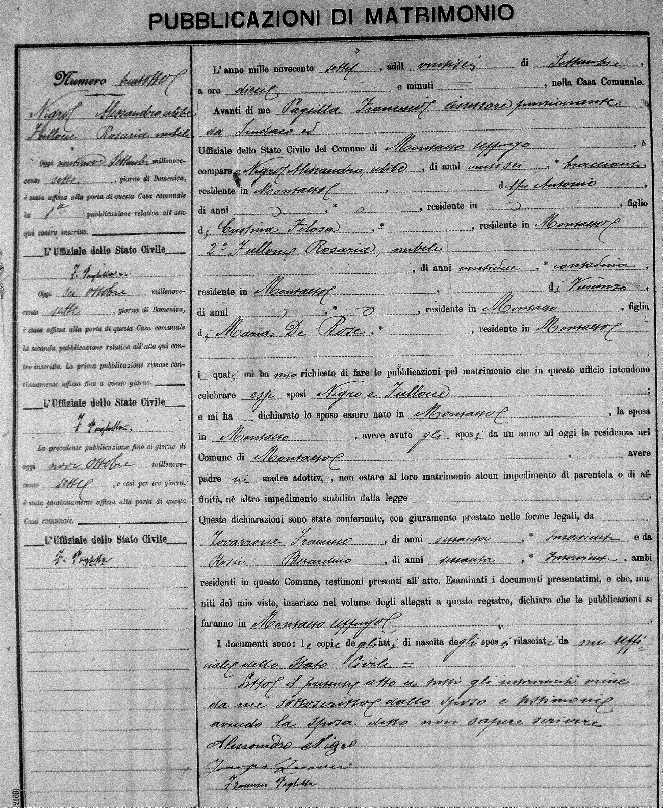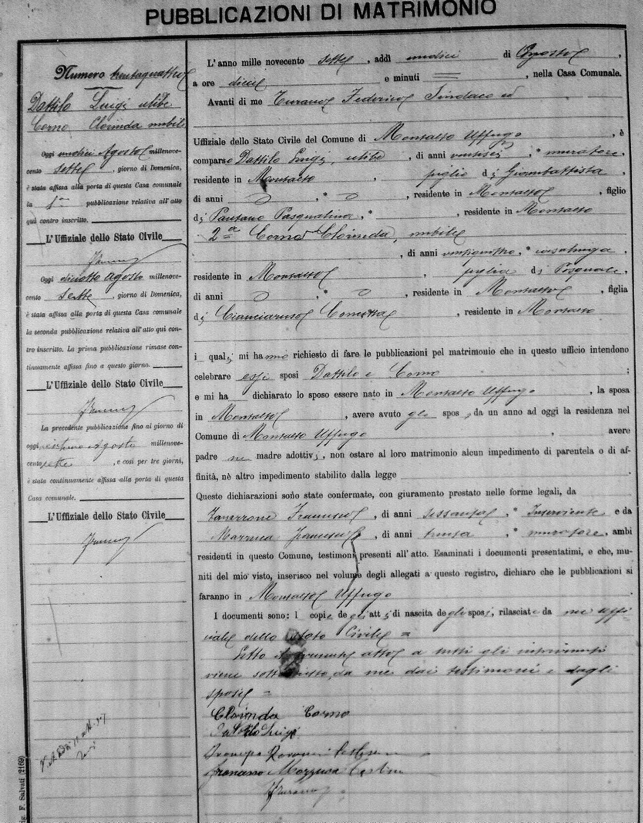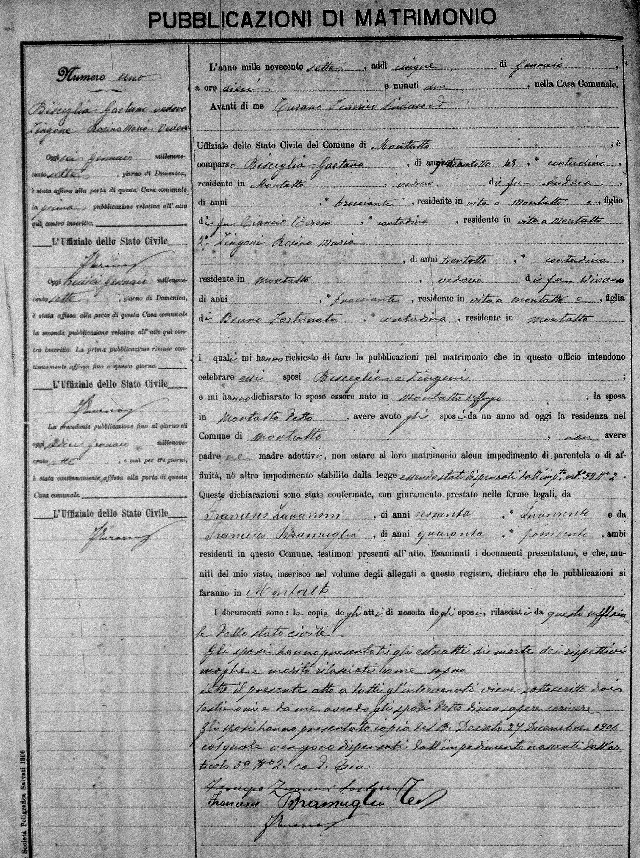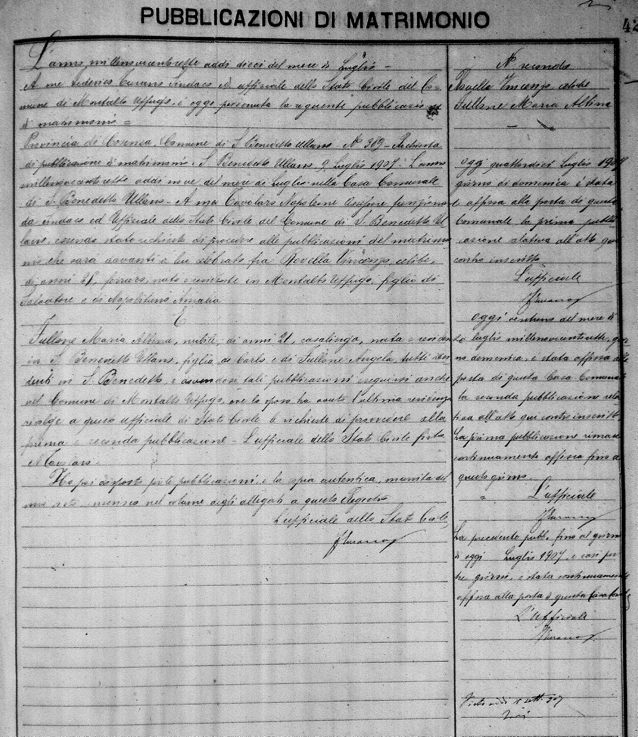 Here are the extractions for the marriage banns in 1907 for Montalto Uffugo. Each extraction has a link to a copy of the original document on the groom's surname. Please note: (fu) indicates the the person was deceased at the time of the marriage bann. For a translation of the basic Pubblicazioni document, look here.