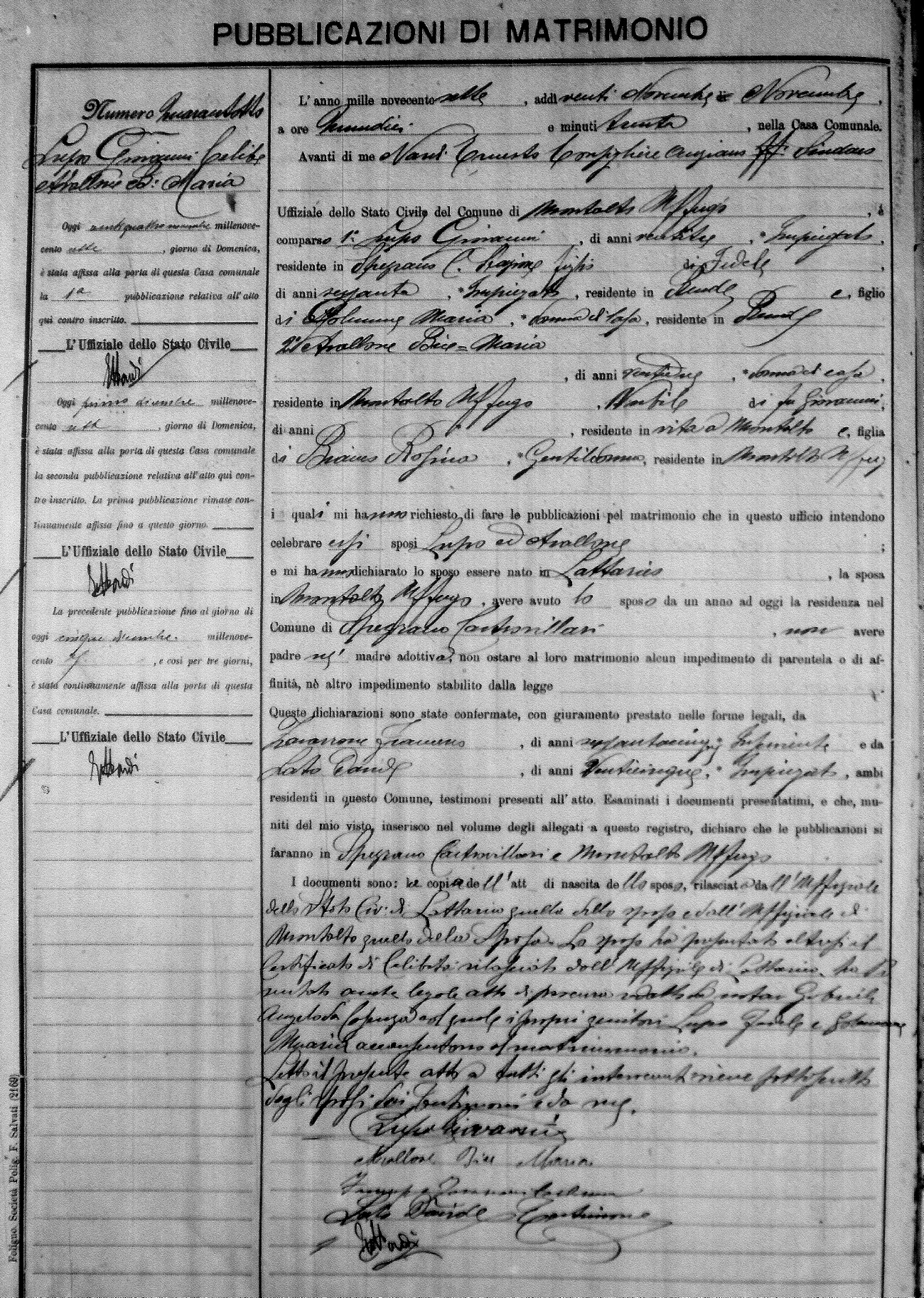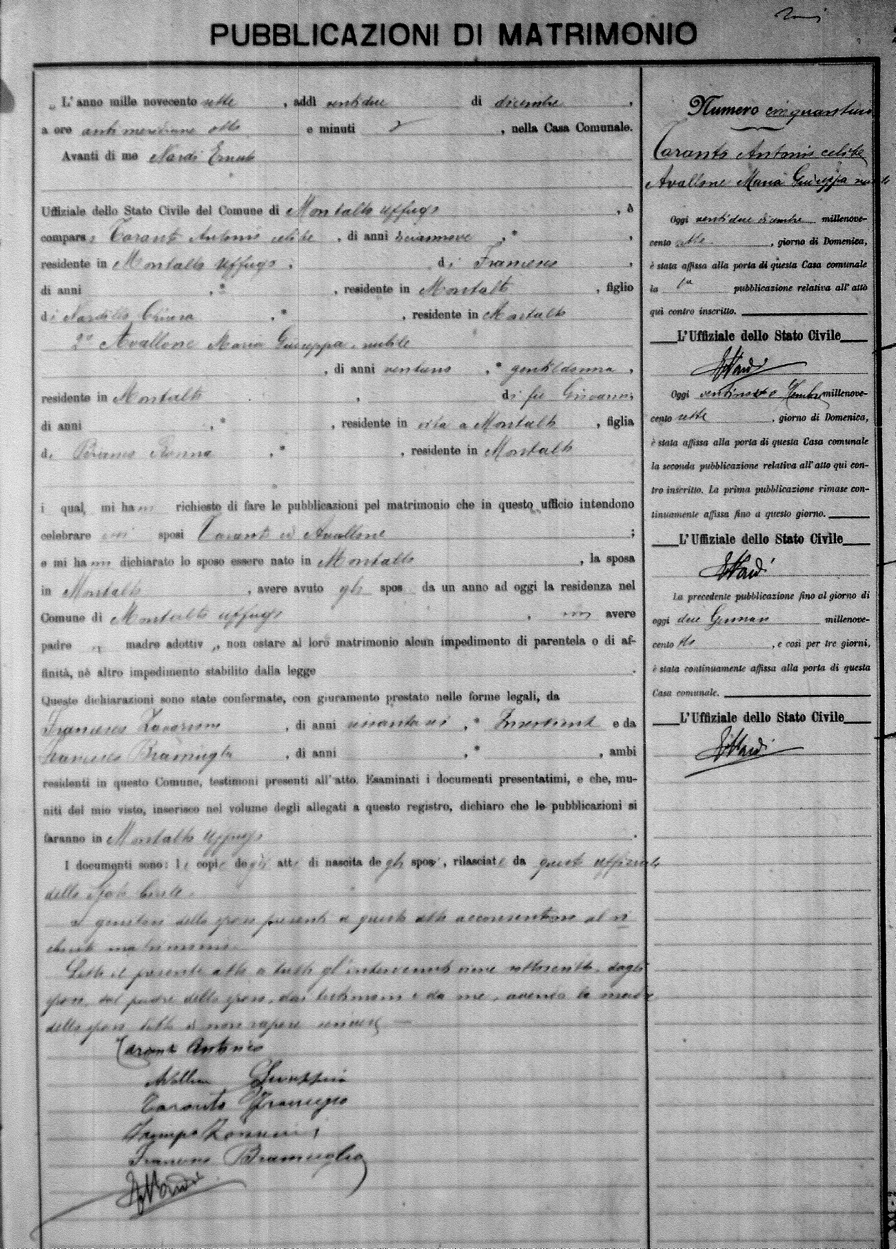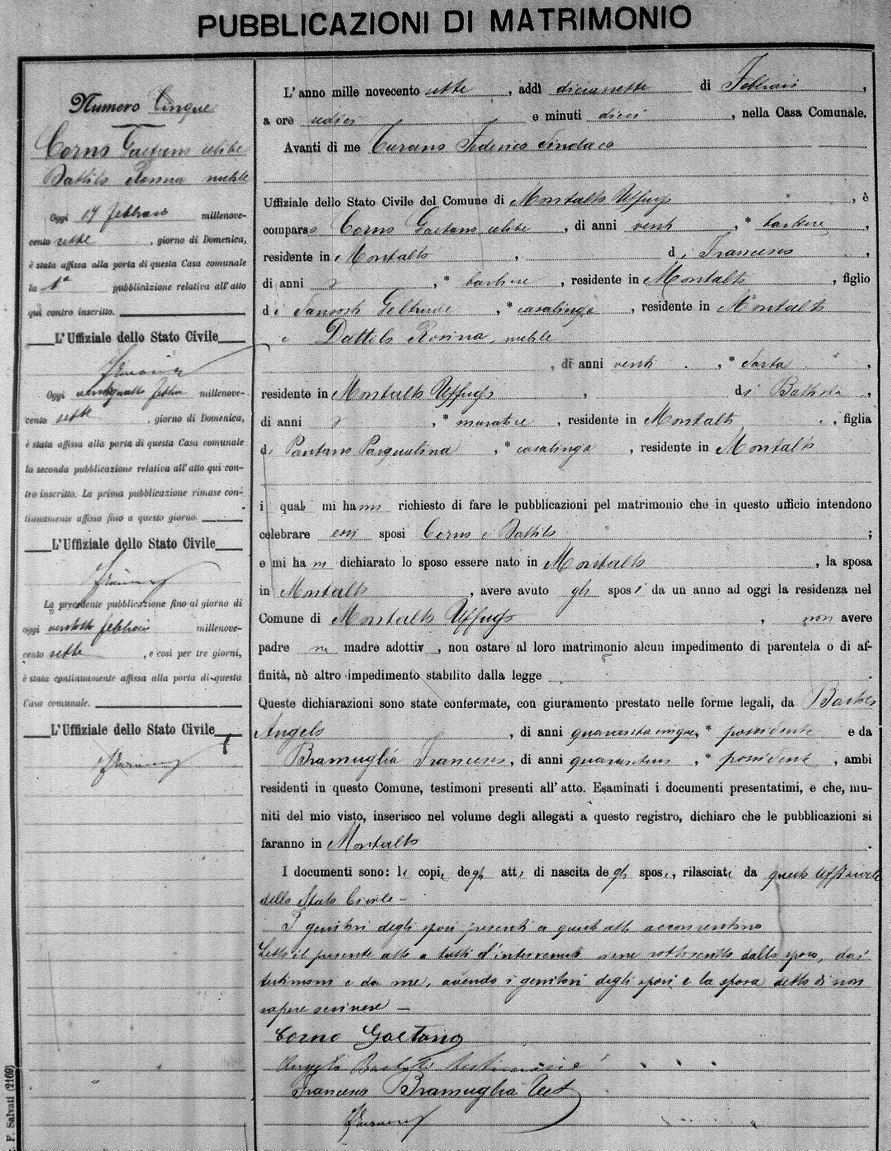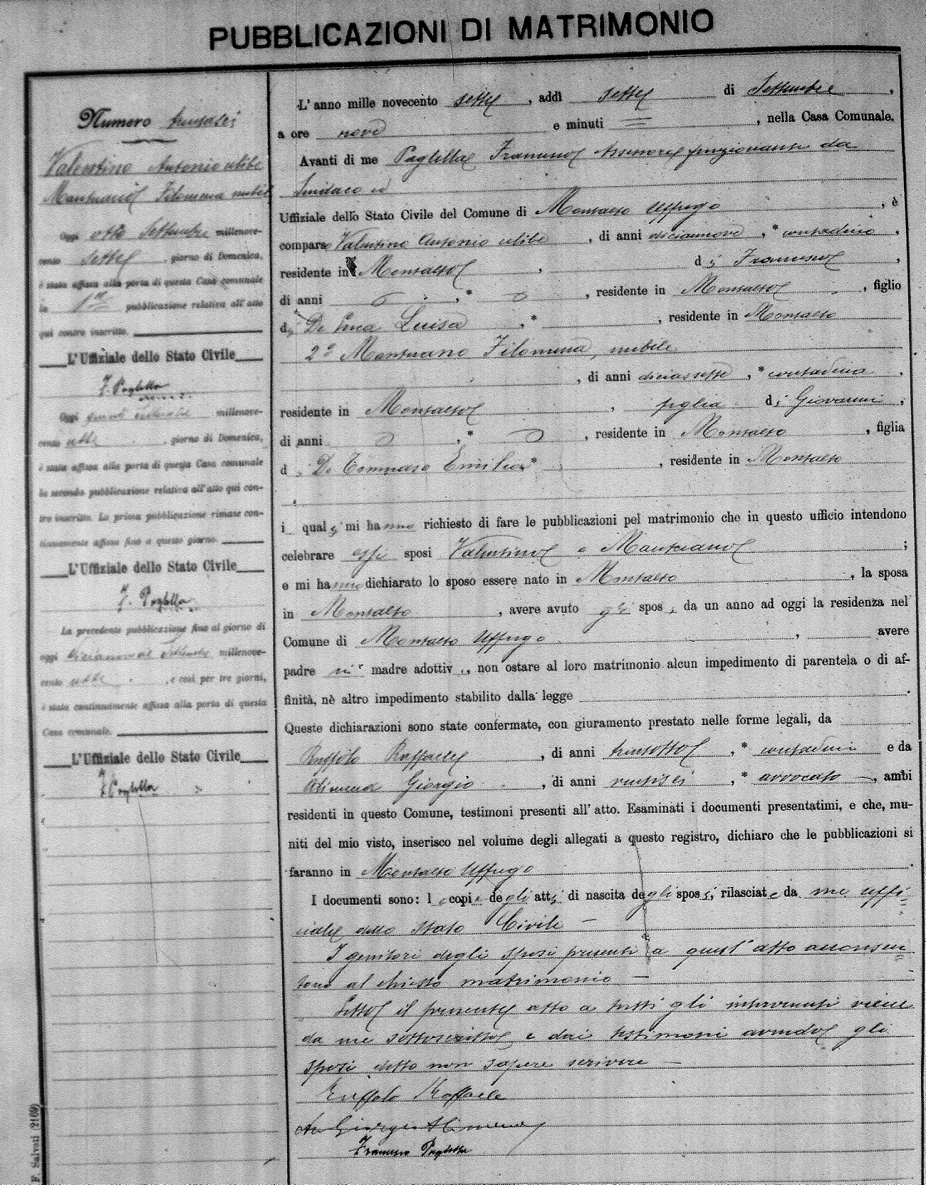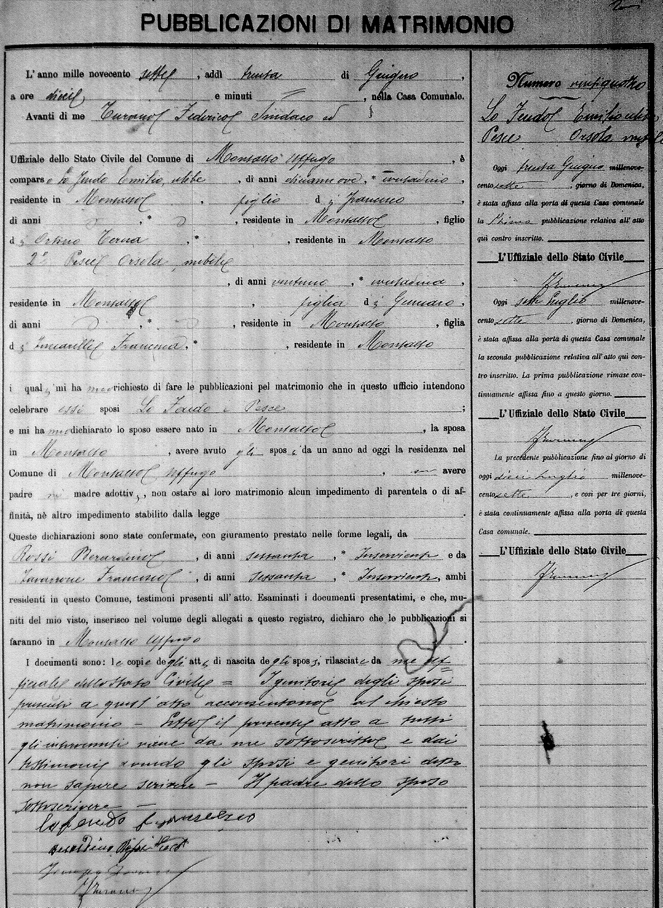 Here are the extractions for the marriage banns in 1907 for Montalto Uffugo. Each extraction has a link to a copy of the original document on the groom's surname. Please note: (fu) indicates the the person was deceased at the time of the marriage bann. For a translation of the basic Pubblicazioni document, look here.