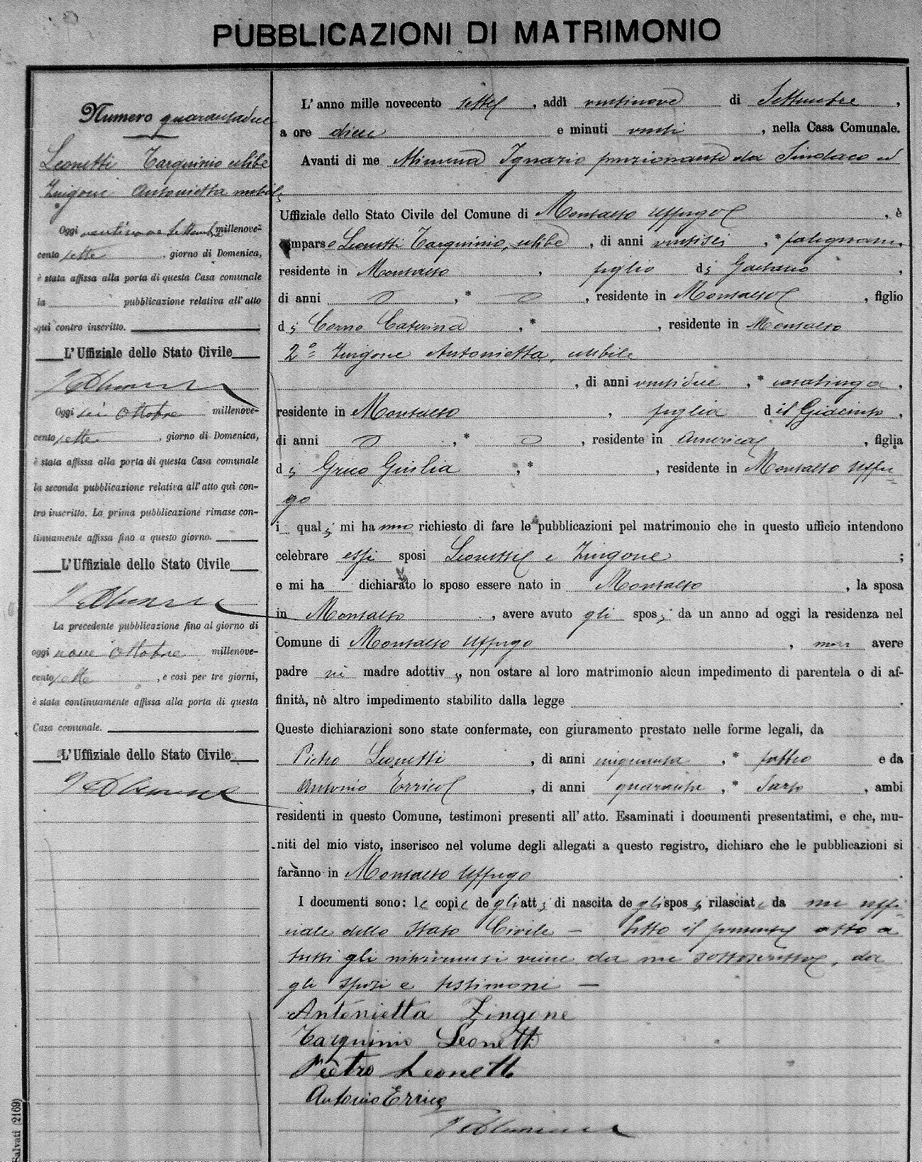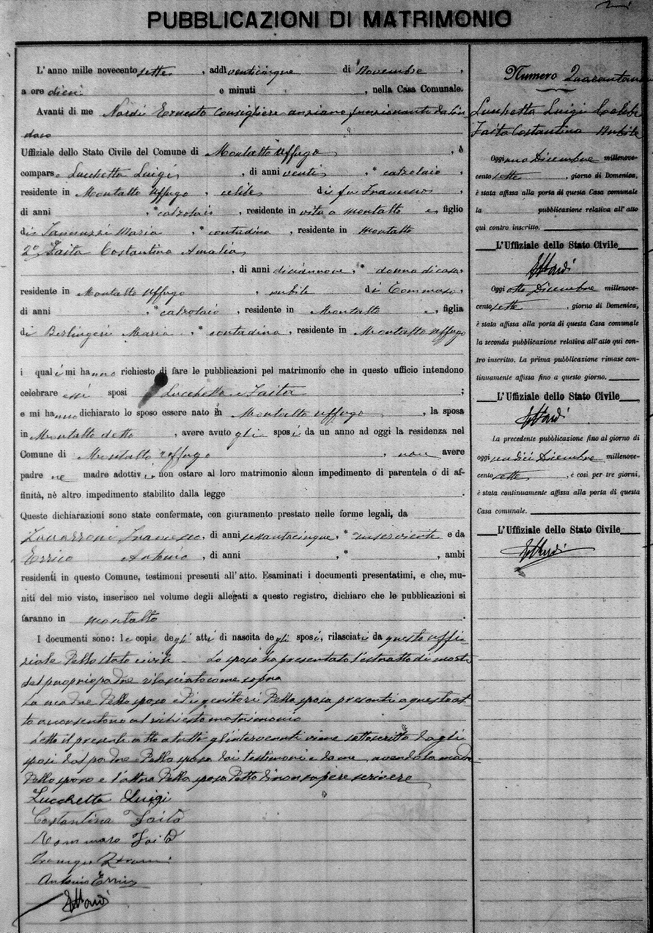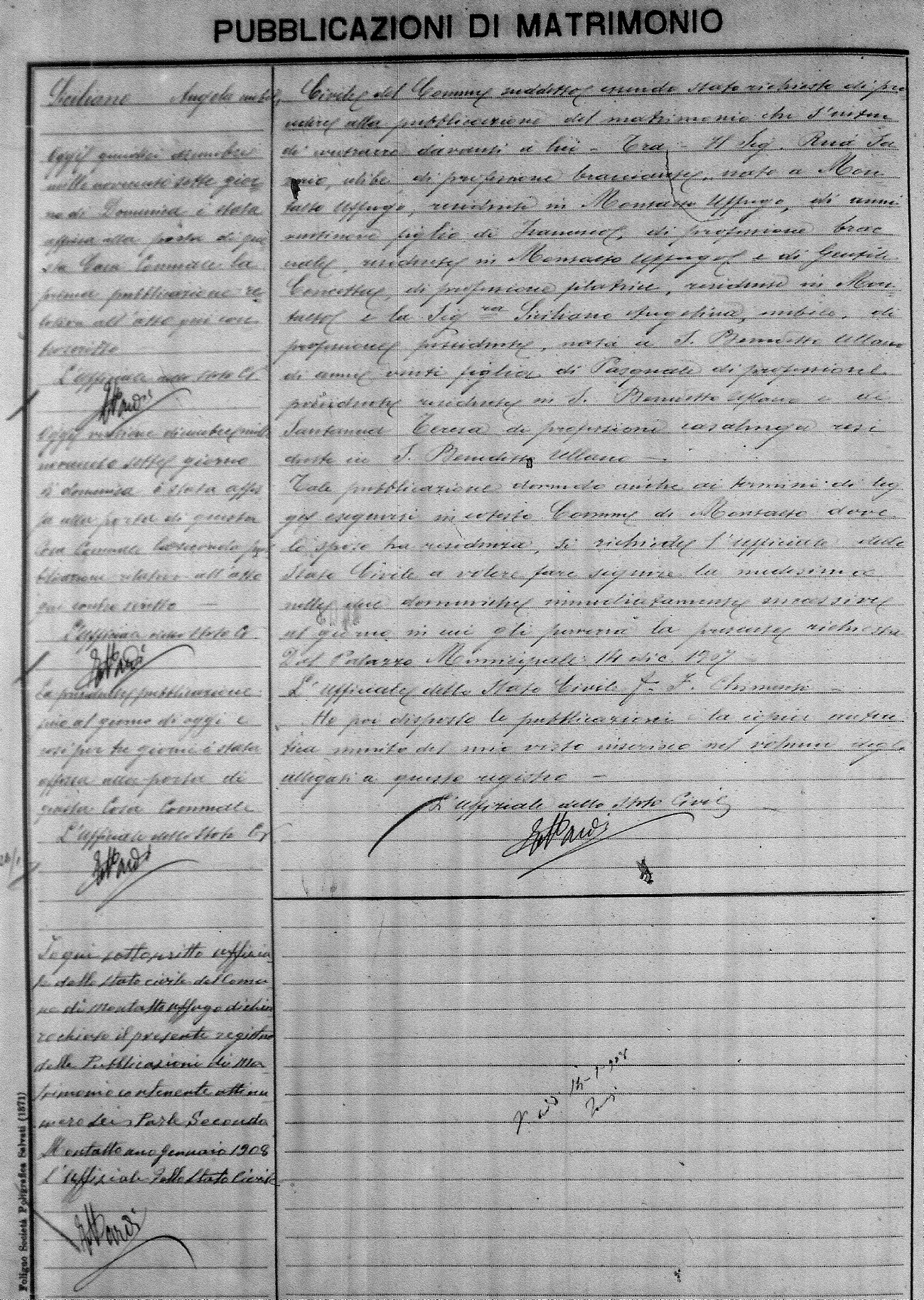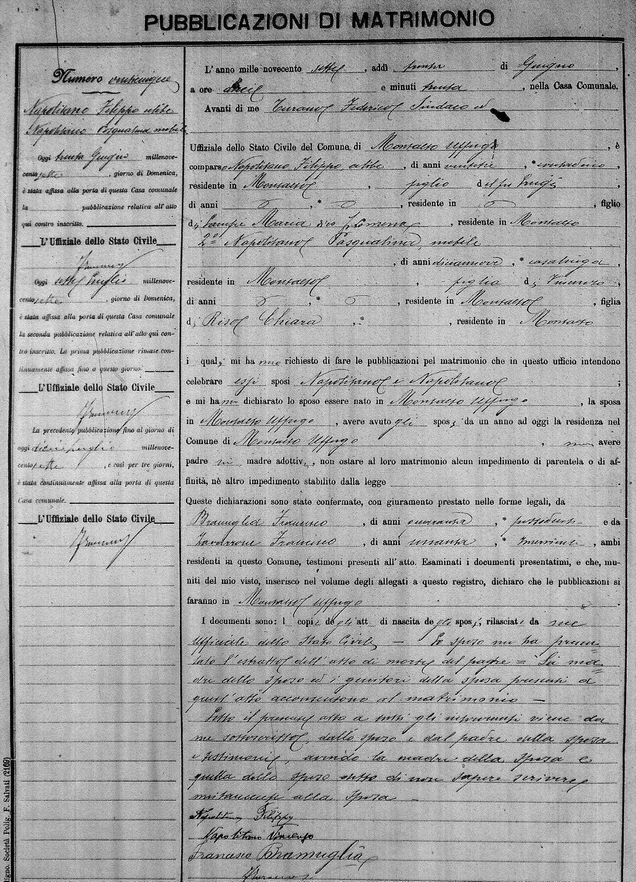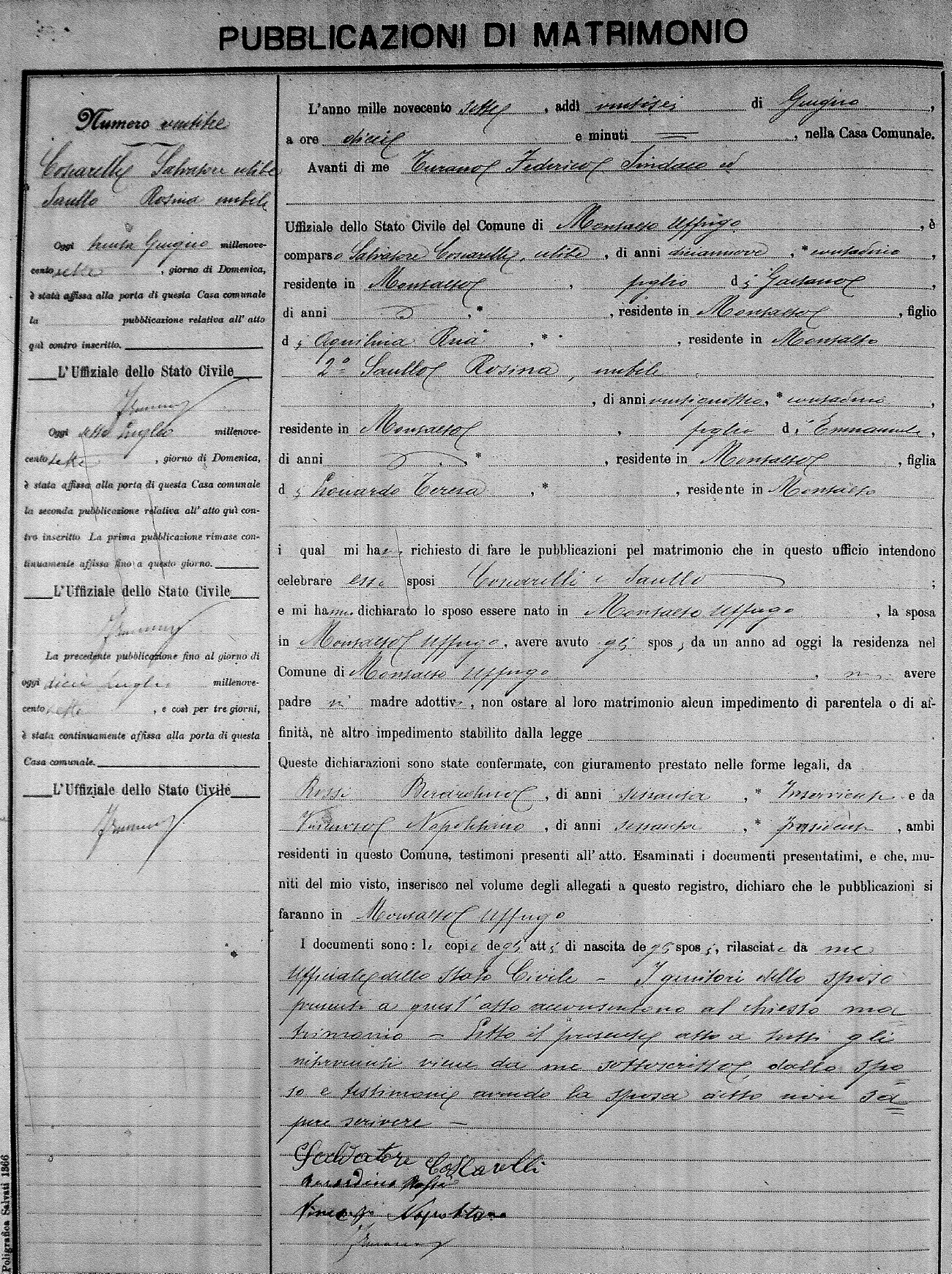 Here are the extractions for the marriage banns in 1907 for Montalto Uffugo. Each extraction has a link to a copy of the original document on the groom's surname. Please note: (fu) indicates the the person was deceased at the time of the marriage bann. For a translation of the basic Pubblicazioni document, look here.