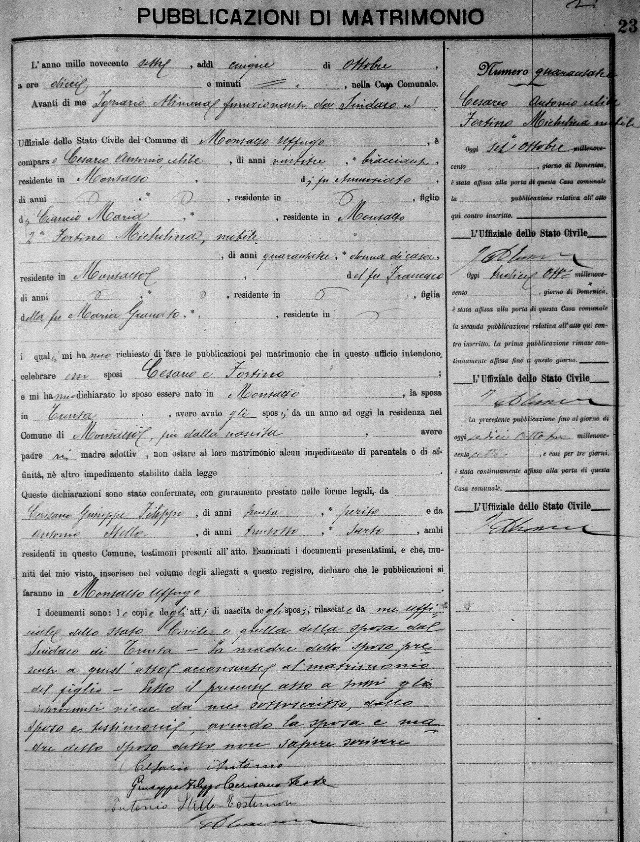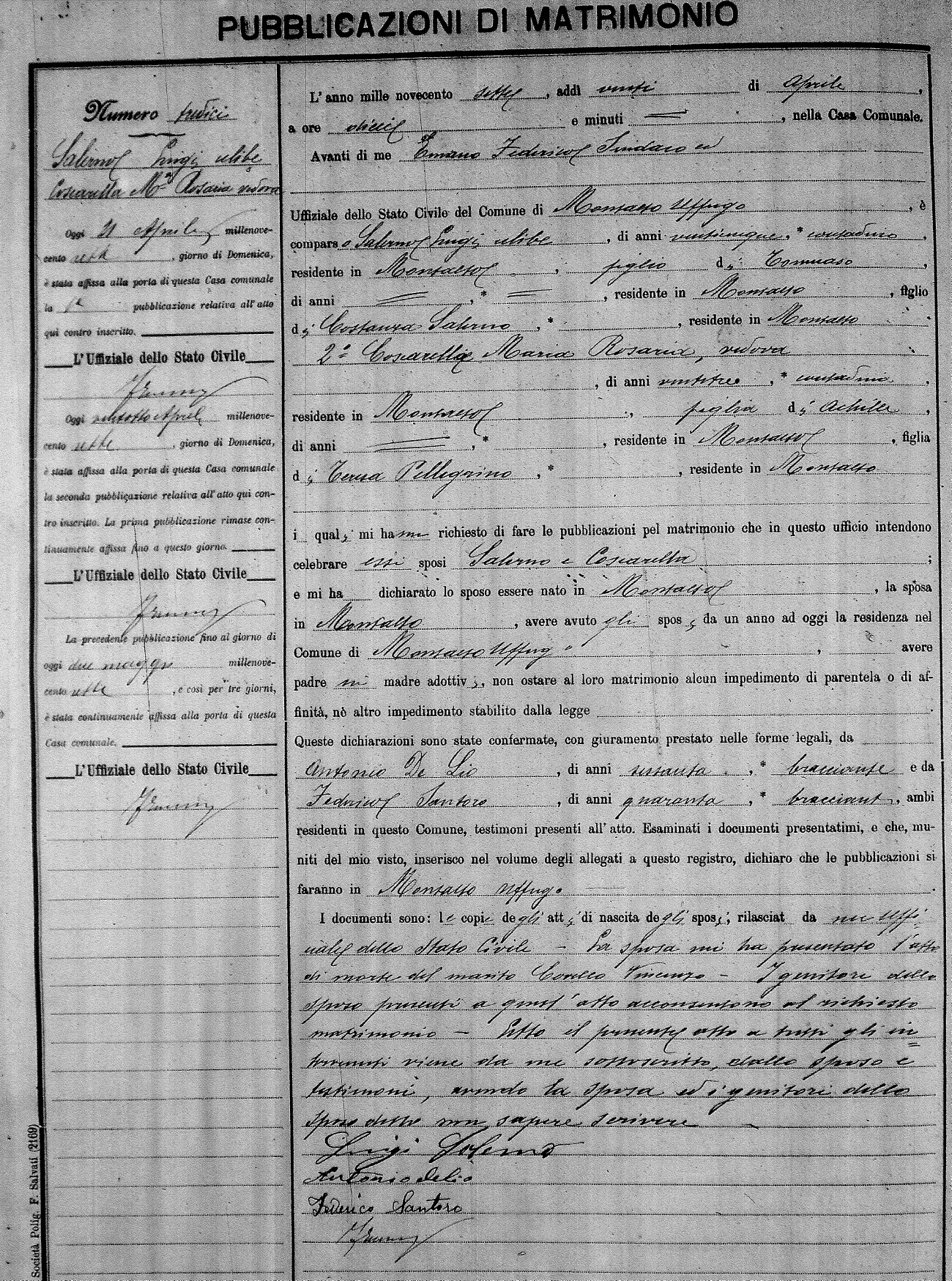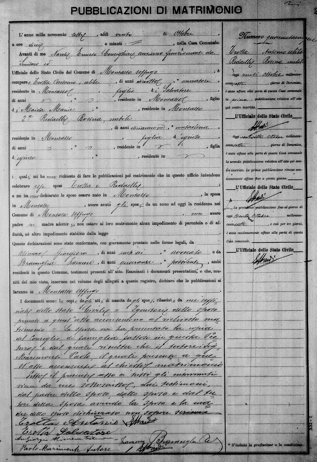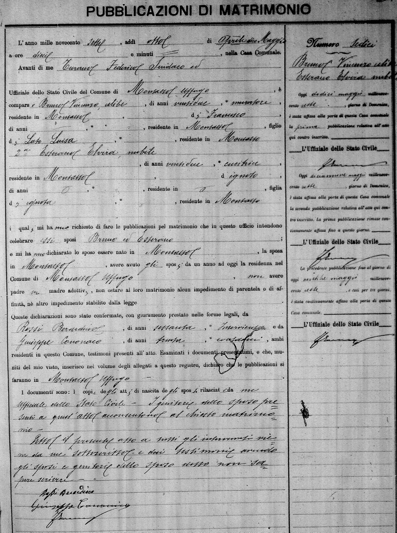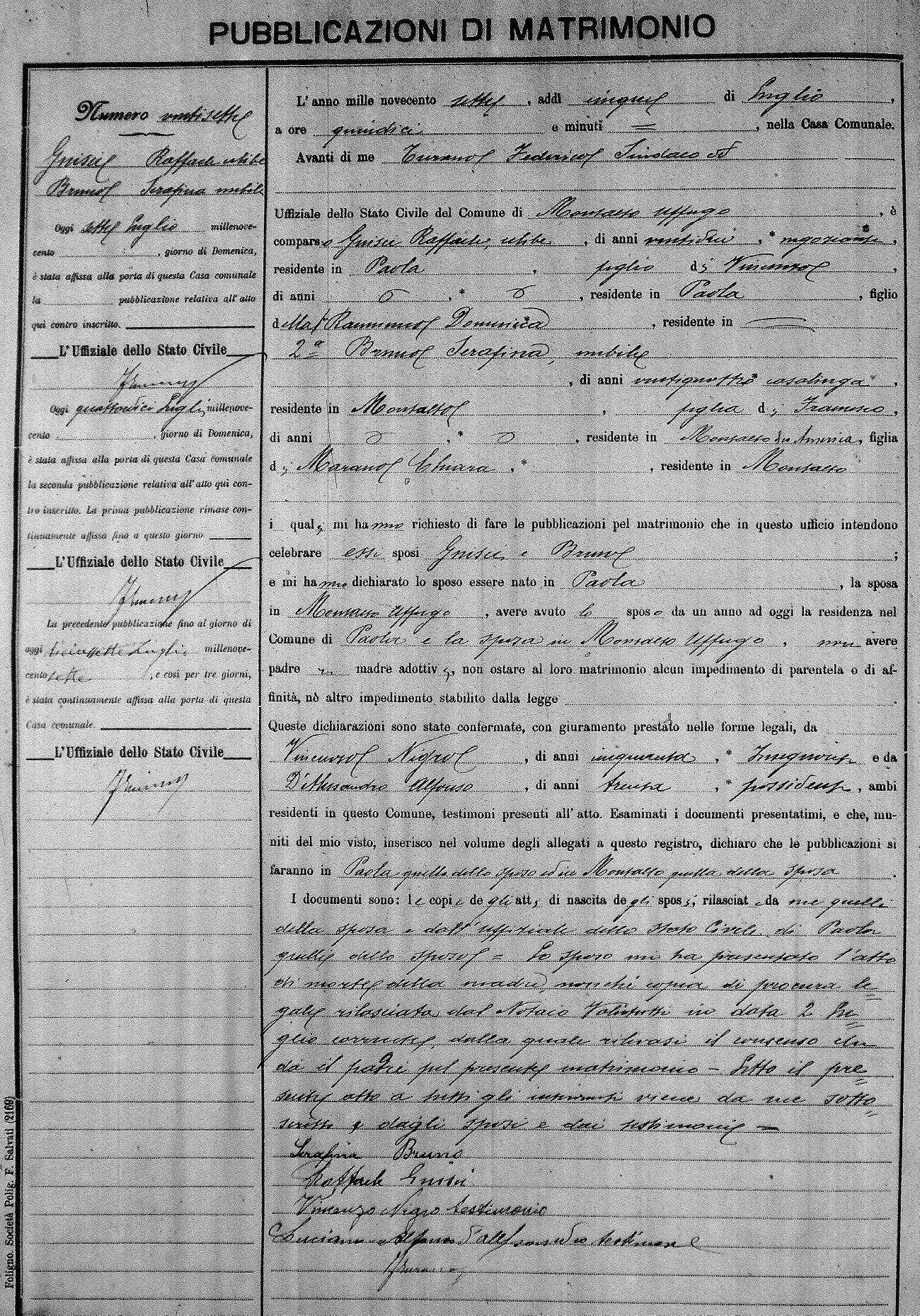 Here are the extractions for the marriage banns in 1907 for Montalto Uffugo. Each extraction has a link to a copy of the original document on the groom's surname. Please note: (fu) indicates the the person was deceased at the time of the marriage bann. For a translation of the basic Pubblicazioni document, look here.