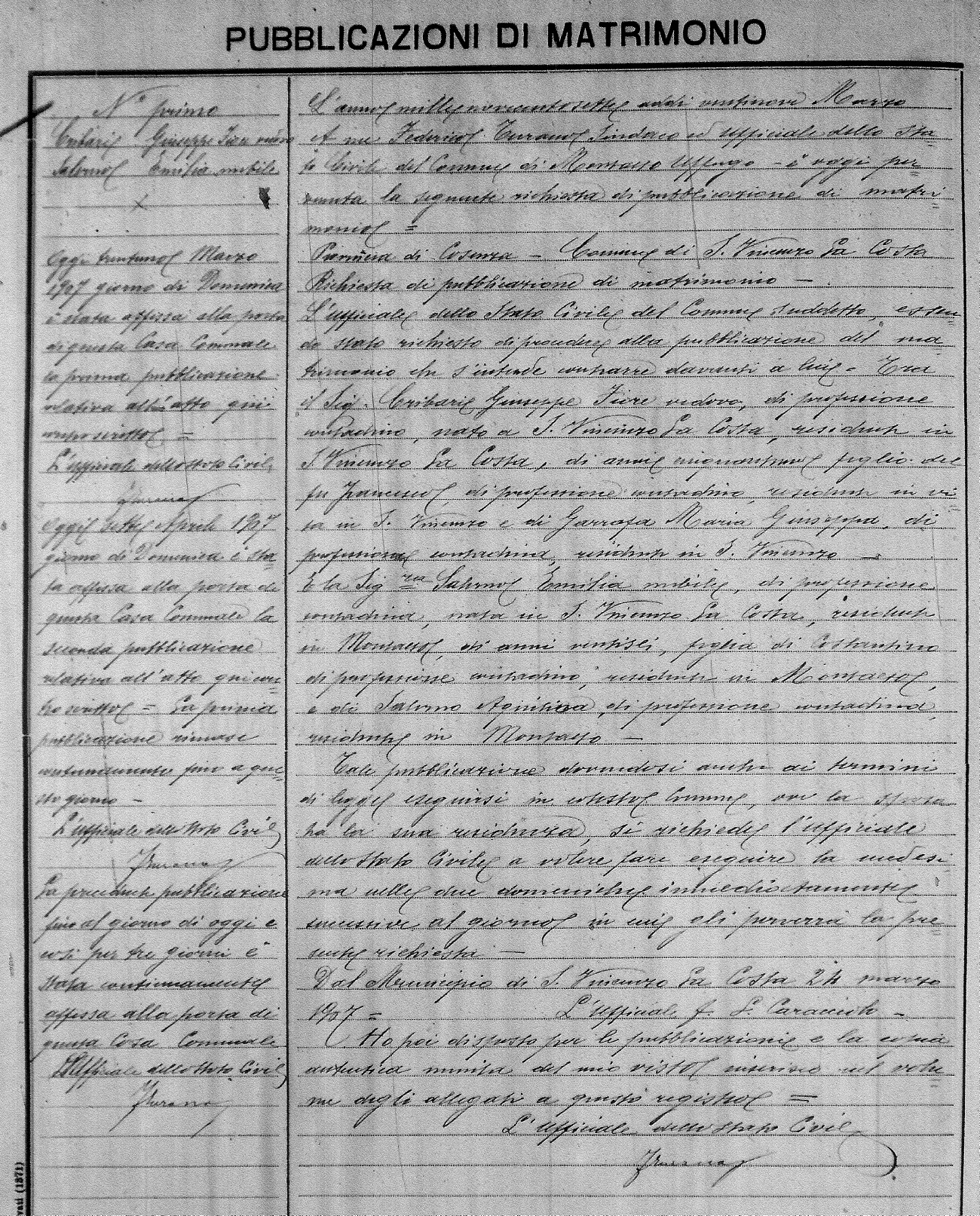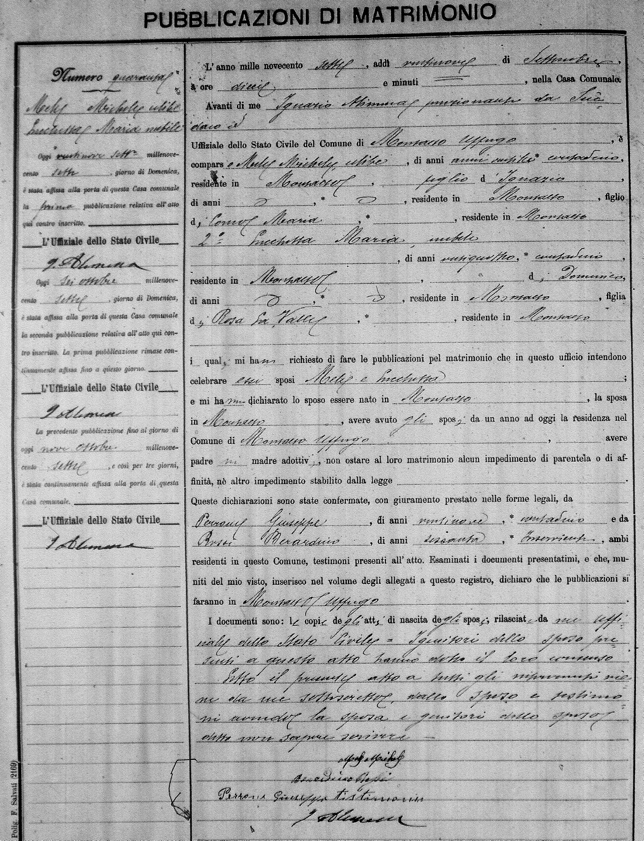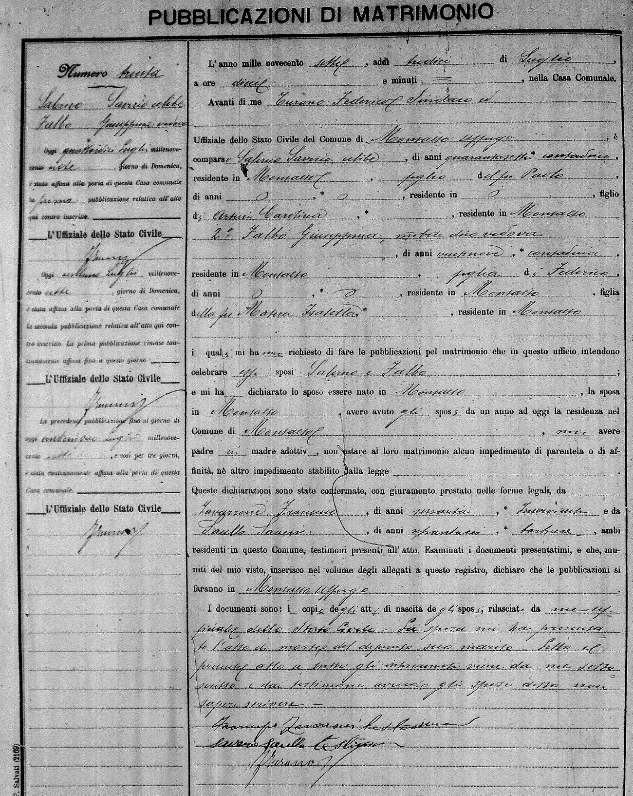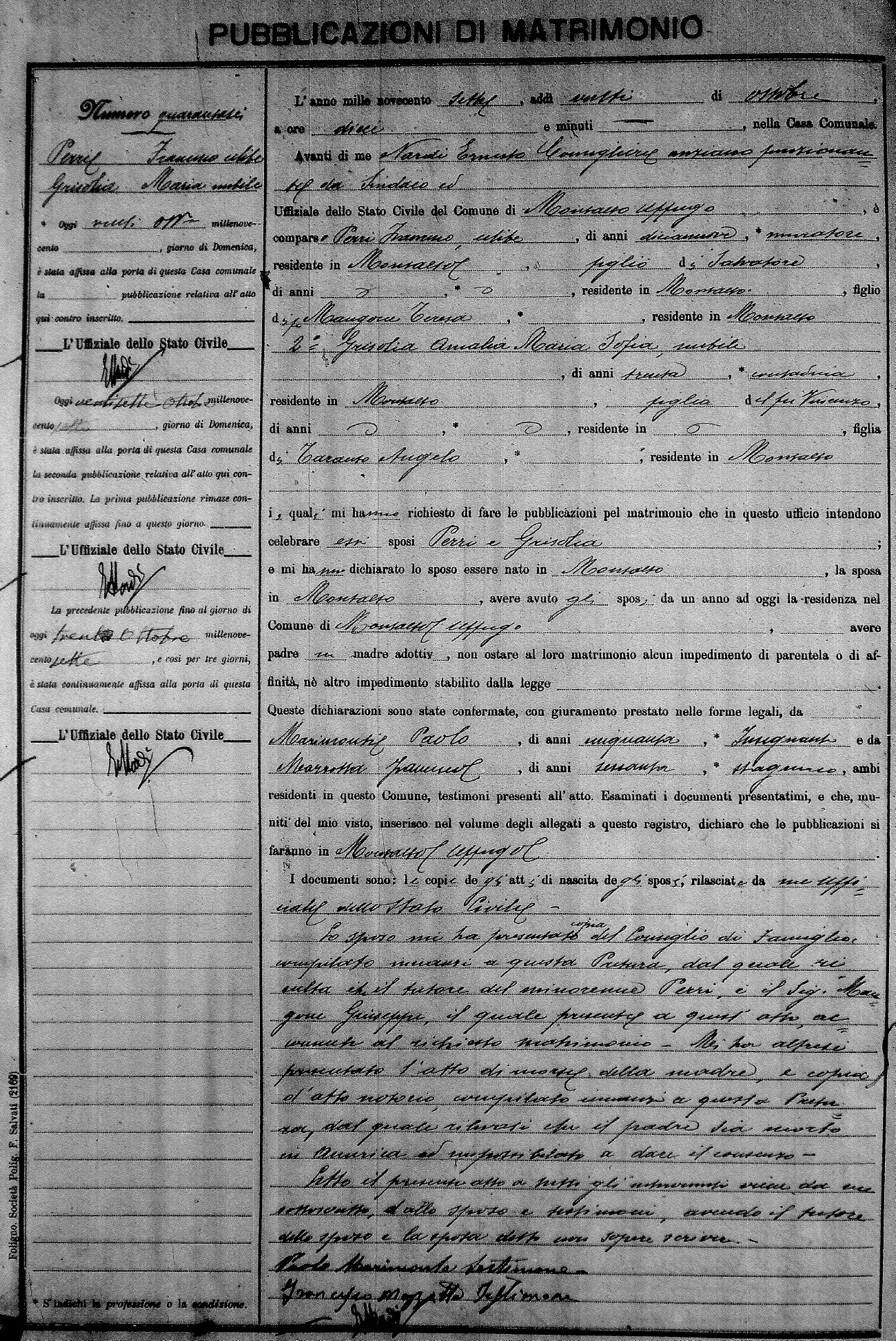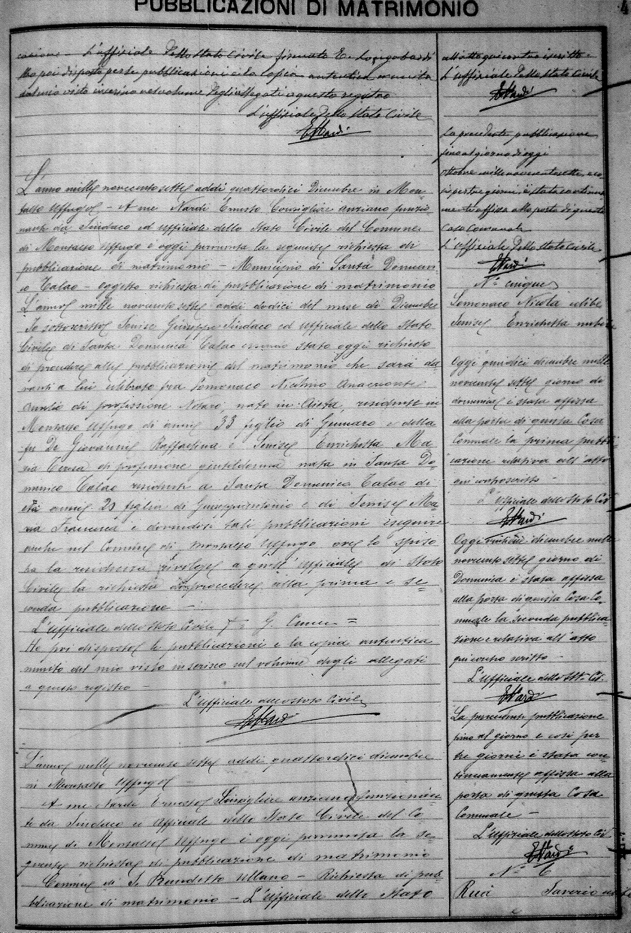 Here are the extractions for the marriage banns in 1907 for Montalto Uffugo. Each extraction has a link to a copy of the original document on the groom's surname. Please note: (fu) indicates the the person was deceased at the time of the marriage bann. For a translation of the basic Pubblicazioni document, look here.