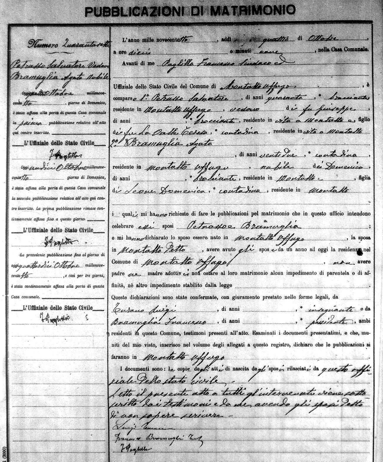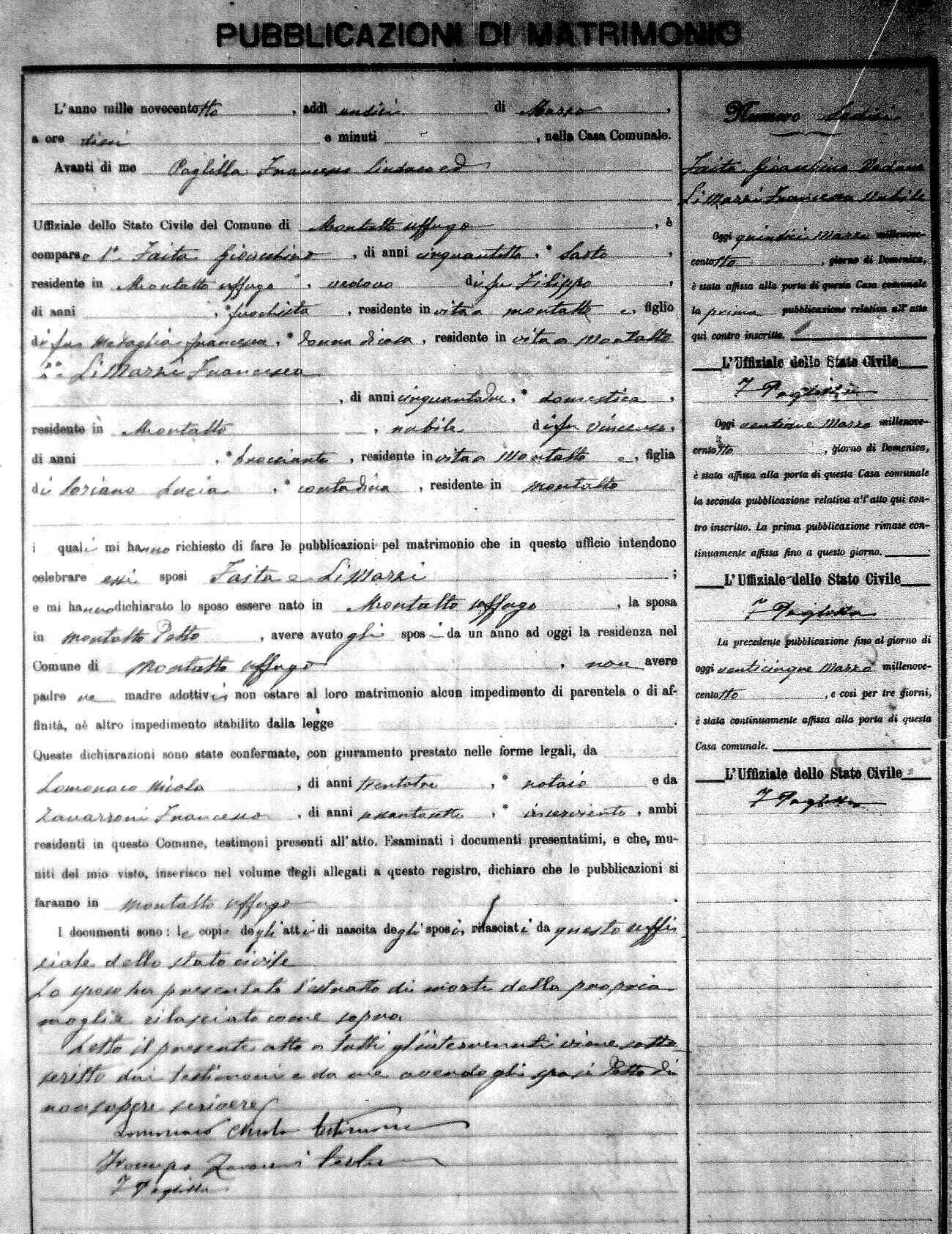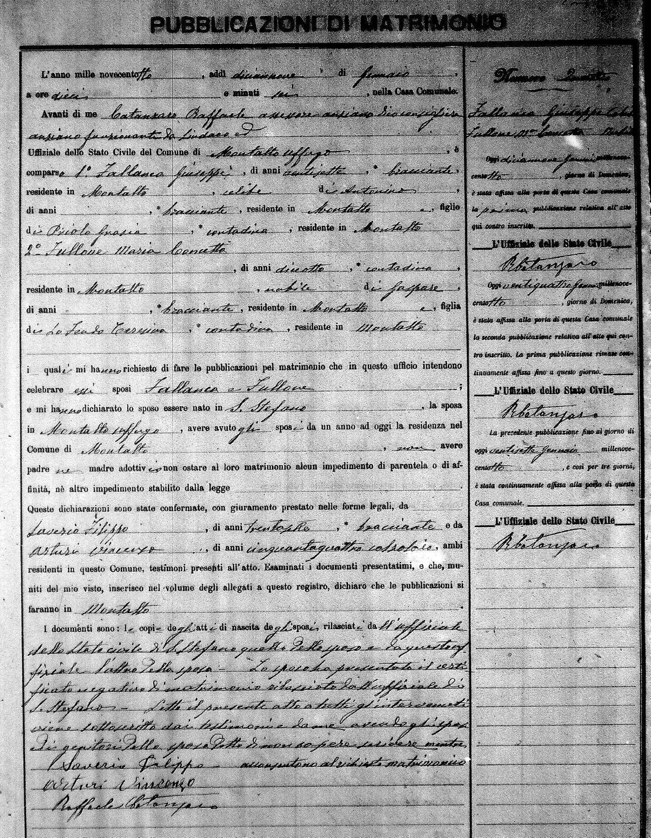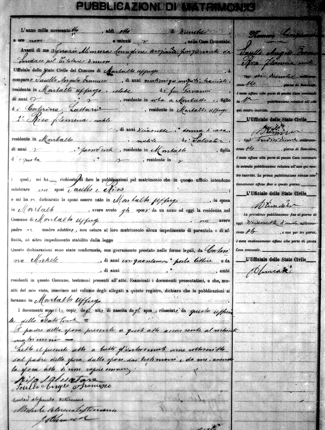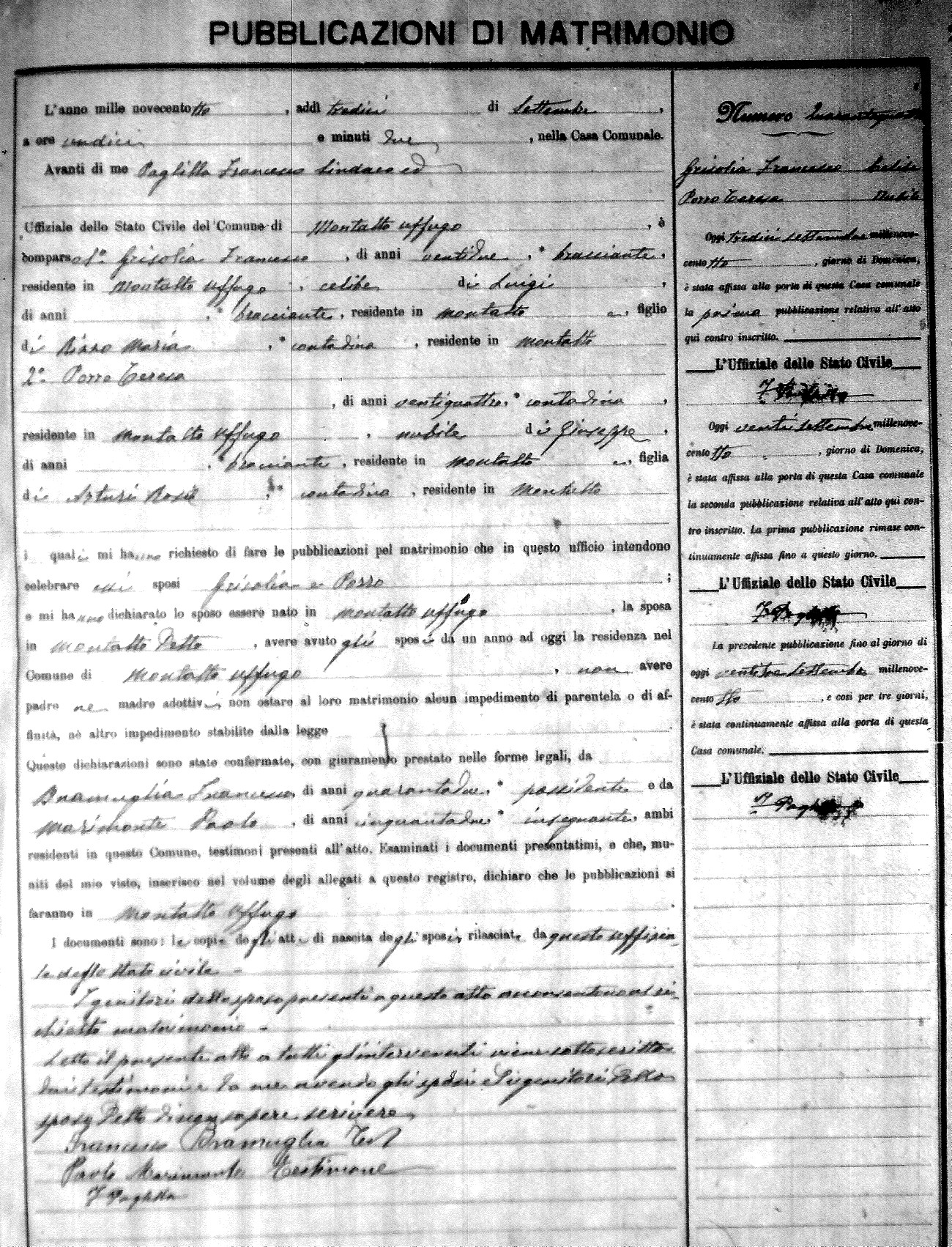 Here are the extractions for the marriage banns in 1908 for Montalto Uffugo. Each extraction has a link to a copy of the original document on the groom's surname. Please note: (fu) indicates the the person was deceased at the time of the marriage bann. For a translation of the basic Pubblicazioni document, look here.