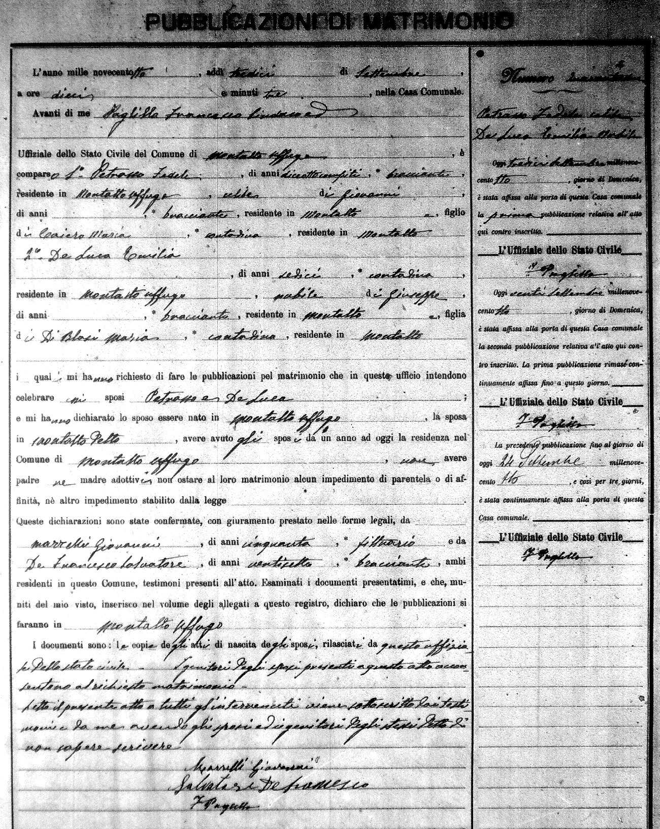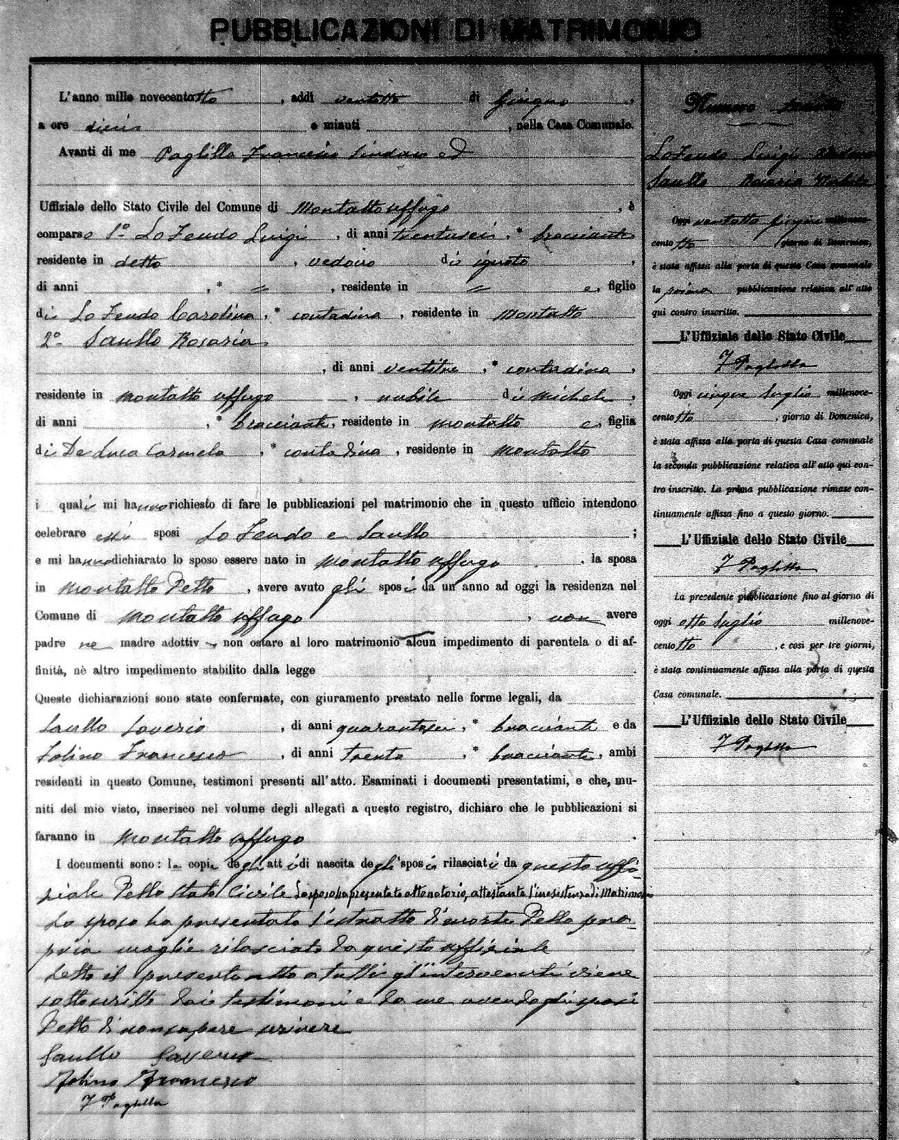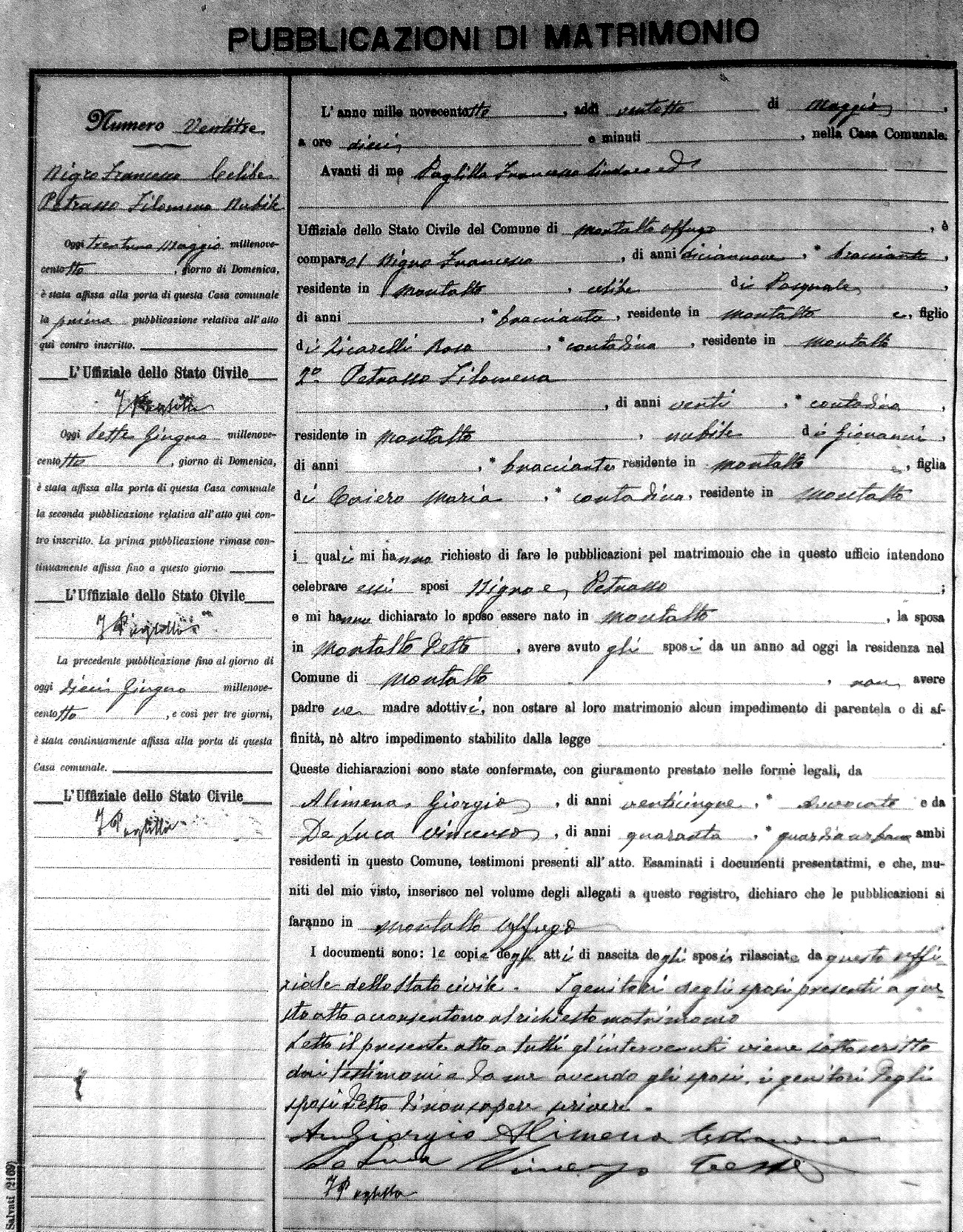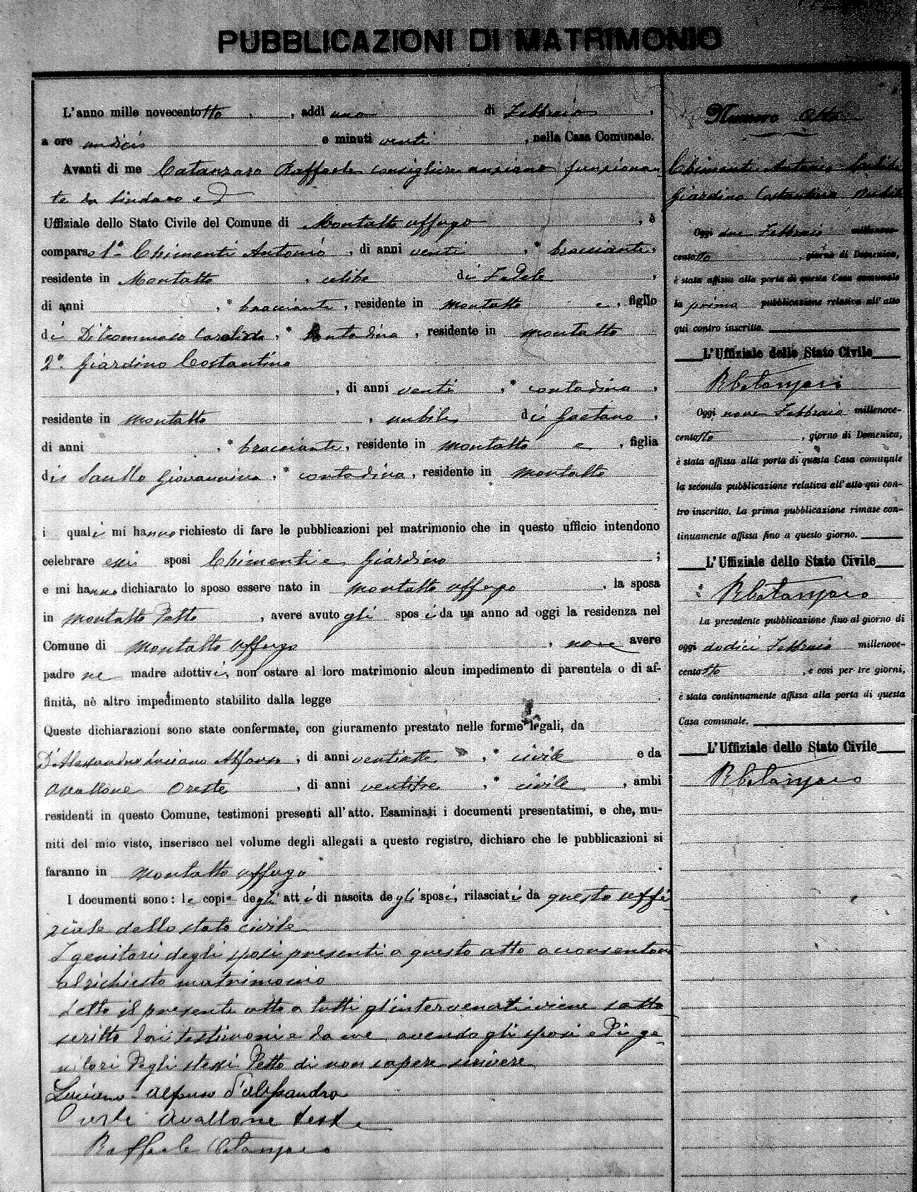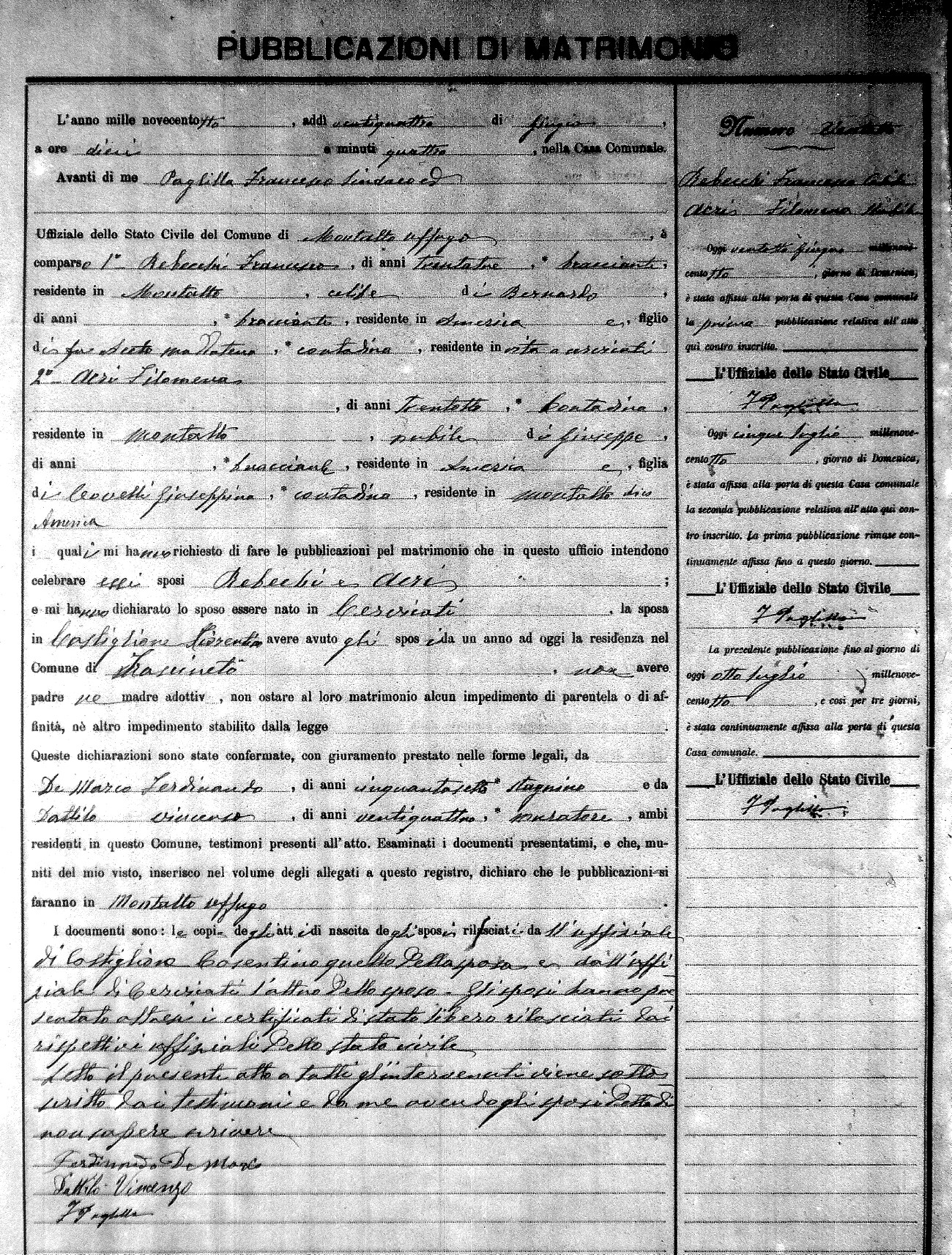Here are the extractions for the marriage banns in 1908 for Montalto Uffugo. Each extraction has a link to a copy of the original document on the groom's surname. Please note: (fu) indicates the the person was deceased at the time of the marriage bann. For a translation of the basic Pubblicazioni document, look here.