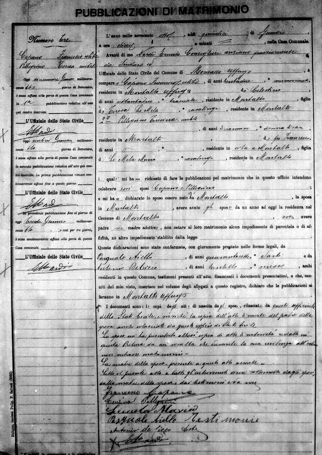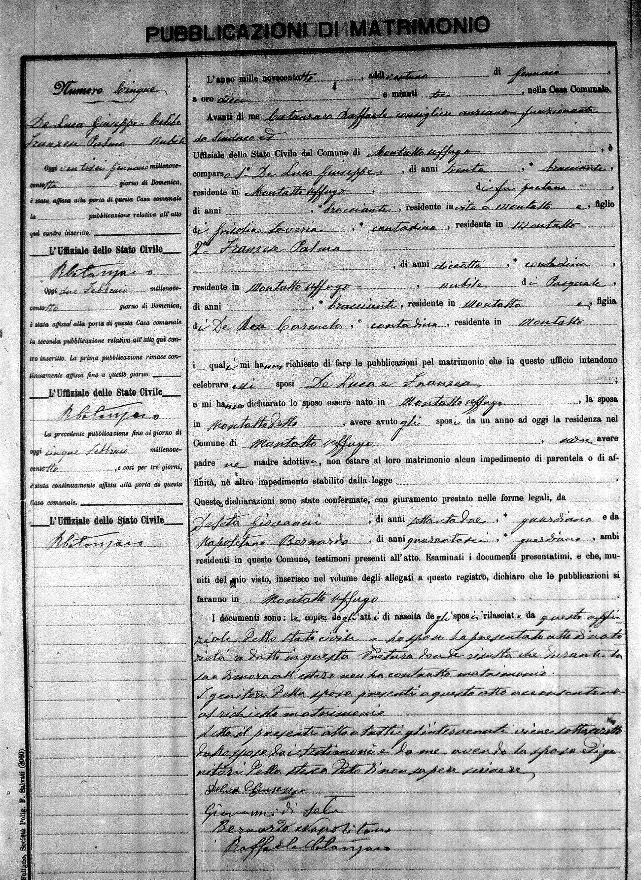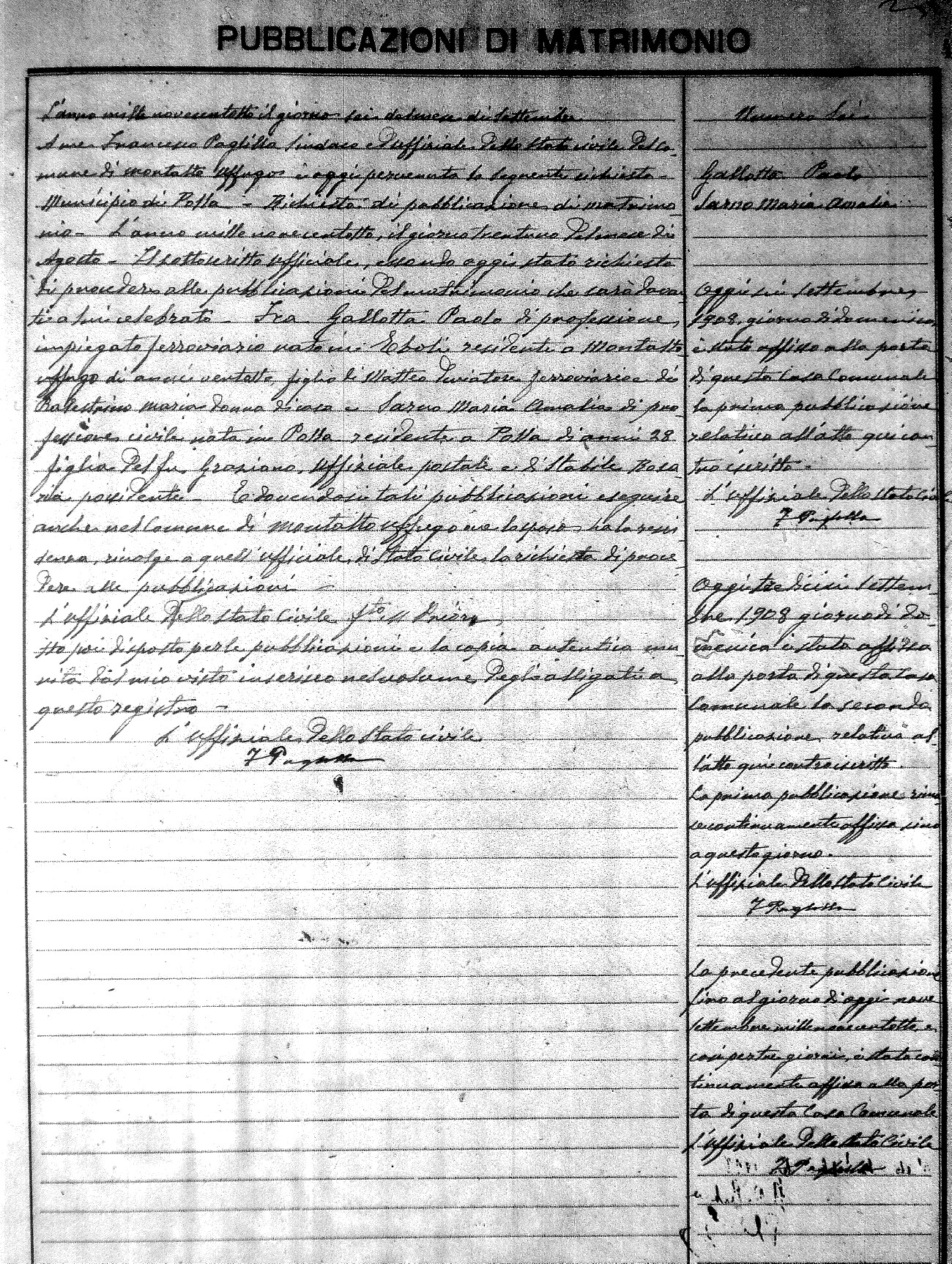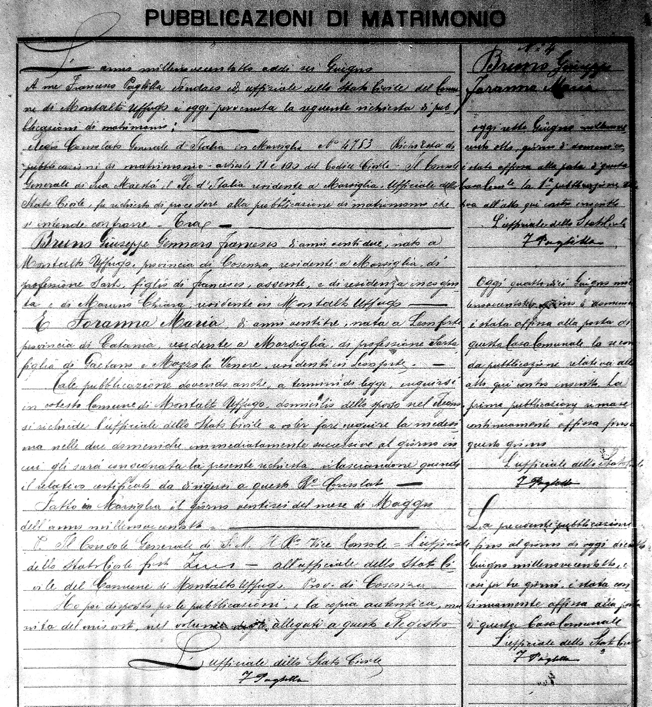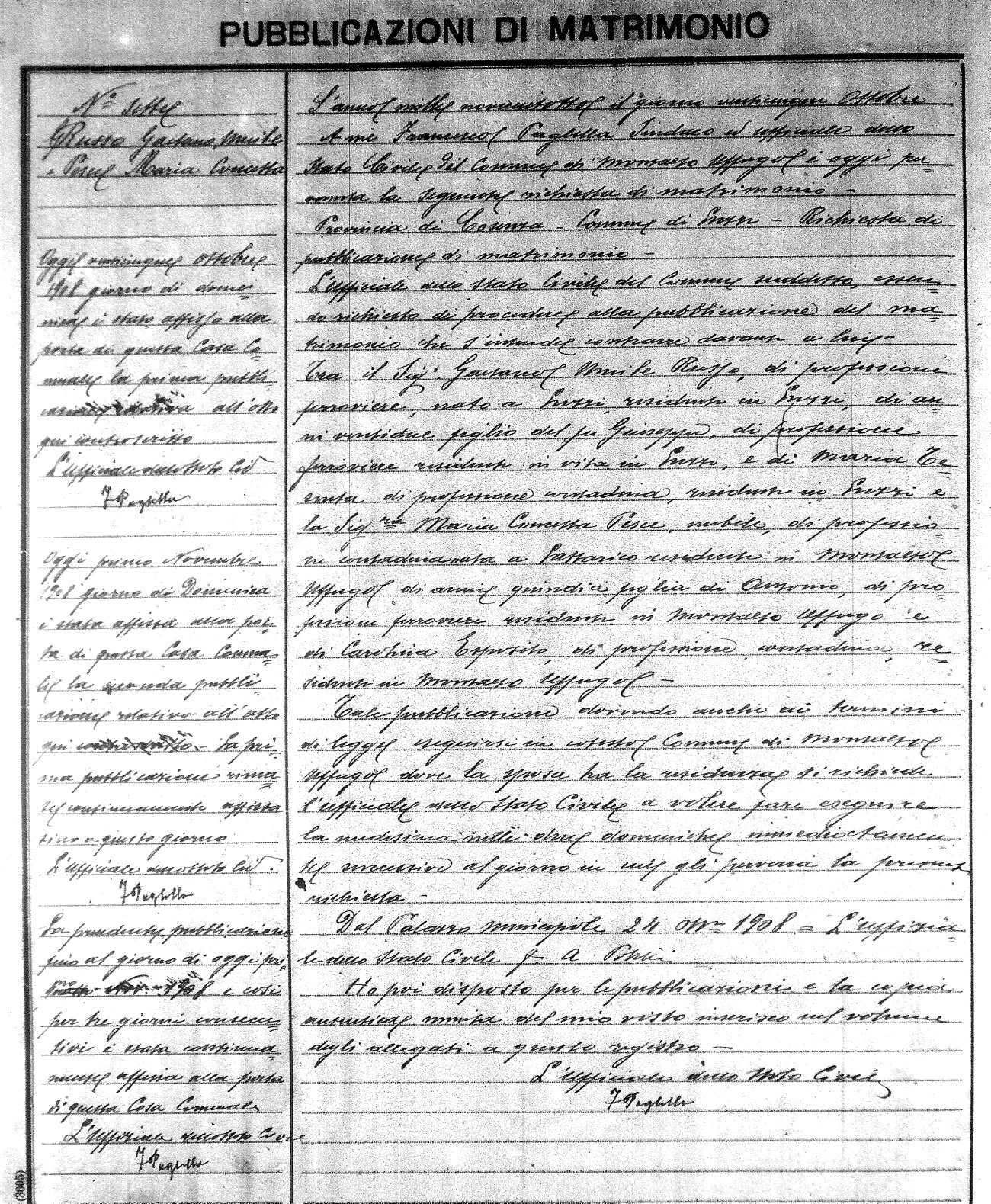 Here are the extractions for the marriage banns in 1908 for Montalto Uffugo. Each extraction has a link to a copy of the original document on the groom's surname. Please note: (fu) indicates the the person was deceased at the time of the marriage bann. For a translation of the basic Pubblicazioni document, look here.
