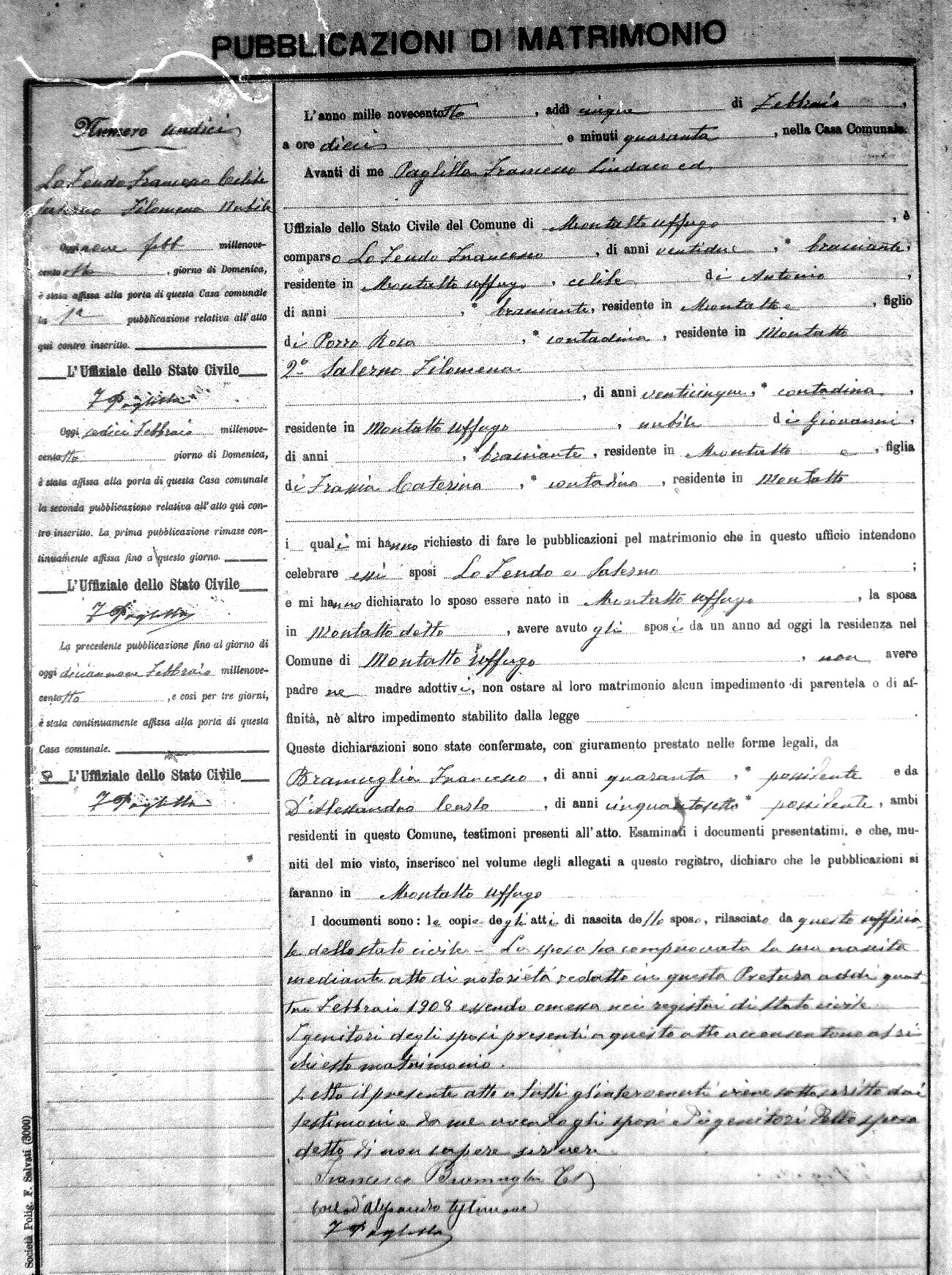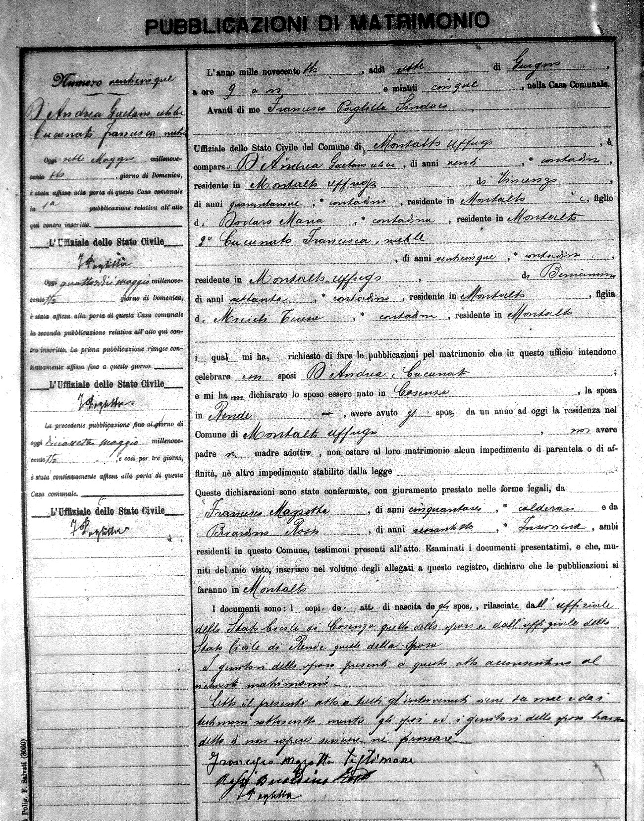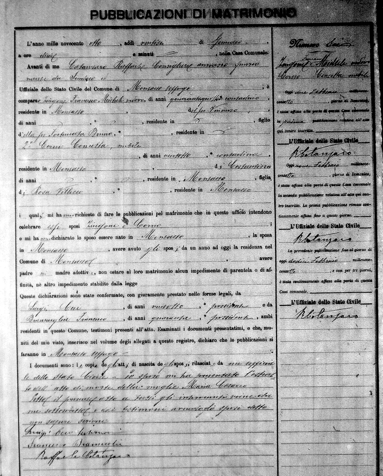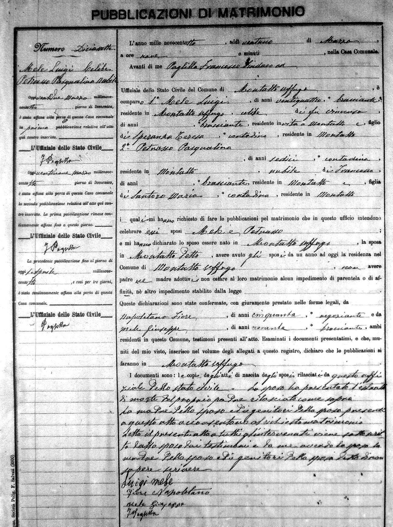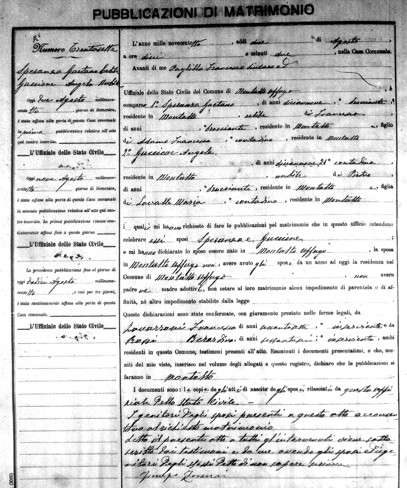 Here are the extractions for the marriage banns in 1908 for Montalto Uffugo. Each extraction has a link to a copy of the original document on the groom's surname. Please note: (fu) indicates the the person was deceased at the time of the marriage bann. For a translation of the basic Pubblicazioni document, look here.