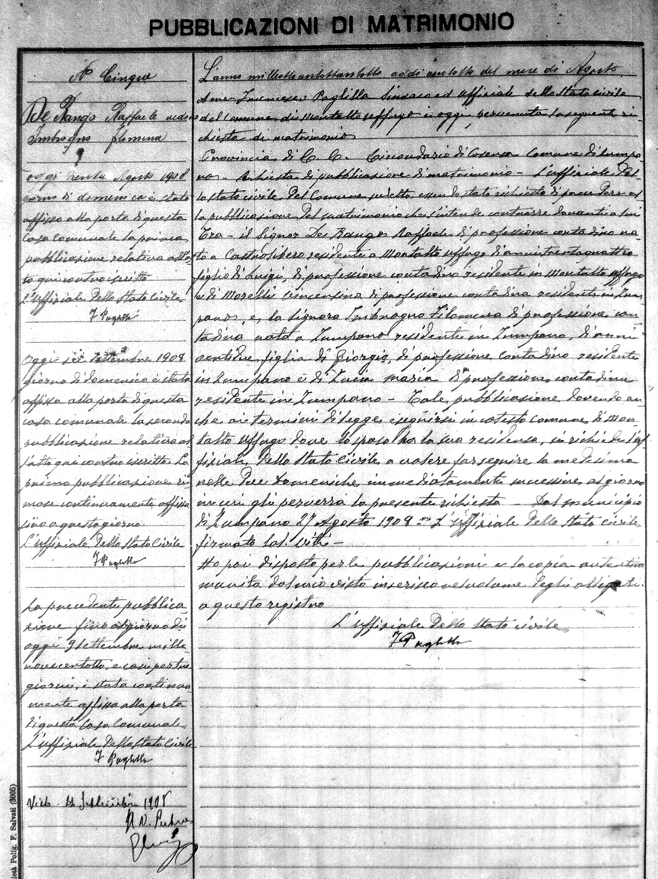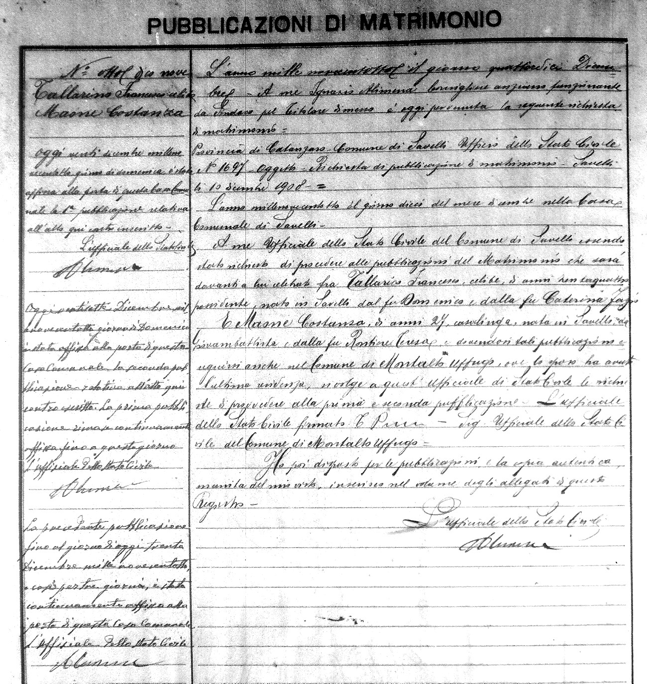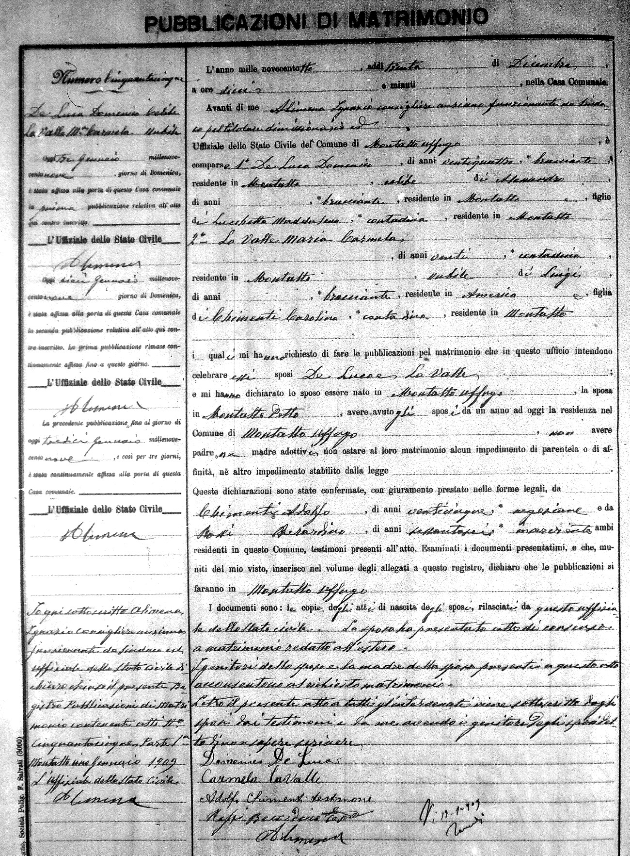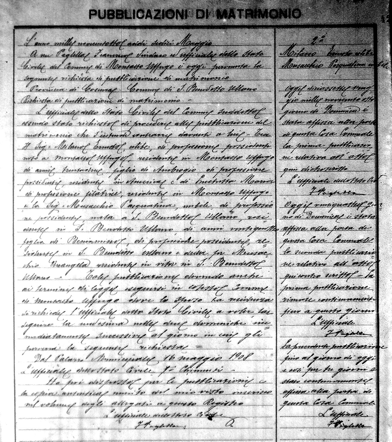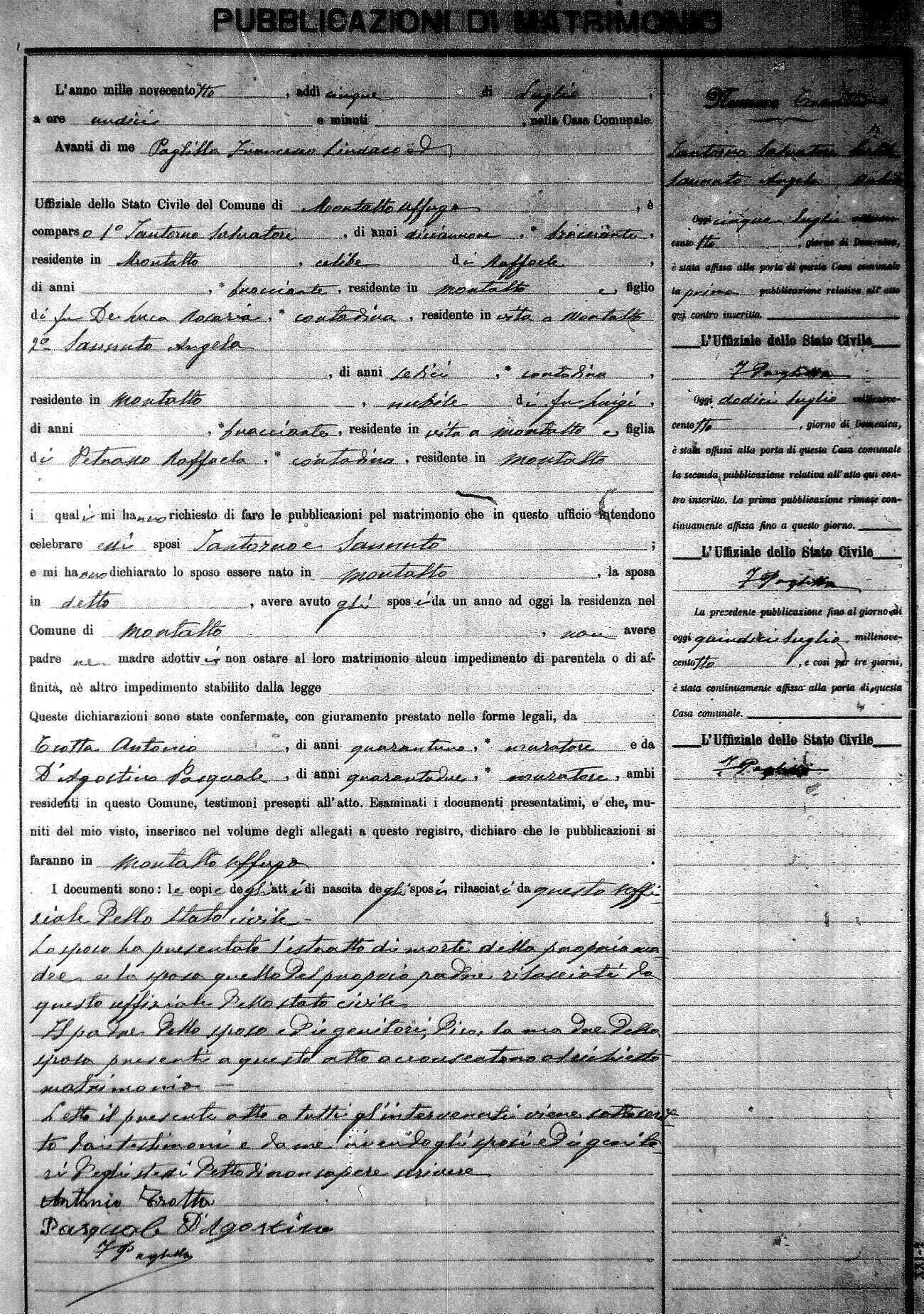 Here are the extractions for the marriage banns in 1908 for Montalto Uffugo. Each extraction has a link to a copy of the original document on the groom's surname. Please note: (fu) indicates the the person was deceased at the time of the marriage bann. For a translation of the basic Pubblicazioni document, look here.