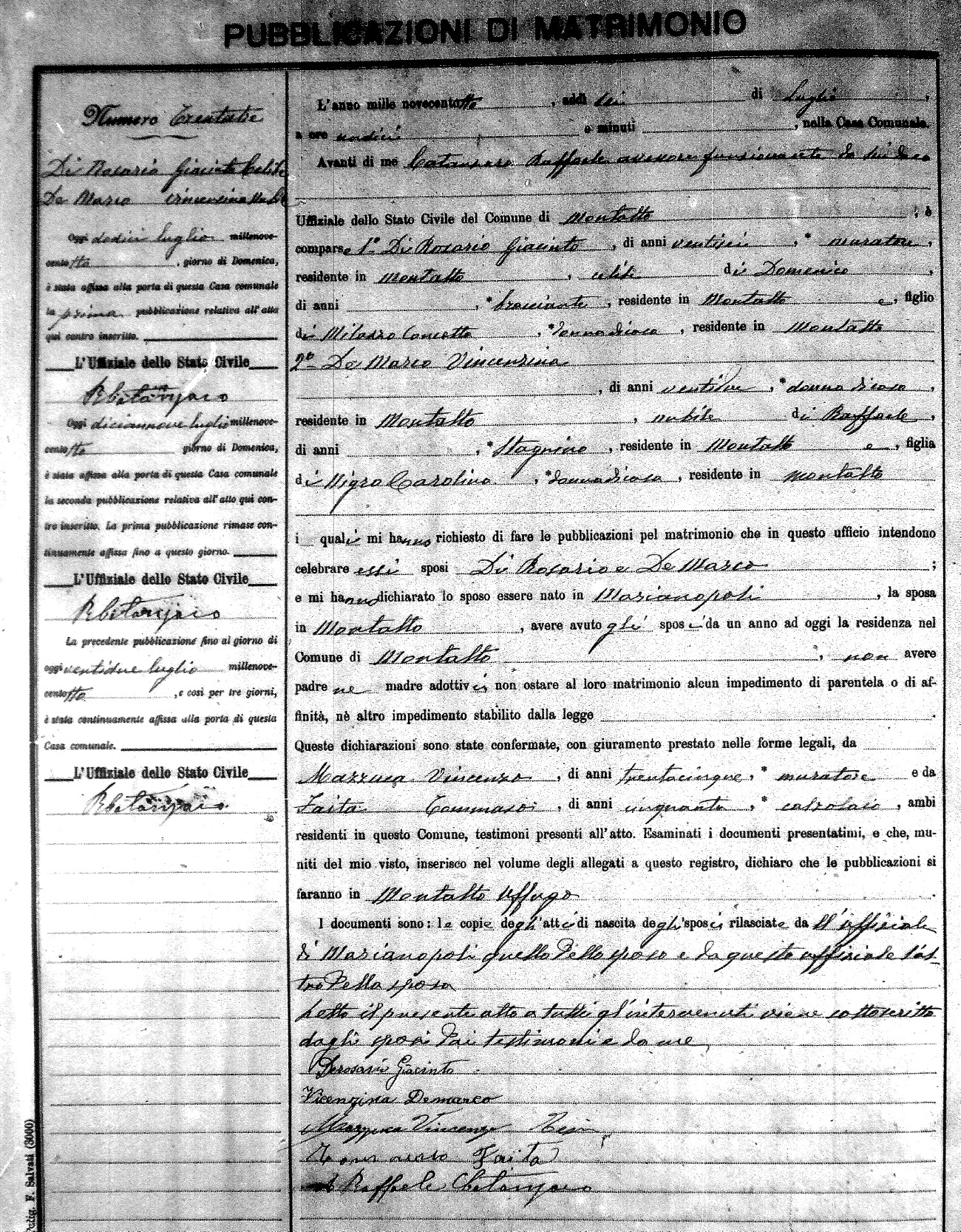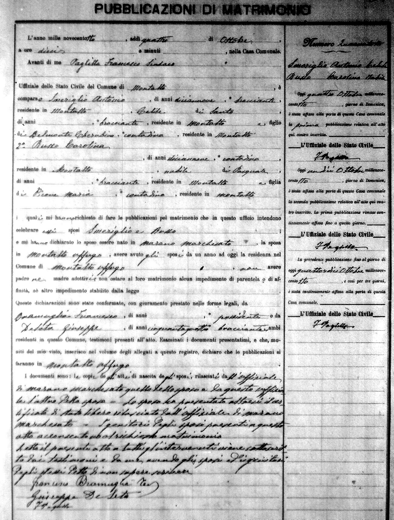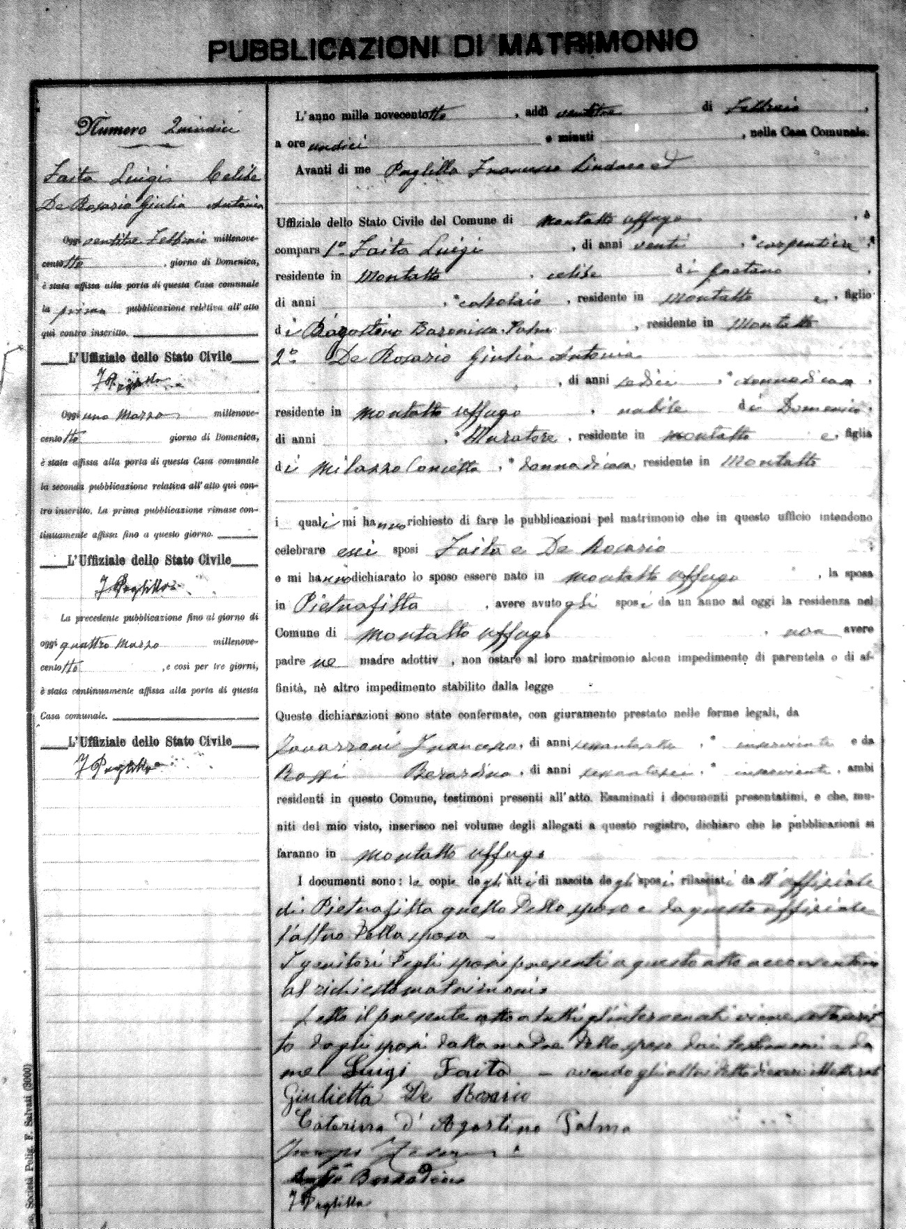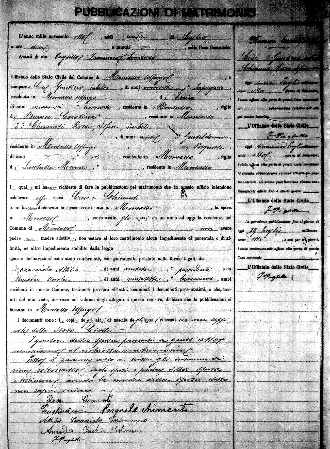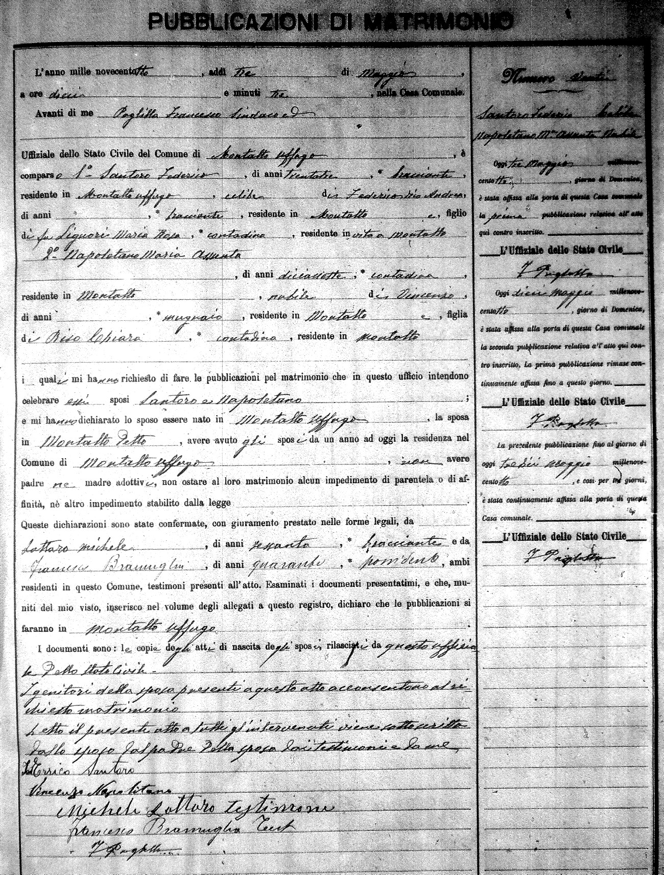 Here are the extractions for the marriage banns in 1908 for Montalto Uffugo. Each extraction has a link to a copy of the original document on the groom's surname. Please note: (fu) indicates the the person was deceased at the time of the marriage bann. For a translation of the basic Pubblicazioni document, look here.